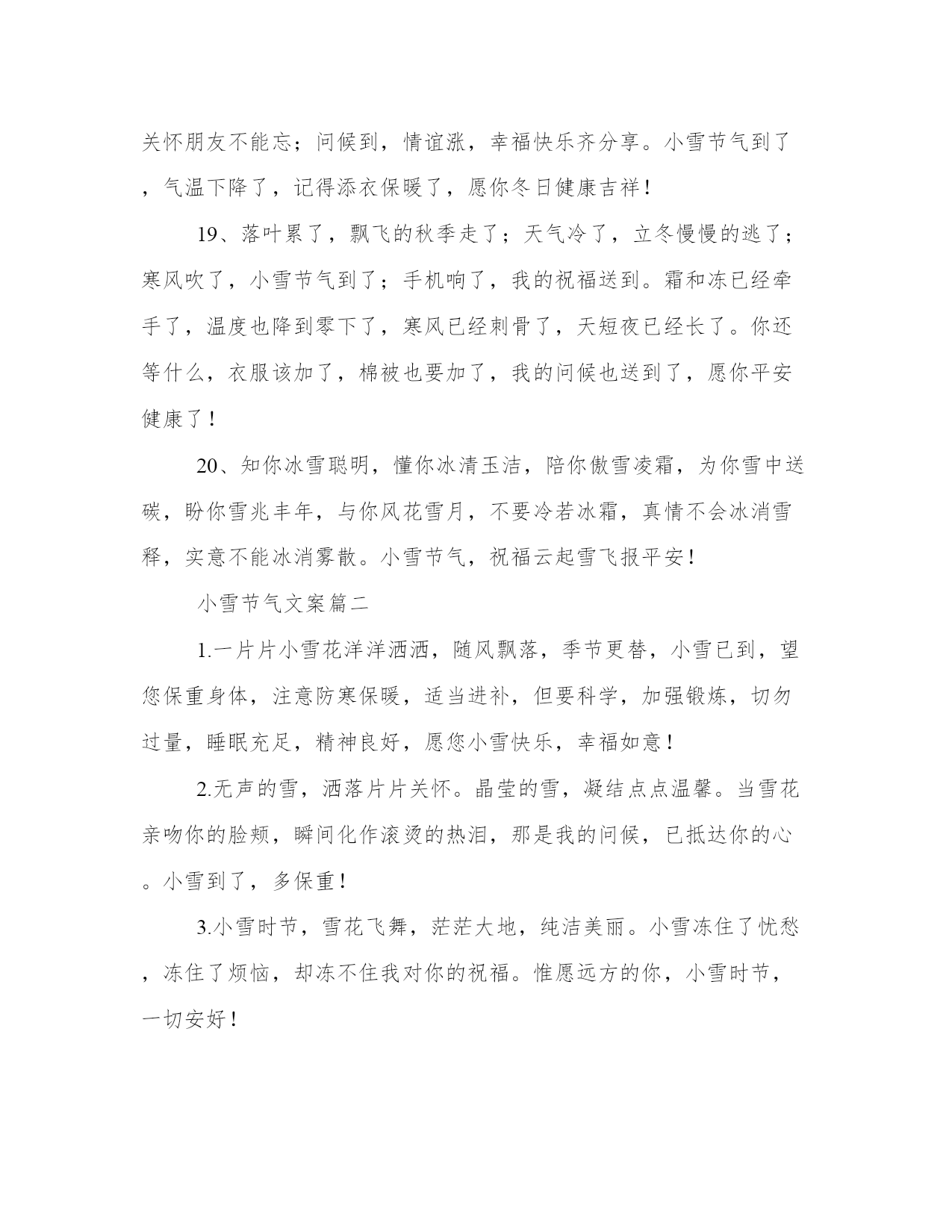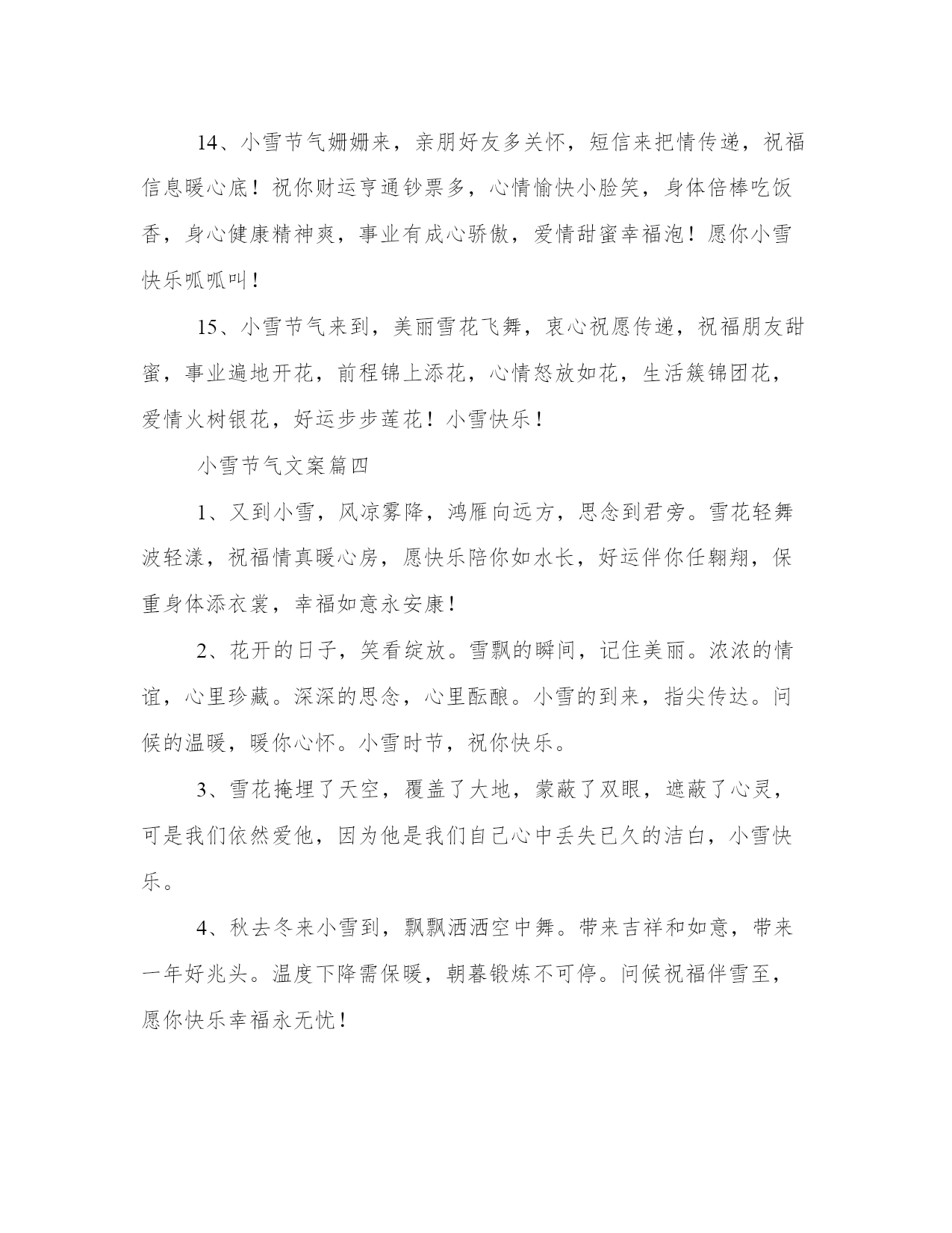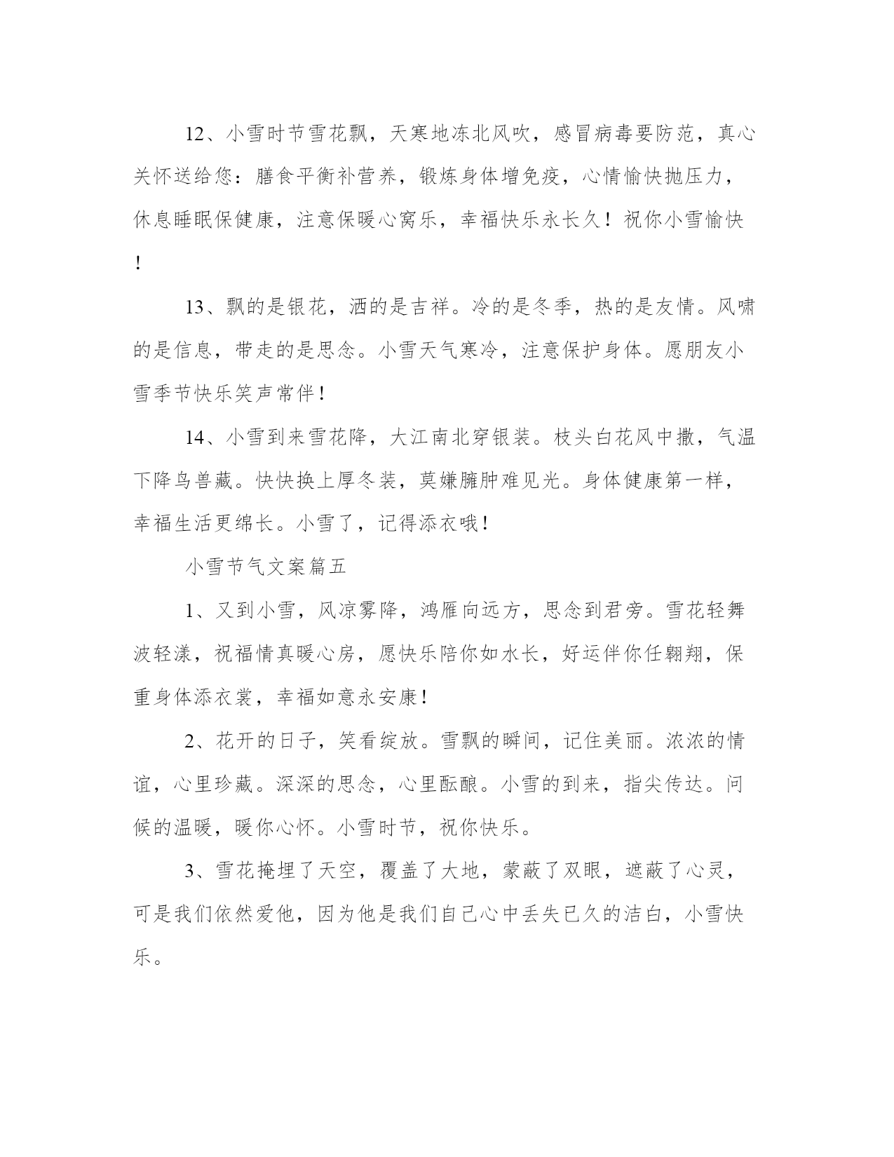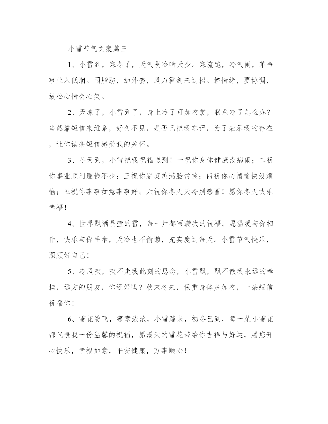 最新小雪节气文案(实用9篇)每个人都曾试图在平淡的学习、工作和生活中写一篇文章。写作是培养人的观察、联想、想象、思维和记忆的重要手段。写范文的时候需要注意什么呢?有哪些格式需要注意呢?接下来小编就给大家介绍一下优秀的范文该怎么写,我们一起来看一看吧。小雪节气文案篇一1、冬来小雪节气到,送你祝福更美妙,愿你身体健康病痛消,事业顺利直攀高,家和美满常微笑,心情愉快无烦恼,生活处处如意好,小雪节气千万别感冒!小雪快乐!2、小雪节气到,雪花飘飘落。美丽的季节,温柔的时节。愿可爱的小雪带去我的问候和关怀,愿你的冬天不再寒冷,愿你的生活其乐融融!3、小雪节气到,猜谜逗你笑。谜面:像糖不甜,像盐不咸。天冷开花,最怕太阳娃娃。呵呵,谜底:雪。祝福你冬日吉祥,开心快乐!4、小雪轻轻飘呀飘,捎来祝福一串串:一祝你身体倍棒能耐寒,二祝你工作顺利能力升,三祝你夫妻恩爱能性福,四祝你家庭和睦暖融融,五祝你高朋满座乐开怀!5、风吹落叶,落叶飘远,小雪已经来到身边,给你最温馨的思念,愿你整个冬天都温暖,快乐洋溢着幸福之船,愿你幸福永不变,开心到永远。愿您有小雪般飘溢的心情,永远快乐!6、每一朵雪花都集好运、快乐、成功、财富、平安、健康六样于一身,现在我送你漫天的雪花,愿你幸福万年长!驻小雪快乐!7、一片雪是孤独的,两片雪是寂寞的,千片万片雪那是错过的,小雪时节,我数雪,我想你,我要大声告诉你,天寒地冻,小心脚滑。8、小雪到了,愿你:用小雪的冷风,锤炼你的意志;小雪的冰霜,强健你的体魄;小雪的雪雨,浴你的灵魂;祝你小雪快乐,事业成功,身体健康,万事如意!9、抬头仰望星空,繁星不再闪烁;望眼滚滚长江,潮水不再涨落;静静漫步雨中,身体不再凉意;小雪悄悄地来,温暖不再贴怀;动动我的手指,送去我的关怀!祝万事如意!10、最寒季节小雪到;养生贴士又来到,天天保持心情好;早睡早起身体好,健身运动不可少;精神放松别伤脑,食能祛邪安脏腑;悦神爽志补气血,祝你小雪身体好,身心健康直到老!11、每一片雪花都是送给你的祝福,请用双手接住,让它轻轻融化在你手心里,直达你的心底,带给你一冬的暖意。小雪快乐!12、小雪到,天气冷,添衣戴帽暖暖身。喝碗汤,炖点肉,补血养颜热热心。暖和和,热乎乎,身不凉来心不冷。祝福你,永安康,幸福快乐常相伴。13、雪花的日记是彩色的,一张记忆中你的脸羞红,一张曾经的嬉闹青翠,一张许诺如日中天,一张向往如海蔚蓝。又到小雪了,你一切好吗?不能天天见面,始终惦记挂念,祝你快乐每一天。14、小雪时节寒气重,保暖御寒是首要。出门戴好保暖帽,鞋子常晒保干燥。夜晚棉被要盖好,预防感冒健康保。小雪到了,愿你快快乐乐,没有烦恼!15、小雪到,我搬来千年寒冰,将你的烦恼冰冻,将你的忧愁雪藏,将你的霉运蒸发,将你的忧郁覆盖,最后吸走所有的冷气,只给你留下一个温暖的冬天!16、青松翠柏,寒意正浓,雪花飘飘思绪万千种;思念深深,无处寄托,愿你生活永安好;小雪节气到,祝福也送到,加衣防感冒,愿你心情永远好!17、当地球转到某个角度,小雪就到了;当友情的指针受到磁极吸引,思念就到了;当多情的电波插上关怀的翅膀,问候就到了。祝愿亲爱的朋友,温暖过冬,照顾好自己!18、树光光,草黄黄,忧愁烦恼都忘光;风冷冷,雨凉凉,朋友问候暖心房;冬天到,气温降,朋友温情永不降;工作忙,生活忙,关怀朋友不能忘;问候到,情谊涨,幸福快乐齐分享。小雪节气到了,气温下降了,记得添衣保暖了,愿你冬日健康吉祥!19、落叶累了,飘飞的秋季走了;天气冷了,立冬慢慢的逃了;寒风吹了,小雪节气到了;手机响了,我的祝福送到。霜和冻已经牵手了,温度也降到零下了,寒风已经刺骨了,天短夜已经长了。你还等什么,衣服该加了,棉被也要加了,我的问候也送到了,愿你平安健康了!20、知你冰雪聪明,懂你冰清玉洁,陪你傲雪凌霜,为你雪中送碳,盼你雪兆丰年,与你风花雪月,不要冷若冰霜,真情不会冰消雪释,实意不能冰消雾散。小雪节气,祝福云起雪飞报平安!小雪节气文案篇二1.一片片小雪花洋洋洒洒,随风飘落,季节更替,小雪已到,望您保重身体,注意防寒保暖,适当进补,但要科学,加强锻炼,切勿过量,睡眠充足,精神良好,愿您小雪快乐,幸福如意!2.无声的雪,洒落片片关怀。晶莹的雪,凝结点点温馨。当雪花亲吻你的脸颊,瞬间化作滚烫的热泪,那是我的问候,已抵达你的心。小雪到了,多保重!3.小雪时节,雪花飞舞,茫茫大地,纯洁美丽。小雪冻住了忧愁,冻住了烦恼,却冻不住我对你的祝福。惟愿远方的你,小雪时节,一切安好!4.明媚的天气飘起小雪,似烦恼纷扰了你的行程,你的快乐穿过云层把雪花照亮,融化一地的微微笑意。想你在寒冷的冬季,记得飘雪的时候加衣,替我照顾好你的身体。祝福小雪快乐。5.抬头仰望星空,繁星不再闪烁;望