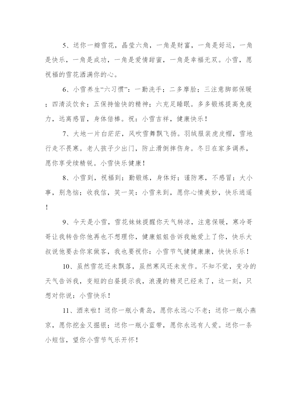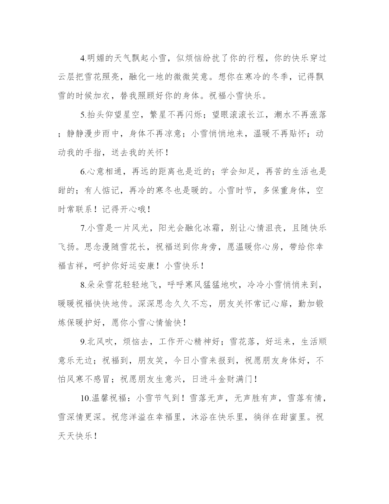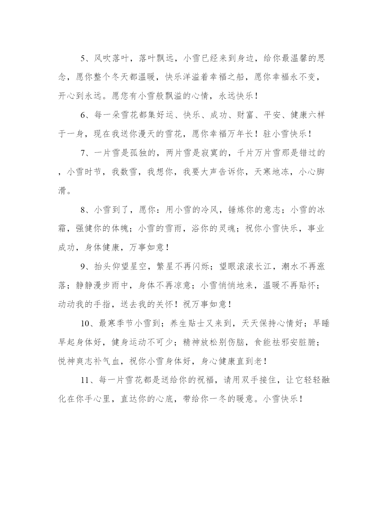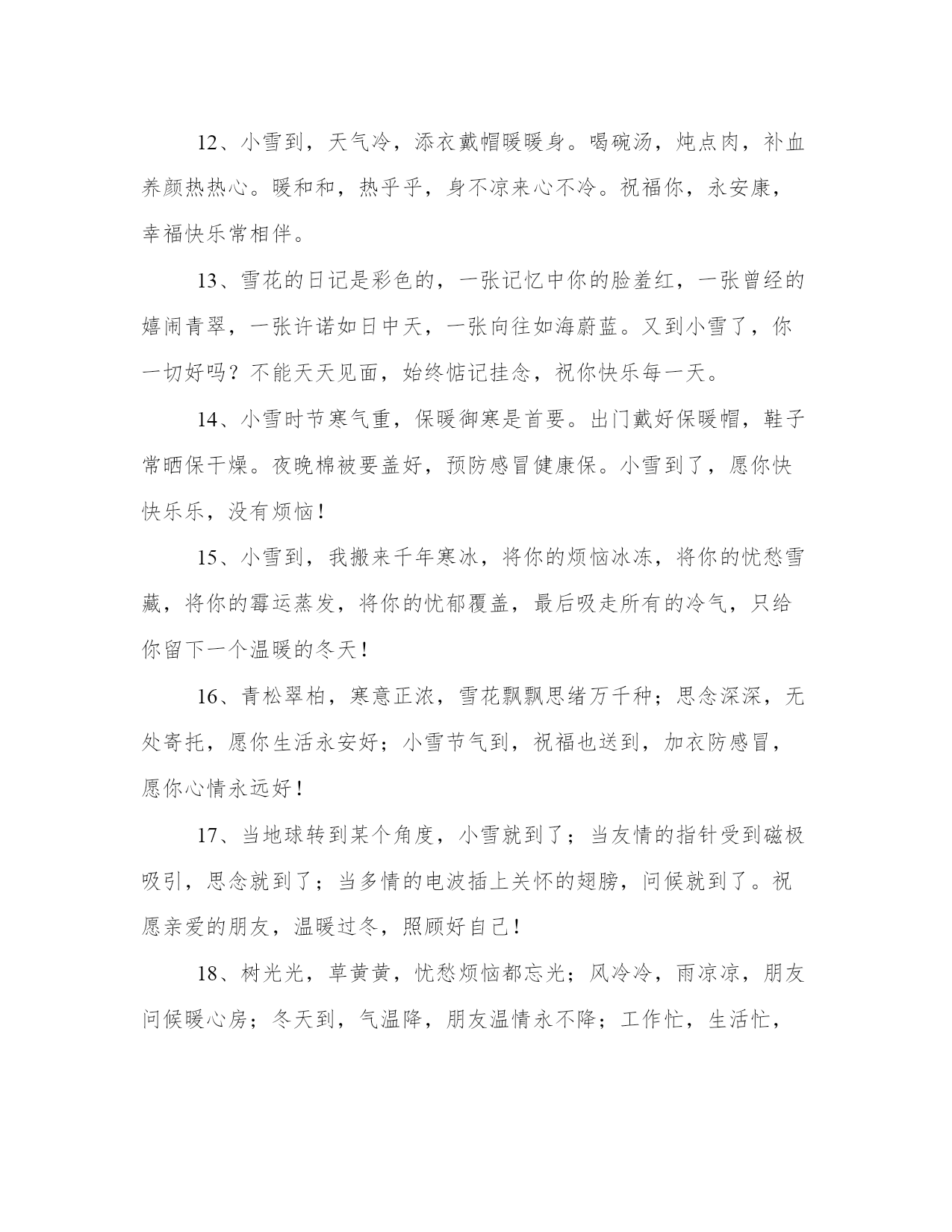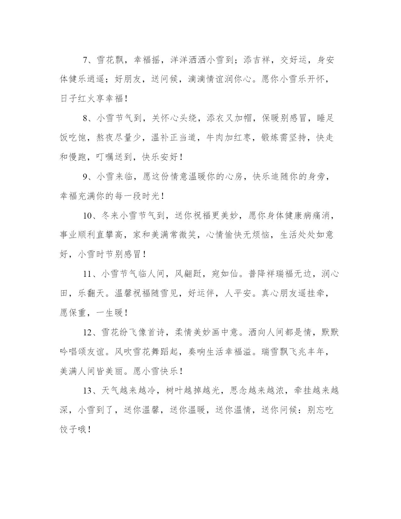 最新小雪节气文案(实用9篇)每个人都曾试图在平淡的学习、工作和生活中写一篇文章。写作是培养人的观察、联想、想象、思维和记忆的重要手段。写范文的时候需要注意什么呢?有哪些格式需要注意呢?接下来小编就给大家介绍一下优秀的范文该怎么写,我们一起来看一看吧。小雪节气文案篇一1、冬来小雪节气到,送你祝福更美妙,愿你身体健康病痛消,事业顺利直攀高,家和美满常微笑,心情愉快无烦恼,生活处处如意好,小雪节气千万别感冒!小雪快乐!2、小雪节气到,雪花飘飘落。美丽的季节,温柔的时节。愿可爱的小雪带去我的问候和关怀,愿你的冬天不再寒冷,愿你的生活其乐融融!3、小雪节气到,猜谜逗你笑。谜面:像糖不甜,像盐不咸。天冷开花,最怕太阳娃娃。呵呵,谜底:雪。祝福你冬日吉祥,开心快乐!4、小雪轻轻飘呀飘,捎来祝福一串串:一祝你身体倍棒能耐寒,二祝你工作顺利能力升,三祝你夫妻恩爱能性福,四祝你家庭和睦暖融融,五祝你高朋满座乐开怀!5、风吹落叶,落叶飘远,小雪已经来到身边,给你最温馨的思念,愿你整个冬天都温暖,快乐洋溢着幸福之船,愿你幸福永不变,开心到永远。愿您有小雪般飘溢的心情,永远快乐!6、每一朵雪花都集好运、快乐、成功、财富、平安、健康六样于一身,现在我送你漫天的雪花,愿你幸福万年长!驻小雪快乐!7、一片雪是孤独的,两片雪是寂寞的,千片万片雪那是错过的,小雪时节,我数雪,我想你,我要大声告诉你,天寒地冻,小心脚滑。8、小雪到了,愿你:用小雪的冷风,锤炼你的意志;小雪的冰霜,强健你的体魄;小雪的雪雨,浴你的灵魂;祝你小雪快乐,事业成功,身体健康,万事如意!9、抬头仰望星空,繁星不再闪烁;望眼滚滚长江,潮水不再涨落;静静漫步雨中,身体不再凉意;小雪悄悄地来,温暖不再贴怀;动动我的手指,送去我的关怀!祝万事如意!10、最寒季节小雪到;养生贴士又来到,天天保持心情好;早睡早起身体好,健身运动不可少;精神放松别伤脑,食能祛邪安脏腑;悦神爽志补气血,祝你小雪身体好,身心健康直到老!11、每一片雪花都是送给你的祝福,请用双手接住,让它轻轻融化在你手心里,直达你的心底,带给你一冬的暖意。小雪快乐!12、小雪到,天气冷,添衣戴帽暖暖身。喝碗汤,炖点肉,补血养颜热热心。暖和和,热乎乎,身不凉来心不冷。祝福你,永安康,幸福快乐常相伴。13、雪花的日记是彩色的,一张记忆中你的脸羞红,一张曾经的嬉闹青翠,一张许诺如日中天,一张向往如海蔚蓝。又到小雪了,你一切好吗?不能天天见面,始终惦记挂念,祝你快乐每一天。14、小雪时节寒气重,保暖御寒是首要。出门戴好保暖帽,鞋子常晒保干燥。夜晚棉被要盖好,预防感冒健康保。小雪到了,愿你快快乐乐,没有烦恼!15、小雪到,我搬来千年寒冰,将你的烦恼冰冻,将你的忧愁雪藏,将你的霉运蒸发,将你的忧郁覆盖,最后吸走所有的冷气,只给你留下一个温暖的冬天!16、青松翠柏,寒意正浓,雪花飘飘思绪万千种;思念深深,无处寄托,愿你生活永安好;小雪节气到,祝福也送到,加衣防感冒,愿你心情永远好!17、当地球转到某个角度,小雪就到了;当友情的指针受到磁极吸引,思念就到了;当多情的电波插上关怀的翅膀,问候就到了。祝愿亲爱的朋友,温暖过冬,照顾好自己!18、树光光,草黄黄,忧愁烦恼都忘光;风冷冷,雨凉凉,朋友问候暖心房;冬天到,气温降,朋友温情永不降;工作忙,生活忙,关怀朋友不能忘;问候到,情谊涨,幸福快乐齐分享。小雪节气到了,气温下降了,记得添衣保暖了,愿你冬日健康吉祥!19、落叶累了,飘飞的秋季走了;天气冷了,立冬慢慢的逃了;寒风吹了,小雪节气到了;手机响了,我的祝福送到。霜和冻已经牵手了,温度也降到零下了,寒风已经刺骨了,天短夜已经长了。你还等什么,衣服该加了,棉被也要加了,我的问候也送到了,愿你平安健康了!20、知你冰雪聪明,懂你冰清玉洁,陪你傲雪凌霜,为你雪中送碳,盼你雪兆丰年,与你风花雪月,不要冷若冰霜,真情不会冰消雪释,实意不能冰消雾散。小雪节气,祝福云起雪飞报平安!小雪节气文案篇二1.一片片小雪花洋洋洒洒,随风飘落,季节更替,小雪已到,望您保重身体,注意防寒保暖,适当进补,但要科学,加强锻炼,切勿过量,睡眠充足,精神良好,愿您小雪快乐,幸福如意!2.无声的雪,洒落片片关怀。晶莹的雪,凝结点点温馨。当雪花亲吻你的脸颊,瞬间化作滚烫的热泪,那是我的问候,已抵达你的心。小雪到了,多保重!3.小雪时节,雪花飞舞,茫茫大地,纯洁美丽。小雪冻住了忧愁,冻住了烦恼,却冻不住我对你的祝福。惟愿远方的你,小雪时节,一切安好!4.明媚的天气飘起小雪,似烦恼纷扰了你的行程,你的快乐穿过云层把雪花照亮,融化一地的微微笑意。想你在寒冷的冬季,记得飘雪的时候加衣,替我照顾好你的身体。祝福小雪快乐。5.抬头仰望星空,繁星不再闪烁;望