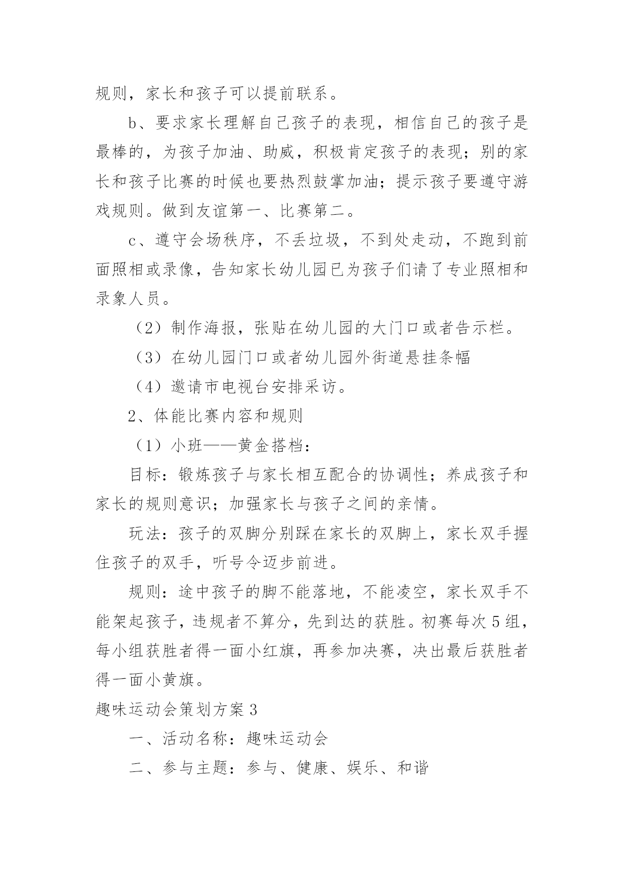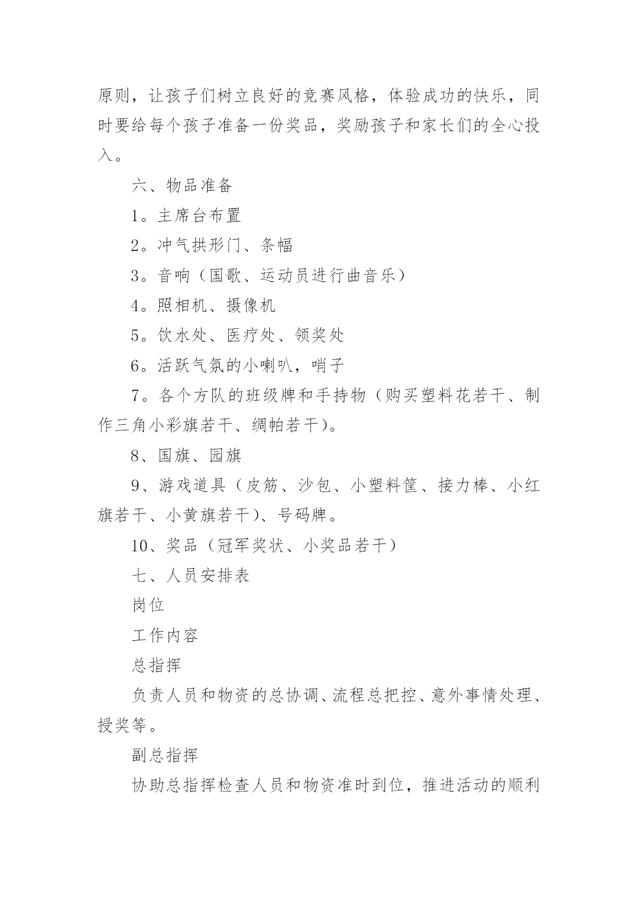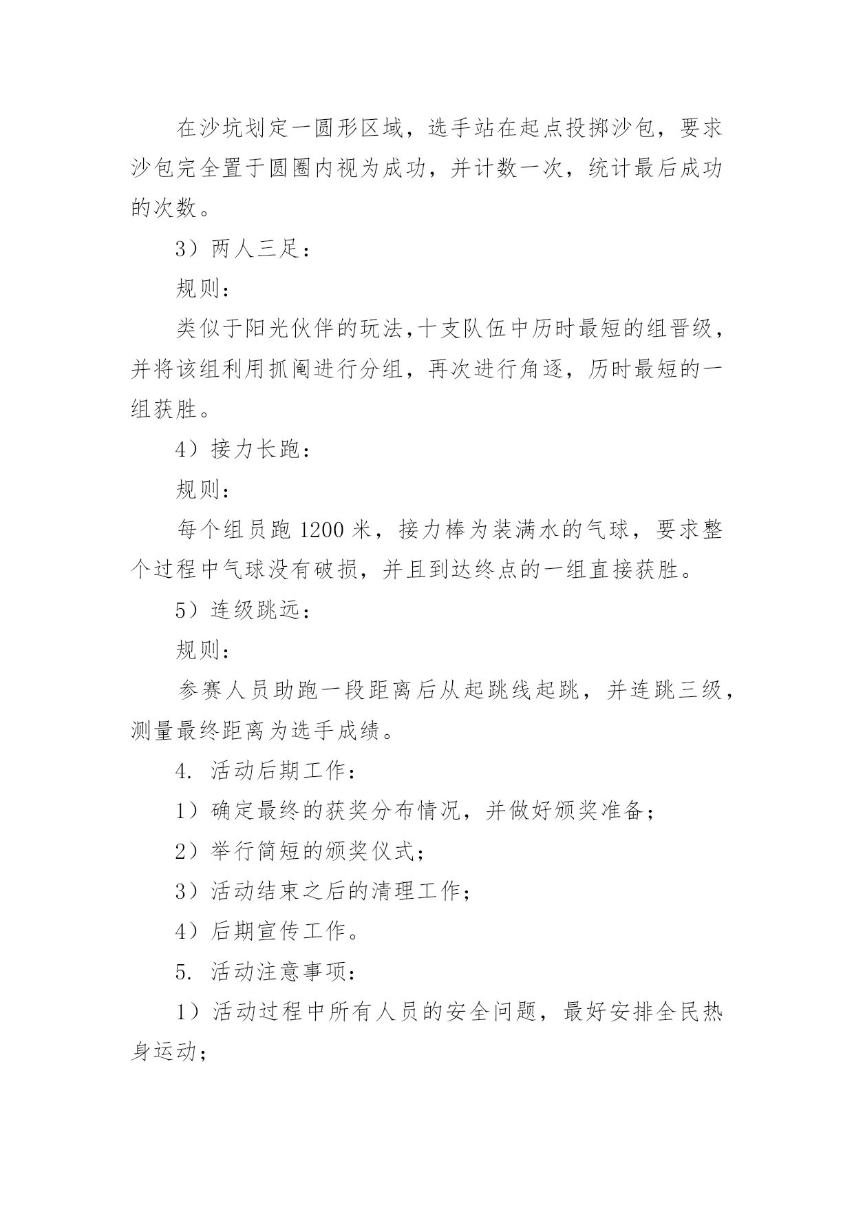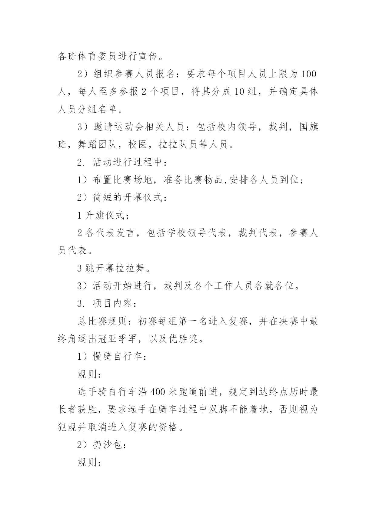 趣味运动会策划方案趣味运动会策划方案为了确保工作或事情顺利进行,时常需要预先开展方案准备工作,方案是从目的、要求、方式、方法、进度等方面进行安排的书面计划。那么制定方案需要注意哪些问题呢?以下是小编为大家收集的趣味运动会策划方案,仅供参考,大家一起来看看吧。趣味运动会策划方案1一、活动名称:“追忆童年”趣味运动会二、活动主题:追忆逝去童年时光,弘扬全民健身精神。三、活动目的:此次趣味运动会的目的是,庆祝即将到来的六·一儿童节,让当代大学生能够保持童年的青春活力,童年的活泼健康,让其在活动中娱乐,在游戏中健身。四、活动时间:20xx-06-01上午8:00~11:30;下午2:30~6:00五、策划、主办单位:西南石油大学学生会活动地点:西南石油大学足球场六、活动对象:全校师生七、活动流程:1.前期准备工作:1)前期宣传:要求通过海报,展板,校广播站,以及各班体育委员进行宣传。2)组织参赛人员报名:要求每个项目人员上限为100人,每人至多参报2个项目,将其分成10组,并确定具体人员分组名单。3)邀请运动会相关人员:包括校内领导,裁判,国旗班,舞蹈团队,校医,拉拉队员等人员。2.活动进行过程中:1)布置比赛场地,准备比赛物品,安排各人员到位;2)简短的开幕仪式:1升旗仪式;2各代表发言,包括学校领导代表,裁判代表,参赛人员代表。3跳开幕拉拉舞。3)活动开始进行,裁判及各个工作人员各就各位。3.项目内容:总比赛规则:初赛每组第一名进入复赛,并在决赛中最终角逐出冠亚季军,以及优胜奖。1)慢骑自行车:规则:选手骑自行车沿400米跑道前进,规定到达终点历时最长者获胜,要求选手在骑车过程中双脚不能着地,否则视为犯规并取消进入复赛的资格。2)扔沙包:规则:在沙坑划定一圆形区域,选手站在起点投掷沙包,要求沙包完全置于圆圈内视为成功,并计数一次,统计最后成功的次数。3)两人三足:规则:类似于阳光伙伴的玩法,十支队伍中历时最短的组晋级,并将该组利用抓阄进行分组,再次进行角逐,历时最短的一组获胜。4)接力长跑:规则:每个组员跑1200米,接力棒为装满水的气球,要求整个过程中气球没有破损,并且到达终点的一组直接获胜。5)连级跳远:规则:参赛人员助跑一段距离后从起跳线起跳,并连跳三级,测量最终距离为选手成绩。4.活动后期工作:1)确定最终的获奖分布情况,并做好颁奖准备;2)举行简短的颁奖仪式;3)活动结束之后的清理工作;4)后期宣传工作。5.活动注意事项:1)活动过程中所有人员的安全问题,最好安排全民热身运动;2)预防中暑情况的发生,以及情况发生之后的应急处理,具体工作交由校医解决;3)如遇下雨等不良天气情况,活动则往后顺延;趣味运动会策划方案2一、活动主题:大手牵小手,一起来加油!二、活动目的:1、动力目标:体验运动的快乐,竞争的乐趣以及规则意识及协作精神;2。能力目标:在与父母游戏中发展幼儿的走、投掷和跑的。能力;3、知识目标:学习走、投准和助跑跨栏等基本动作;4、亲子目标:督促家长关注孩子的体能发展,和孩子一起培养对体育活动的爱好,为孩子的将来建立良好的运动习惯。三、活动形式:体操表演、亲子体能比赛。四、活动时间和地点:4、5月份幼儿园大操场或体育馆五、活动原则:1、安全第一。不管在园里举行还是在外面租场地举行,必须保证每一个孩子的安全。2、家长和孩子齐参与。让每一位家长和孩子都参与到我们活动中来,家长不再是单纯的观众和欣赏者,要积极参与做一个让孩子自豪骄傲的爸爸妈妈!3、公平、博爱原则。活动中体现公平竞争,公平比赛原则,让孩子们树立良好的竞赛风格,体验成功的快乐,同时要给每个孩子准备一份奖品,奖励孩子和家长们的全心投入。六、物品准备1。主席台布置2。冲气拱形门、条幅3。音响(国歌、运动员进行曲音乐)4。照相机、摄像机5。饮水处、医疗处、领奖处6。活跃气氛的小喇叭,哨子7。各个方队的班级牌和手持物(购买塑料花若干、制作三角小彩旗若干、绸帕若干)。8、国旗、园旗9、游戏道具(皮筋、沙包、小塑料筐、接力棒、小红旗若干、小黄旗若干)、号码牌。10、奖品(冠军奖状、小奖品若干)七、人员安排表岗位工作内容总指挥负责人员和物资的总协调、流程总把控、意外事情处理、授奖等。副总指挥协助总指挥检查人员和物资准时到位,推进活动的顺利进行,组织授奖。年纪组负责人负责本年纪组展示活动和游戏的组织、评判、人员分工、道具准备。主持人主持活动流程,把每个环节流畅串联在一起。音响师负责音响设备及所有音乐的播放摄像师负责摄录这个活动场景,有重点有全面。保健医负责活动中出现的意外小事故小伤口的处理。门卫防止活动中孩子单独出园,不是本园家长擅自出入幼儿园。宣传员负责联络当地的报社、电视台对活动进行报道,并协助报社、电视台完成报道稿子领奖处给每个家庭发一份小奖品。八、活动内容(一)活