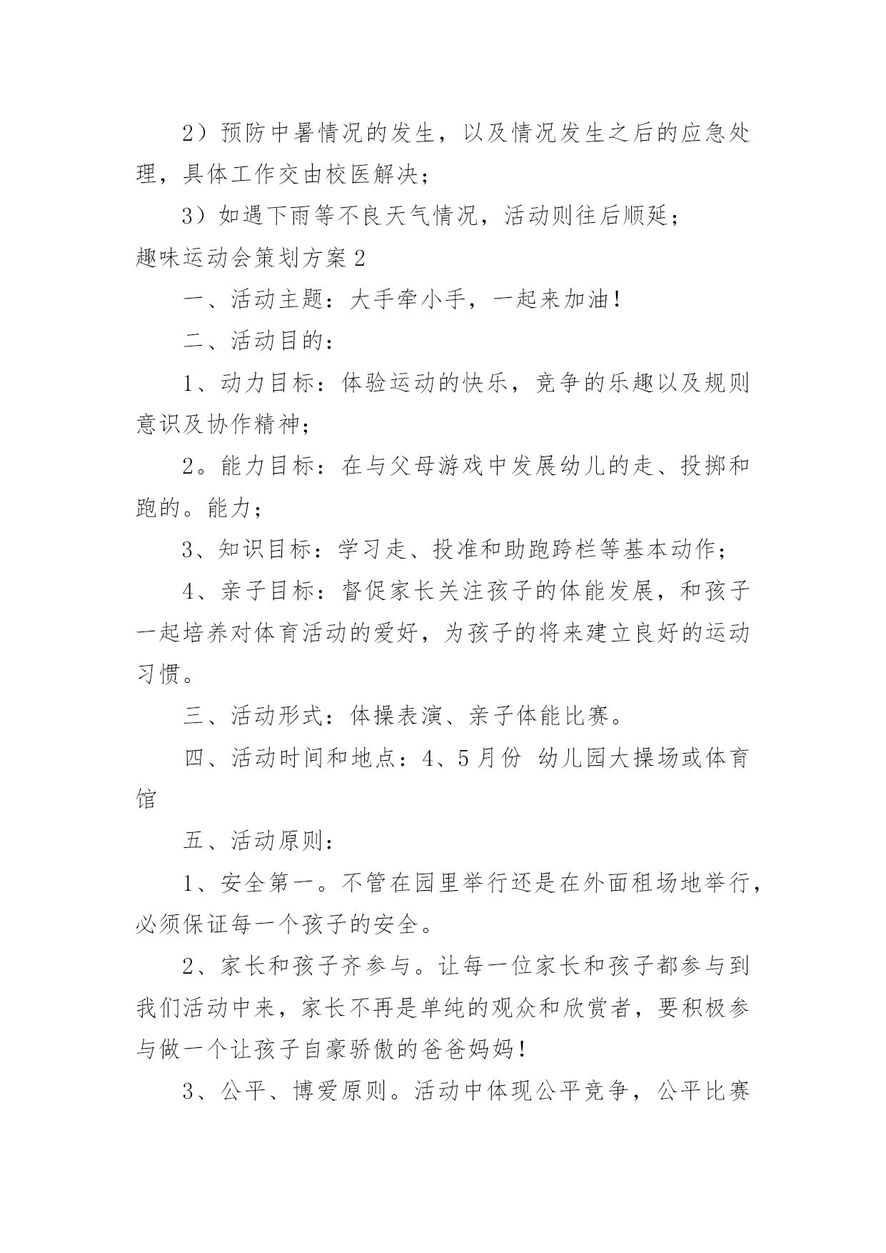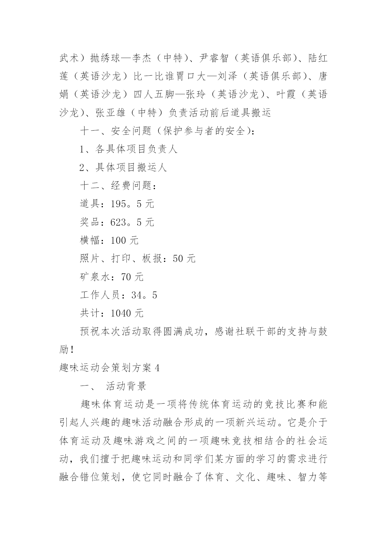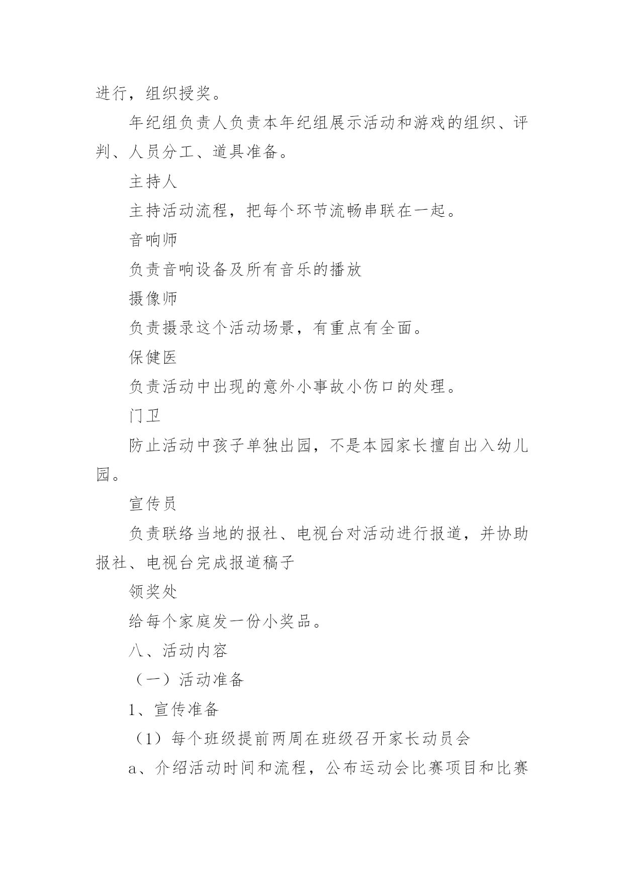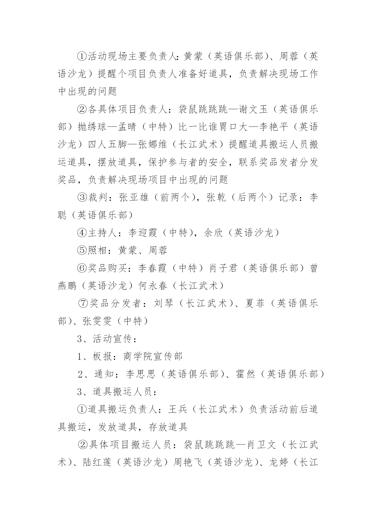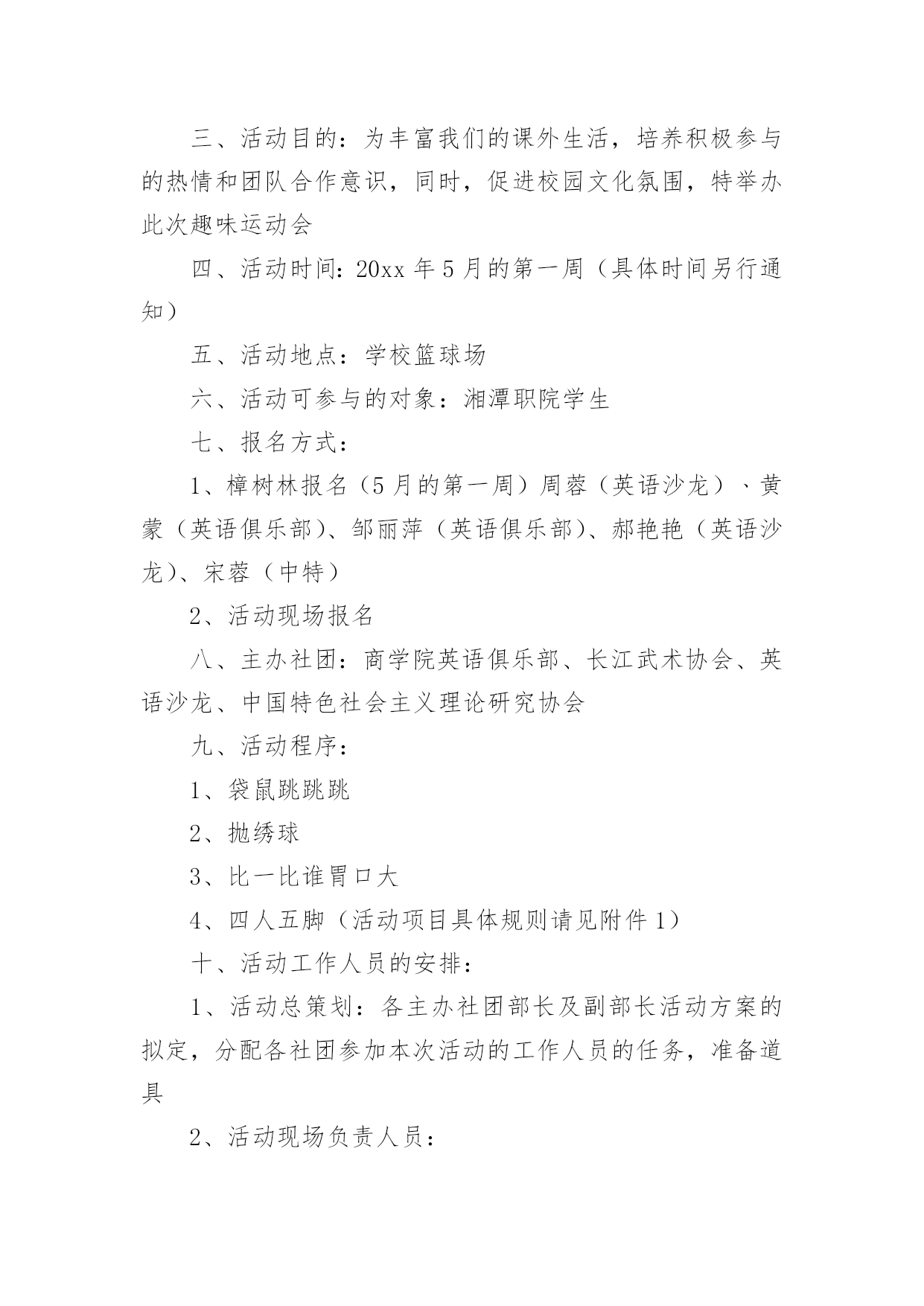 趣味运动会策划方案趣味运动会策划方案为了确保工作或事情顺利进行,时常需要预先开展方案准备工作,方案是从目的、要求、方式、方法、进度等方面进行安排的书面计划。那么制定方案需要注意哪些问题呢?以下是小编为大家收集的趣味运动会策划方案,仅供参考,大家一起来看看吧。趣味运动会策划方案1一、活动名称:“追忆童年”趣味运动会二、活动主题:追忆逝去童年时光,弘扬全民健身精神。三、活动目的:此次趣味运动会的目的是,庆祝即将到来的六·一儿童节,让当代大学生能够保持童年的青春活力,童年的活泼健康,让其在活动中娱乐,在游戏中健身。四、活动时间:20xx-06-01上午8:00~11:30;下午2:30~6:00五、策划、主办单位:西南石油大学学生会活动地点:西南石油大学足球场六、活动对象:全校师生七、活动流程:1.前期准备工作:1)前期宣传:要求通过海报,展板,校广播站,以及各班体育委员进行宣传。2)组织参赛人员报名:要求每个项目人员上限为100人,每人至多参报2个项目,将其分成10组,并确定具体人员分组名单。3)邀请运动会相关人员:包括校内领导,裁判,国旗班,舞蹈团队,校医,拉拉队员等人员。2.活动进行过程中:1)布置比赛场地,准备比赛物品,安排各人员到位;2)简短的开幕仪式:1升旗仪式;2各代表发言,包括学校领导代表,裁判代表,参赛人员代表。3跳开幕拉拉舞。3)活动开始进行,裁判及各个工作人员各就各位。3.项目内容:总比赛规则:初赛每组第一名进入复赛,并在决赛中最终角逐出冠亚季军,以及优胜奖。1)慢骑自行车:规则:选手骑自行车沿400米跑道前进,规定到达终点历时最长者获胜,要求选手在骑车过程中双脚不能着地,否则视为犯规并取消进入复赛的资格。2)扔沙包:规则:在沙坑划定一圆形区域,选手站在起点投掷沙包,要求沙包完全置于圆圈内视为成功,并计数一次,统计最后成功的次数。3)两人三足:规则:类似于阳光伙伴的玩法,十支队伍中历时最短的组晋级,并将该组利用抓阄进行分组,再次进行角逐,历时最短的一组获胜。4)接力长跑:规则:每个组员跑1200米,接力棒为装满水的气球,要求整个过程中气球没有破损,并且到达终点的一组直接获胜。5)连级跳远:规则:参赛人员助跑一段距离后从起跳线起跳,并连跳三级,测量最终距离为选手成绩。4.活动后期工作:1)确定最终的获奖分布情况,并做好颁奖准备;2)举行简短的颁奖仪式;3)活动结束之后的清理工作;4)后期宣传工作。5.活动注意事项:1)活动过程中所有人员的安全问题,最好安排全民热身运动;2)预防中暑情况的发生,以及情况发生之后的应急处理,具体工作交由校医解决;3)如遇下雨等不良天气情况,活动则往后顺延;趣味运动会策划方案2一、活动主题:大手牵小手,一起来加油!二、活动目的:1、动力目标:体验运动的快乐,竞争的乐趣以及规则意识及协作精神;2。能力目标:在与父母游戏中发展幼儿的走、投掷和跑的。能力;3、知识目标:学习走、投准和助跑跨栏等基本动作;4、亲子目标:督促家长关注孩子的体能发展,和孩子一起培养对体育活动的爱好,为孩子的将来建立良好的运动习惯。三、活动形式:体操表演、亲子体能比赛。四、活动时间和地点:4、5月份幼儿园大操场或体育馆五、活动原则:1、安全第一。不管在园里举行还是在外面租场地举行,必须保证每一个孩子的安全。2、家长和孩子齐参与。让每一位家长和孩子都参与到我们活动中来,家长不再是单纯的观众和欣赏者,要积极参与做一个让孩子自豪骄傲的爸爸妈妈!3、公平、博爱原则。活动中体现公平竞争,公平比赛原则,让孩子们树立良好的竞赛风格,体验成功的快乐,同时要给每个孩子准备一份奖品,奖励孩子和家长们的全心投入。六、物品准备1。主席台布置2。冲气拱形门、条幅3。音响(国歌、运动员进行曲音乐)4。照相机、摄像机5。饮水处、医疗处、领奖处6。活跃气氛的小喇叭,哨子7。各个方队的班级牌和手持物(购买塑料花若干、制作三角小彩旗若干、绸帕若干)。8、国旗、园旗9、游戏道具(皮筋、沙包、小塑料筐、接力棒、小红旗若干、小黄旗若干)、号码牌。10、奖品(冠军奖状、小奖品若干)七、人员安排表岗位工作内容总指挥负责人员和物资的总协调、流程总把控、意外事情处理、授奖等。副总指挥协助总指挥检查人员和物资准时到位,推进活动的顺利进行,组织授奖。年纪组负责人负责本年纪组展示活动和游戏的组织、评判、人员分工、道具准备。主持人主持活动流程,把每个环节流畅串联在一起。音响师负责音响设备及所有音乐的播放摄像师负责摄录这个活动场景,有重点有全面。保健医负责活动中出现的意外小事故小伤口的处理。门卫防止活动中孩子单独出园,不是本园家长擅自出入幼儿园。宣传员负责联络当地的报社、电视台对活动进行报道,并协助报社、电视台完成报道稿子领奖处给每个家庭发一份小奖品。八、活动内容(一)活