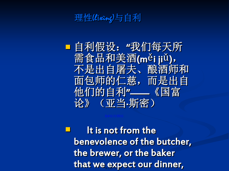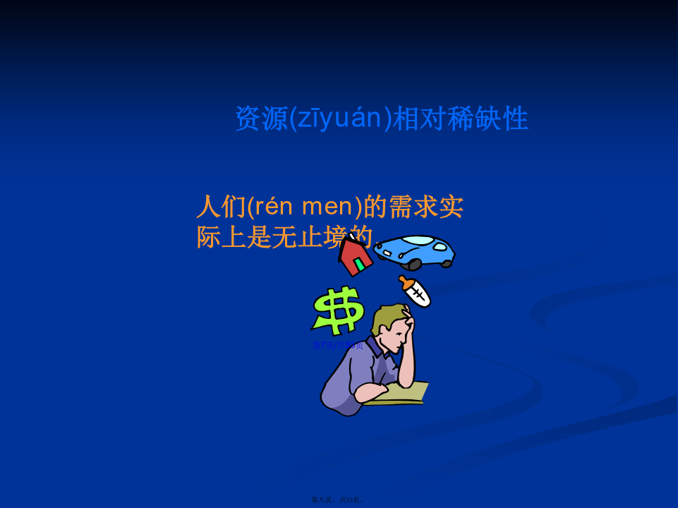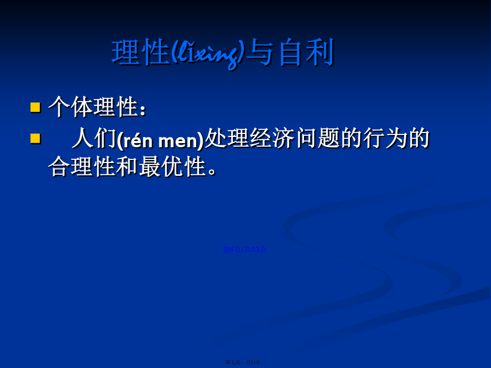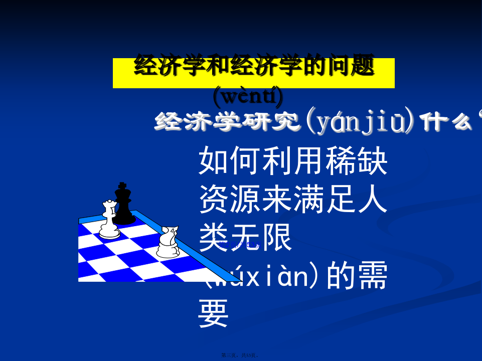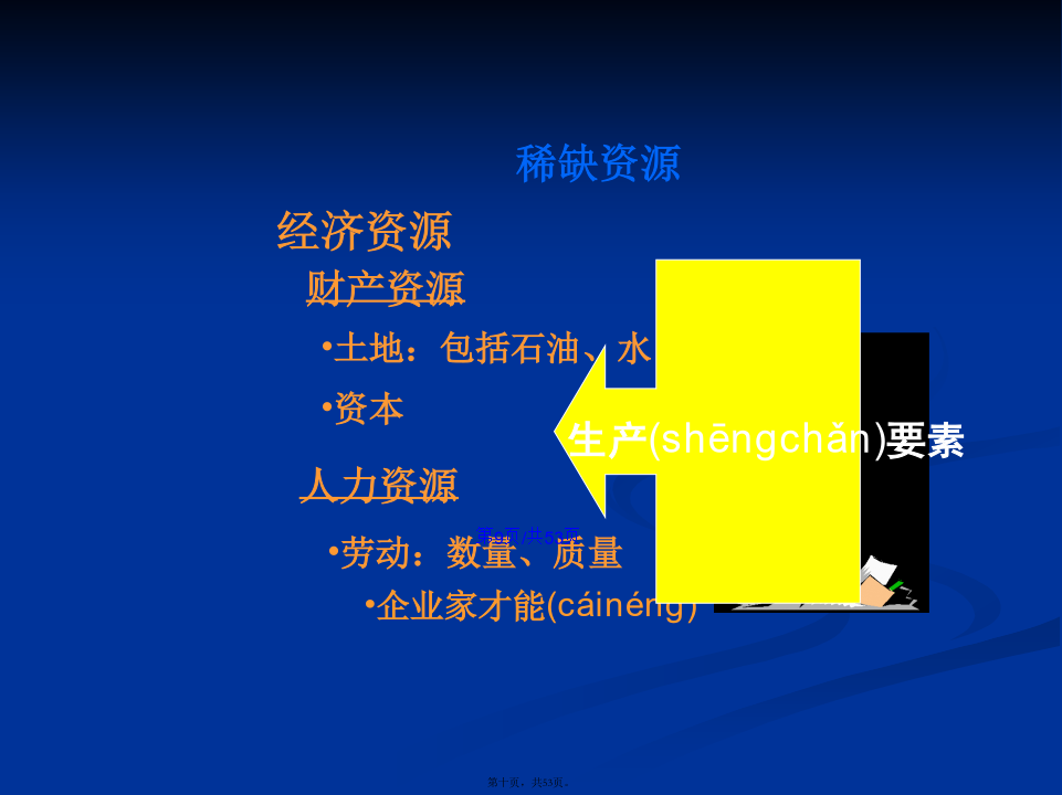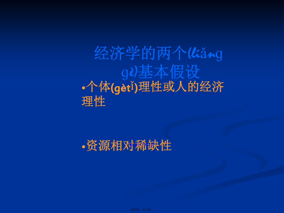 会计学经济(jīngjì):Economy经济(jīngjì)学:Economics政治经济(jīngjì)学西方经济(jīngjì)学经济学和经济学的问题(wèntí)个体(gètǐ)理性或人的经济理性资源相对稀缺性理性(lǐxìng)与自利理性(lǐxìng)与自利理性(lǐxìng)与自利资源(zīyuán)相对稀缺性但生产性资源是有限(yǒuxiàn)的或稀缺的!企业家才能(cáinéng)权衡(quánhéng)、机会成本与经济选择生产(shēngchǎn)可能性生产(shēngchǎn)可能性利用我们(wǒmen)的资源,为了得到一些比萨饼,我们(wǒmen)必须放弃一些机器人!比萨饼01234(10万)比萨饼01234(10万)比萨饼01234(10万)比萨饼01234(10万)比萨饼01234(10万)比萨饼01234(10万)比萨饼01234(10万)在任何(rènhé)时点上,一个充分就业、资源充分利用的经济中,为了生产X则必须放弃一部分Y的生产案例(ànlì)讨论案例(ànlì)讨论评判(píngpàn)标准经济体制:市场(shìchǎng)的角色经济体制(jīnɡjìtǐzhì)实证与规范(guīfàn)优化与均衡边际分析经济模型经济模型经济(jīngjì)方法论微观(wēiguān)经济学...票证买卖问题食堂(shítáng)排队问题为什么要学习(xuéxí)经济学循环(xúnhuán)流模型CIRCULARFLOWMODELKeyTerms需求(xūqiú)与供给