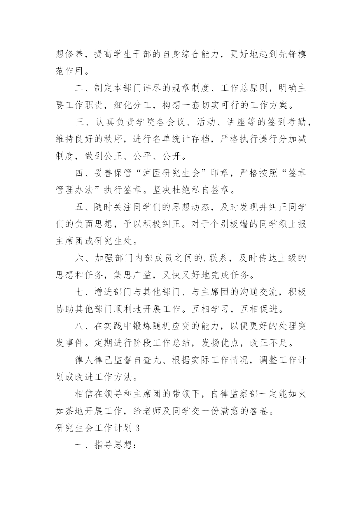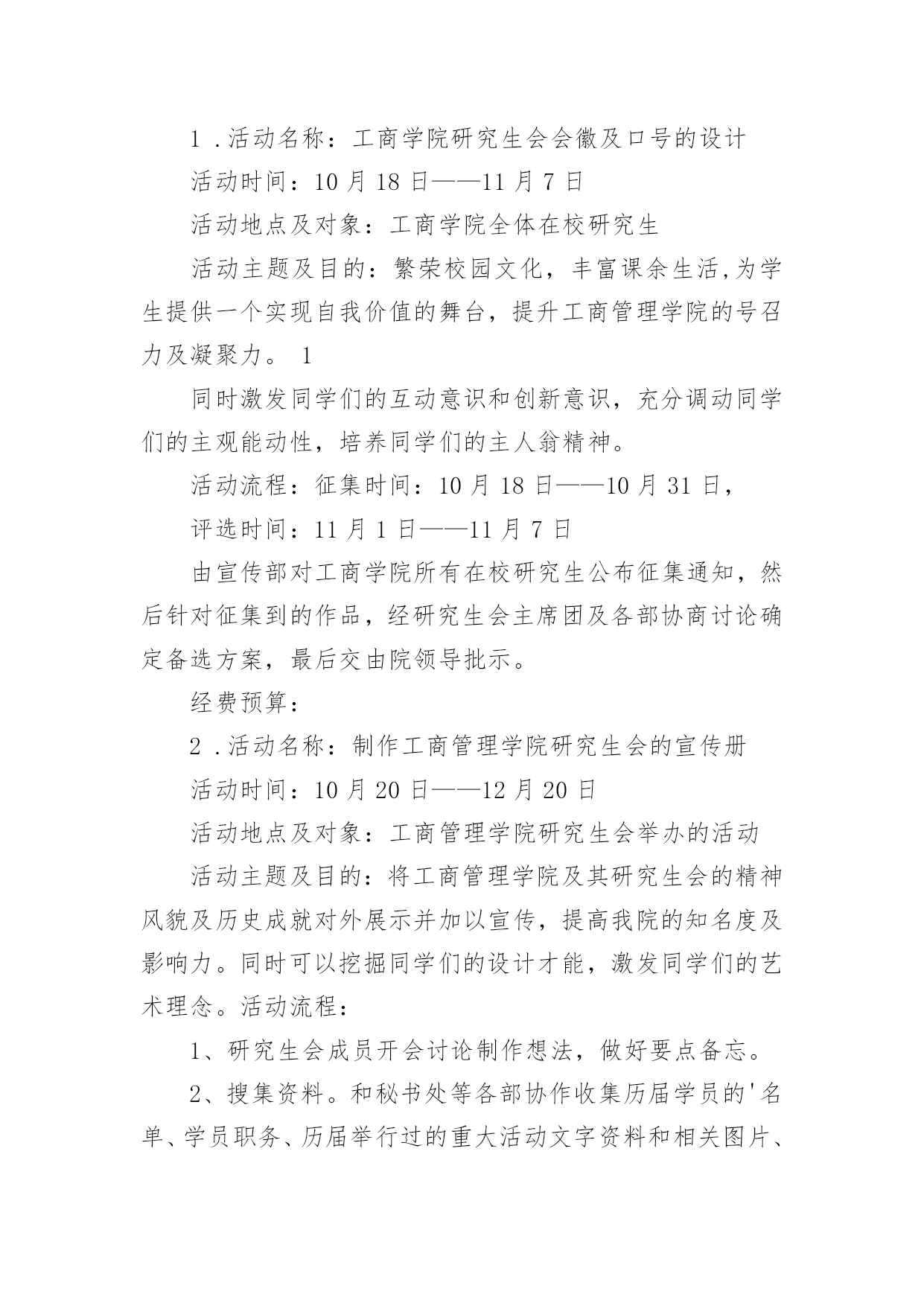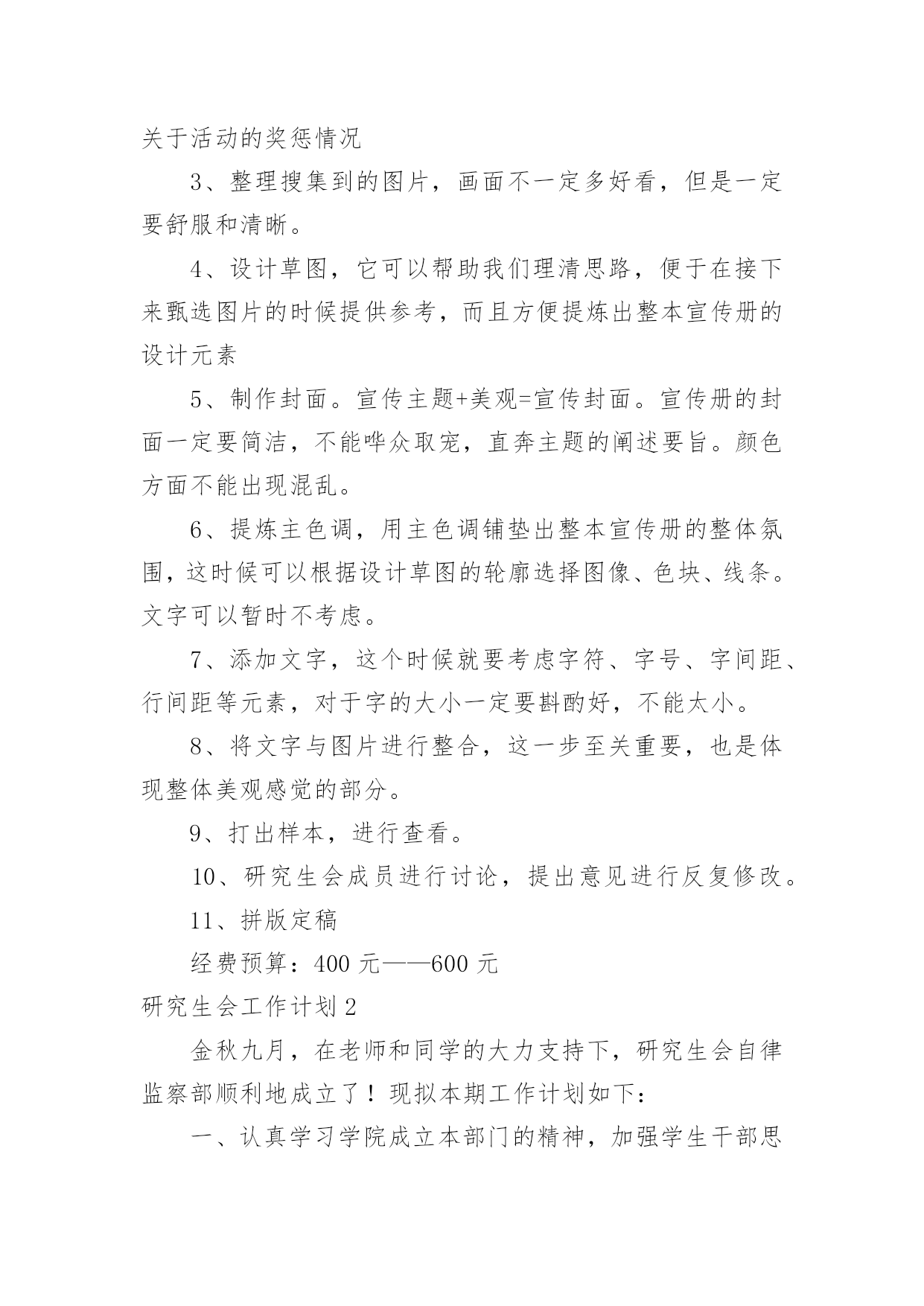 研究生会工作计划研究生会工作计划日子如同白驹过隙,相信大家对即将到来的工作生活满心期待吧!一起对今后的学习做个计划吧。你所接触过的计划都是什么样子的呢?以下是小编精心整理的研究生会工作计划,希望能够帮助到大家。研究生会工作计划1一、部门成员(可包含各成员分工)部长:李一(09会计学)副部长:张二(09会计学)干事:周三(10会计学)二、部门职能作为学院研究生会一个重要的职能部门,宣传部是我院研究生舆论宣传的重要阵地,是展示工商学院风采与特色的窗口,也是展示我院研究生才华的平台。秉承“外宣内传”的工作理念,担负着建设工商学院先进文化的重任,新一届研究生会宣传部将发扬创新精神,创造性地开展宣传活动。在坚持传统宣传方式的基础上,广开思路,利用网络资源,通过多种渠道将工商学院的进步展示在全校师生面前,同时工商学院研究生会的新风貌也将得以展示。三、工作计划1.活动名称:工商学院研究生会会徽及口号的设计活动时间:10月18日——11月7日活动地点及对象:工商学院全体在校研究生活动主题及目的:繁荣校园文化,丰富课余生活,为学生提供一个实现自我价值的舞台,提升工商管理学院的号召力及凝聚力。1同时激发同学们的互动意识和创新意识,充分调动同学们的主观能动性,培养同学们的主人翁精神。活动流程:征集时间:10月18日——10月31日,评选时间:11月1日——11月7日由宣传部对工商学院所有在校研究生公布征集通知,然后针对征集到的作品,经研究生会主席团及各部协商讨论确定备选方案,最后交由院领导批示。经费预算:2.活动名称:制作工商管理学院研究生会的宣传册活动时间:10月20日——12月20日活动地点及对象:工商管理学院研究生会举办的活动活动主题及目的:将工商管理学院及其研究生会的精神风貌及历史成就对外展示并加以宣传,提高我院的知名度及影响力。同时可以挖掘同学们的设计才能,激发同学们的艺术理念。活动流程:1、研究生会成员开会讨论制作想法,做好要点备忘。2、搜集资料。和秘书处等各部协作收集历届学员的'名单、学员职务、历届举行过的重大活动文字资料和相关图片、关于活动的奖惩情况3、整理搜集到的图片,画面不一定多好看,但是一定要舒服和清晰。4、设计草图,它可以帮助我们理清思路,便于在接下来甄选图片的时候提供参考,而且方便提炼出整本宣传册的设计元素5、制作封面。宣传主题+美观=宣传封面。宣传册的封面一定要简洁,不能哗众取宠,直奔主题的阐述要旨。颜色方面不能出现混乱。6、提炼主色调,用主色调铺垫出整本宣传册的整体氛围,这时候可以根据设计草图的轮廓选择图像、色块、线条。文字可以暂时不考虑。7、添加文字,这个时候就要考虑字符、字号、字间距、行间距等元素,对于字的大小一定要斟酌好,不能太小。8、将文字与图片进行整合,这一步至关重要,也是体现整体美观感觉的部分。9、打出样本,进行查看。10、研究生会成员进行讨论,提出意见进行反复修改。11、拼版定稿经费预算:400元——600元研究生会工作计划2金秋九月,在老师和同学的大力支持下,研究生会自律监察部顺利地成立了!现拟本期工作计划如下:一、认真学习学院成立本部门的精神,加强学生干部思想修养,提高学生干部的自身综合能力,更好地起到先锋模范作用。二、制定本部门详尽的规章制度、工作总原则,明确主要工作职责,细化分工,构想一套切实可行的工作方案。三、认真负责学院各会议、活动、讲座等的签到考勤,维持良好的秩序,进行名单统计存档,严格执行操行分加减制度,做到公正、公平、公开。四、妥善保管“泸医研究生会”印章,严格按照“签章管理办法”执行签章。坚决杜绝私自签章。五、随时关注同学们的思想动态,及时发现并纠正同学们的负面思想,予以积极纠正。对于个别极端的同学须上报主席团或研究生处。六、加强部门内部成员之间的.联系,及时传达上级的思想和任务,集思广益,又快又好地完成任务。七、增进部门与其他部门、与主席团的沟通交流,积极协助其他部门顺利地开展工作。互相学习,互相促进。八、在实践中锻炼随机应变的能力,以便更好的处理突发事件。定期进行阶段工作总结,发扬优点,改正不足。律人律己监督自查九、根据实际工作情况,调整工作计划或改进工作方法。相信在领导和主席团的带领下,自律监察部一定能如火如荼地开展工作,给老师及同学交一份满意的答卷。研究生会工作计划3一、指导思想:明确职责,力求创新,依靠集体,集思广益,脚踏实地,实现目标。二、定期开展例会,每周二晚为既定的主席团会议时间,同时根据活动的安排,适时增加例会次数。三、工作要点:1、国庆迎新晚会:目的:为加强软件学院20xx级,老师与学生之间,班级与班级,学生与学生之间的联系。特此研会举办一次“浙江大学软件学院20xx级新生迎新游园会”。以各班表演的形式为主,游戏为辅,活跃气氛,请学院领导、老师作为评委给每个节目