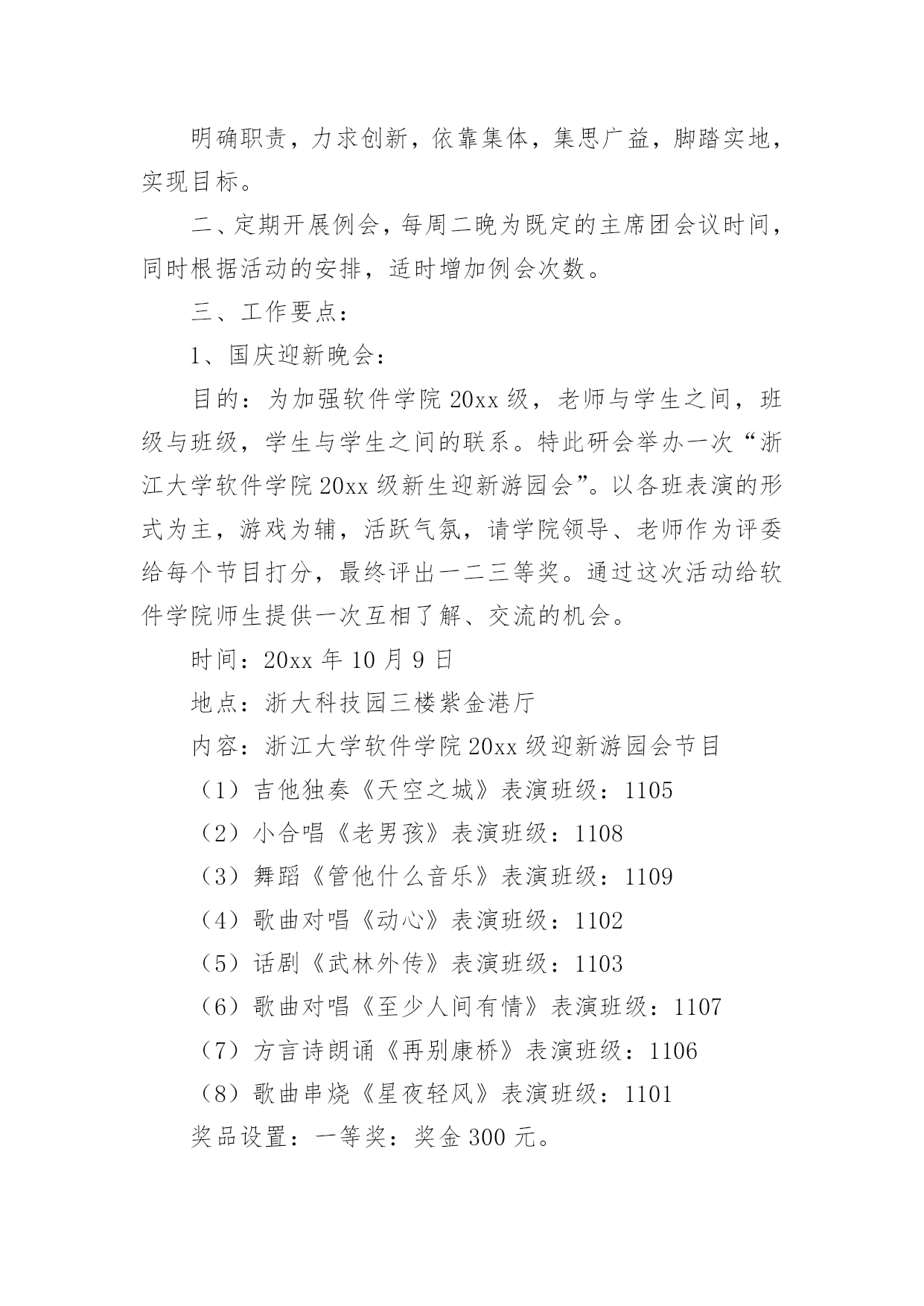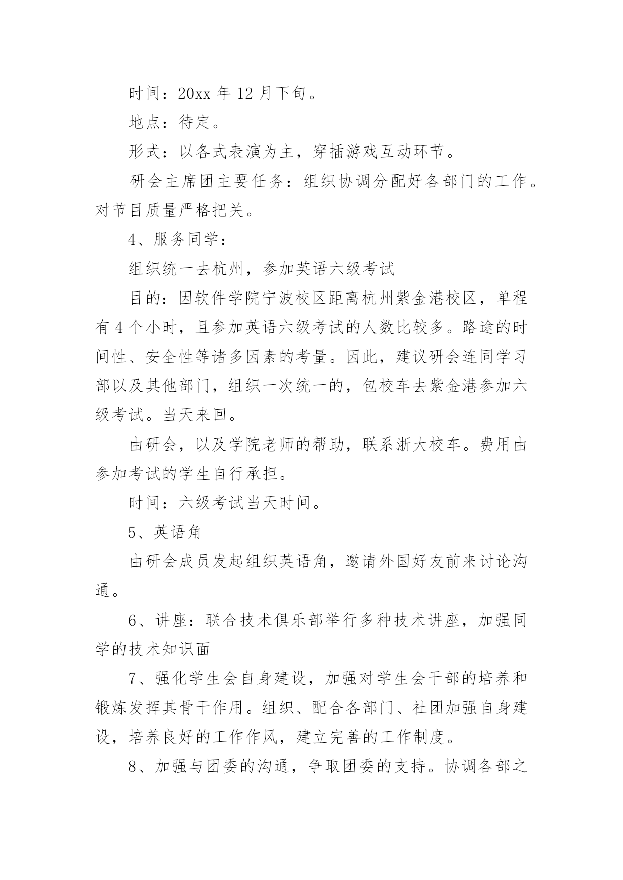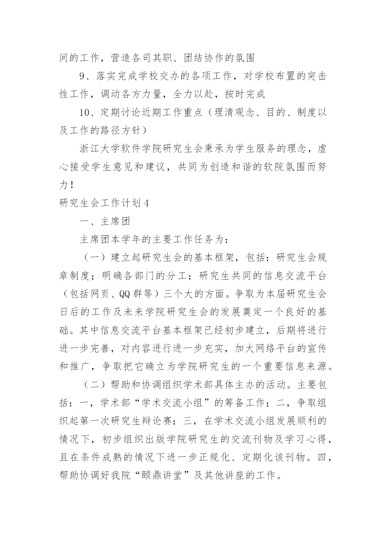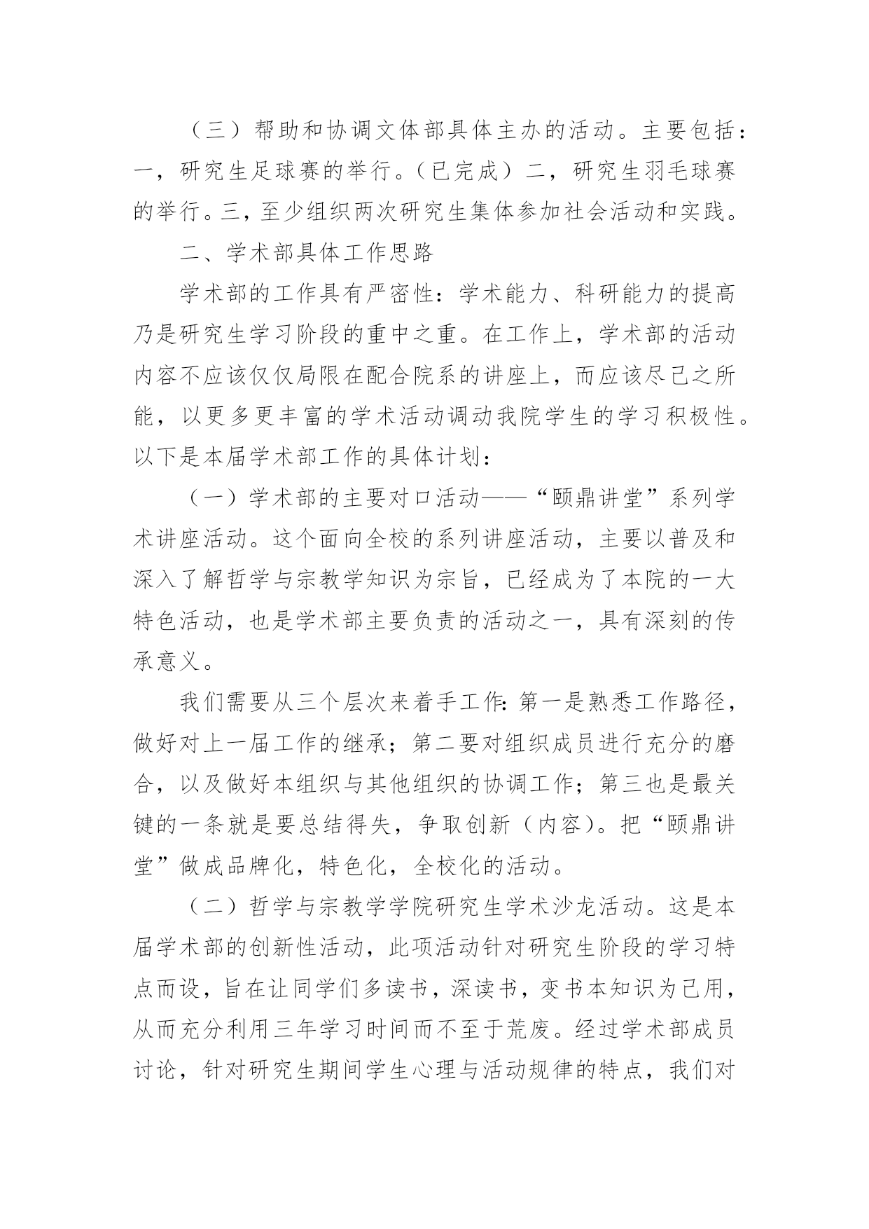 研究生会工作计划研究生会工作计划日子如同白驹过隙,相信大家对即将到来的工作生活满心期待吧!一起对今后的学习做个计划吧。你所接触过的计划都是什么样子的呢?以下是小编精心整理的研究生会工作计划,希望能够帮助到大家。研究生会工作计划1一、部门成员(可包含各成员分工)部长:李一(09会计学)副部长:张二(09会计学)干事:周三(10会计学)二、部门职能作为学院研究生会一个重要的职能部门,宣传部是我院研究生舆论宣传的重要阵地,是展示工商学院风采与特色的窗口,也是展示我院研究生才华的平台。秉承“外宣内传”的工作理念,担负着建设工商学院先进文化的重任,新一届研究生会宣传部将发扬创新精神,创造性地开展宣传活动。在坚持传统宣传方式的基础上,广开思路,利用网络资源,通过多种渠道将工商学院的进步展示在全校师生面前,同时工商学院研究生会的新风貌也将得以展示。三、工作计划1.活动名称:工商学院研究生会会徽及口号的设计活动时间:10月18日——11月7日活动地点及对象:工商学院全体在校研究生活动主题及目的:繁荣校园文化,丰富课余生活,为学生提供一个实现自我价值的舞台,提升工商管理学院的号召力及凝聚力。1同时激发同学们的互动意识和创新意识,充分调动同学们的主观能动性,培养同学们的主人翁精神。活动流程:征集时间:10月18日——10月31日,评选时间:11月1日——11月7日由宣传部对工商学院所有在校研究生公布征集通知,然后针对征集到的作品,经研究生会主席团及各部协商讨论确定备选方案,最后交由院领导批示。经费预算:2.活动名称:制作工商管理学院研究生会的宣传册活动时间:10月20日——12月20日活动地点及对象:工商管理学院研究生会举办的活动活动主题及目的:将工商管理学院及其研究生会的精神风貌及历史成就对外展示并加以宣传,提高我院的知名度及影响力。同时可以挖掘同学们的设计才能,激发同学们的艺术理念。活动流程:1、研究生会成员开会讨论制作想法,做好要点备忘。2、搜集资料。和秘书处等各部协作收集历届学员的'名单、学员职务、历届举行过的重大活动文字资料和相关图片、关于活动的奖惩情况3、整理搜集到的图片,画面不一定多好看,但是一定要舒服和清晰。4、设计草图,它可以帮助我们理清思路,便于在接下来甄选图片的时候提供参考,而且方便提炼出整本宣传册的设计元素5、制作封面。宣传主题+美观=宣传封面。宣传册的封面一定要简洁,不能哗众取宠,直奔主题的阐述要旨。颜色方面不能出现混乱。6、提炼主色调,用主色调铺垫出整本宣传册的整体氛围,这时候可以根据设计草图的轮廓选择图像、色块、线条。文字可以暂时不考虑。7、添加文字,这个时候就要考虑字符、字号、字间距、行间距等元素,对于字的大小一定要斟酌好,不能太小。8、将文字与图片进行整合,这一步至关重要,也是体现整体美观感觉的部分。9、打出样本,进行查看。10、研究生会成员进行讨论,提出意见进行反复修改。11、拼版定稿经费预算:400元——600元研究生会工作计划2金秋九月,在老师和同学的大力支持下,研究生会自律监察部顺利地成立了!现拟本期工作计划如下:一、认真学习学院成立本部门的精神,加强学生干部思想修养,提高学生干部的自身综合能力,更好地起到先锋模范作用。二、制定本部门详尽的规章制度、工作总原则,明确主要工作职责,细化分工,构想一套切实可行的工作方案。三、认真负责学院各会议、活动、讲座等的签到考勤,维持良好的秩序,进行名单统计存档,严格执行操行分加减制度,做到公正、公平、公开。四、妥善保管“泸医研究生会”印章,严格按照“签章管理办法”执行签章。坚决杜绝私自签章。五、随时关注同学们的思想动态,及时发现并纠正同学们的负面思想,予以积极纠正。对于个别极端的同学须上报主席团或研究生处。六、加强部门内部成员之间的.联系,及时传达上级的思想和任务,集思广益,又快又好地完成任务。七、增进部门与其他部门、与主席团的沟通交流,积极协助其他部门顺利地开展工作。互相学习,互相促进。八、在实践中锻炼随机应变的能力,以便更好的处理突发事件。定期进行阶段工作总结,发扬优点,改正不足。律人律己监督自查九、根据实际工作情况,调整工作计划或改进工作方法。相信在领导和主席团的带领下,自律监察部一定能如火如荼地开展工作,给老师及同学交一份满意的答卷。研究生会工作计划3一、指导思想:明确职责,力求创新,依靠集体,集思广益,脚踏实地,实现目标。二、定期开展例会,每周二晚为既定的主席团会议时间,同时根据活动的安排,适时增加例会次数。三、工作要点:1、国庆迎新晚会:目的:为加强软件学院20xx级,老师与学生之间,班级与班级,学生与学生之间的联系。特此研会举办一次“浙江大学软件学院20xx级新生迎新游园会”。以各班表演的形式为主,游戏为辅,活跃气氛,请学院领导、老师作为评委给每个节目