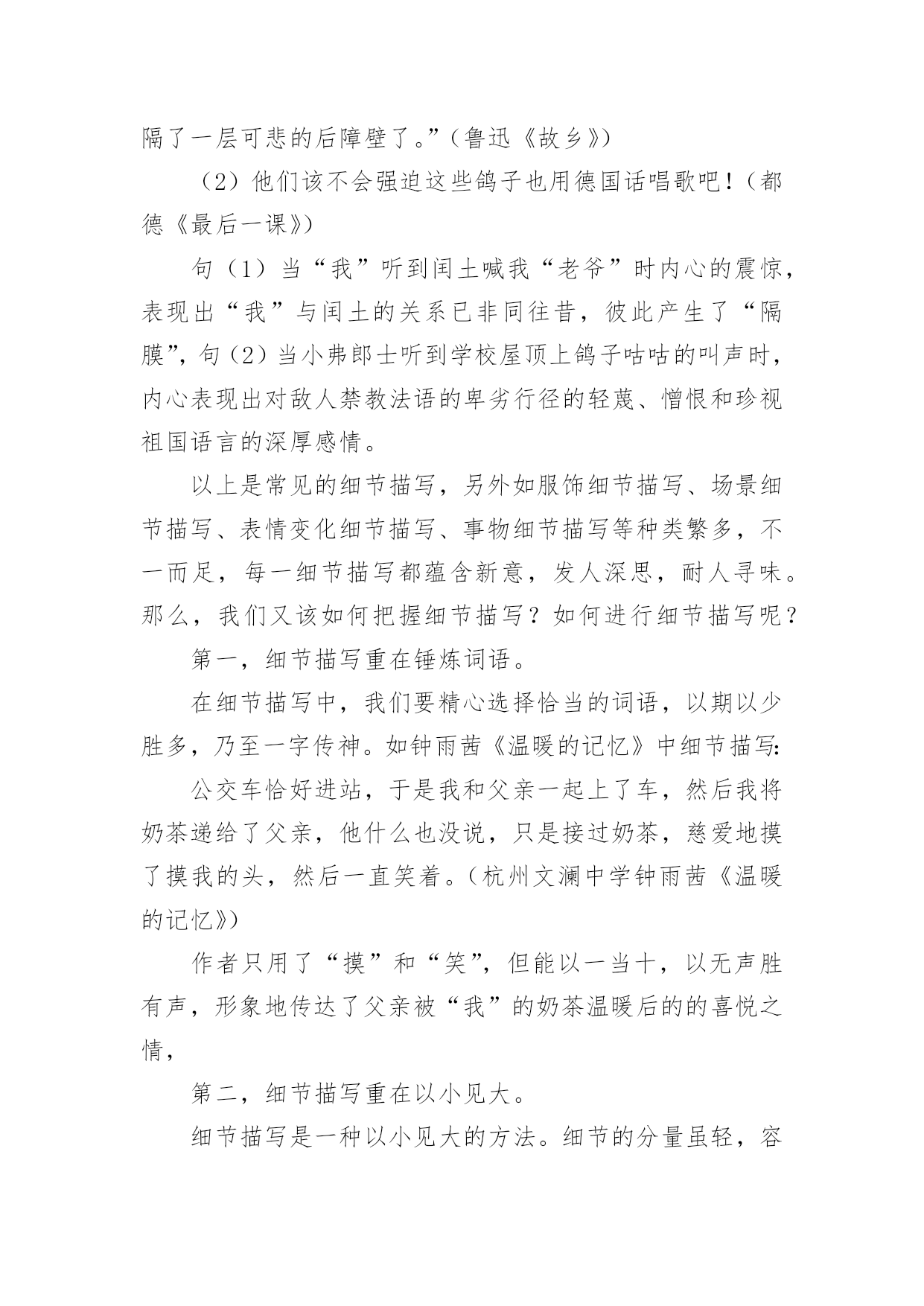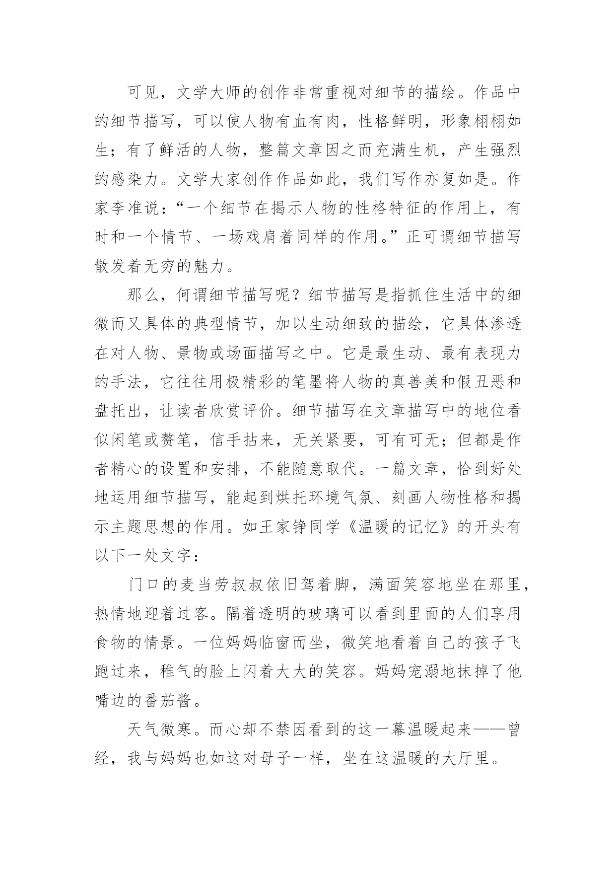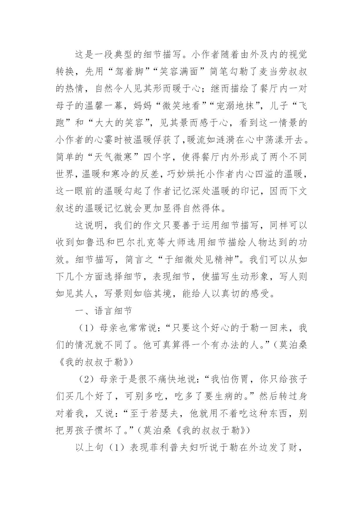 中考作文之细节描写指导关于中考作文之细节描写指导在日常的学习、工作、生活中,大家一定都接触过作文吧,写作文是培养人们的观察力、联想力、想象力、思考力和记忆力的重要手段。那么你知道一篇好的作文该怎么写吗?下面是小编收集整理的关于中考作文之细节描写指导,欢迎阅读与收藏。甲文:“要画圆圈了,那手捏着笔只是抖,于是那人将纸铺在地上,阿Q伏下去,使尽平生的力画圆圈。他生怕被人笑话,立志要画得圆,但这可恶的笔不但很沉重,并且不听话,刚刚一抖一抖的几乎合缝,却又向外一耸,成了瓜子模样了。”乙文:“他却作一个骇人的姿势想把十字架抓在手里,这一下最后的努力送了他的命。甲文是鲁迅《阿Q正传》中关于阿Q刑前画押的细节描写,通过阿Q的行为细节,具体、形象、生动地反映了阿Q的性格特点——直到死还恪守着自欺欺人的“精神胜利法”。当人们读到这一细节描写时,谁又能不觉得阿Q的可笑、可悲、可怜?又怎么会不“哀其不幸,怒其不争”,进而深思国民劣根性?乙文是法国著名作家巴尔扎克《欧也妮葛朗台》中对葛朗台死前的细节描写,当神甫把镀金的十字架送到他唇边让他亲吻基督的圣像时的一幕。一个临死前的“抓”字就活画出了这个贪婪成性、至死不变的丑恶的守财奴形象。可见,文学大师的创作非常重视对细节的描绘。作品中的细节描写,可以使人物有血有肉,性格鲜明,形象栩栩如生;有了鲜活的人物,整篇文章因之而充满生机,产生强烈的感染力。文学大家创作作品如此,我们写作亦复如是。作家李准说:“一个细节在揭示人物的性格特征的作用上,有时和一个情节、一场戏肩着同样的作用。”正可谓细节描写散发着无穷的魅力。那么,何谓细节描写呢?细节描写是指抓住生活中的细微而又具体的典型情节,加以生动细致的描绘,它具体渗透在对人物、景物或场面描写之中。它是最生动、最有表现力的手法,它往往用极精彩的笔墨将人物的真善美和假丑恶和盘托出,让读者欣赏评价。细节描写在文章描写中的地位看似闲笔或赘笔,信手拈来,无关紧要,可有可无;但都是作者精心的设置和安排,不能随意取代。一篇文章,恰到好处地运用细节描写,能起到烘托环境气氛、刻画人物性格和揭示主题思想的作用。如王家铮同学《温暖的记忆》的开头有以下一处文字:门口的麦当劳叔叔依旧驾着脚,满面笑容地坐在那里,热情地迎着过客。隔着透明的玻璃可以看到里面的人们享用食物的情景。一位妈妈临窗而坐,微笑地看着自己的孩子飞跑过来,稚气的脸上闪着大大的笑容。妈妈宠溺地抹掉了他嘴边的番茄酱。天气微寒。而心却不禁因看到的这一幕温暖起来——曾经,我与妈妈也如这对母子一样,坐在这温暖的大厅里。这是一段典型的细节描写。小作者随着由外及内的视觉转换,先用“驾着脚”“笑容满面”简笔勾勒了麦当劳叔叔的热情,自然令人见其形而暖于心;继而描绘了餐厅内一对母子的温馨一幕,妈妈“微笑地看”“宠溺地抹”,儿子“飞跑”和“大大的笑容”,见其景而感于心,看到这一情景的小作者的心霎时被温暖俘获了,暖流如涟漪在心中荡漾开去。简单的“天气微寒”四个字,使得餐厅内外形成了两个不同世界,温暖和寒冷的反差,巧妙烘托小作者内心四溢的温暖,这一眼前的温暖勾起了作者记忆深处温暖的印记,因而下文叙述的温暖记忆就会更加显得自然得体。这说明,我们的作文只要善于运用细节描写,同样可以收到如鲁迅和巴尔扎克等大师选用细节描绘人物达到的功效。细节描写,简言之“于细微处见精神”。我们可以从如下几个方面选择细节,表现细节,使描写生动形象,写人则如见其人,写景则如临其境,能给人以真切的感受。一、语言细节(1)母亲也常常说:“只要这个好心的于勒一回来,我们的情况就不同了。他可真算得一个有办法的人。”(莫泊桑《我的叔叔于勒》)(2)母亲于是很不痛快地说:“我怕伤胃,你只给孩子们买几个好了,可别多吃,吃多了要生病的。”然后转过身对着我,又说:“至于若瑟夫,他就用不着吃这种东西,别把男孩子惯坏了。”(莫泊桑《我的叔叔于勒》)以上句(1)表现菲利普夫妇听说于勒在外边发了财,因于勒的经济地位而改变了对他的看法,把改变家庭拮据局面的希望寄托在他身上,天天盼望他能早日归来。充分表现了菲利普夫妇的自私、贪婪、庸俗、冷酷和唯利是图的性格特征。句(2)表现母亲的冠冕堂皇之辞:在两个女孩和女婿面前,显得既爱惜自己,又关心别人;既疼爱孩子,又注意教育实质却是既顾及面子,又节省开支。虚伪、吝啬的心理暴露无遗。二、动作细节契诃夫小说《变色龙》反复描写奥楚蔑洛夫脱穿军大衣,活画出奥楚蔑洛夫掩饰心虚胆怯的尴尬情状和媚上欺下,凌弱畏强的丑态。鲁迅《故乡》描写杨二嫂时说:“圆规一面愤愤的回转身,一面絮絮的说,慢慢向外走,顺便将我母亲的一副手套塞在裤腰里,出去了。”一个“塞”,便把杨二嫂自私势利的特点跃然纸上。三、肖像细节“他身材很高大,青白脸色,皱纹间时常夹些伤痕,一部乱蓬蓬的花白胡子。穿的'虽然是长衫,