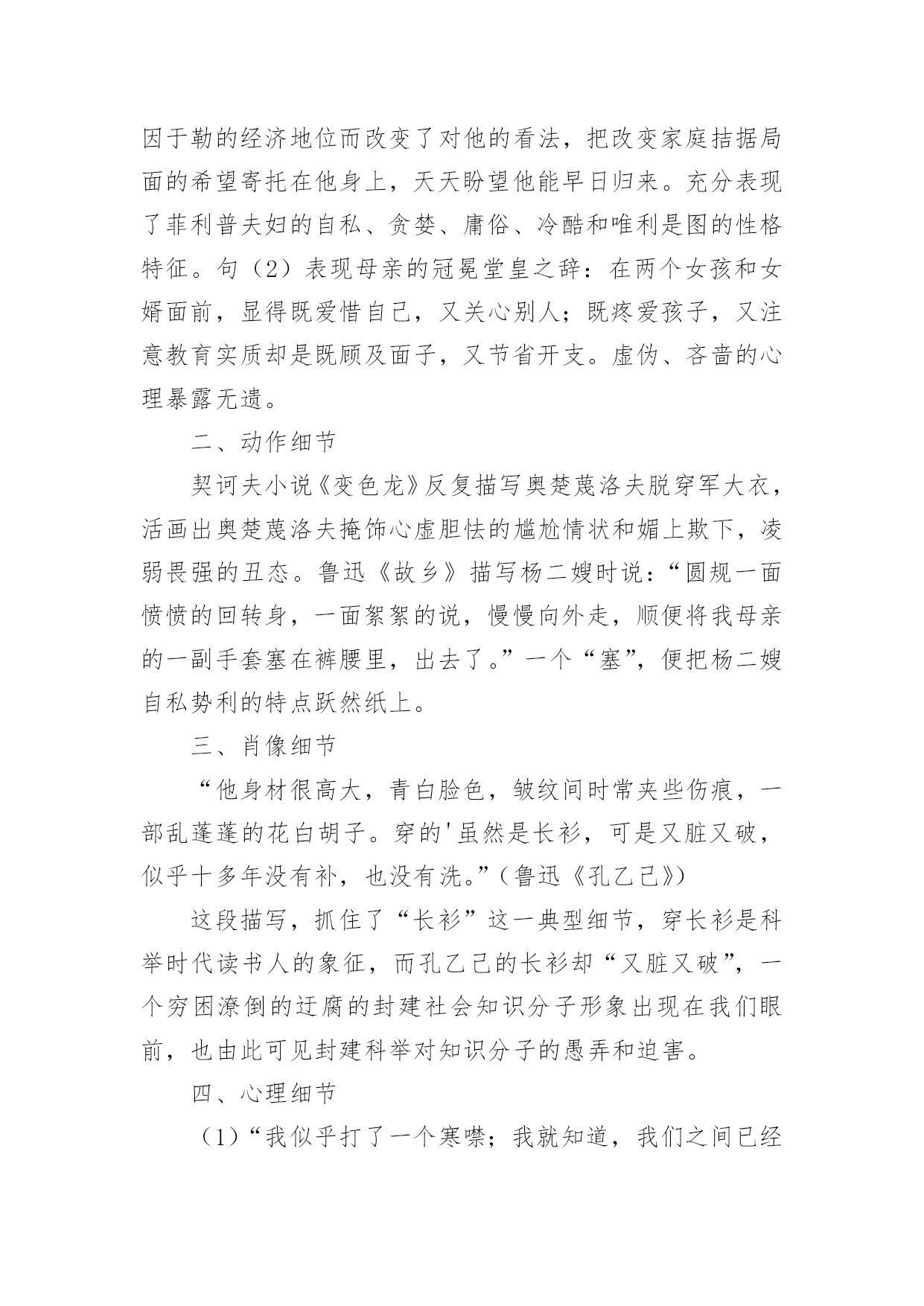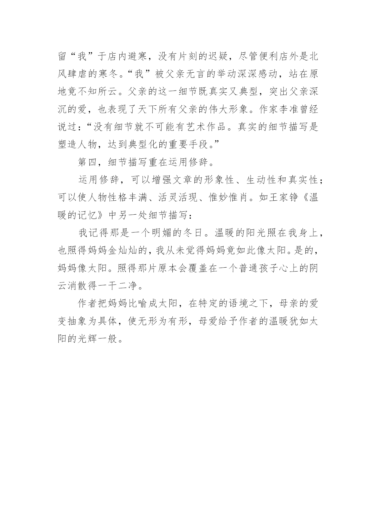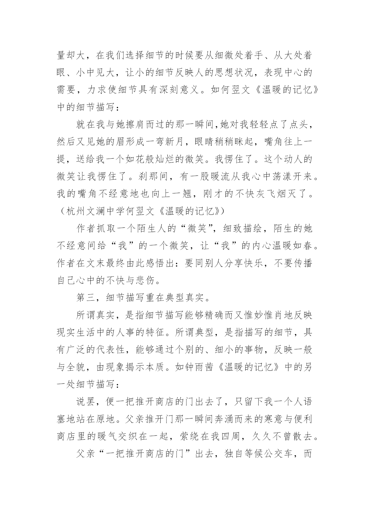 中考作文之细节描写指导关于中考作文之细节描写指导在日常的学习、工作、生活中,大家一定都接触过作文吧,写作文是培养人们的观察力、联想力、想象力、思考力和记忆力的重要手段。那么你知道一篇好的作文该怎么写吗?下面是小编收集整理的关于中考作文之细节描写指导,欢迎阅读与收藏。甲文:“要画圆圈了,那手捏着笔只是抖,于是那人将纸铺在地上,阿Q伏下去,使尽平生的力画圆圈。他生怕被人笑话,立志要画得圆,但这可恶的笔不但很沉重,并且不听话,刚刚一抖一抖的几乎合缝,却又向外一耸,成了瓜子模样了。”乙文:“他却作一个骇人的姿势想把十字架抓在手里,这一下最后的努力送了他的命。甲文是鲁迅《阿Q正传》中关于阿Q刑前画押的细节描写,通过阿Q的行为细节,具体、形象、生动地反映了阿Q的性格特点——直到死还恪守着自欺欺人的“精神胜利法”。当人们读到这一细节描写时,谁又能不觉得阿Q的可笑、可悲、可怜?又怎么会不“哀其不幸,怒其不争”,进而深思国民劣根性?乙文是法国著名作家巴尔扎克《欧也妮葛朗台》中对葛朗台死前的细节描写,当神甫把镀金的十字架送到他唇边让他亲吻基督的圣像时的一幕。一个临死前的“抓”字就活画出了这个贪婪成性、至死不变的丑恶的守财奴形象。可见,文学大师的创作非常重视对细节的描绘。作品中的细节描写,可以使人物有血有肉,性格鲜明,形象栩栩如生;有了鲜活的人物,整篇文章因之而充满生机,产生强烈的感染力。文学大家创作作品如此,我们写作亦复如是。作家李准说:“一个细节在揭示人物的性格特征的作用上,有时和一个情节、一场戏肩着同样的作用。”正可谓细节描写散发着无穷的魅力。那么,何谓细节描写呢?细节描写是指抓住生活中的细微而又具体的典型情节,加以生动细致的描绘,它具体渗透在对人物、景物或场面描写之中。它是最生动、最有表现力的手法,它往往用极精彩的笔墨将人物的真善美和假丑恶和盘托出,让读者欣赏评价。细节描写在文章描写中的地位看似闲笔或赘笔,信手拈来,无关紧要,可有可无;但都是作者精心的设置和安排,不能随意取代。一篇文章,恰到好处地运用细节描写,能起到烘托环境气氛、刻画人物性格和揭示主题思想的作用。如王家铮同学《温暖的记忆》的开头有以下一处文字:门口的麦当劳叔叔依旧驾着脚,满面笑容地坐在那里,热情地迎着过客。隔着透明的玻璃可以看到里面的人们享用食物的情景。一位妈妈临窗而坐,微笑地看着自己的孩子飞跑过来,稚气的脸上闪着大大的笑容。妈妈宠溺地抹掉了他嘴边的番茄酱。天气微寒。而心却不禁因看到的这一幕温暖起来——曾经,我与妈妈也如这对母子一样,坐在这温暖的大厅里。这是一段典型的细节描写。小作者随着由外及内的视觉转换,先用“驾着脚”“笑容满面”简笔勾勒了麦当劳叔叔的热情,自然令人见其形而暖于心;继而描绘了餐厅内一对母子的温馨一幕,妈妈“微笑地看”“宠溺地抹”,儿子“飞跑”和“大大的笑容”,见其景而感于心,看到这一情景的小作者的心霎时被温暖俘获了,暖流如涟漪在心中荡漾开去。简单的“天气微寒”四个字,使得餐厅内外形成了两个不同世界,温暖和寒冷的反差,巧妙烘托小作者内心四溢的温暖,这一眼前的温暖勾起了作者记忆深处温暖的印记,因而下文叙述的温暖记忆就会更加显得自然得体。这说明,我们的作文只要善于运用细节描写,同样可以收到如鲁迅和巴尔扎克等大师选用细节描绘人物达到的功效。细节描写,简言之“于细微处见精神”。我们可以从如下几个方面选择细节,表现细节,使描写生动形象,写人则如见其人,写景则如临其境,能给人以真切的感受。一、语言细节(1)母亲也常常说:“只要这个好心的于勒一回来,我们的情况就不同了。他可真算得一个有办法的人。”(莫泊桑《我的叔叔于勒》)(2)母亲于是很不痛快地说:“我怕伤胃,你只给孩子们买几个好了,可别多吃,吃多了要生病的。”然后转过身对着我,又说:“至于若瑟夫,他就用不着吃这种东西,别把男孩子惯坏了。”(莫泊桑《我的叔叔于勒》)以上句(1)表现菲利普夫妇听说于勒在外边发了财,因于勒的经济地位而改变了对他的看法,把改变家庭拮据局面的希望寄托在他身上,天天盼望他能早日归来。充分表现了菲利普夫妇的自私、贪婪、庸俗、冷酷和唯利是图的性格特征。句(2)表现母亲的冠冕堂皇之辞:在两个女孩和女婿面前,显得既爱惜自己,又关心别人;既疼爱孩子,又注意教育实质却是既顾及面子,又节省开支。虚伪、吝啬的心理暴露无遗。二、动作细节契诃夫小说《变色龙》反复描写奥楚蔑洛夫脱穿军大衣,活画出奥楚蔑洛夫掩饰心虚胆怯的尴尬情状和媚上欺下,凌弱畏强的丑态。鲁迅《故乡》描写杨二嫂时说:“圆规一面愤愤的回转身,一面絮絮的说,慢慢向外走,顺便将我母亲的一副手套塞在裤腰里,出去了。”一个“塞”,便把杨二嫂自私势利的特点跃然纸上。三、肖像细节“他身材很高大,青白脸色,皱纹间时常夹些伤痕,一部乱蓬蓬的花白胡子。穿的'虽然是长衫,