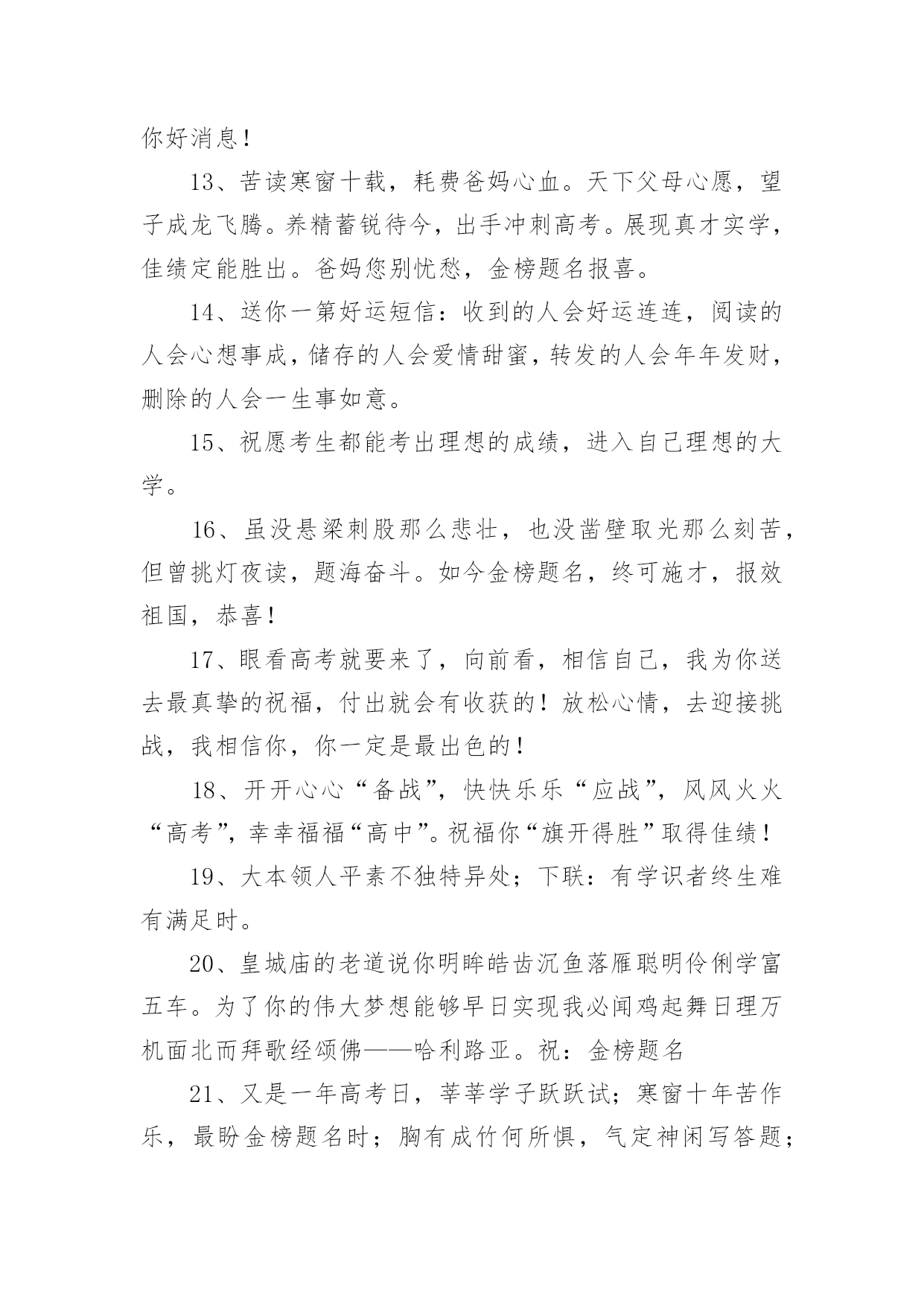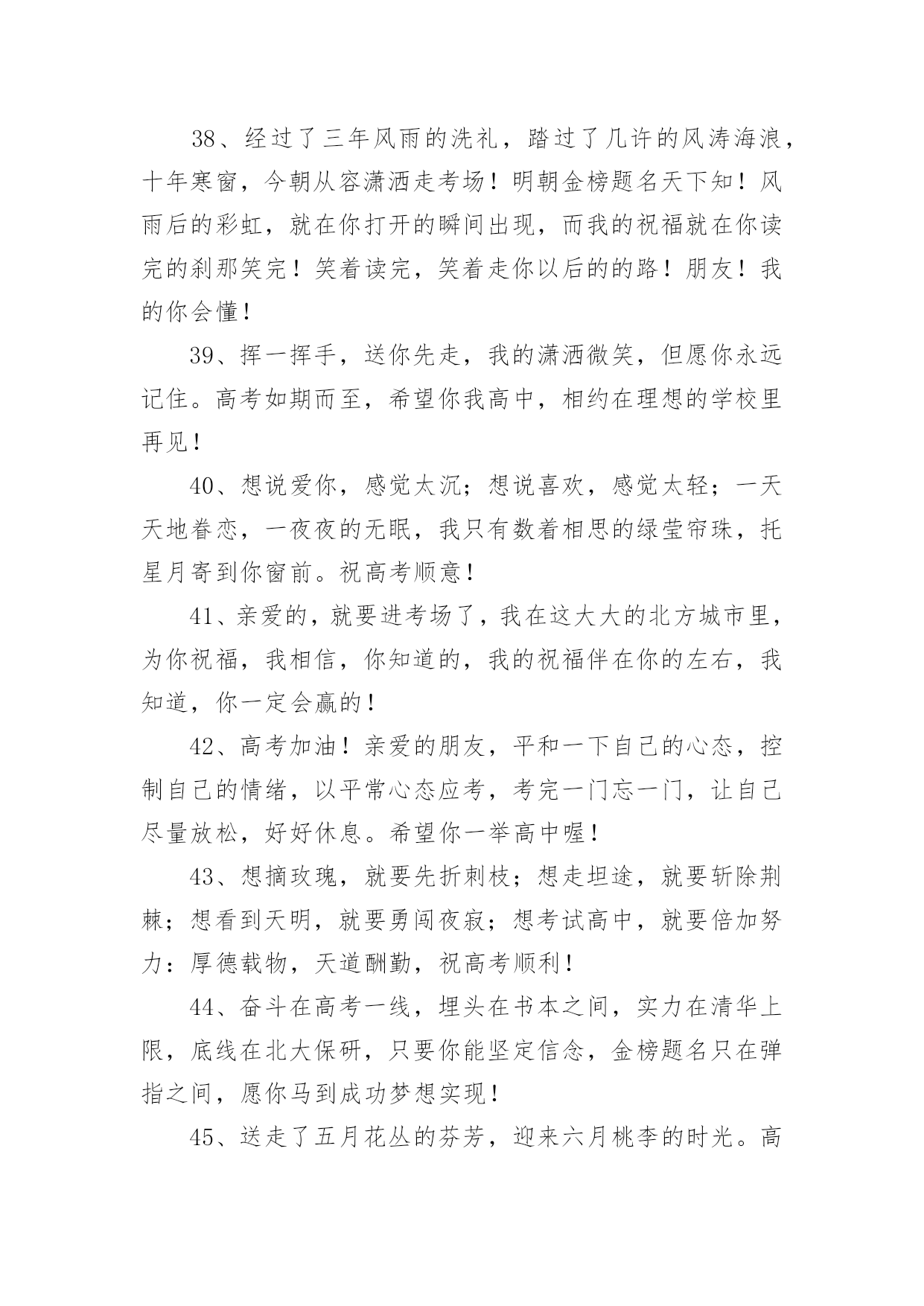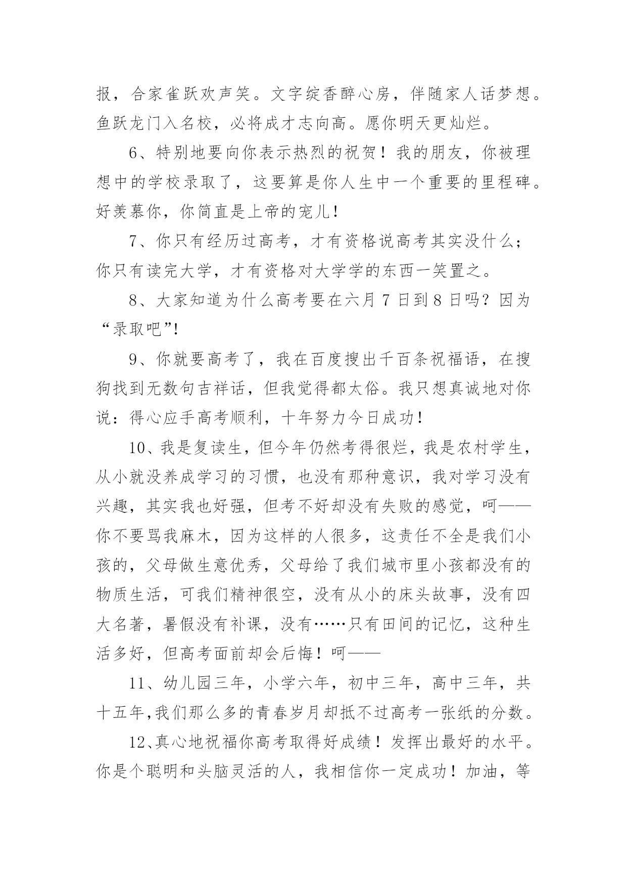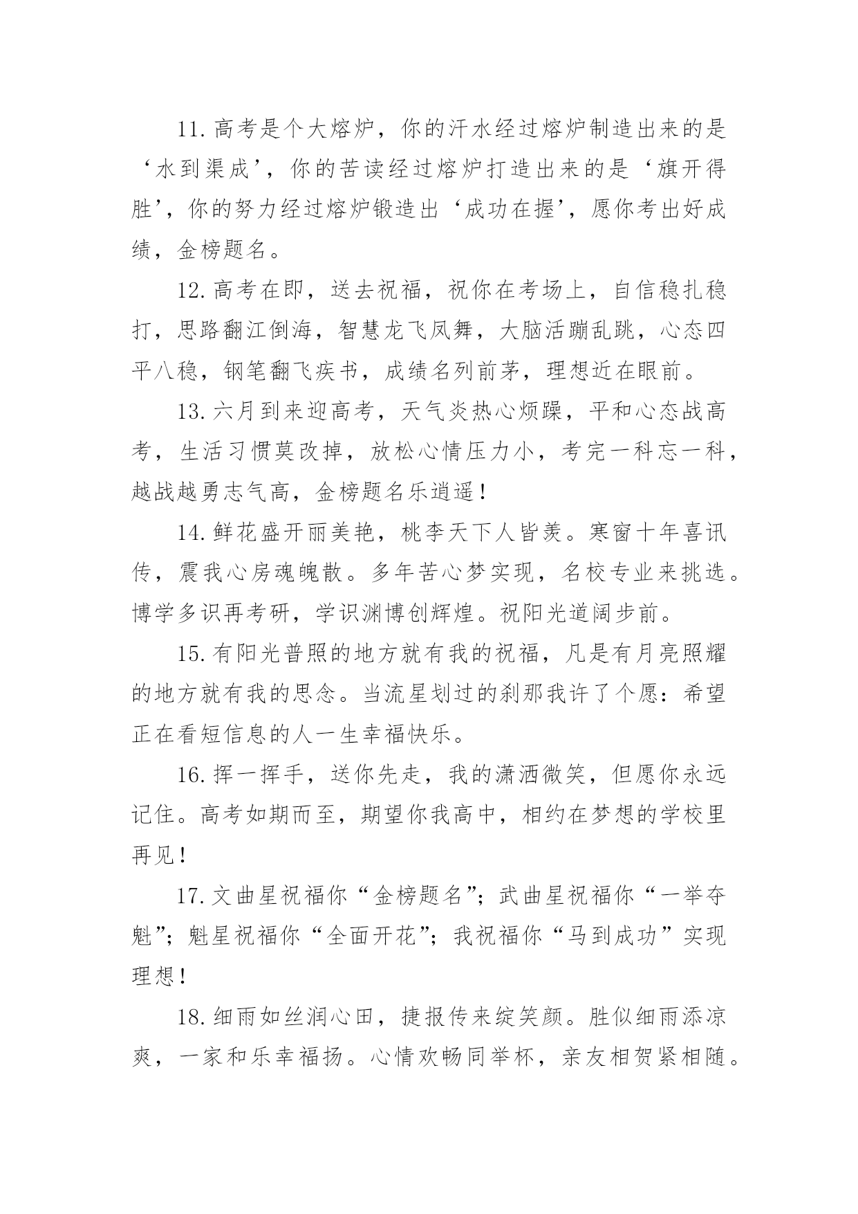 高考的祝福语高考的祝福语(精选160句)在日常的学习、工作、生活中,大家一定都接触过祝福语吧,祝福语是指寄托美好祝福的话语。那么问题来了,到底什么样的祝福语才是走心的呢?下面是小编精心整理的高考的祝福语,仅供参考,希望能够帮助到大家。高考的祝福语11、风儿静静的吹动,凤凰花吐露着嫣红,亲爱的朋友请握一握手,明天就要各奔西东!但不要忘记彼此的约定:高考成功!2、明天高考啦,以后不用点起床啦,以后可以天天游泳啦,明天是新生活的开始,一定不能愁眉苦脸,今晚做个好梦!3、晶晶,因为有缘,我们在高一相识;因为友爱,我们一起相伴度过了三年高中生活;因为有你,学习生活才不那么枯燥。无形地,你已是我内心深处最好的好朋友!现在也许我们大学不在一起了,但我们之间最珍贵的友情不会变。不管风吹雨打日晒。我们的友谊经得住考验;不管相隔多远,我们都会联系,不会失去对方的消息。我会是你值得信赖的好朋友,在未来的日子里,我真心祝愿你一切顺心,只有快乐围绕在你身边!4、多年的寒窗苦读,终于赢得了这一激动人心的时刻,真心地祝贺你,金榜题名!5、十年扬帆征战场,今朝姓名题金榜。亲友相闻看捷报,合家雀跃欢声笑。文字绽香醉心房,伴随家人话梦想。鱼跃龙门入名校,必将成才志向高。愿你明天更灿烂。6、特别地要向你表示热烈的祝贺!我的朋友,你被理想中的学校录取了,这要算是你人生中一个重要的里程碑。好羡慕你,你简直是上帝的宠儿!7、你只有经历过高考,才有资格说高考其实没什么;你只有读完大学,才有资格对大学学的东西一笑置之。8、大家知道为什么高考要在六月7日到8日吗?因为“录取吧”!9、你就要高考了,我在百度搜出千百条祝福语,在搜狗找到无数句吉祥话,但我觉得都太俗。我只想真诚地对你说:得心应手高考顺利,十年努力今日成功!10、我是复读生,但今年仍然考得很烂,我是农村学生,从小就没养成学习的习惯,也没有那种意识,我对学习没有兴趣,其实我也好强,但考不好却没有失败的感觉,呵——你不要骂我麻木,因为这样的人很多,这责任不全是我们小孩的,父母做生意优秀,父母给了我们城市里小孩都没有的物质生活,可我们精神很空,没有从小的床头故事,没有四大名著,暑假没有补课,没有……只有田间的记忆,这种生活多好,但高考面前却会后悔!呵——11、幼儿园三年,小学六年,初中三年,高中三年,共十五年,我们那么多的青春岁月却抵不过高考一张纸的分数。12、真心地祝福你高考取得好成绩!发挥出最好的水平。你是个聪明和头脑灵活的人,我相信你一定成功!加油,等你好消息!13、苦读寒窗十载,耗费爸妈心血。天下父母心愿,望子成龙飞腾。养精蓄锐待今,出手冲刺高考。展现真才实学,佳绩定能胜出。爸妈您别忧愁,金榜题名报喜。14、送你一第好运短信:收到的人会好运连连,阅读的人会心想事成,储存的人会爱情甜蜜,转发的人会年年发财,删除的人会一生事如意。15、祝愿考生都能考出理想的成绩,进入自己理想的大学。16、虽没悬梁刺股那么悲壮,也没凿壁取光那么刻苦,但曾挑灯夜读,题海奋斗。如今金榜题名,终可施才,报效祖国,恭喜!17、眼看高考就要来了,向前看,相信自己,我为你送去最真挚的祝福,付出就会有收获的!放松心情,去迎接挑战,我相信你,你一定是最出色的!18、开开心心“备战”,快快乐乐“应战”,风风火火“高考”,幸幸福福“高中”。祝福你“旗开得胜”取得佳绩!19、大本领人平素不独特异处;下联:有学识者终生难有满足时。20、皇城庙的老道说你明眸皓齿沉鱼落雁聪明伶俐学富五车。为了你的伟大梦想能够早日实现我必闻鸡起舞日理万机面北而拜歌经颂佛——哈利路亚。祝:金榜题名21、又是一年高考日,莘莘学子跃跃试;寒窗十年苦作乐,最盼金榜题名时;胸有成竹何所惧,气定神闲写答题;从容应对戒骄躁,善用技巧循规律;成败得失付一笑,人尽其才我尽力;山重水复总有路,柳暗花明在他日;凌云壮志心不移,成功之路曲变直。祝你高考一帆风顺!22、入学喜报饱浸学子千滴汗;开宴鹿鸣荡漾恩师万缕情。23、就要考试了,放开往日的学习中的紧张,用一颗平常心去轻松面对,相信你会考出自己理想的成绩的。愿好运一直陪伴着你!24、高考完,我们各奔东西,虽然又长大了,但是再也没有了你,没有了那一群人。25、孩子,你是爸爸妈妈生命的延续,也是爸爸妈妈未来的希望,你的一举一动时刻牵动着爸爸妈妈的心。今后的路还很长,你要勇敢地面对任何挑战,爸爸妈妈是你坚实的后盾。26、好兄弟!今年的高考属于你!相信自己,你是最棒的!祝你在高考中旗开得胜!一鸣惊人!金榜题名!27、惜光阴百日犹短,看众志成城拼搏第一;细安排一刻也长,比龙争虎斗谁为争锋?28、高考日到,顺利高考记牢四个“好”:一休息好,身体好才可精神好;二要心态好,压力减少发挥才好;三要心情好,远离烦躁成绩才高;四要吃得好,营养高高脑力好。祝你金榜题名,一举