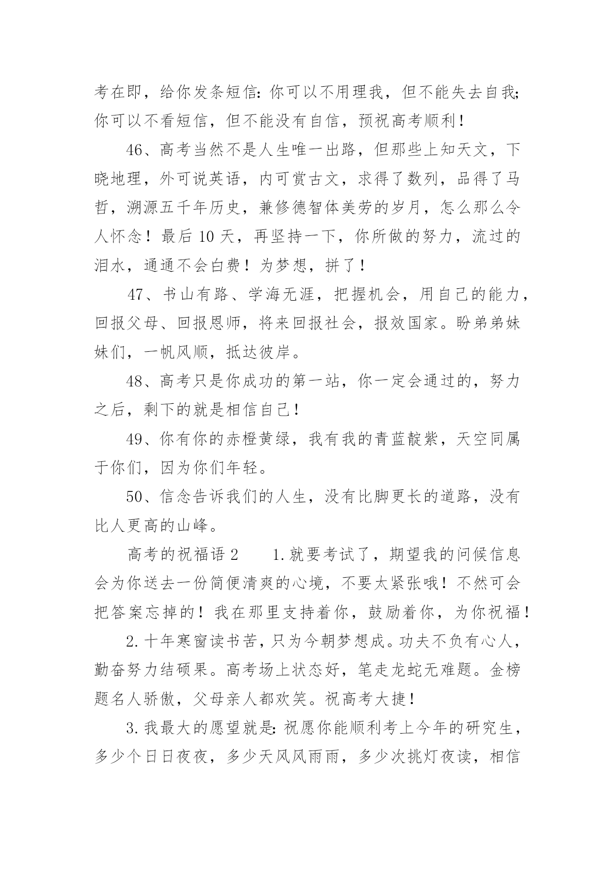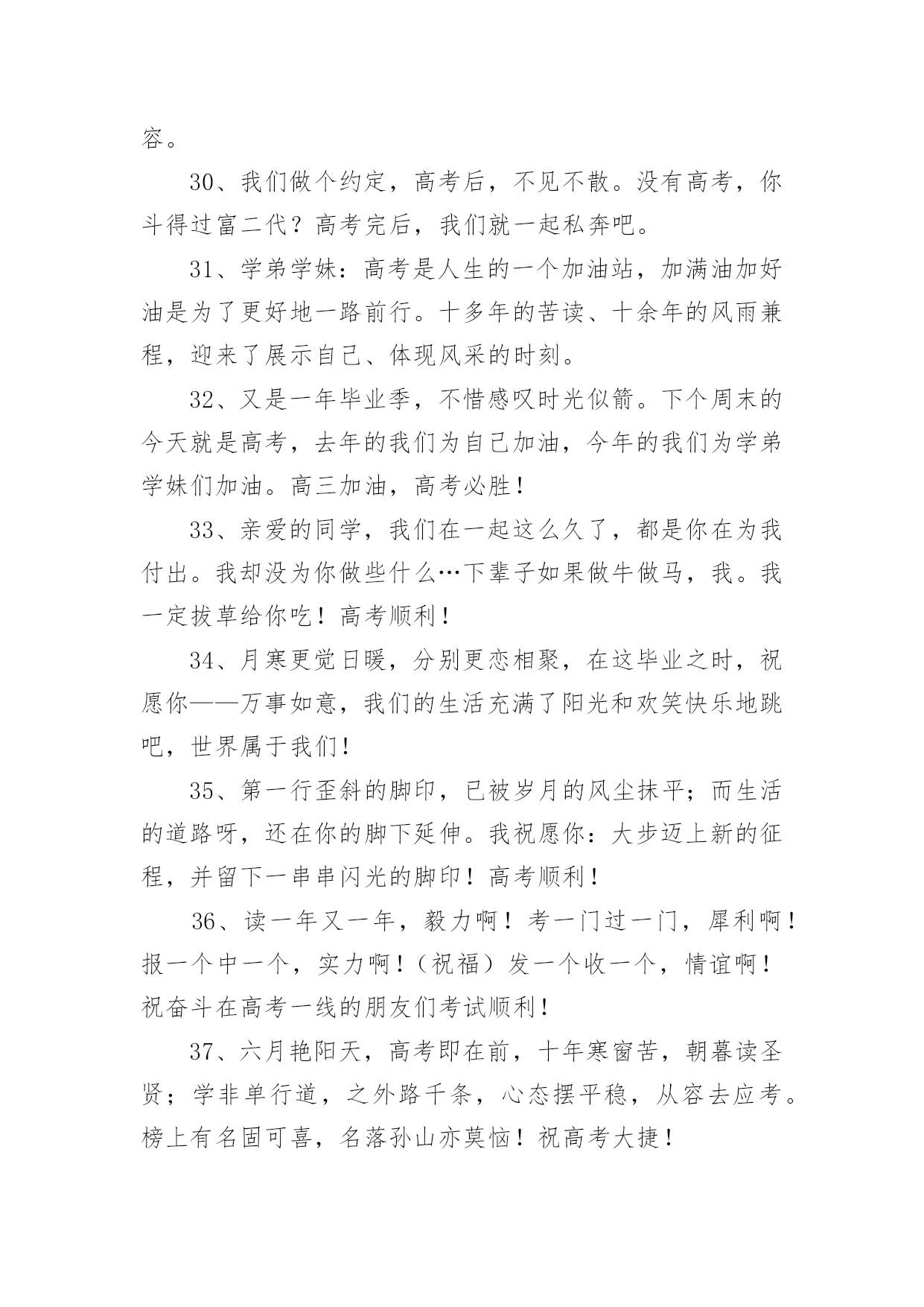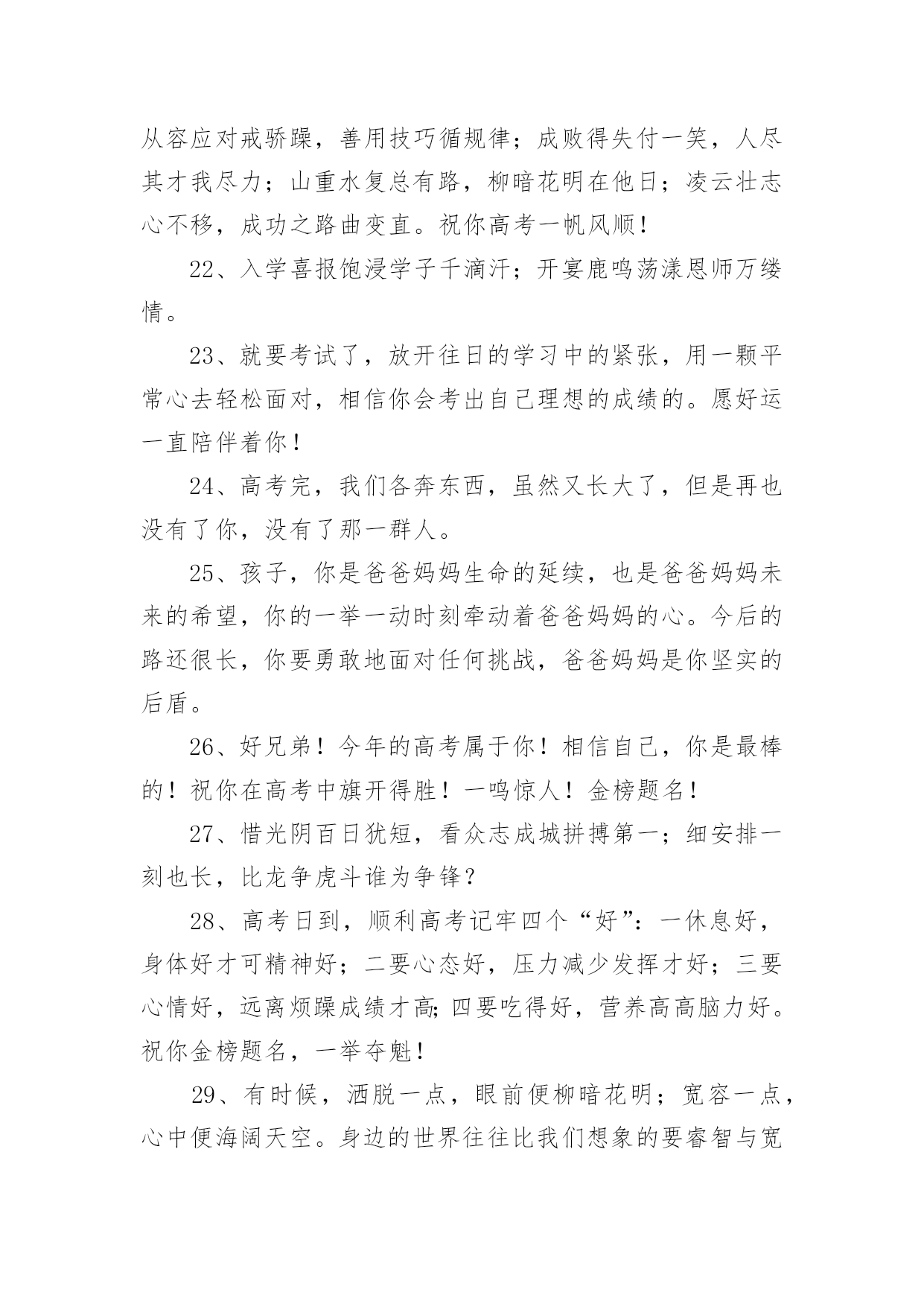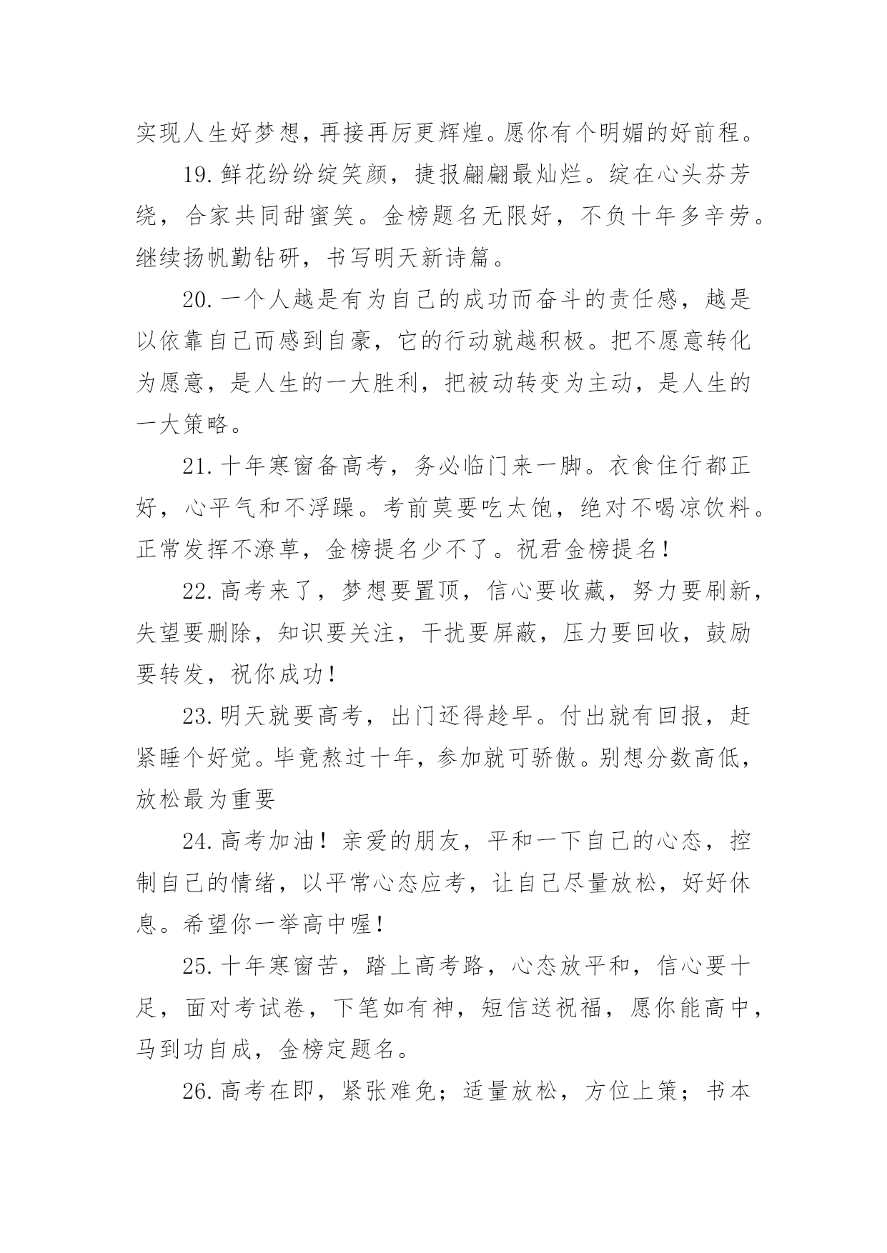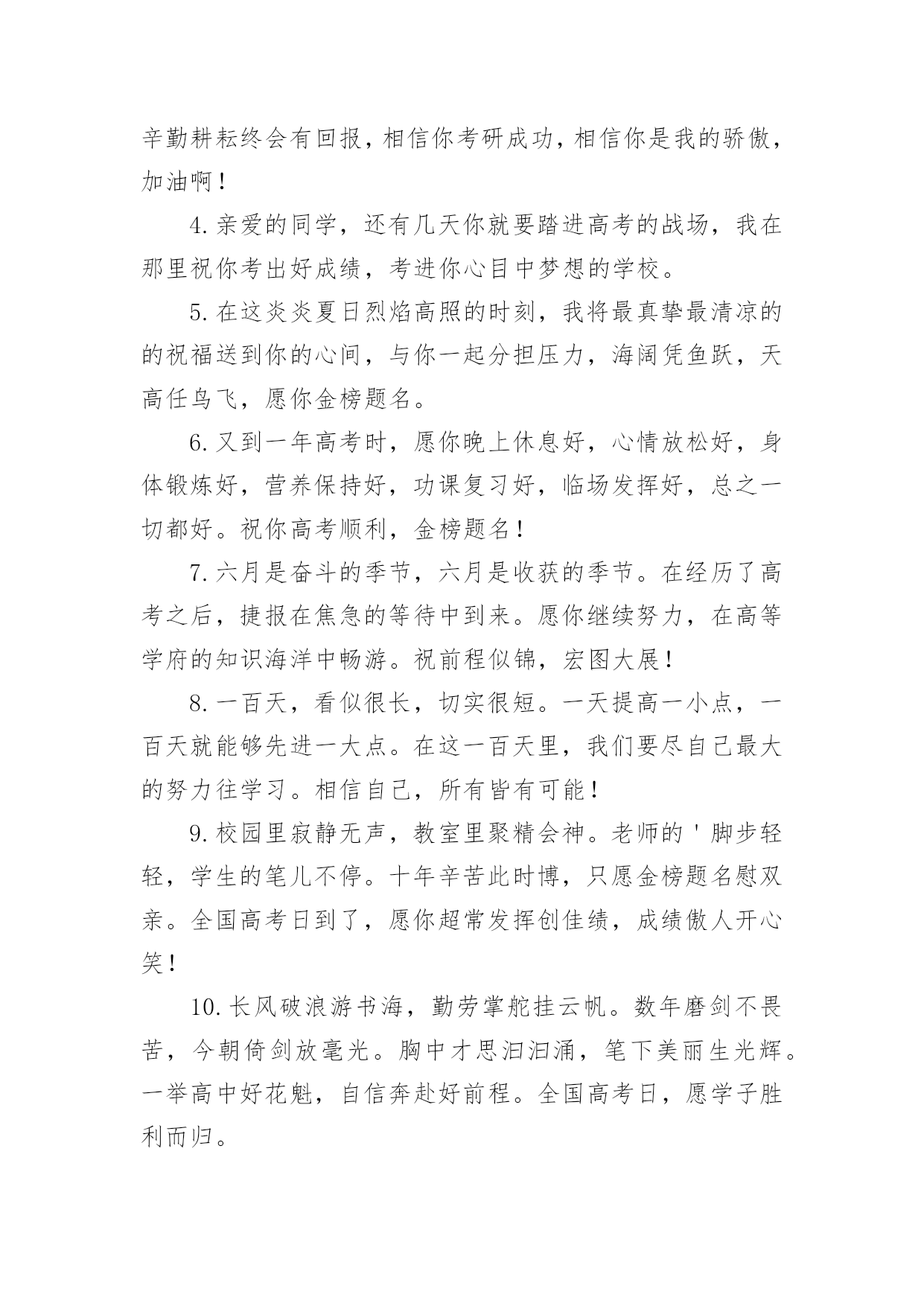 高考的祝福语高考的祝福语(精选160句)在日常的学习、工作、生活中,大家一定都接触过祝福语吧,祝福语是指寄托美好祝福的话语。那么问题来了,到底什么样的祝福语才是走心的呢?下面是小编精心整理的高考的祝福语,仅供参考,希望能够帮助到大家。高考的祝福语11、风儿静静的吹动,凤凰花吐露着嫣红,亲爱的朋友请握一握手,明天就要各奔西东!但不要忘记彼此的约定:高考成功!2、明天高考啦,以后不用点起床啦,以后可以天天游泳啦,明天是新生活的开始,一定不能愁眉苦脸,今晚做个好梦!3、晶晶,因为有缘,我们在高一相识;因为友爱,我们一起相伴度过了三年高中生活;因为有你,学习生活才不那么枯燥。无形地,你已是我内心深处最好的好朋友!现在也许我们大学不在一起了,但我们之间最珍贵的友情不会变。不管风吹雨打日晒。我们的友谊经得住考验;不管相隔多远,我们都会联系,不会失去对方的消息。我会是你值得信赖的好朋友,在未来的日子里,我真心祝愿你一切顺心,只有快乐围绕在你身边!4、多年的寒窗苦读,终于赢得了这一激动人心的时刻,真心地祝贺你,金榜题名!5、十年扬帆征战场,今朝姓名题金榜。亲友相闻看捷报,合家雀跃欢声笑。文字绽香醉心房,伴随家人话梦想。鱼跃龙门入名校,必将成才志向高。愿你明天更灿烂。6、特别地要向你表示热烈的祝贺!我的朋友,你被理想中的学校录取了,这要算是你人生中一个重要的里程碑。好羡慕你,你简直是上帝的宠儿!7、你只有经历过高考,才有资格说高考其实没什么;你只有读完大学,才有资格对大学学的东西一笑置之。8、大家知道为什么高考要在六月7日到8日吗?因为“录取吧”!9、你就要高考了,我在百度搜出千百条祝福语,在搜狗找到无数句吉祥话,但我觉得都太俗。我只想真诚地对你说:得心应手高考顺利,十年努力今日成功!10、我是复读生,但今年仍然考得很烂,我是农村学生,从小就没养成学习的习惯,也没有那种意识,我对学习没有兴趣,其实我也好强,但考不好却没有失败的感觉,呵——你不要骂我麻木,因为这样的人很多,这责任不全是我们小孩的,父母做生意优秀,父母给了我们城市里小孩都没有的物质生活,可我们精神很空,没有从小的床头故事,没有四大名著,暑假没有补课,没有……只有田间的记忆,这种生活多好,但高考面前却会后悔!呵——11、幼儿园三年,小学六年,初中三年,高中三年,共十五年,我们那么多的青春岁月却抵不过高考一张纸的分数。12、真心地祝福你高考取得好成绩!发挥出最好的水平。你是个聪明和头脑灵活的人,我相信你一定成功!加油,等你好消息!13、苦读寒窗十载,耗费爸妈心血。天下父母心愿,望子成龙飞腾。养精蓄锐待今,出手冲刺高考。展现真才实学,佳绩定能胜出。爸妈您别忧愁,金榜题名报喜。14、送你一第好运短信:收到的人会好运连连,阅读的人会心想事成,储存的人会爱情甜蜜,转发的人会年年发财,删除的人会一生事如意。15、祝愿考生都能考出理想的成绩,进入自己理想的大学。16、虽没悬梁刺股那么悲壮,也没凿壁取光那么刻苦,但曾挑灯夜读,题海奋斗。如今金榜题名,终可施才,报效祖国,恭喜!17、眼看高考就要来了,向前看,相信自己,我为你送去最真挚的祝福,付出就会有收获的!放松心情,去迎接挑战,我相信你,你一定是最出色的!18、开开心心“备战”,快快乐乐“应战”,风风火火“高考”,幸幸福福“高中”。祝福你“旗开得胜”取得佳绩!19、大本领人平素不独特异处;下联:有学识者终生难有满足时。20、皇城庙的老道说你明眸皓齿沉鱼落雁聪明伶俐学富五车。为了你的伟大梦想能够早日实现我必闻鸡起舞日理万机面北而拜歌经颂佛——哈利路亚。祝:金榜题名21、又是一年高考日,莘莘学子跃跃试;寒窗十年苦作乐,最盼金榜题名时;胸有成竹何所惧,气定神闲写答题;从容应对戒骄躁,善用技巧循规律;成败得失付一笑,人尽其才我尽力;山重水复总有路,柳暗花明在他日;凌云壮志心不移,成功之路曲变直。祝你高考一帆风顺!22、入学喜报饱浸学子千滴汗;开宴鹿鸣荡漾恩师万缕情。23、就要考试了,放开往日的学习中的紧张,用一颗平常心去轻松面对,相信你会考出自己理想的成绩的。愿好运一直陪伴着你!24、高考完,我们各奔东西,虽然又长大了,但是再也没有了你,没有了那一群人。25、孩子,你是爸爸妈妈生命的延续,也是爸爸妈妈未来的希望,你的一举一动时刻牵动着爸爸妈妈的心。今后的路还很长,你要勇敢地面对任何挑战,爸爸妈妈是你坚实的后盾。26、好兄弟!今年的高考属于你!相信自己,你是最棒的!祝你在高考中旗开得胜!一鸣惊人!金榜题名!27、惜光阴百日犹短,看众志成城拼搏第一;细安排一刻也长,比龙争虎斗谁为争锋?28、高考日到,顺利高考记牢四个“好”:一休息好,身体好才可精神好;二要心态好,压力减少发挥才好;三要心情好,远离烦躁成绩才高;四要吃得好,营养高高脑力好。祝你金榜题名,一举