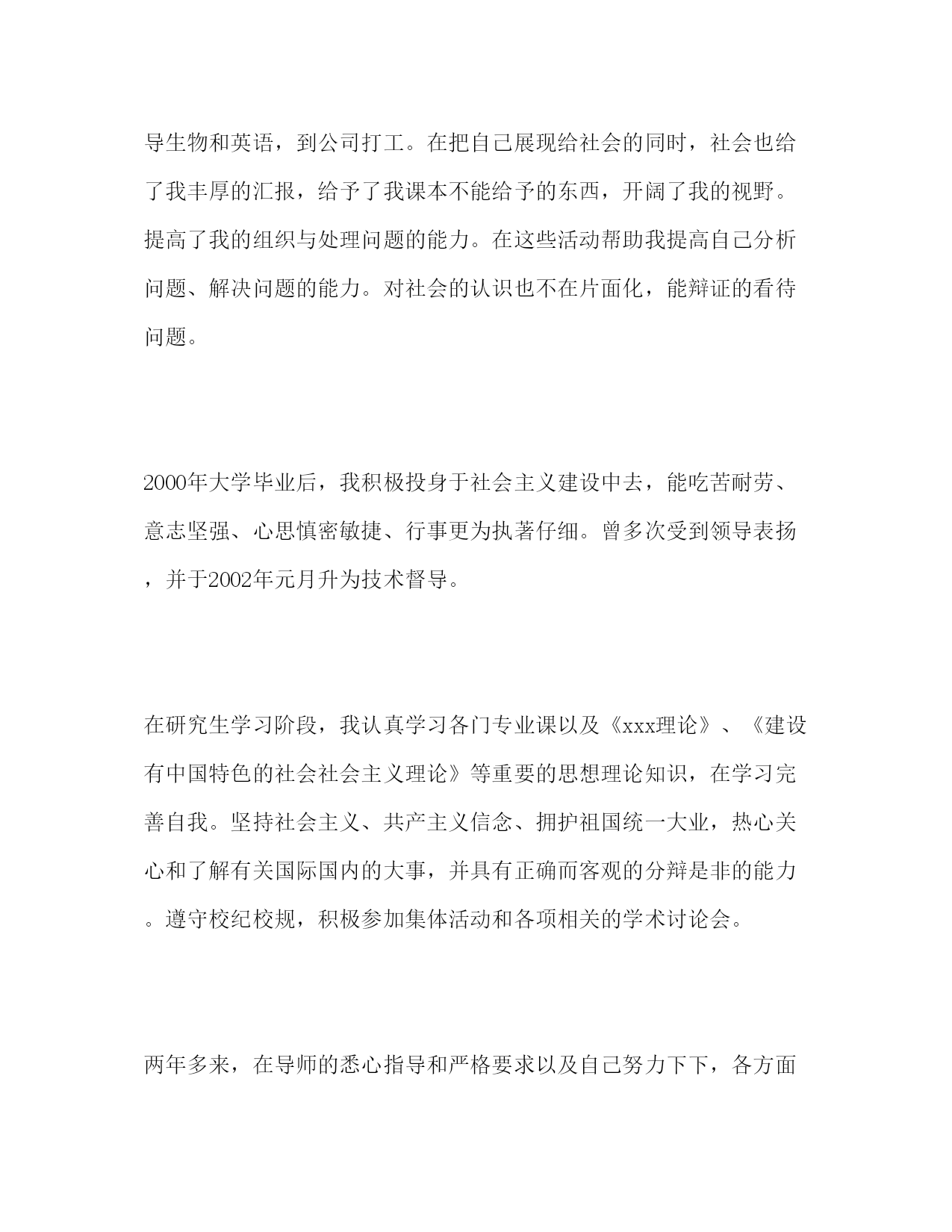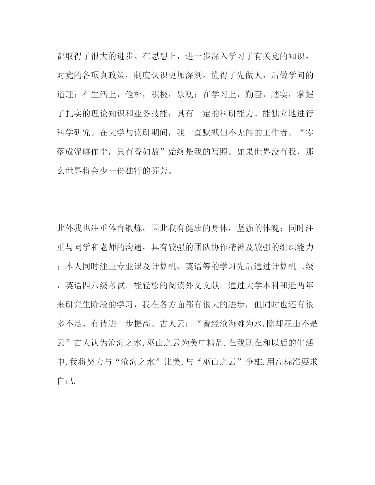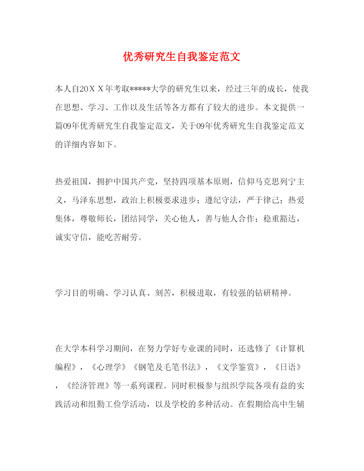 PAGE此资料由网络收集而来,如有侵权请告知上传者立即删除。资料共分享,我们负责传递知识。优秀研究生自我鉴定范文本人自20XX年考取*****大学的研究生以来,经过三年的成长,使我在思想、学习、工作以及生活等各方都有了较大的进步。本文提供一篇09年优秀研究生自我鉴定范文,关于09年优秀研究生自我鉴定范文的详细内容如下。热爱祖国,拥护中国共产党,坚持四项基本原则,信仰马克思列宁主义,马泽东思想,政治上积极要求进步;遵纪守法,严于律己;热爱集体,尊敬师长,团结同学,关心他人,善与他人合作;稳重豁达,诚实守信,能吃苦耐劳。学习目的明确、学习认真、刻苦,积极进取,有较强的钻研精神。在大学本科学习期间,在努力学好专业课的同时,还选修了《计算机编程》,《心理学》《钢笔及毛笔书法》,《文学鉴赏》,《日语》,《经济管理》等一系列课程。同时积极参与组织学院各项有益的实践活动和组勤工俭学活动,以及学校的多种活动。在假期给高中生辅导生物和英语,到公司打工。在把自己展现给社会的同时,社会也给了我丰厚的汇报,给予了我课本不能给予的东西,开阔了我的视野。提高了我的组织与处理问题的能力。在这些活动帮助我提高自己分析问题、解决问题的能力。对社会的认识也不在片面化,能辩证的看待问题。2000年大学毕业后,我积极投身于社会主义建设中去,能吃苦耐劳、意志坚强、心思慎密敏捷、行事更为执著仔细。曾多次受到领导表扬,并于2002年元月升为技术督导。在研究生学习阶段,我认真学习各门专业课以及《xxx理论》、《建设有中国特色的社会社会主义理论》等重要的思想理论知识,在学习完善自我。坚持社会主义、共产主义信念、拥护祖国统一大业,热心关心和了解有关国际国内的大事,并具有正确而客观的分辩是非的能力。遵守校纪校规,积极参加集体活动和各项相关的学术讨论会。两年多来,在导师的悉心指导和严格要求以及自己努力下下,各方面都取得了很大的进步。在思想上,进一步深入学习了有关党的知识,对党的各项真政策,制度认识更加深刻。懂得了先做人,后做学问的道理;在生活上,俭朴,积极,乐观;在学习上,勤奋,踏实,掌握了扎实的理论知识和业务技能,具有一定的科研能力、能独立地进行科学研究。在大学与读研期间,我一直默默但不无闻的工作者。“零落成泥碾作尘,只有香如故”始终是我的写照。如果世界没有我,那么世界将会少一份独特的芬芳。此外我也注重体育锻炼,因此我有健康的身体,坚强的体魄;同时注重与同学和老师的沟通,具有较强的团队协作精神及较强的组织能力;本人同时注重专业课及计算机、英语等的学习先后通过计算机二级,英语四六级考试。能轻松的阅读外文文献。通过大学本科和近两年来研究生阶段的学习,我在各方面都有很大的进步,但同时也还有很多不足、有待进一步提高。古人云:“曾经沧海难为水,除却巫山不是云”古人认为沧海之水,巫山之云为美中精品.在我现在和以后的生活中,我将努力与“沧海之水”比美,与“巫山之云”争雄.用高标准要求自己.在科研上,我谦虚谨慎,一丝不苟,大胆心细,精益求精,我已完成了猪链球菌2型SSNA毒力因子和FBPS毒力因子片断的克隆与表达工作.鉴定人:应届生求职网时间:xxxx年xx月xx日推荐阅读:党员自我鉴定范文自考毕业生自我鉴定范文