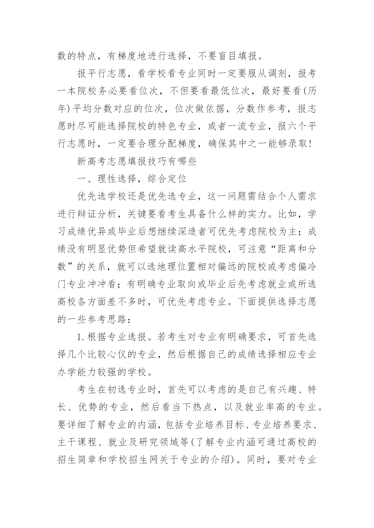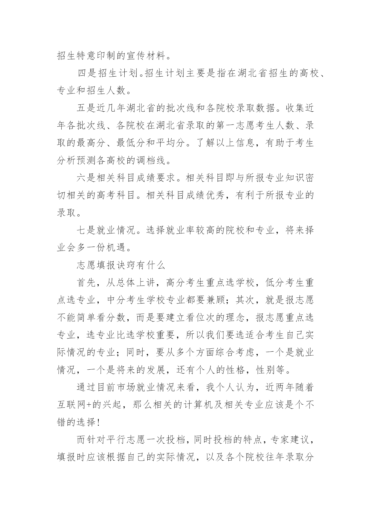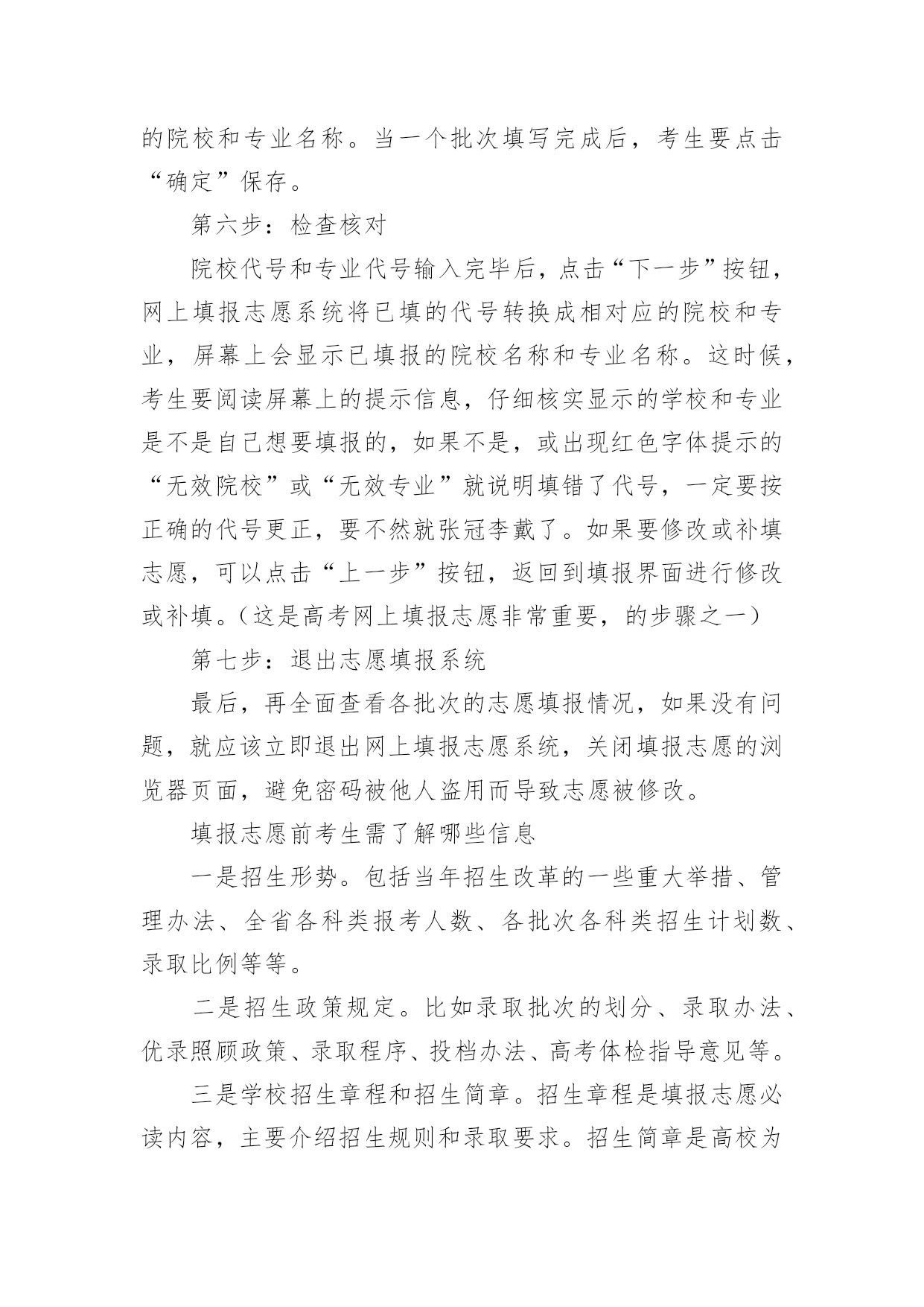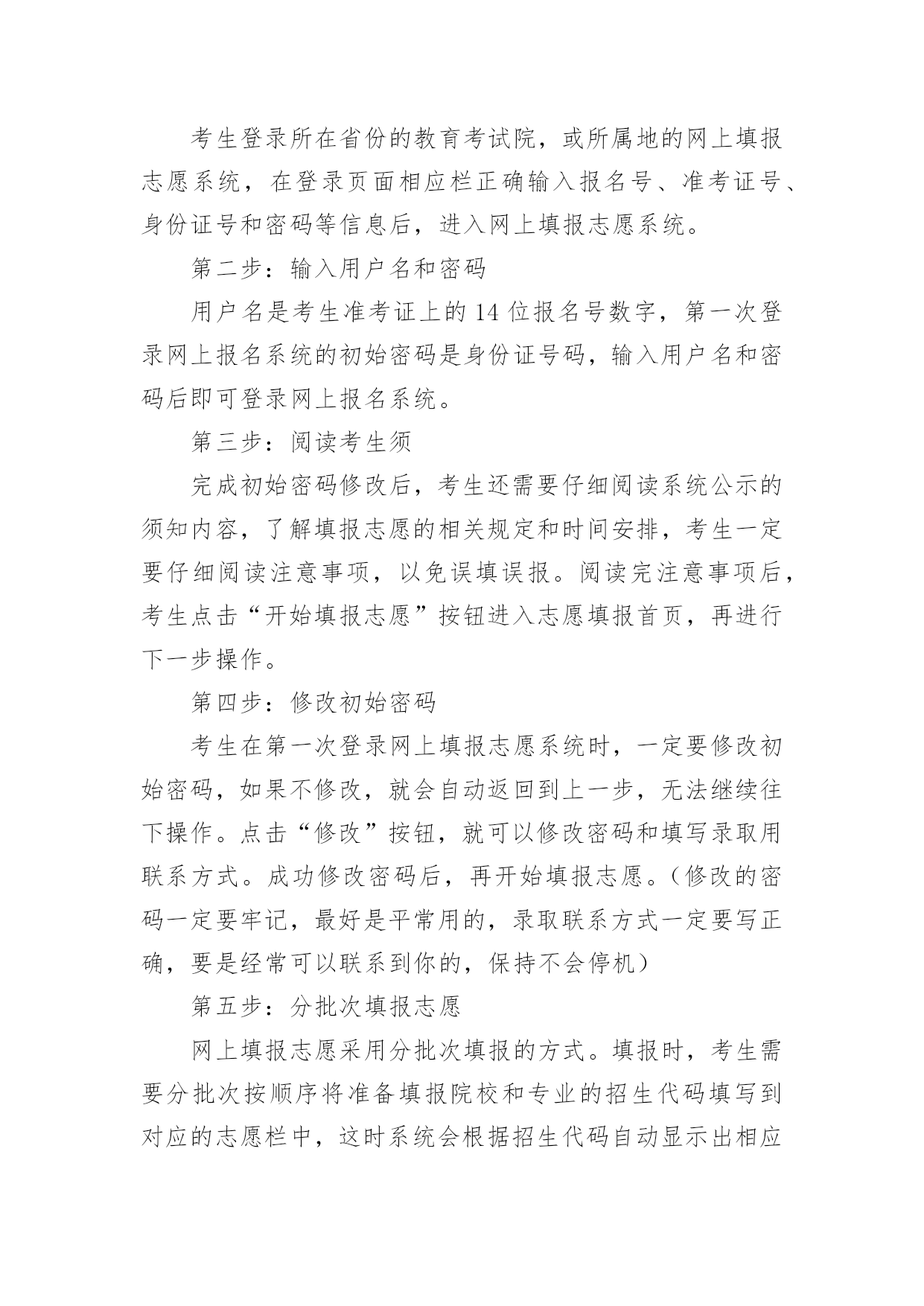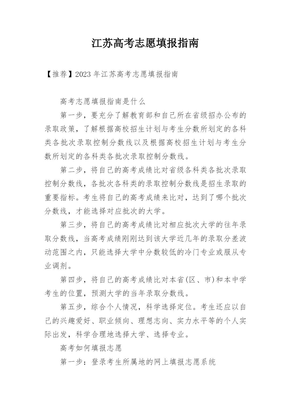江苏高考志愿填报指南【推荐】2023年江苏高考志愿填报指南高考志愿填报指南是什么第一步,要充分了解教育部和自己所在省级招办公布的录取政策,了解根据高校招生计划与考生分数所划定的各科类各批次录取控制分数线以及根据高校招生计划与考生分数所划定的各科类各批次录取控制分数线。第二步,将自己的高考成绩比对省级各科类各批次录取控制分数线,各批次各科类的录取控制分数线是招生录取的重要指标。考生将自己的高考成绩来比对,达到了哪个批次分数线,才能选择对应批次的大学。第三步,将自己的高考成绩比对相应批次大学的往年录取分数线,当高考成绩刚刚达到该大学近几年的录取分差波动范围之内,只能选择大学中分数较低的冷门专业或服从专业调剂。第四步,将自己的高考成绩比对本省(区、市)和本中学考生的位置,预测大学的当年录取分数线。第五步,综合个人情况,科学选择定位。考生还应以自己的兴趣爱好、职业倾向、理想志向、实力水平等的个人实际出发,科学合理地选择大学、选择专业。高考如何填报志愿第一步:登录考生所属地的网上填报志愿系统考生登录所在省份的教育考试院,或所属地的网上填报志愿系统,在登录页面相应栏正确输入报名号、准考证号、身份证号和密码等信息后,进入网上填报志愿系统。第二步:输入用户名和密码用户名是考生准考证上的14位报名号数字,第一次登录网上报名系统的初始密码是身份证号码,输入用户名和密码后即可登录网上报名系统。第三步:阅读考生须完成初始密码修改后,考生还需要仔细阅读系统公示的须知内容,了解填报志愿的相关规定和时间安排,考生一定要仔细阅读注意事项,以免误填误报。阅读完注意事项后,考生点击“开始填报志愿”按钮进入志愿填报首页,再进行下一步操作。第四步:修改初始密码考生在第一次登录网上填报志愿系统时,一定要修改初始密码,如果不修改,就会自动返回到上一步,无法继续往下操作。点击“修改”按钮,就可以修改密码和填写录取用联系方式。成功修改密码后,再开始填报志愿。(修改的密码一定要牢记,最好是平常用的,录取联系方式一定要写正确,要是经常可以联系到你的,保持不会停机)第五步:分批次填报志愿网上填报志愿采用分批次填报的方式。填报时,考生需要分批次按顺序将准备填报院校和专业的招生代码填写到对应的志愿栏中,这时系统会根据招生代码自动显示出相应的院校和专业名称。当一个批次填写完成后,考生要点击“确定”保存。第六步:检查核对院校代号和专业代号输入完毕后,点击“下一步”按钮,网上填报志愿系统将已填的代号转换成相对应的院校和专业,屏幕上会显示已填报的院校名称和专业名称。这时候,考生要阅读屏幕上的提示信息,仔细核实显示的学校和专业是不是自己想要填报的,如果不是,或出现红色字体提示的“无效院校”或“无效专业”就说明填错了代号,一定要按正确的代号更正,要不然就张冠李戴了。如果要修改或补填志愿,可以点击“上一步”按钮,返回到填报界面进行修改或补填。(这是高考网上填报志愿非常重要,的步骤之一)第七步:退出志愿填报系统最后,再全面查看各批次的志愿填报情况,如果没有问题,就应该立即退出网上填报志愿系统,关闭填报志愿的浏览器页面,避免密码被他人盗用而导致志愿被修改。填报志愿前考生需了解哪些信息一是招生形势。包括当年招生改革的一些重大举措、管理办法、全省各科类报考人数、各批次各科类招生计划数、录取比例等等。二是招生政策规定。比如录取批次的划分、录取办法、优录照顾政策、录取程序、投档办法、高考体检指导意见等。三是学校招生章程和招生简章。招生章程是填报志愿必读内容,主要介绍招生规则和录取要求。招生简章是高校为招生特意印制的宣传材料。四是招生计划。招生计划主要是指在湖北省招生的高校、专业和招生人数。五是近几年湖北省的批次线和各院校录取数据。收集近年各批次线、各院校在湖北省录取的第一志愿考生人数、录取的最高分、最低分和平均分。了解以上信息,有助于考生分析预测各高校的调档线。六是相关科目成绩要求。相关科目即与所报专业知识密切相关的高考科目。相关科目成绩优秀,有利于所报专业的录取。七是就业情况。选择就业率较高的院校和专业,将来择业会多一份机遇。志愿填报诀窍有什么首先,从总体上讲,高分考生重点选学校,低分考生重点选专业,中分考生学校专业都要兼顾;其次,就是报志愿不能简单看分数,而是要建立看位次的理念,报志愿重点选专业,选专业比选学校重要,所以我们要选适合考生自己实际情况的专业;同时,要从多个方面综合考虑,一个是就业情况,一个是将来的发展,还有个人的性格,性别等。通过目前市场就业情况来看,我个人认为,近两年随着互联网+的兴起,那么相关的计算机及相关专业应该是个不错的选择!而针对平行志愿一次投档,同时投档的特点,专家建议,填报时应该根据自己的实际情况,以及各个院校往年录取分数的特点,有梯度地进行选择,不要盲目填报。报平行志愿,