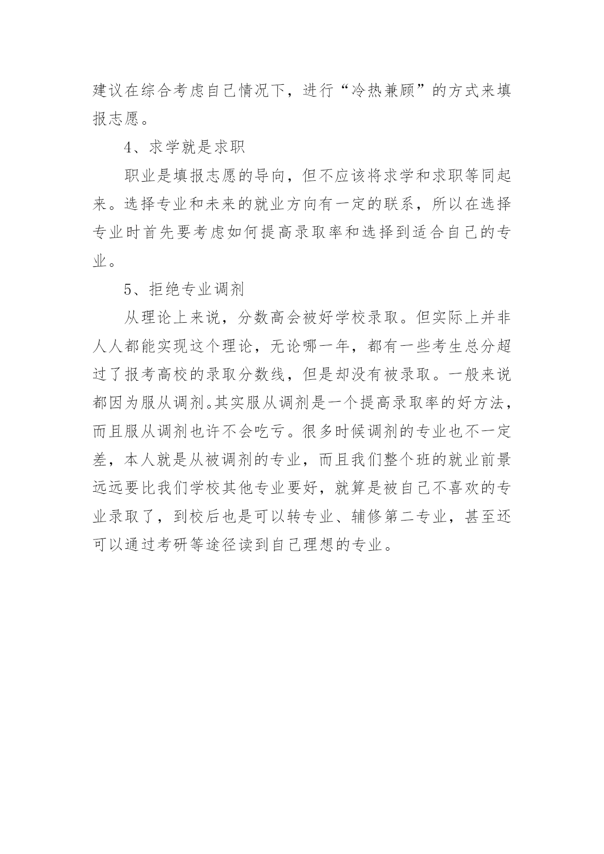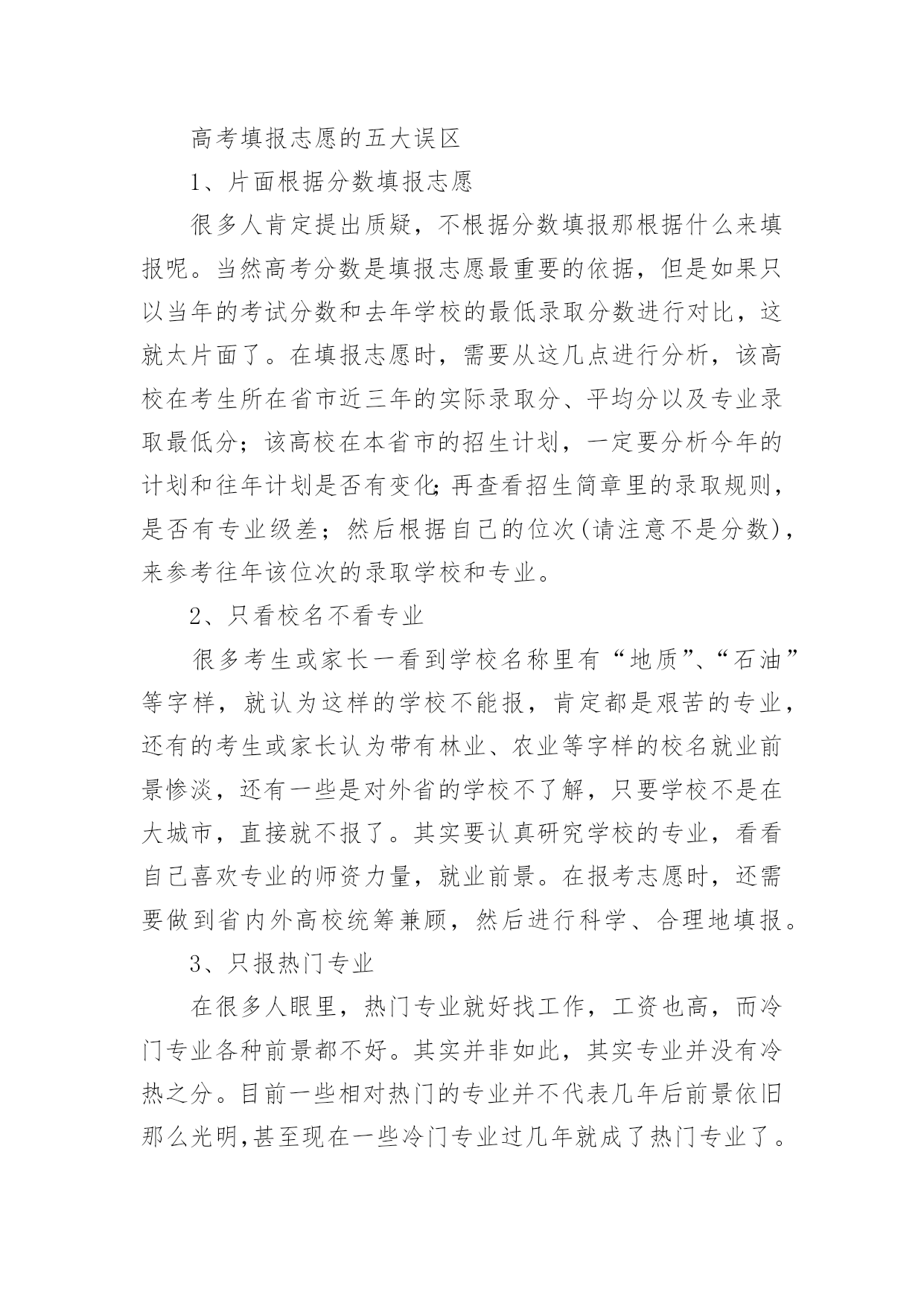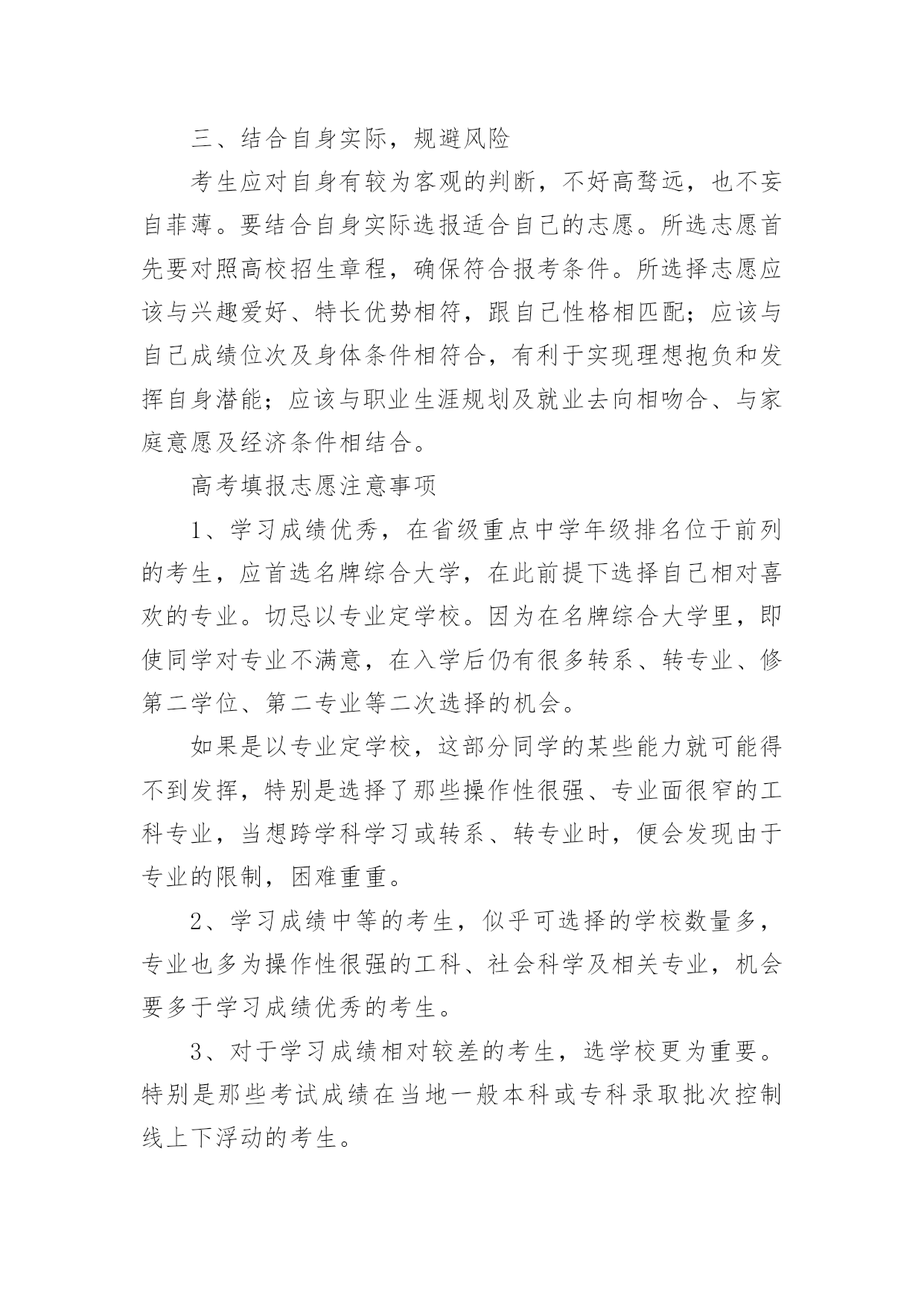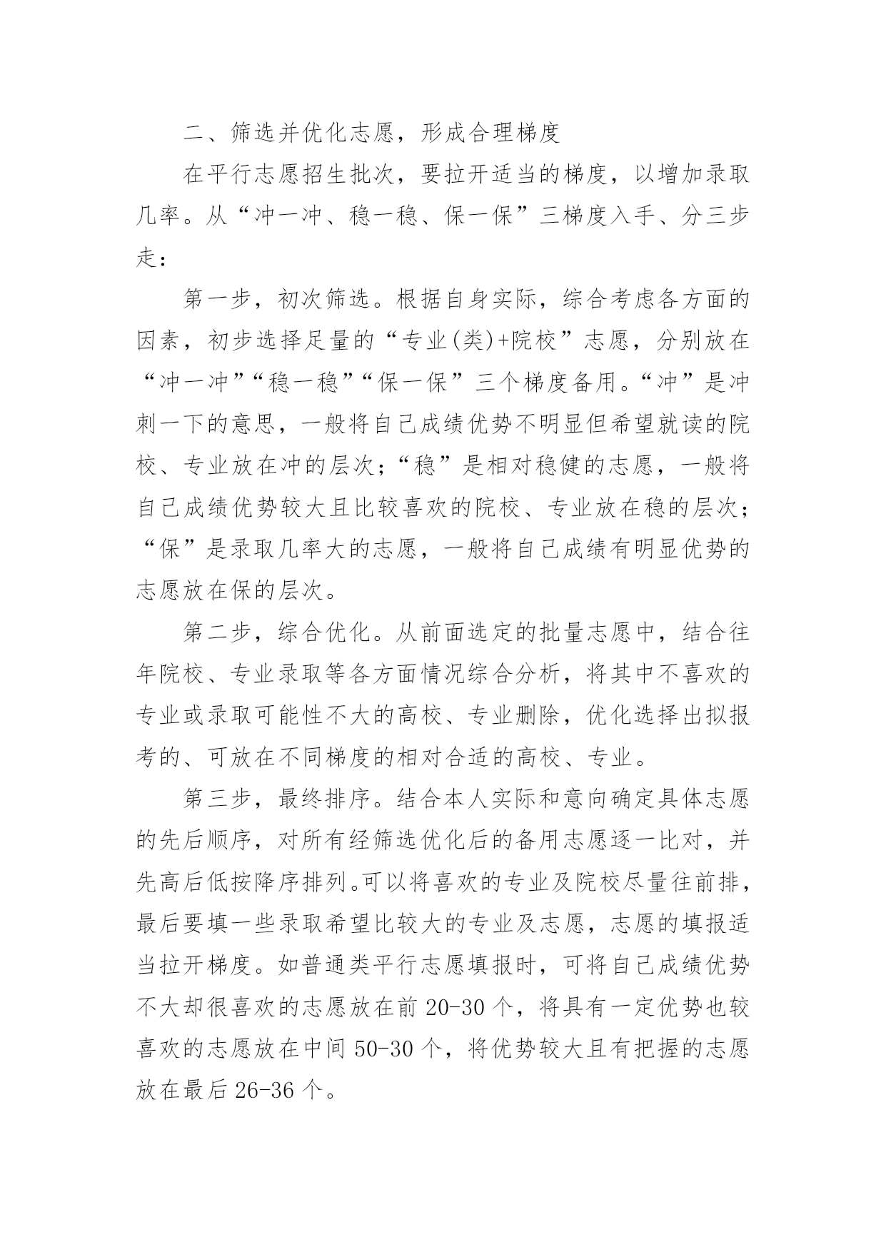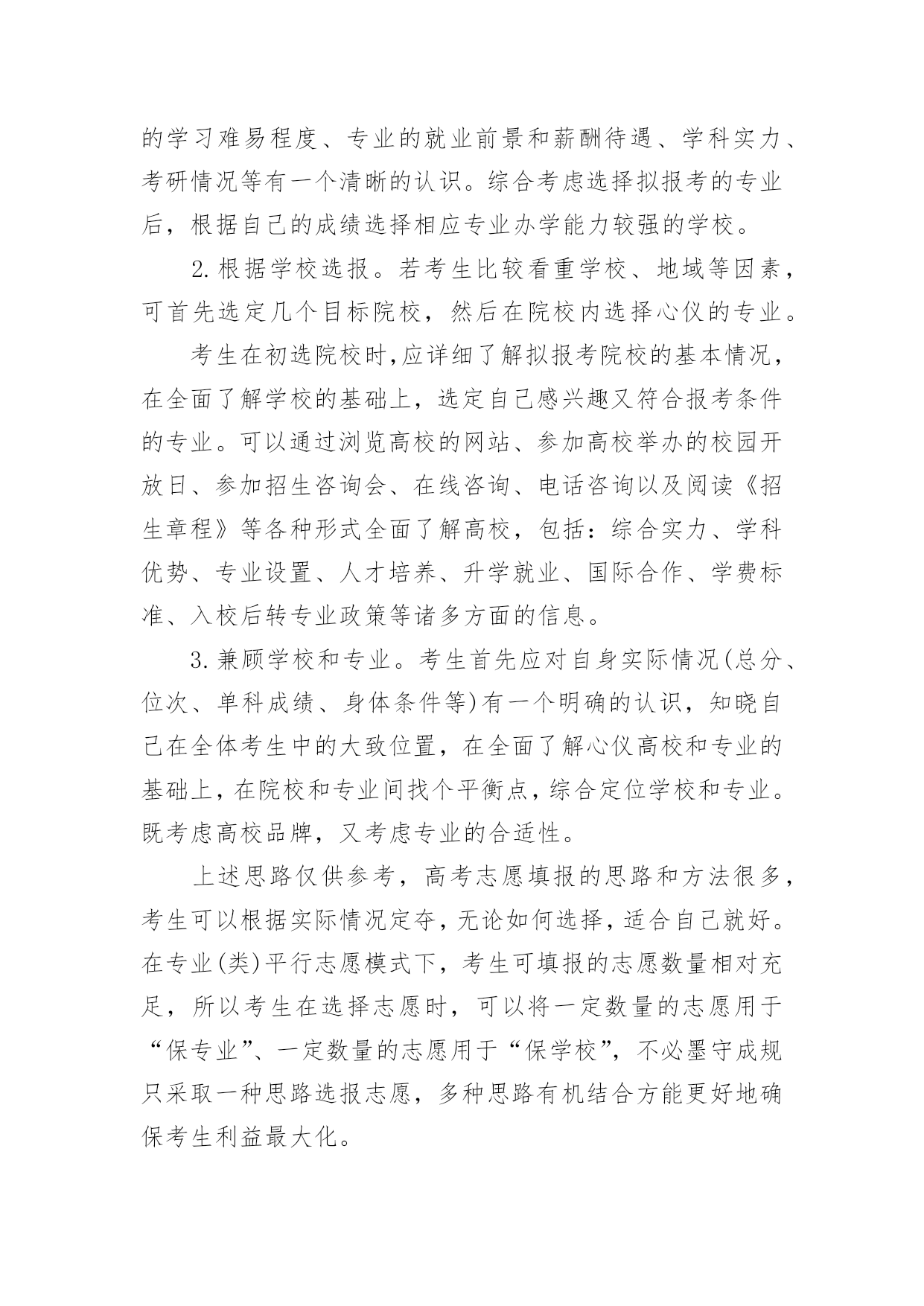 江苏高考志愿填报指南【推荐】2023年江苏高考志愿填报指南高考志愿填报指南是什么第一步,要充分了解教育部和自己所在省级招办公布的录取政策,了解根据高校招生计划与考生分数所划定的各科类各批次录取控制分数线以及根据高校招生计划与考生分数所划定的各科类各批次录取控制分数线。第二步,将自己的高考成绩比对省级各科类各批次录取控制分数线,各批次各科类的录取控制分数线是招生录取的重要指标。考生将自己的高考成绩来比对,达到了哪个批次分数线,才能选择对应批次的大学。第三步,将自己的高考成绩比对相应批次大学的往年录取分数线,当高考成绩刚刚达到该大学近几年的录取分差波动范围之内,只能选择大学中分数较低的冷门专业或服从专业调剂。第四步,将自己的高考成绩比对本省(区、市)和本中学考生的位置,预测大学的当年录取分数线。第五步,综合个人情况,科学选择定位。考生还应以自己的兴趣爱好、职业倾向、理想志向、实力水平等的个人实际出发,科学合理地选择大学、选择专业。高考如何填报志愿第一步:登录考生所属地的网上填报志愿系统考生登录所在省份的教育考试院,或所属地的网上填报志愿系统,在登录页面相应栏正确输入报名号、准考证号、身份证号和密码等信息后,进入网上填报志愿系统。第二步:输入用户名和密码用户名是考生准考证上的14位报名号数字,第一次登录网上报名系统的初始密码是身份证号码,输入用户名和密码后即可登录网上报名系统。第三步:阅读考生须完成初始密码修改后,考生还需要仔细阅读系统公示的须知内容,了解填报志愿的相关规定和时间安排,考生一定要仔细阅读注意事项,以免误填误报。阅读完注意事项后,考生点击“开始填报志愿”按钮进入志愿填报首页,再进行下一步操作。第四步:修改初始密码考生在第一次登录网上填报志愿系统时,一定要修改初始密码,如果不修改,就会自动返回到上一步,无法继续往下操作。点击“修改”按钮,就可以修改密码和填写录取用联系方式。成功修改密码后,再开始填报志愿。(修改的密码一定要牢记,最好是平常用的,录取联系方式一定要写正确,要是经常可以联系到你的,保持不会停机)第五步:分批次填报志愿网上填报志愿采用分批次填报的方式。填报时,考生需要分批次按顺序将准备填报院校和专业的招生代码填写到对应的志愿栏中,这时系统会根据招生代码自动显示出相应的院校和专业名称。当一个批次填写完成后,考生要点击“确定”保存。第六步:检查核对院校代号和专业代号输入完毕后,点击“下一步”按钮,网上填报志愿系统将已填的代号转换成相对应的院校和专业,屏幕上会显示已填报的院校名称和专业名称。这时候,考生要阅读屏幕上的提示信息,仔细核实显示的学校和专业是不是自己想要填报的,如果不是,或出现红色字体提示的“无效院校”或“无效专业”就说明填错了代号,一定要按正确的代号更正,要不然就张冠李戴了。如果要修改或补填志愿,可以点击“上一步”按钮,返回到填报界面进行修改或补填。(这是高考网上填报志愿非常重要,的步骤之一)第七步:退出志愿填报系统最后,再全面查看各批次的志愿填报情况,如果没有问题,就应该立即退出网上填报志愿系统,关闭填报志愿的浏览器页面,避免密码被他人盗用而导致志愿被修改。填报志愿前考生需了解哪些信息一是招生形势。包括当年招生改革的一些重大举措、管理办法、全省各科类报考人数、各批次各科类招生计划数、录取比例等等。二是招生政策规定。比如录取批次的划分、录取办法、优录照顾政策、录取程序、投档办法、高考体检指导意见等。三是学校招生章程和招生简章。招生章程是填报志愿必读内容,主要介绍招生规则和录取要求。招生简章是高校为招生特意印制的宣传材料。四是招生计划。招生计划主要是指在湖北省招生的高校、专业和招生人数。五是近几年湖北省的批次线和各院校录取数据。收集近年各批次线、各院校在湖北省录取的第一志愿考生人数、录取的最高分、最低分和平均分。了解以上信息,有助于考生分析预测各高校的调档线。六是相关科目成绩要求。相关科目即与所报专业知识密切相关的高考科目。相关科目成绩优秀,有利于所报专业的录取。七是就业情况。选择就业率较高的院校和专业,将来择业会多一份机遇。志愿填报诀窍有什么首先,从总体上讲,高分考生重点选学校,低分考生重点选专业,中分考生学校专业都要兼顾;其次,就是报志愿不能简单看分数,而是要建立看位次的理念,报志愿重点选专业,选专业比选学校重要,所以我们要选适合考生自己实际情况的专业;同时,要从多个方面综合考虑,一个是就业情况,一个是将来的发展,还有个人的性格,性别等。通过目前市场就业情况来看,我个人认为,近两年随着互联网+的兴起,那么相关的计算机及相关专业应该是个不错的选择!而针对平行志愿一次投档,同时投档的特点,专家建议,填报时应该根据自己的实际情况,以及各个院校往年录取分数的特点,有梯度地进行选择,不要盲目填报。报平行志愿,