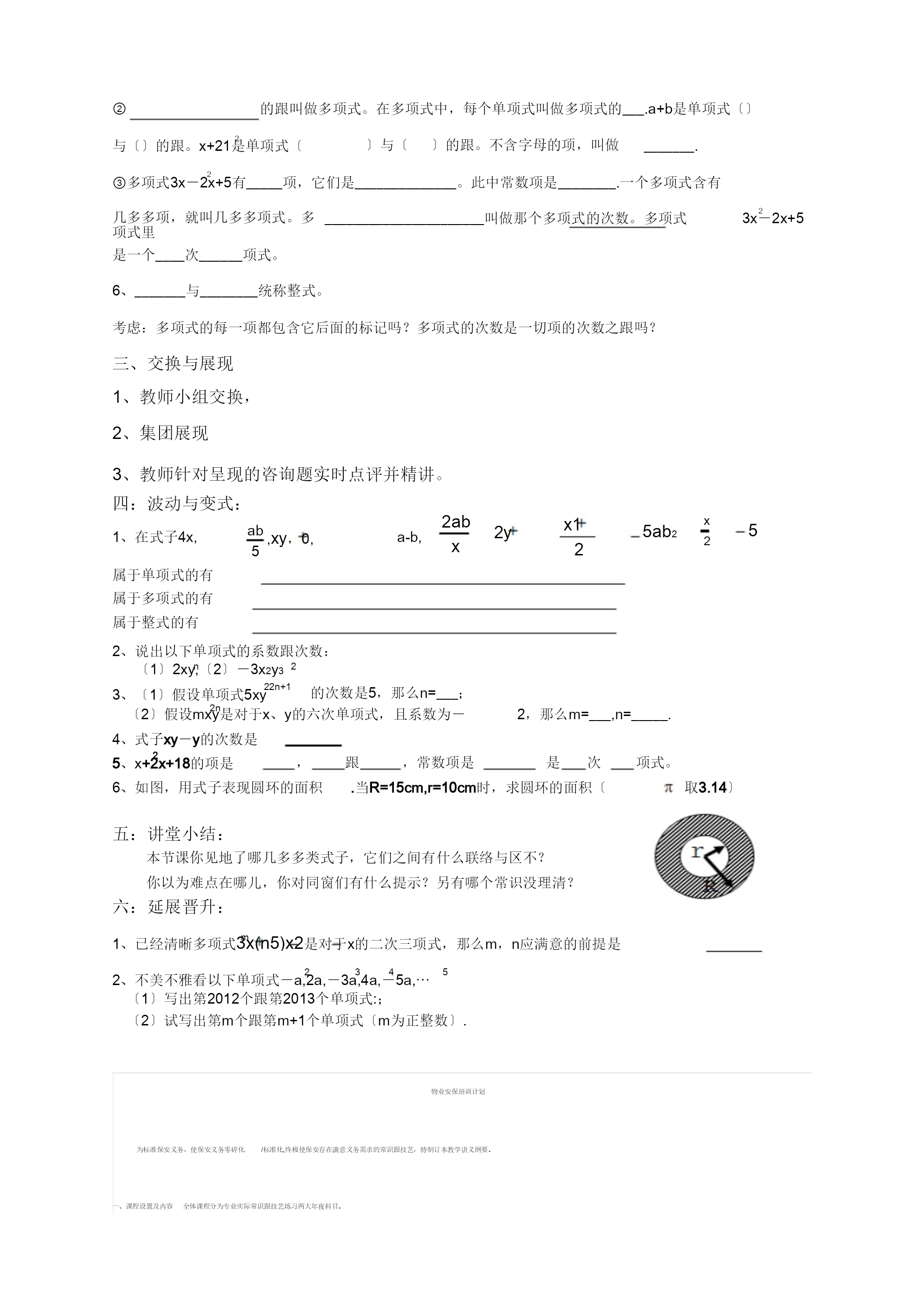整式教学计划教学内容:单项式,多项式,整式的见地。教学目标:1、了解并操纵单项式、多项式,整式的不美不雅念。2、能准确揣摸单项式、多项式以及单项式的系数跟次数、多项式的项跟次数等.3、经过丰厚风趣的梦想状况,使教师阅历从详细咨询题中笼统出数目关联,在处理咨询题中了解数学的代价,开展“用数学〞的决心.教学重点:单项式的系数、次数,多项式的项数、次数等不美不雅念。教学难点:单项式,多项式次数的了解。教学流程:一、情境引入:〔后面大年夜伙儿进修了用字母表现数,教师这有几多多个生涯中的小咨询题,请同学们比一比,看谁能准确帮教师解答〕〔教师板书教师的谜底〕(1)苹果每千克8元,买m千克苹果几多多元?〔2〕一个长方体的长跟宽全然上a,高是h,它的体积是几多多?〔3〕讲堂的长方形木门长与宽分不为a、b,那么门的面积是几多多?周长呢?2〔4〕七年级一班有男生x人,女生21人,那么那个班共有教师几多多人?教师:俚语说人以群分,物以类聚,换种思绪了解对数学进修也有效,比方刚写下的这些式子,就能够依照它们差别的特点进展分类,这确实是本节课咱们要研讨的主题。板书:2.1整式二、教师自学讲义〔先自学56页考虑到57页练习实现1到4题,再自学58页内容完成填空题。用你喜爱的色彩标注界说、要害词或你以为是重点的句子〕,并实现上面的咨询题:221.在式子8m,ab,ab,a+b,x+21中单项式有哪几多多个?2.什么是单项式?举例阐明。5是单项式吗?a呢?-n呢?132,2x2y,πr的次数跟系3.什么是单项式的系数跟次数?说说单项式x,ah,5-mn,0.8p,数.5的次数呢?4.你能给0.9b给以一个实际意思吗?5.填空:22①在式子8m,ab,ab,a+b,x+21中多项式有_______________。②的跟叫做多项式。在多项式中,每个单项式叫做多项式的___.a+b是单项式〔〕2与〔〕的跟。x+21是单项式〔〕与〔〕的跟。不含字母的项,叫做_______.2③多项式3x-2x+5有_____项,它们是______________。此中常数项是________.一个多项式含有2几多多项,就叫几多多项式。多项式里______________________叫做那个多项式的次数。多项式3x-2x+5是一个____次______项式。6、_______与________统称整式。考虑:多项式的每一项都包含它后面的标记吗?多项式的次数是一切项的次数之跟吗?三、交换与展现1、教师小组交换,2、集团展现3、教师针对呈现的咨询题实时点评并精讲。四:波动与变式:2abxx125ab2x5ab52y1、在式子4x,,xy,0,a-b,2属于单项式的有属于多项式的有属于整式的有2、说出以下单项式的系数跟次数:〔1〕2xy,〔2〕-3x2y3n222n+1的次数是5,那么n=___;3、〔1〕假设单项式5xy2n〔2〕假设mxy是对于x、y的六次单项式,且系数为-2,那么m=___,n=_____.4、式子xy-y的次数是25、x+2x+18的项是,跟,常数项是是次项式。6、如图,用式子表现圆环的面积.当R=15cm,r=10cm时,求圆环的面积〔取3.14〕五:讲堂小结:本节课你见地了哪几多多类式子,它们之间有什么联络与区不?你以为难点在哪儿,你对同窗们有什么提示?另有哪个常识没理清?六:延展晋升:m1、已经清晰多项式3x(n5)x2是对于x的二次三项式,那么m,n应满意的前提是23452、不美不雅看以下单项式-a,2a,-3a,4a,-5a,⋯〔1〕写出第2012个跟第2013个单项式:;〔2〕试写出第m个跟第m+1个单项式〔m为正整数〕.物业安保培训计划为标准保安义务,使保安义务零碎化/标准化,终极使保安存在满意义务需求的常识跟技艺,特制订本教学讲义纲要。一、课程设置及内容全体课程分为专业实际常识跟技艺练习两大年夜科目。此中专业实际常识内容包含:保安实际常识、消防营业常识、职业品行、执法常识、保安礼节、援救常识。作技艺练习内容包含:岗亭操纵指引、勤务技艺、消防技艺、军事技艺。二.培训的及央求培训目标1〕保安职员培训应以保安实际常识、消防常识、执法常识教学为主,在教学进程中,应央求先生双方面善知保安实际常识及消防专业常识,在义务中的操纵与运用,并全然操纵现场爱护及处理知识2〕职业品行课程的教学应依照差别的岗亭元而予以差别的内容,使保何在各自差别的义务岗亭上都能养成存在本职业特点的优秀职业品行跟举措标准〕执法常识教