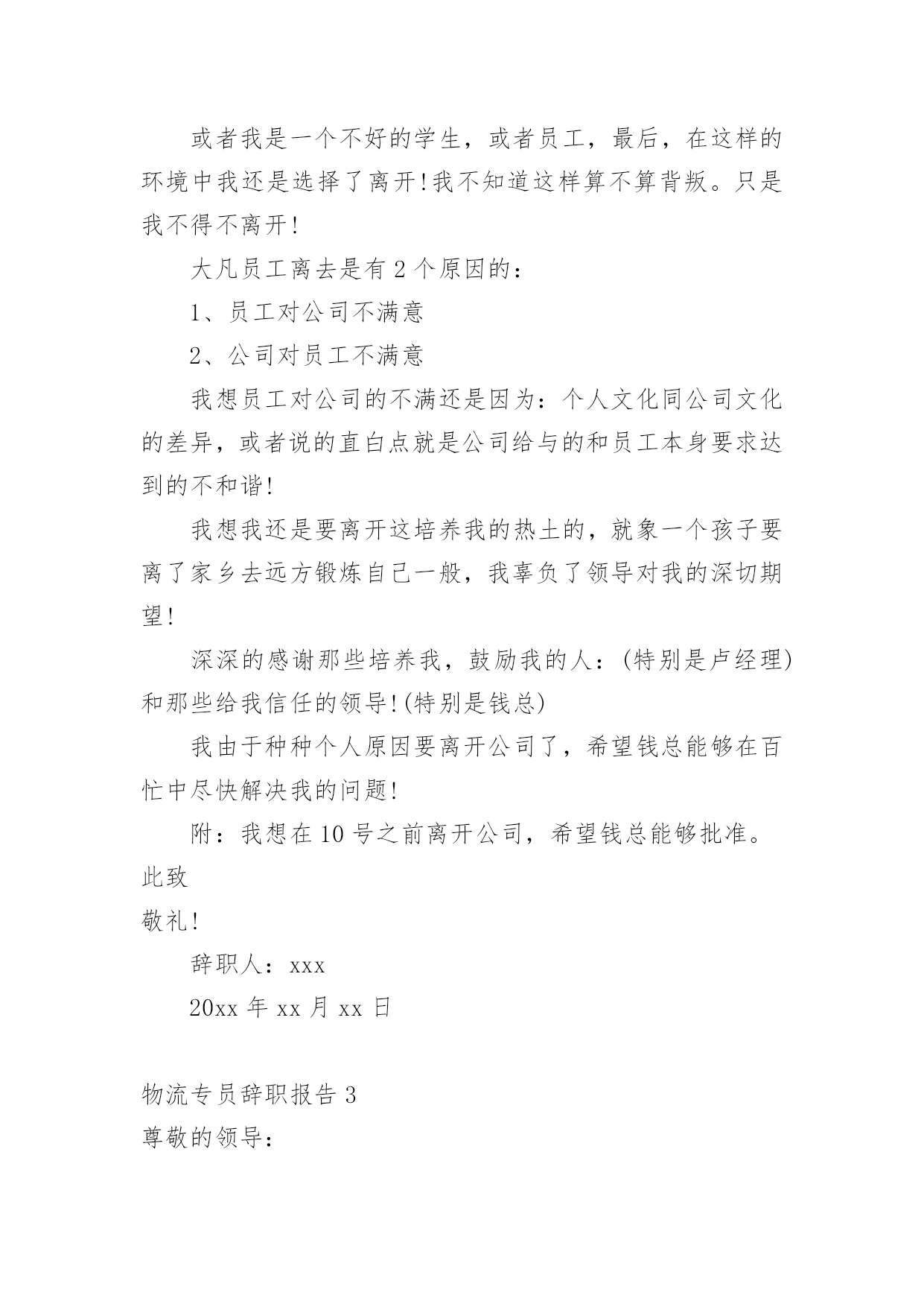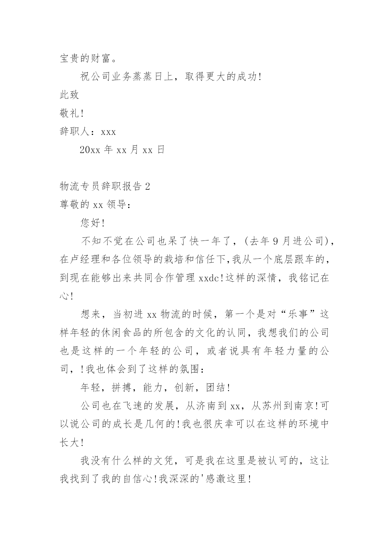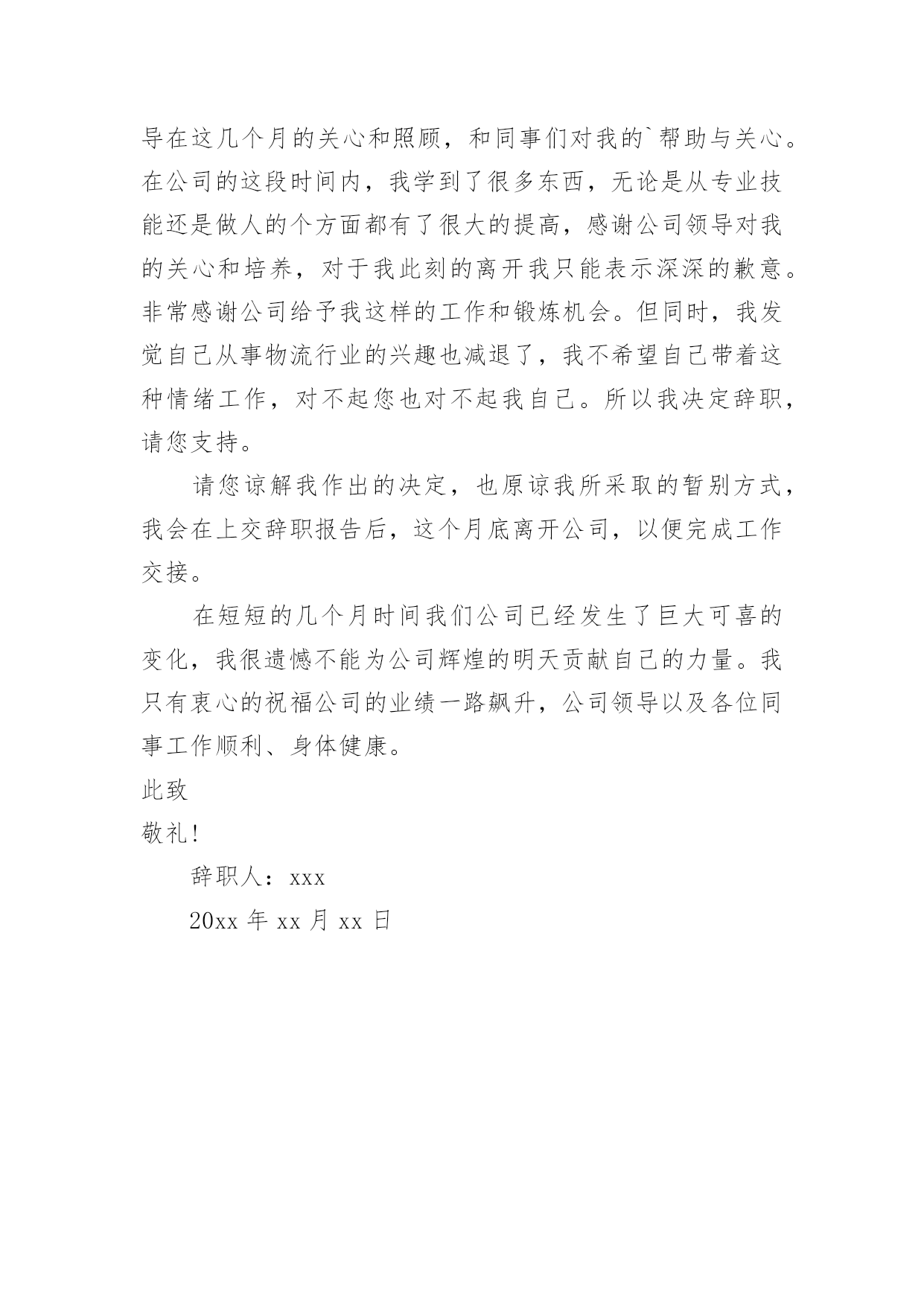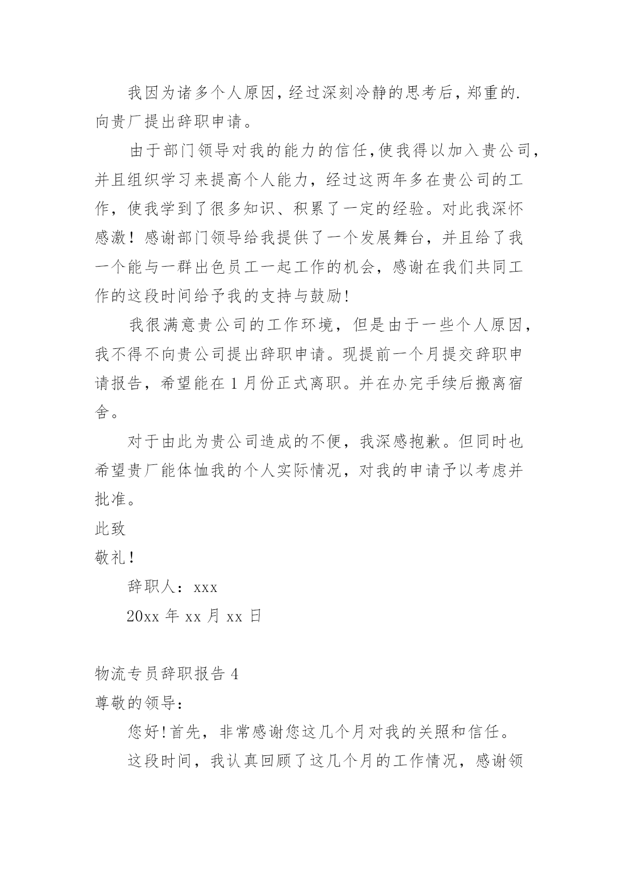 物流专员辞职报告物流专员辞职报告大全(4篇)在我们平凡的日常里,报告使用的频率越来越高,不同的报告内容同样也是不同的。相信许多人会觉得报告很难写吧,以下是小编帮大家整理的物流专员辞职报告,仅供参考,大家一起来看看吧。物流专员辞职报告1尊敬的xxx领导:我很遗憾自己在这个时候向公司正式提出辞职。来到xx物流中心已经接近半年了,正是在这里我开始踏上了社会,完成了自己从一个学生到社会人的转变。这里平等的人际关系和开明的工作作风,让我能开心的工作,开心的学习。但是因为离家比较远,父母近期身体都不好,家里没有人照顾,作为一个儿子我有侍奉双亲的责任,这两天我虽然很努力让自己专心工作,但是心却无时无刻不牵挂家里,我现在的状态确实已经无法胜任工作。正是考虑到这些因素,我郑重向公司提出辞职,希望领导能够批准,另外离开前我也会认真做好现有的工作,把未完成的工作做一下整理,以保证工作的顺利的`交接。我真心的感谢公司领导一直以来对我的信任,感谢身边同事对我的关心和帮助,很荣幸自己成为过公司的一员,我确信在公司的这段工作和学习的经历和经验将成为我一生宝贵的财富。祝公司业务蒸蒸日上,取得更大的成功!此致敬礼!辞职人:xxx20xx年xx月xx日物流专员辞职报告2尊敬的xx领导:您好!不知不觉在公司也呆了快一年了,(去年9月进公司),在卢经理和各位领导的栽培和信任下,我从一个底层跟车的,到现在能够出来共同合作管理xxdc!这样的深情,我铭记在心!想来,当初进xx物流的时候,第一个是对“乐事”这样年轻的休闲食品的所包含的文化的认同,我想我们的公司也是这样的一个年轻的公司,或者说具有年轻力量的公司,!我也体会到了这样的氛围:年轻,拼搏,能力,创新,团结!公司也在飞速的发展,从济南到xx,从苏州到南京!可以说公司的成长是几何的!我也很庆幸可以在这样的环境中长大!我没有什么样的文凭,可是我在这里是被认可的,这让我找到了我的自信心!我深深的'感激这里!或者我是一个不好的学生,或者员工,最后,在这样的环境中我还是选择了离开!我不知道这样算不算背叛。只是我不得不离开!大凡员工离去是有2个原因的:1、员工对公司不满意2、公司对员工不满意我想员工对公司的不满还是因为:个人文化同公司文化的差异,或者说的直白点就是公司给与的和员工本身要求达到的不和谐!我想我还是要离开这培养我的热土的,就象一个孩子要离了家乡去远方锻炼自己一般,我辜负了领导对我的深切期望!深深的感谢那些培养我,鼓励我的人:(特别是卢经理)和那些给我信任的领导!(特别是钱总)我由于种种个人原因要离开公司了,希望钱总能够在百忙中尽快解决我的问题!附:我想在10号之前离开公司,希望钱总能够批准。此致敬礼!辞职人:xxx20xx年xx月xx日物流专员辞职报告3尊敬的领导:我因为诸多个人原因,经过深刻冷静的思考后,郑重的.向贵厂提出辞职申请。由于部门领导对我的能力的信任,使我得以加入贵公司,并且组织学习来提高个人能力,经过这两年多在贵公司的工作,使我学到了很多知识、积累了一定的经验。对此我深怀感激!感谢部门领导给我提供了一个发展舞台,并且给了我一个能与一群出色员工一起工作的机会,感谢在我们共同工作的这段时间给予我的支持与鼓励!我很满意贵公司的工作环境,但是由于一些个人原因,我不得不向贵公司提出辞职申请。现提前一个月提交辞职申请报告,希望能在1月份正式离职。并在办完手续后搬离宿舍。对于由此为贵公司造成的不便,我深感抱歉。但同时也希望贵厂能体恤我的个人实际情况,对我的申请予以考虑并批准。此致敬礼!辞职人:xxx20xx年xx月xx日物流专员辞职报告4尊敬的领导:您好!首先,非常感谢您这几个月对我的关照和信任。这段时间,我认真回顾了这几个月的工作情况,感谢领导在这几个月的关心和照顾,和同事们对我的`帮助与关心。在公司的这段时间内,我学到了很多东西,无论是从专业技能还是做人的个方面都有了很大的提高,感谢公司领导对我的关心和培养,对于我此刻的离开我只能表示深深的歉意。非常感谢公司给予我这样的工作和锻炼机会。但同时,我发觉自己从事物流行业的兴趣也减退了,我不希望自己带着这种情绪工作,对不起您也对不起我自己。所以我决定辞职,请您支持。请您谅解我作出的决定,也原谅我所采取的暂别方式,我会在上交辞职报告后,这个月底离开公司,以便完成工作交接。在短短的几个月时间我们公司已经发生了巨大可喜的变化,我很遗憾不能为公司辉煌的明天贡献自己的力量。我只有衷心的祝福公司的业绩一路飙升,公司领导以及各位同事工作顺利、身体健康。此致敬礼!辞职人:xxx20xx年xx月xx日