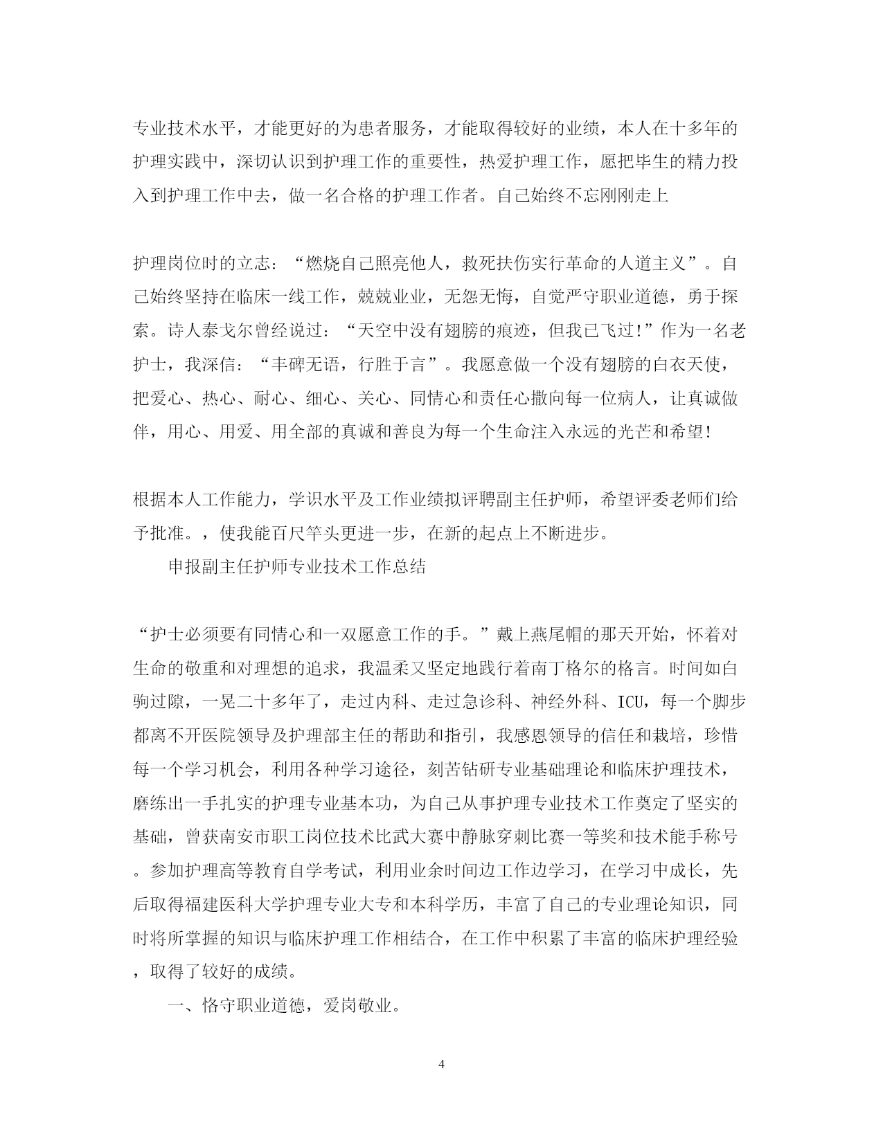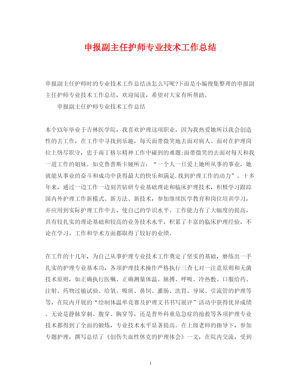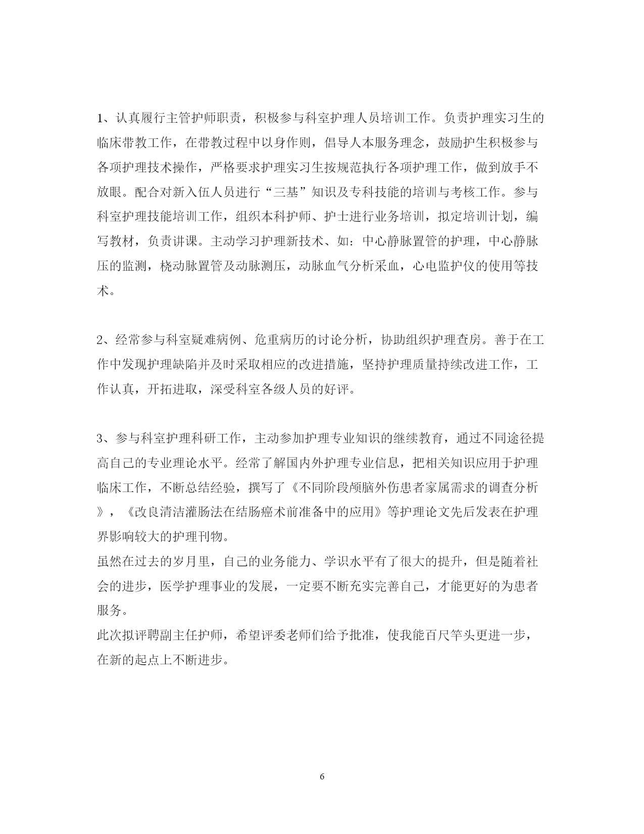 此资料由网络收集而来,如有侵权请告知上传者立即删除。资料共分享,我们负责传递知识。PAGEPAGE6申报副主任护师专业技术工作总结申报副主任护师时的专业技术工作总结该怎么写呢?下面是小编搜集整理的申报副主任护师专业技术工作总结,欢迎阅读,希望对大家有所帮助。申报副主任护师专业技术工作总结本个XX年毕业于吉林医学院,我喜欢护理这项职业,因为我热爱她所以我会创造性的去工作,在工作中寻找到乐趣,每天面带微笑地去面对病人、面对在护理岗位上恪尽职守,忠于南丁格尔精神工作中碰到的难题;面带微笑的去面对每天和我一道工作的姐妹。如克鲁普斯卡娅所言:“一个人一旦爱上她所从事的事业,她就能从事业的奋斗和成功中获得最大的快乐和满足.找到护理工作的动力”。十多年来,通过一边工作一边刻苦钻研专业基础理论和临床护理技术,积极学习跟踪国内外护理工作新模式、新方法、新技术,参加继续医学教育和岗位培训学习,并应用到实际护理工作中去,使自己的学识水平、工作能力有了大幅度的提高,具有较扎实的理论基础和较高的业务技术水平,积累了丰富的临床护理经验,不论在学习、工作和学术方面都取得了较好的业绩。在工作的十几年,为自己从事护理专业技术工作奠定了坚实的基础,磨练出一手扎实的护理专业基本功,各项护理技术操作严格执行三查七对一注意原则和无菌技术原则,如正确执行医嘱、正确测量体温、脉搏、呼吸、冷热敷、口服给药、注射、药物过敏试验、给氧、吸痰、鼻饲、灌肠、洗胃、导尿、引流管的护理等等,在院内开展的“绘制体温单竞赛及护理文书书写展评”活动中获得优异成绩。无论是静脉穿刺、腹穿、胸穿等,还是普外科重危急症的抢救等各项护理专业技术都得到了全面的锻炼,专业技术水平显著提高。在上级老师的指导下,参加专题护理,撰写总结了《创伤失血性休克的护理体会》一文,在院内交流,受到好评。在工作中,我虚心向上级护师求教,细心护理每一位患者,努力钻研业务,使自己从一名新兵迅速成长为科室的护理骨干。干部科从事护理专业技术工作,科室接受的都是建国前参加工作的老同志,自己更加注重专业理论知识的学习,注重与临床护理实践的结合,树立了强烈的责任心和严谨而科学的工作态度,在不断的学习和临床实践中,提高了护理理论知识和对疾病的观察能力及病情发生突变时的应变能力,同护士长及全科医护人员密切配合,进行护理查房,加强湿式扫床等病房基础护理工作,使病房管理在全院成为标准化、模式化病房。在临床护理工作中,熟练掌握心肺复苏术、无菌技术、休克抢救等抢救程序和方法,较系统地掌握了内科各系统护理常规、治疗原则、健康宣教工作,如冠心病护理、肺心病护理、肺性脑病护理、肝、肾综合征护理、高血压、脑出血、脑梗塞、心肌梗死、严重心律失常护理等,熟练掌握心电图机、血氧疗法、心电监护仪以及各种急救器械的性能原理、使用方法、日常维护及保养技术,熟练配合医生参加对休克、昏迷、上消化道出血、糖尿病、肝昏迷、心脏骤停等危重病人的抢救并制定护理方案,在临床护理工作中,不怕脏不怕累,热心为患者服务,积极完成各项护理工作任务,对新入院病人详细讲解各项辅助检查的目的,有关标本的采集方法、注意事项,做好基础护理、心理护理,受到患者及医生的表扬。2019年被市卫生局评为市优秀护士,被多次选拔参加系统护理知识技术操作大赛。在2019年全市医院等级评审迎检工作中,我受护理部指派参加护理人员护理技术操作考核,对口腔护理等十项技术操作取得了优异的成绩,得到专家的好评,受到院领导奖励。并于2019年在院组织的“三基”训练竞赛活动中被授予“优秀护士”称号。在本院的专业技术人员考核评定中,连续多年被评为优秀。在工作期间,从未出现差错事故,得到了广大患者的一致好评。在老干部科工作以来自己各方面的综合能力得到了更全面的锻炼。团结同志表现出良好的组织协调能力。协助科主任、护士长组织医疗护理查房、会诊、业务学习和病历讨论等。建立严谨的护理查房业务学习制度。充实护理查房内容,针对具体病历进行专题性讨论,把专业理论知识与临床护理实践紧密结合,更加圆满地完成了每年下级护士及实习护士的带教任务。静脉留置针在老年肿瘤患者输液中是护理专业较棘手的问题,常常因此而影响了治疗。我主持了内科护理组对这一课题的临床调查分析,对临床资料收集、原因查找等做了大量的实例调查记录,总结撰写了“静脉留置针在老年肿瘤患者输液中应注意的问题”在院年度学术会上交流获得一致好评;2019年4月至2019年1月与同事共同总结的“临床工作中护患之间沟通技巧”一文获得了市卫生系统年度学术交流一等奖。在工作中我坚持业务知识的学习,及时跟踪并掌握国内外护理前沿的新知识、新动向、新发展、新技术,并及时将先进的并及时将先进的护理知识和技术传授给下级护士及实习护士。近几年本人先后学习了《基础护理学》各版本、《整体