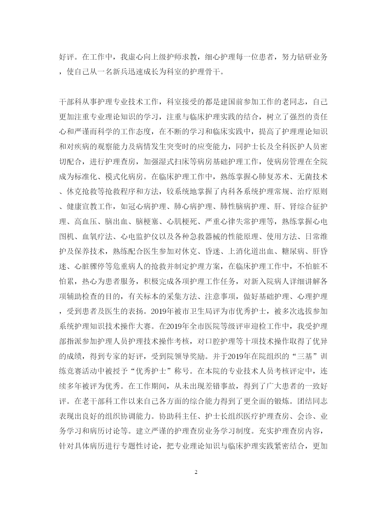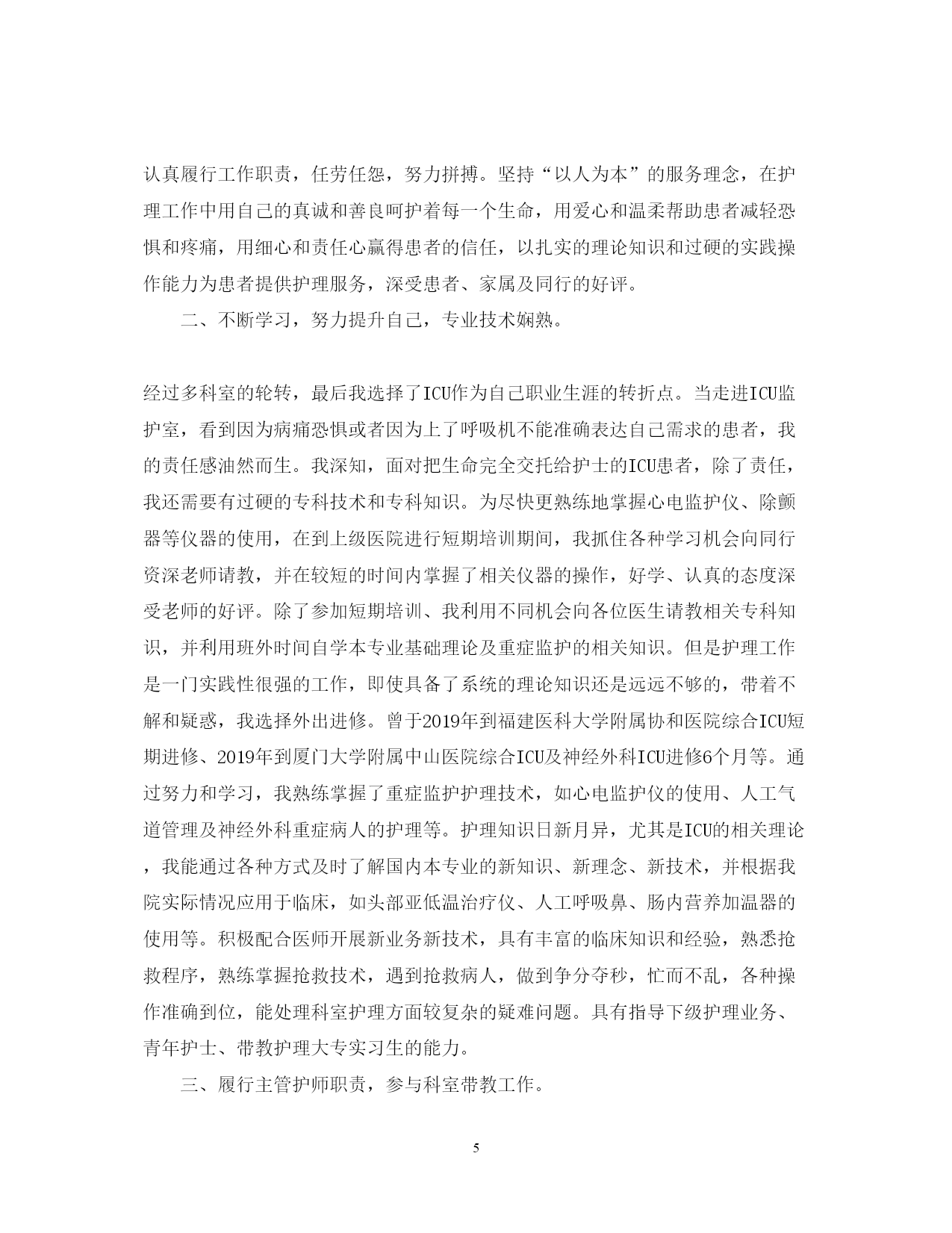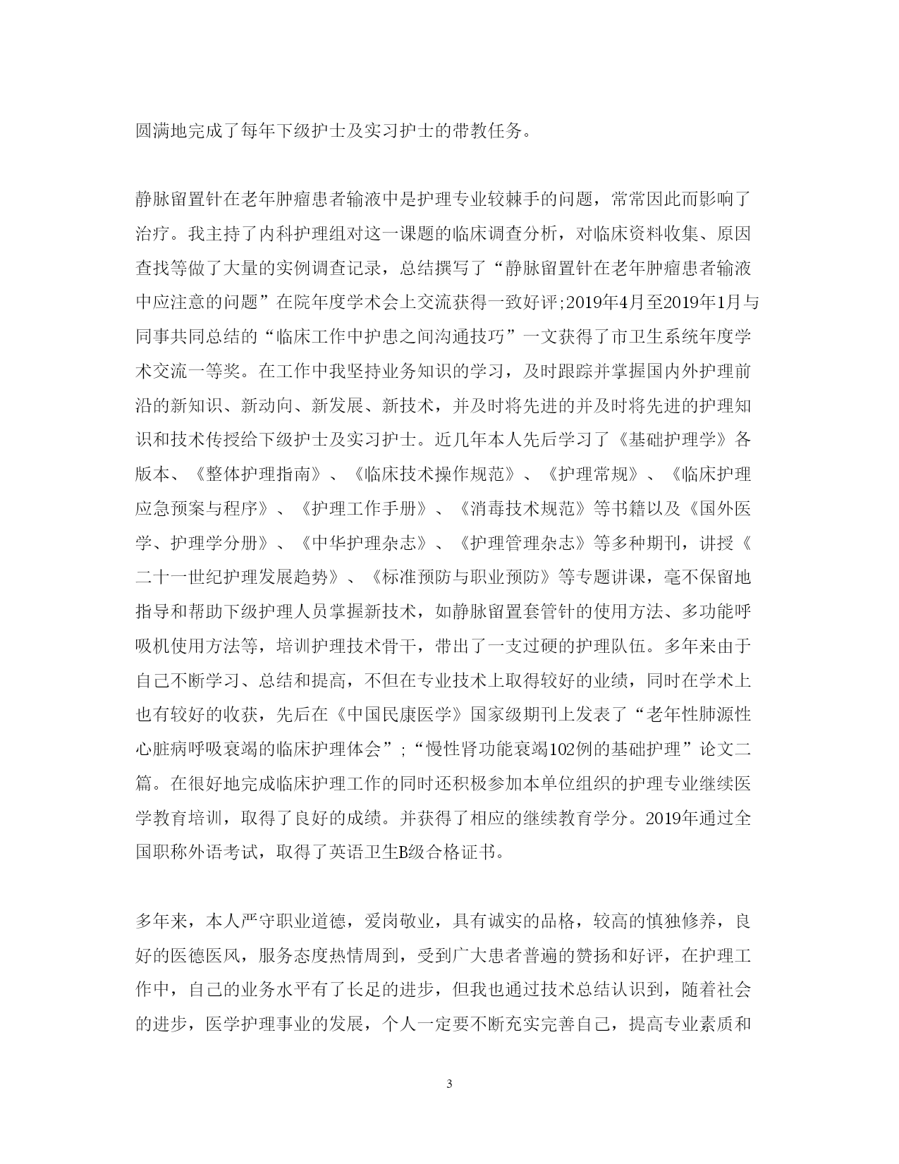 此资料由网络收集而来,如有侵权请告知上传者立即删除。资料共分享,我们负责传递知识。PAGEPAGE6申报副主任护师专业技术工作总结申报副主任护师时的专业技术工作总结该怎么写呢?下面是小编搜集整理的申报副主任护师专业技术工作总结,欢迎阅读,希望对大家有所帮助。申报副主任护师专业技术工作总结本个XX年毕业于吉林医学院,我喜欢护理这项职业,因为我热爱她所以我会创造性的去工作,在工作中寻找到乐趣,每天面带微笑地去面对病人、面对在护理岗位上恪尽职守,忠于南丁格尔精神工作中碰到的难题;面带微笑的去面对每天和我一道工作的姐妹。如克鲁普斯卡娅所言:“一个人一旦爱上她所从事的事业,她就能从事业的奋斗和成功中获得最大的快乐和满足.找到护理工作的动力”。十多年来,通过一边工作一边刻苦钻研专业基础理论和临床护理技术,积极学习跟踪国内外护理工作新模式、新方法、新技术,参加继续医学教育和岗位培训学习,并应用到实际护理工作中去,使自己的学识水平、工作能力有了大幅度的提高,具有较扎实的理论基础和较高的业务技术水平,积累了丰富的临床护理经验,不论在学习、工作和学术方面都取得了较好的业绩。在工作的十几年,为自己从事护理专业技术工作奠定了坚实的基础,磨练出一手扎实的护理专业基本功,各项护理技术操作严格执行三查七对一注意原则和无菌技术原则,如正确执行医嘱、正确测量体温、脉搏、呼吸、冷热敷、口服给药、注射、药物过敏试验、给氧、吸痰、鼻饲、灌肠、洗胃、导尿、引流管的护理等等,在院内开展的“绘制体温单竞赛及护理文书书写展评”活动中获得优异成绩。无论是静脉穿刺、腹穿、胸穿等,还是普外科重危急症的抢救等各项护理专业技术都得到了全面的锻炼,专业技术水平显著提高。在上级老师的指导下,参加专题护理,撰写总结了《创伤失血性休克的护理体会》一文,在院内交流,受到好评。在工作中,我虚心向上级护师求教,细心护理每一位患者,努力钻研业务,使自己从一名新兵迅速成长为科室的护理骨干。干部科从事护理专业技术工作,科室接受的都是建国前参加工作的老同志,自己更加注重专业理论知识的学习,注重与临床护理实践的结合,树立了强烈的责任心和严谨而科学的工作态度,在不断的学习和临床实践中,提高了护理理论知识和对疾病的观察能力及病情发生突变时的应变能力,同护士长及全科医护人员密切配合,进行护理查房,加强湿式扫床等病房基础护理工作,使病房管理在全院成为标准化、模式化病房。在临床护理工作中,熟练掌握心肺复苏术、无菌技术、休克抢救等抢救程序和方法,较系统地掌握了内科各系统护理常规、治疗原则、健康宣教工作,如冠心病护理、肺心病护理、肺性脑病护理、肝、肾综合征护理、高血压、脑出血、脑梗塞、心肌梗死、严重心律失常护理等,熟练掌握心电图机、血氧疗法、心电监护仪以及各种急救器械的性能原理、使用方法、日常维护及保养技术,熟练配合医生参加对休克、昏迷、上消化道出血、糖尿病、肝昏迷、心脏骤停等危重病人的抢救并制定护理方案,在临床护理工作中,不怕脏不怕累,热心为患者服务,积极完成各项护理工作任务,对新入院病人详细讲解各项辅助检查的目的,有关标本的采集方法、注意事项,做好基础护理、心理护理,受到患者及医生的表扬。2019年被市卫生局评为市优秀护士,被多次选拔参加系统护理知识技术操作大赛。在2019年全市医院等级评审迎检工作中,我受护理部指派参加护理人员护理技术操作考核,对口腔护理等十项技术操作取得了优异的成绩,得到专家的好评,受到院领导奖励。并于2019年在院组织的“三基”训练竞赛活动中被授予“优秀护士”称号。在本院的专业技术人员考核评定中,连续多年被评为优秀。在工作期间,从未出现差错事故,得到了广大患者的一致好评。在老干部科工作以来自己各方面的综合能力得到了更全面的锻炼。团结同志表现出良好的组织协调能力。协助科主任、护士长组织医疗护理查房、会诊、业务学习和病历讨论等。建立严谨的护理查房业务学习制度。充实护理查房内容,针对具体病历进行专题性讨论,把专业理论知识与临床护理实践紧密结合,更加圆满地完成了每年下级护士及实习护士的带教任务。静脉留置针在老年肿瘤患者输液中是护理专业较棘手的问题,常常因此而影响了治疗。我主持了内科护理组对这一课题的临床调查分析,对临床资料收集、原因查找等做了大量的实例调查记录,总结撰写了“静脉留置针在老年肿瘤患者输液中应注意的问题”在院年度学术会上交流获得一致好评;2019年4月至2019年1月与同事共同总结的“临床工作中护患之间沟通技巧”一文获得了市卫生系统年度学术交流一等奖。在工作中我坚持业务知识的学习,及时跟踪并掌握国内外护理前沿的新知识、新动向、新发展、新技术,并及时将先进的并及时将先进的护理知识和技术传授给下级护士及实习护士。近几年本人先后学习了《基础护理学》各版本、《整体