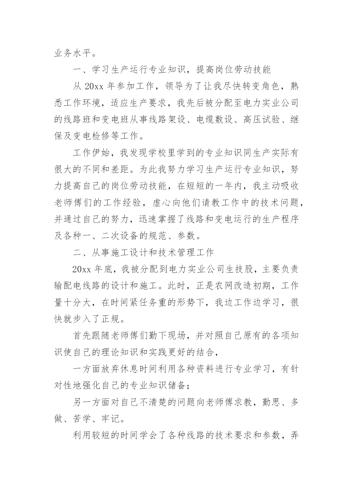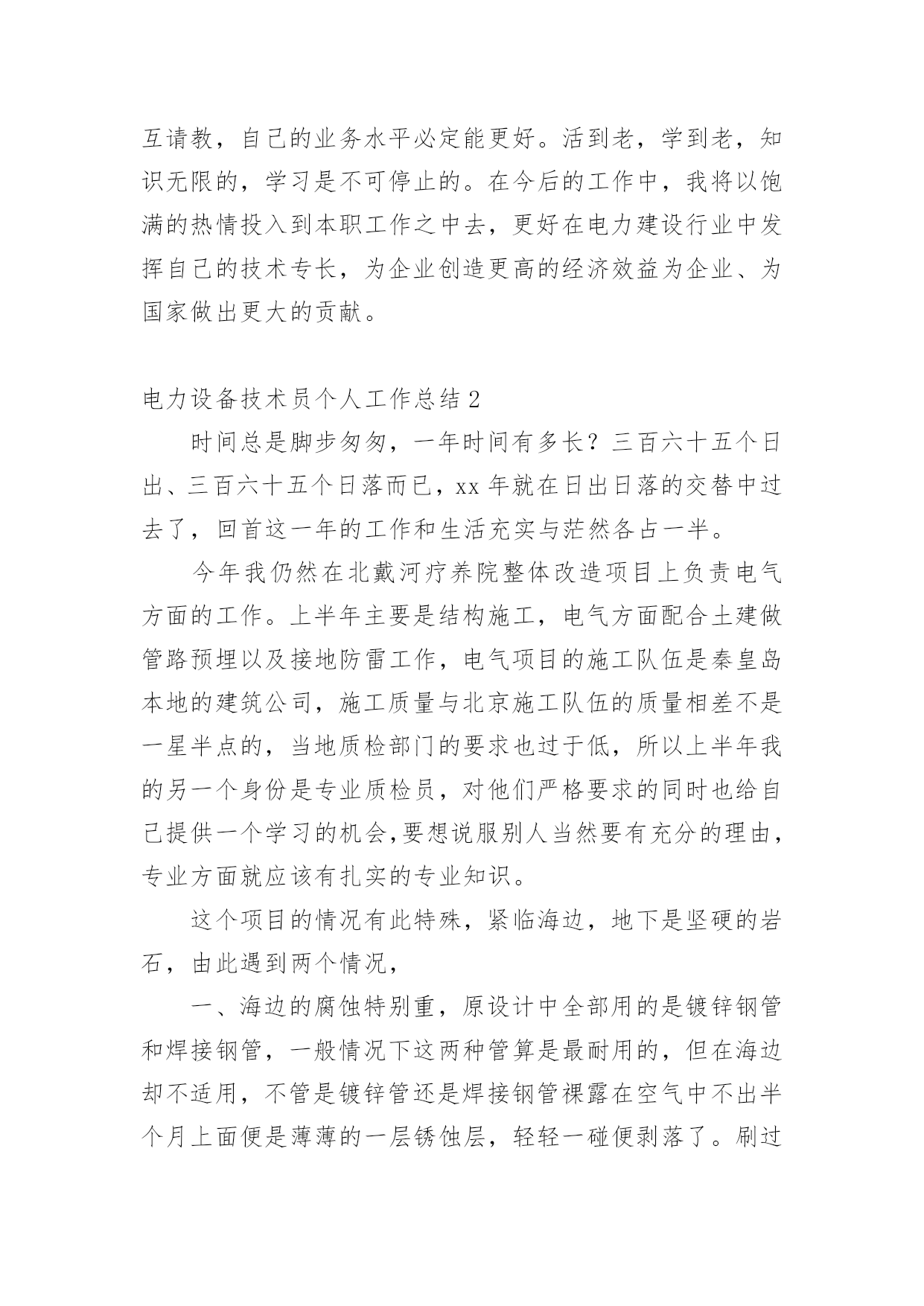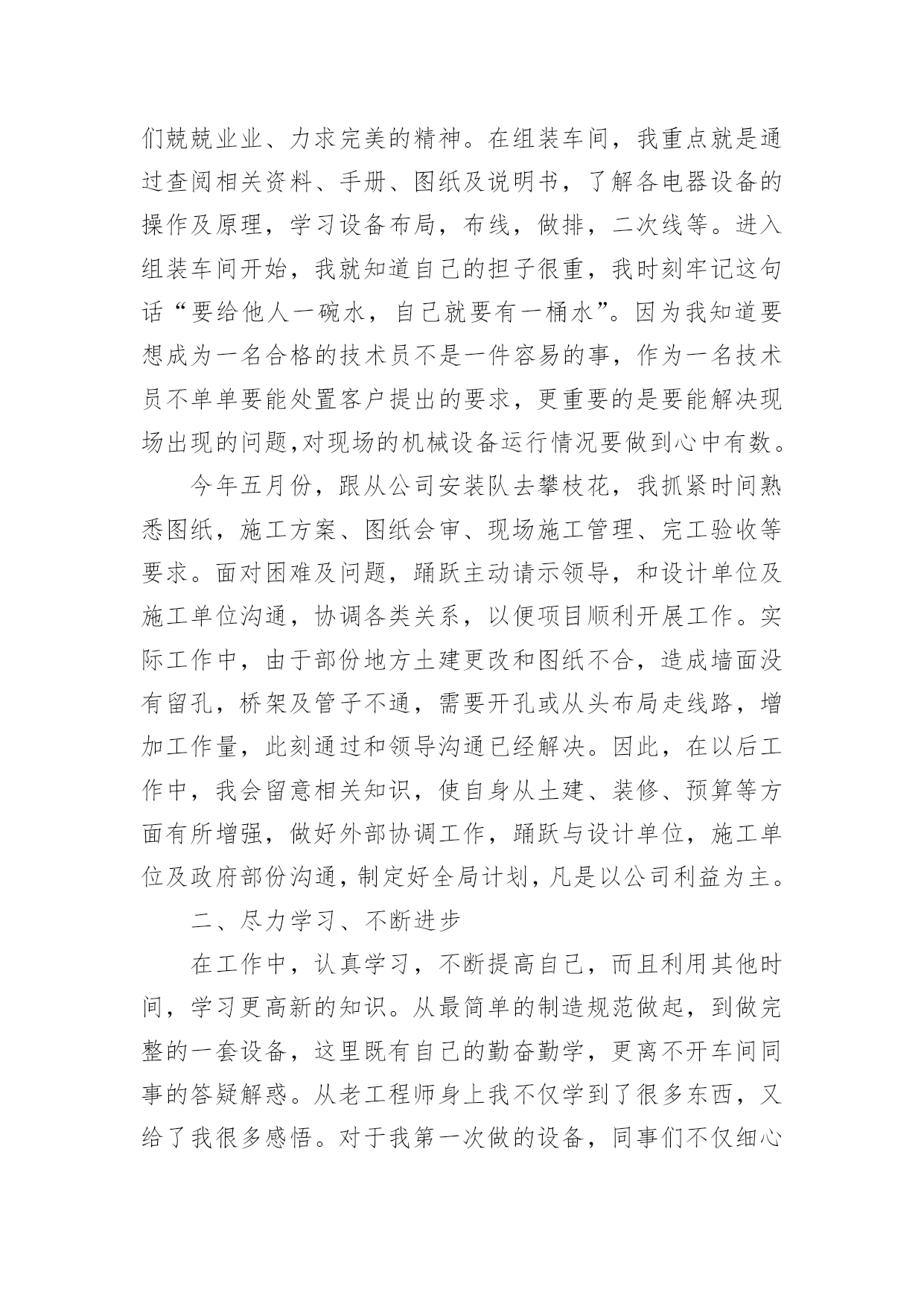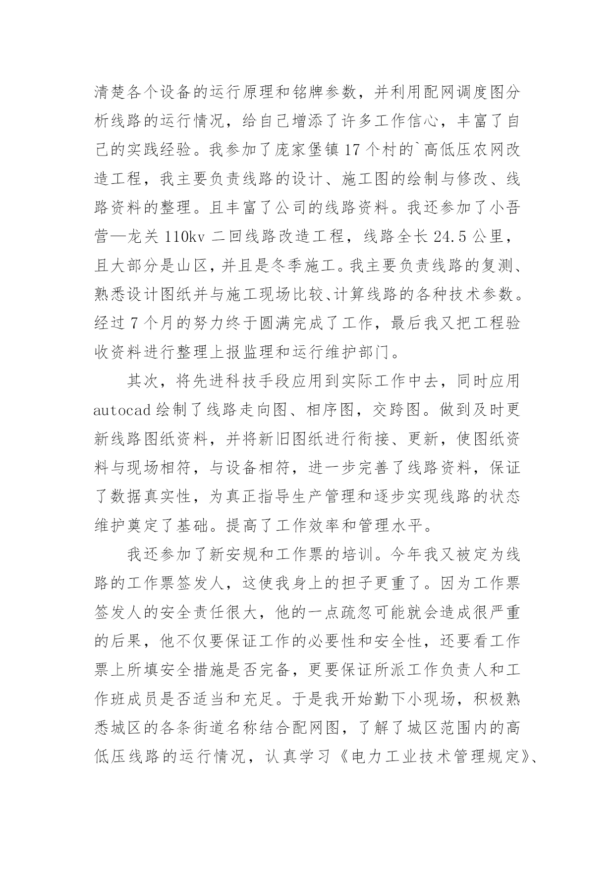 电力设备技术员个人工作总结总结是指对某一阶段的工作、学习或思想中的经验或情况加以总结和概括的书面材料,它可以提升我们发现问题的能力,让我们抽出时间写写总结吧。总结你想好怎么写了吗?下面是小编为大家收集的电力设备技术员个人工作总结,欢迎大家借鉴与参考,希望对大家有所帮助。电力设备技术员个人工作总结1本人于20xx年毕业于华北电力大学,所学专业为供用电工程。在20xx年8月进入电力实业公司参加工作至今。在这五年中,我先后在电力实业公司的线路班、变电班、生技股从事生产一线工作。在各位领导和同事的支持和帮助下,自己的思想、工作、学习等各方面都取得了一定的成绩,个人综合素质也得到了一定的提高,下面就从专业技术角度对我这五年来的工作做一次全面总结:电力企业是一个特殊的行业,它需要职工有良好的自身能力和心理素质,因此我不断学习各种技能,努力学习和掌握电力系统运行方式及其特点,了解全地区的配电网运行情况,同时能根据各类电气设备的需要,掌握相关的电工基础、电工材料、高压工程技术专业知识,能根据现场电气设备运行情况选择运行方式及经济运行方法,根据实际运行经验,正确处理电气系统的设备故障以及系统突发性事故,初步了解班组管理和生产技术管理的基本常识,进一步加强自己的业务水平。一、学习生产运行专业知识,提高岗位劳动技能从20xx年参加工作,领导为了让我尽快转变角色,熟悉工作环境,适应生产要求,我先后被分配至电力实业公司的线路班和变电班从事线路架设、电缆敷设、高压试验、继保及变电检修等工作。工作伊始,我发现学校里学到的专业知识同生产实际有很大的不同和差距。为此我努力学习生产运行专业知识,努力提高自己的岗位劳动技能,在短短的一年内,我主动吸收老师傅们的工作经验,虚心向他们请教工作中的技术问题,并通过自己的努力,迅速掌握了线路和变电运行的生产程序及各种一、二次设备的规范、参数。二、从事施工设计和技术管理工作20xx年底,我被分配到电力实业公司生技股,主要负责输配电线路的设计和施工。此时,正是农网改造初期,工作量十分大,在时间紧任务重的形势下,我边工作边学习,很快就步入了正规。首先跟随老师傅们勤下现场,并对照自己原有的各项知识使自己的理论知识和实践更好的结合,一方面放弃休息时间利用各种资料进行专业学习,有针对性地强化自己的专业知识储备;另一方面对自己不清楚的问题向老师傅求教,勤思、多做、苦学、牢记。利用较短的时间学会了各种线路的技术要求和参数,弄清楚各个设备的运行原理和铭牌参数,并利用配网调度图分析线路的运行情况,给自己增添了许多工作信心,丰富了自己的实践经验。我参加了庞家堡镇17个村的`高低压农网改造工程,我主要负责线路的设计、施工图的绘制与修改、线路资料的整理。且丰富了公司的线路资料。我还参加了小吾营—龙关110kv二回线路改造工程,线路全长24.5公里,且大部分是山区,并且是冬季施工。我主要负责线路的复测、熟悉设计图纸并与施工现场比较、计算线路的各种技术参数。经过7个月的努力终于圆满完成了工作,最后我又把工程验收资料进行整理上报监理和运行维护部门。其次,将先进科技手段应用到实际工作中去,同时应用autocad绘制了线路走向图、相序图,交跨图。做到及时更新线路图纸资料,并将新旧图纸进行衔接、更新,使图纸资料与现场相符,与设备相符,进一步完善了线路资料,保证了数据真实性,为真正指导生产管理和逐步实现线路的状态维护奠定了基础。提高了工作效率和管理水平。我还参加了新安规和工作票的培训。今年我又被定为线路的工作票签发人,这使我身上的担子更重了。因为工作票签发人的安全责任很大,他的一点疏忽可能就会造成很严重的后果,他不仅要保证工作的必要性和安全性,还要看工作票上所填安全措施是否完备,更要保证所派工作负责人和工作班成员是否适当和充足。于是我开始勤下小现场,积极熟悉城区的各条街道名称结合配网图,了解了城区范围内的高低压线路的运行情况,认真学习《电力工业技术管理规定》、《电业安全工作规程》和《电业生产事故调查规程》,熟练填写各种工作票和措施票,并进行危险点控制与分析,为工作票的正确签发奠定了坚实的基础。三、努力学习新知识,用知识武装自己在完成好本职工作的同时,我还不断学习新知识,努力丰富自己。20xx年底我参加了二级建造师的考试,并以优异的成绩取得了国家二级建造师的证书。为了更好的完成这项工作,我重新学习了各种规程、标准、施工和验收规范,按时圆满完成各项工作的同时也充实了自己。总的说来,在这几年来的电力管理工作中,自己利用所学的专业技术知识应用到生产实践中去,并取得了一些成效,具备了一定的技术工作能力,但是仍然存在着许多不足,还有待提高。在今后的工作中,自己要加强学习、克服缺点,力争自己的专业技术水平能够不断提高。更能适应现代化电力建设的需求。以上就是我从事生产运行工