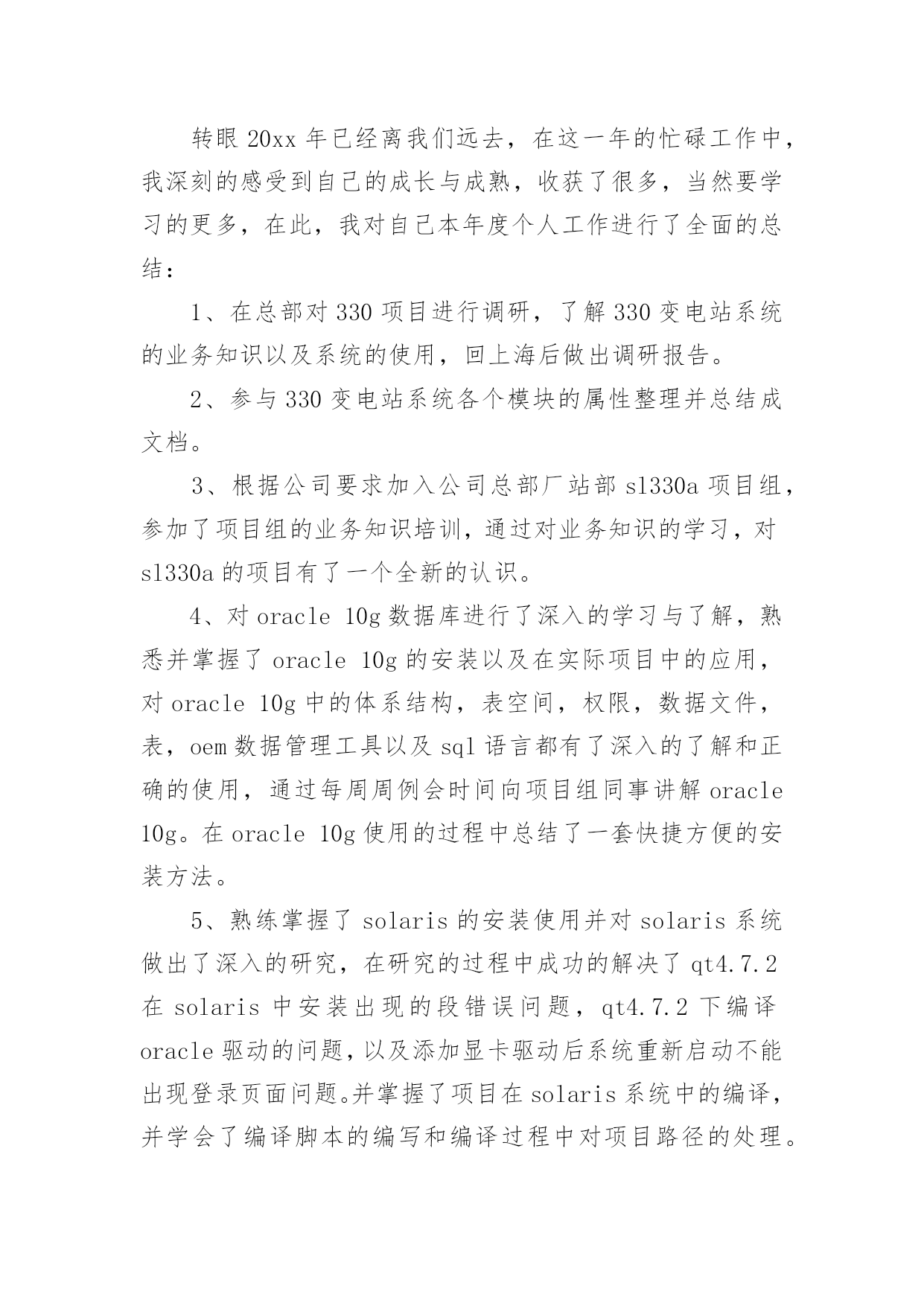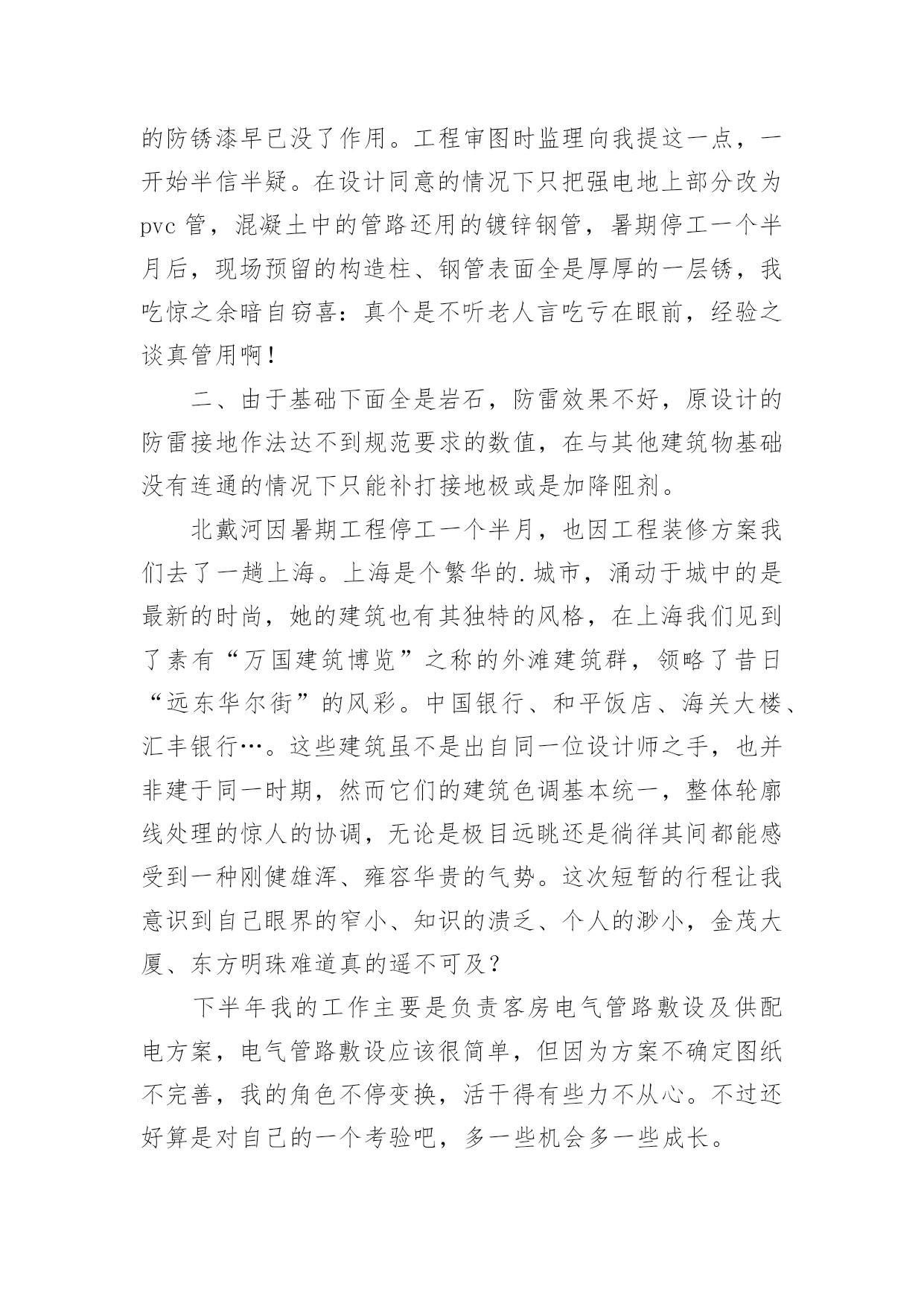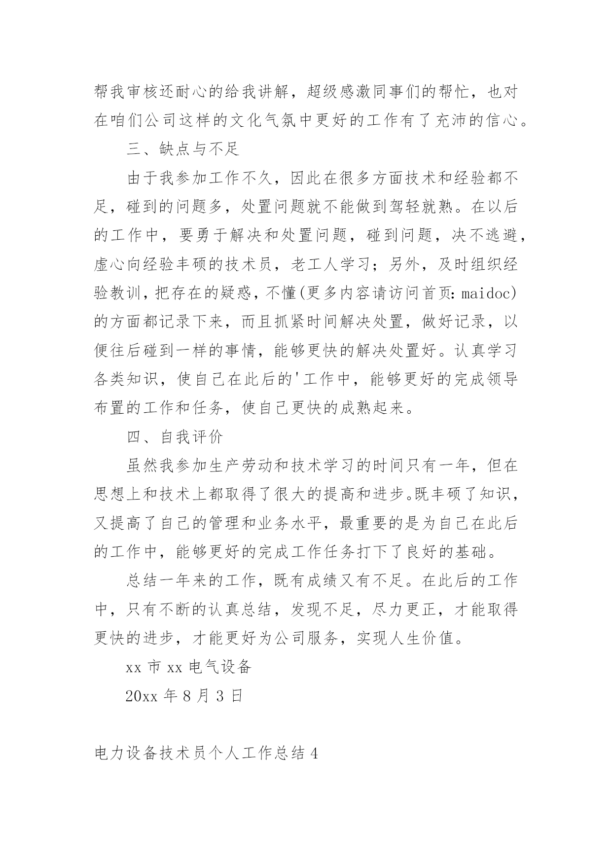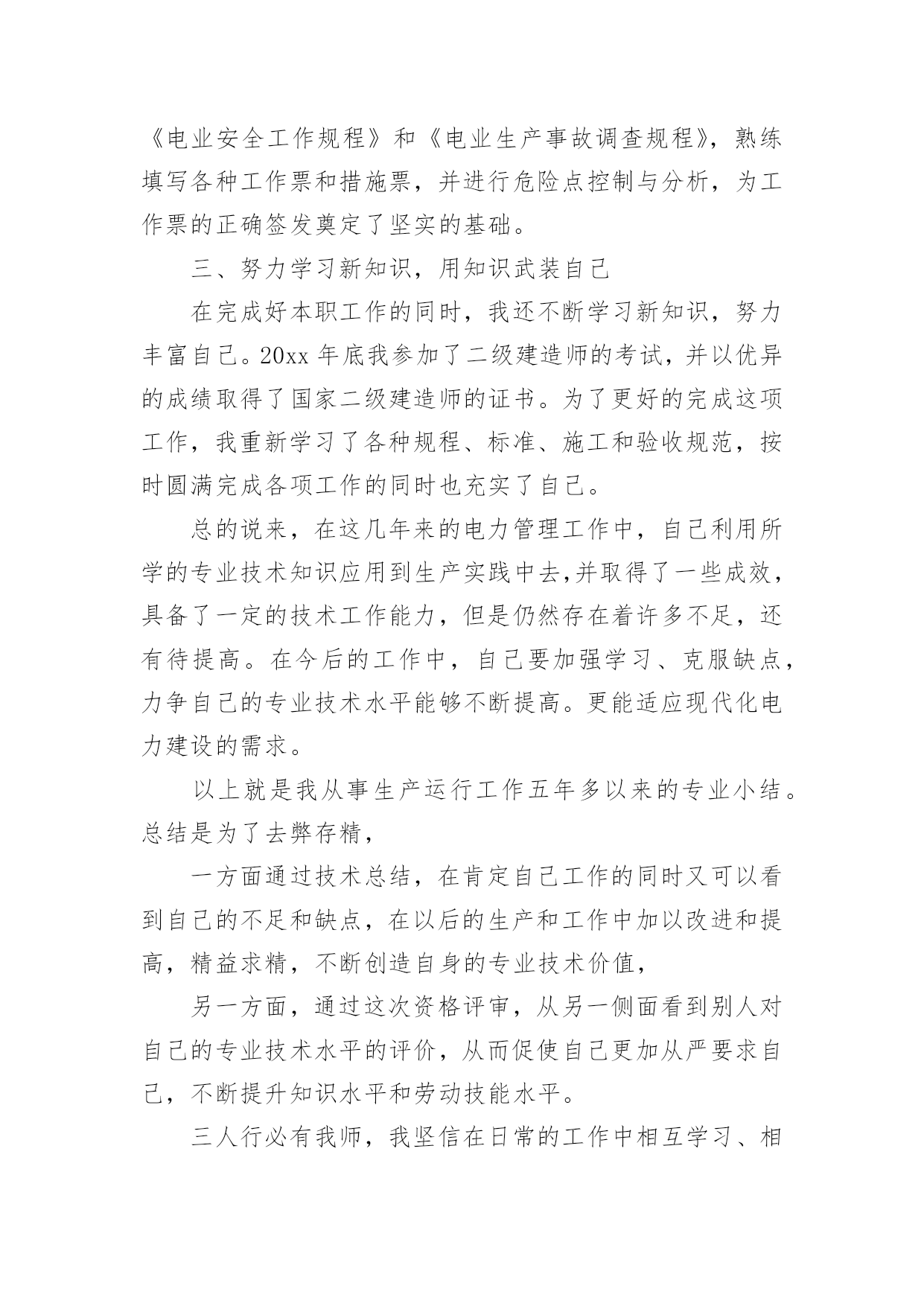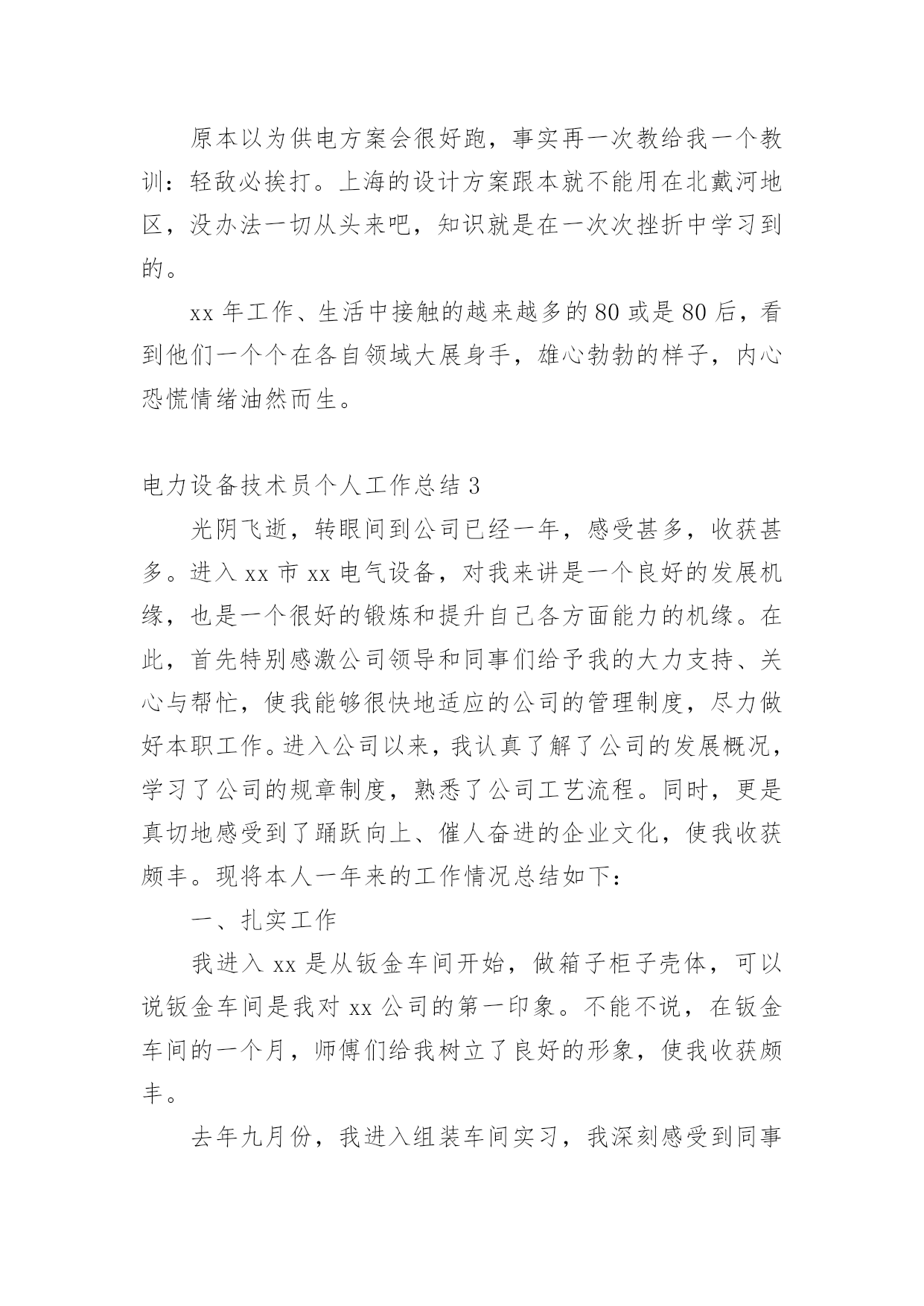 电力设备技术员个人工作总结总结是指对某一阶段的工作、学习或思想中的经验或情况加以总结和概括的书面材料,它可以提升我们发现问题的能力,让我们抽出时间写写总结吧。总结你想好怎么写了吗?下面是小编为大家收集的电力设备技术员个人工作总结,欢迎大家借鉴与参考,希望对大家有所帮助。电力设备技术员个人工作总结1本人于20xx年毕业于华北电力大学,所学专业为供用电工程。在20xx年8月进入电力实业公司参加工作至今。在这五年中,我先后在电力实业公司的线路班、变电班、生技股从事生产一线工作。在各位领导和同事的支持和帮助下,自己的思想、工作、学习等各方面都取得了一定的成绩,个人综合素质也得到了一定的提高,下面就从专业技术角度对我这五年来的工作做一次全面总结:电力企业是一个特殊的行业,它需要职工有良好的自身能力和心理素质,因此我不断学习各种技能,努力学习和掌握电力系统运行方式及其特点,了解全地区的配电网运行情况,同时能根据各类电气设备的需要,掌握相关的电工基础、电工材料、高压工程技术专业知识,能根据现场电气设备运行情况选择运行方式及经济运行方法,根据实际运行经验,正确处理电气系统的设备故障以及系统突发性事故,初步了解班组管理和生产技术管理的基本常识,进一步加强自己的业务水平。一、学习生产运行专业知识,提高岗位劳动技能从20xx年参加工作,领导为了让我尽快转变角色,熟悉工作环境,适应生产要求,我先后被分配至电力实业公司的线路班和变电班从事线路架设、电缆敷设、高压试验、继保及变电检修等工作。工作伊始,我发现学校里学到的专业知识同生产实际有很大的不同和差距。为此我努力学习生产运行专业知识,努力提高自己的岗位劳动技能,在短短的一年内,我主动吸收老师傅们的工作经验,虚心向他们请教工作中的技术问题,并通过自己的努力,迅速掌握了线路和变电运行的生产程序及各种一、二次设备的规范、参数。二、从事施工设计和技术管理工作20xx年底,我被分配到电力实业公司生技股,主要负责输配电线路的设计和施工。此时,正是农网改造初期,工作量十分大,在时间紧任务重的形势下,我边工作边学习,很快就步入了正规。首先跟随老师傅们勤下现场,并对照自己原有的各项知识使自己的理论知识和实践更好的结合,一方面放弃休息时间利用各种资料进行专业学习,有针对性地强化自己的专业知识储备;另一方面对自己不清楚的问题向老师傅求教,勤思、多做、苦学、牢记。利用较短的时间学会了各种线路的技术要求和参数,弄清楚各个设备的运行原理和铭牌参数,并利用配网调度图分析线路的运行情况,给自己增添了许多工作信心,丰富了自己的实践经验。我参加了庞家堡镇17个村的`高低压农网改造工程,我主要负责线路的设计、施工图的绘制与修改、线路资料的整理。且丰富了公司的线路资料。我还参加了小吾营—龙关110kv二回线路改造工程,线路全长24.5公里,且大部分是山区,并且是冬季施工。我主要负责线路的复测、熟悉设计图纸并与施工现场比较、计算线路的各种技术参数。经过7个月的努力终于圆满完成了工作,最后我又把工程验收资料进行整理上报监理和运行维护部门。其次,将先进科技手段应用到实际工作中去,同时应用autocad绘制了线路走向图、相序图,交跨图。做到及时更新线路图纸资料,并将新旧图纸进行衔接、更新,使图纸资料与现场相符,与设备相符,进一步完善了线路资料,保证了数据真实性,为真正指导生产管理和逐步实现线路的状态维护奠定了基础。提高了工作效率和管理水平。我还参加了新安规和工作票的培训。今年我又被定为线路的工作票签发人,这使我身上的担子更重了。因为工作票签发人的安全责任很大,他的一点疏忽可能就会造成很严重的后果,他不仅要保证工作的必要性和安全性,还要看工作票上所填安全措施是否完备,更要保证所派工作负责人和工作班成员是否适当和充足。于是我开始勤下小现场,积极熟悉城区的各条街道名称结合配网图,了解了城区范围内的高低压线路的运行情况,认真学习《电力工业技术管理规定》、《电业安全工作规程》和《电业生产事故调查规程》,熟练填写各种工作票和措施票,并进行危险点控制与分析,为工作票的正确签发奠定了坚实的基础。三、努力学习新知识,用知识武装自己在完成好本职工作的同时,我还不断学习新知识,努力丰富自己。20xx年底我参加了二级建造师的考试,并以优异的成绩取得了国家二级建造师的证书。为了更好的完成这项工作,我重新学习了各种规程、标准、施工和验收规范,按时圆满完成各项工作的同时也充实了自己。总的说来,在这几年来的电力管理工作中,自己利用所学的专业技术知识应用到生产实践中去,并取得了一些成效,具备了一定的技术工作能力,但是仍然存在着许多不足,还有待提高。在今后的工作中,自己要加强学习、克服缺点,力争自己的专业技术水平能够不断提高。更能适应现代化电力建设的需求。以上就是我从事生产运行工