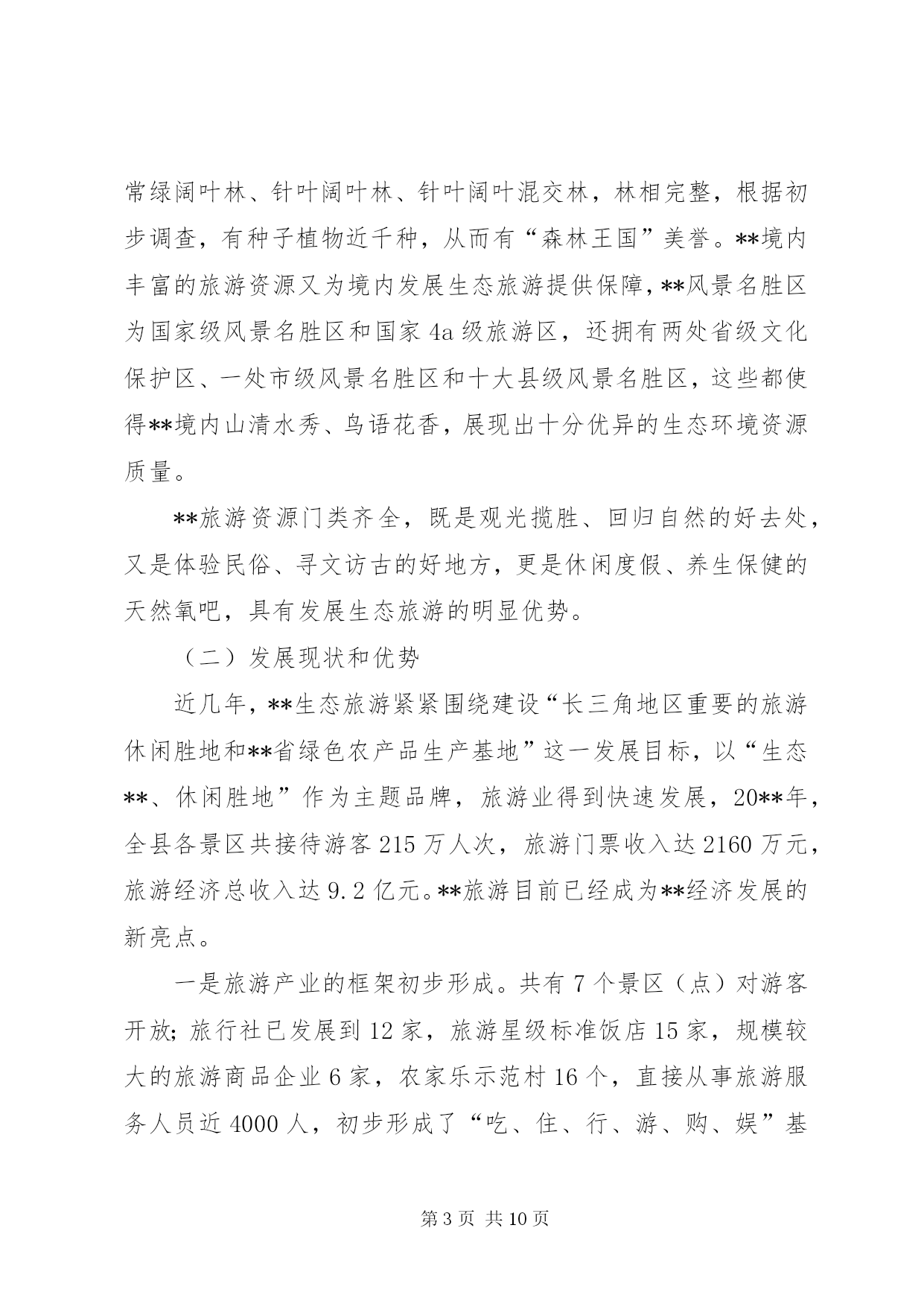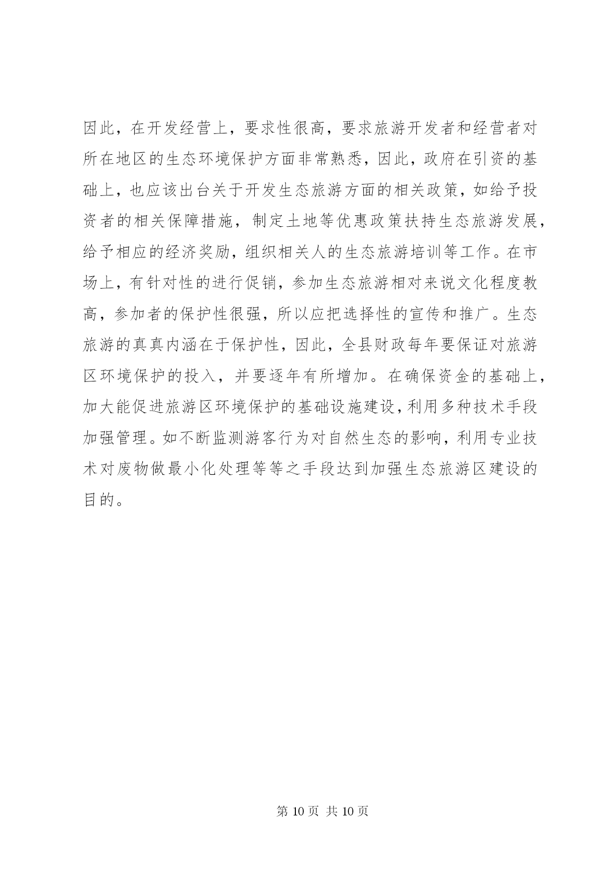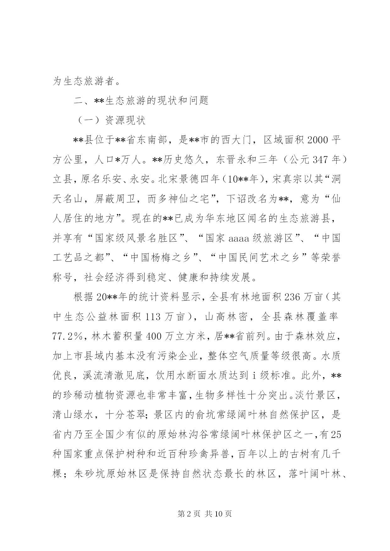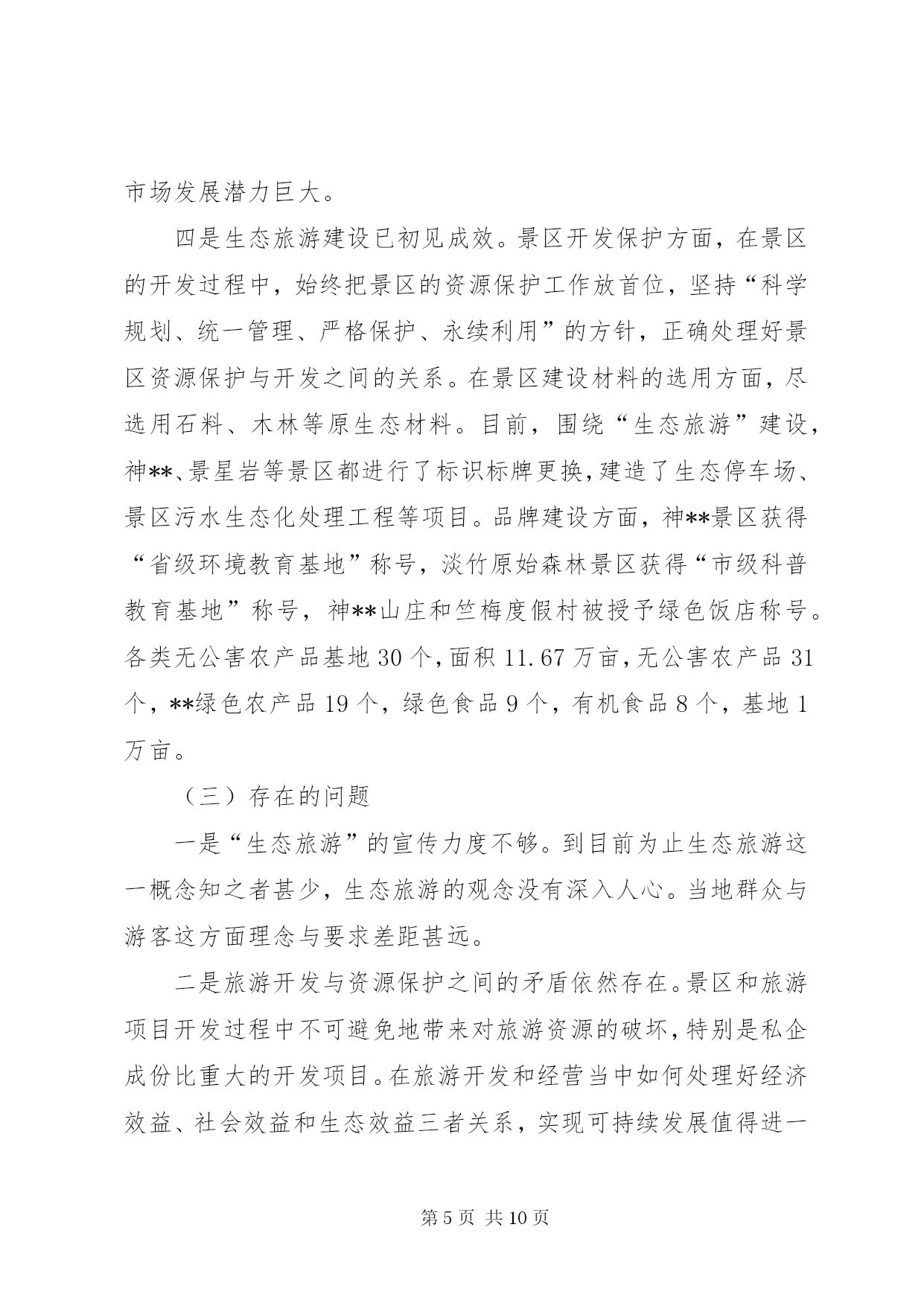 第PAGE\*Arabic\*MERGEFORMAT10页共NUMPAGES\*MERGEFORMAT10页旅游生态发展调研报告生态旅游作为常规旅游的一种特殊形式,游客在观赏和游览古今文化的同时,置身于自然的环境中尽情的去欣赏风景和野生动植物,而且强调被观览的景物不应受到损失。并且,在生态旅游的过程中,必须使旅游者受到生动具体的生态教育,在全球人类面临生存环境危机的背景下,随着人们环境意识的觉醒,绿色运动及绿色消费席卷全球,生态旅游作为一种新的旅游形态,已经成为国际上近年来新兴的热点旅游项目。一、生态旅游的特点一是保护性。生态旅游是针对传统旅游活动对旅游资源和环境的负面影响而提出的,保护性是它区别与传统旅游的最大特点。生态旅游保护性的实质是要求旅游者和旅游业约束自己的行为,以保护旅游资源和旅游环境。二是专业性。生态旅游具有较高的科学文化内涵,这就要求旅游设施,旅游项目,旅游路线,旅游服务的设计和管理均要体现出很强的专业性,以使游客在较短的时间内获得回归大自然的精神享受和满足,启发和提高游客热爱和保护大自然意识,进而自觉地保护旅游资源和环境。三是普及性。在我国生态旅游的普及性不仅体现在生态旅游者的普及,也体现在旅游资源的普及。生态旅游是建立在传统旅游基础上的。因此,普通的工人、农民、职工、学生等都可以成为生态旅游者。二、**生态旅游的现状和问题(一)资源现状**县位于**省东南部,是**市的西大门,区域面积2000平方公里,人口*万人。**历史悠久,东晋永和三年(公元347年)立县,原名乐安、永安。北宋景德四年(10**年),宋真宗以其“洞天名山,屏蔽周卫,而多神仙之宅”,下诏改名为**,意为“仙人居住的地方”。现在的**已成为华东地区闻名的生态旅游县,并享有“国家级风景名胜区”、“国家aaaa级旅游区”、“中国工艺品之都”、“中国杨梅之乡”、“中国民间艺术之乡”等荣誉称号,社会经济得到稳定、健康和持续发展。根据20**年的统计资料显示,全县有林地面积236万亩(其中生态公益林面积113万亩),山高林密,全县森林覆盖率77.2%,林木蓄积量400万立方米,居**省前列。由于森林效应,加上市县域内基本没有污染企业,整体空气质量等级很高。水质优良,溪流清澈见底,饮用水断面水质达到i级标准。此外,**的珍稀动植物资源也非常丰富,生物多样性十分突出。淡竹景区,清山绿水,十分苍翠;景区内的俞坑常绿阔叶林自然保护区,是省内乃至全国少有似的原始林沟谷常绿阔叶林保护区之一,有25种国家重点保护树种和近百种珍禽异兽,百年以上的古树有几千棵;朱砂坑原始林区是保持自然状态最长的林区,落叶阔叶林、常绿阔叶林、针叶阔叶林、针叶阔叶混交林,林相完整,根据初步调查,有种子植物近千种,从而有“森林王国”美誉。**境内丰富的旅游资源又为境内发展生态旅游提供保障,**风景名胜区为国家级风景名胜区和国家4a级旅游区,还拥有两处省级文化保护区、一处市级风景名胜区和十大县级风景名胜区,这些都使得**境内山清水秀、鸟语花香,展现出十分优异的生态环境资源质量。**旅游资源门类齐全,既是观光揽胜、回归自然的好去处,又是体验民俗、寻文访古的好地方,更是休闲度假、养生保健的天然氧吧,具有发展生态旅游的明显优势。(二)发展现状和优势近几年,**生态旅游紧紧围绕建设“长三角地区重要的旅游休闲胜地和**省绿色农产品生产基地”这一发展目标,以“生态**、休闲胜地”作为主题品牌,旅游业得到快速发展,20**年,全县各景区共接待游客215万人次,旅游门票收入达2160万元,旅游经济总收入达9.2亿元。**旅游目前已经成为**经济发展的新亮点。一是旅游产业的框架初步形成。共有7个景区(点)对游客开放;旅行社已发展到12家,旅游星级标准饭店15家,规模较大的旅游商品企业6家,农家乐示范村16个,直接从事旅游服务人员近4000人,初步形成了“吃、住、行、游、购、娱”基本配套的旅游服务体系。目前旅游产业呈现出良好的发展势头,一些具有潜力和特色的旅游产品,也正在积极地筹划、建设和逐步开放之中,旅游整体实力不断壮大。二是基础设施正逐步改善。交通方面,今年称得上是**交通的“翻身年”。台金高速公路**东段于20**年底建成通车,**告别了不通高速公路的历史。目前,**有台金、诸永两条高速公路,一条35省道干线和乡村康庄工程、乡道硬化等多项主要工程在建,道路总长700多公里,计划总投资75亿元,是**有史以来交通建设投资最多的时期。高速公路修通后,**的区位条件将得到极大的改善。城市建设和基础设施建设方面,**县坚持“拓东—改中—扩西”的总要求,继续拉开城市框架,加快县域中心城市建设。目前,作为城市主干道的西二路、西三路已完成了路基工程,计划于今年完工。西门片区拆迁改造工程进展顺利