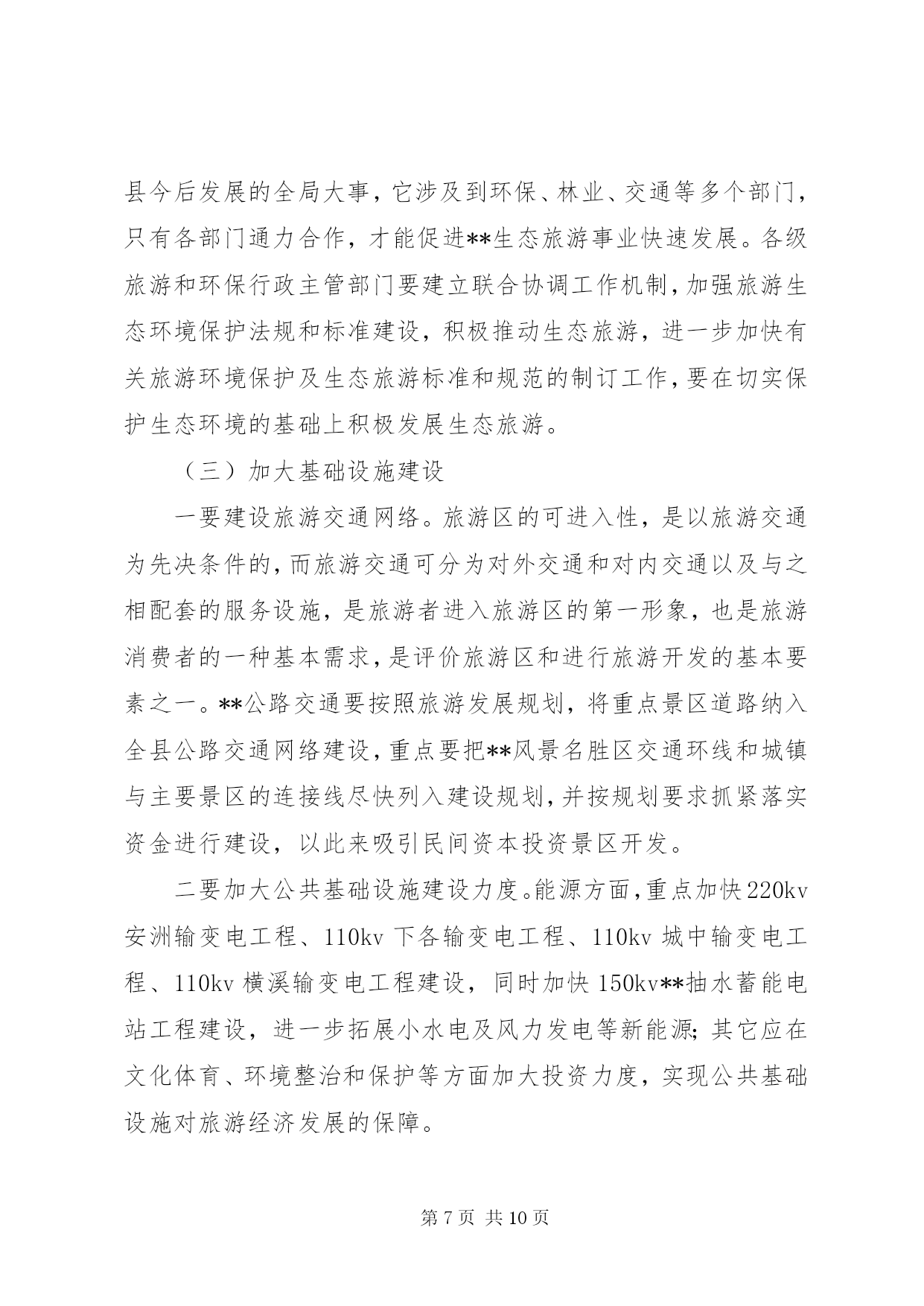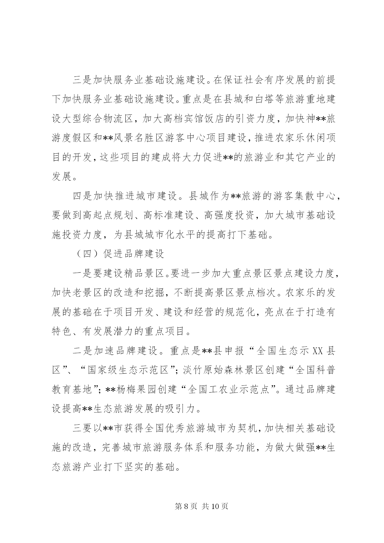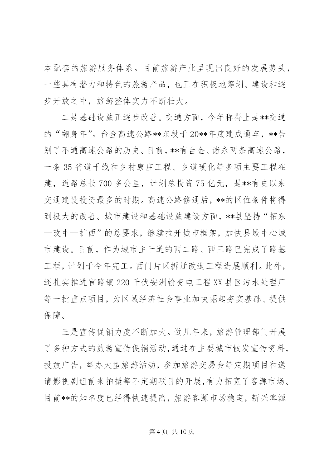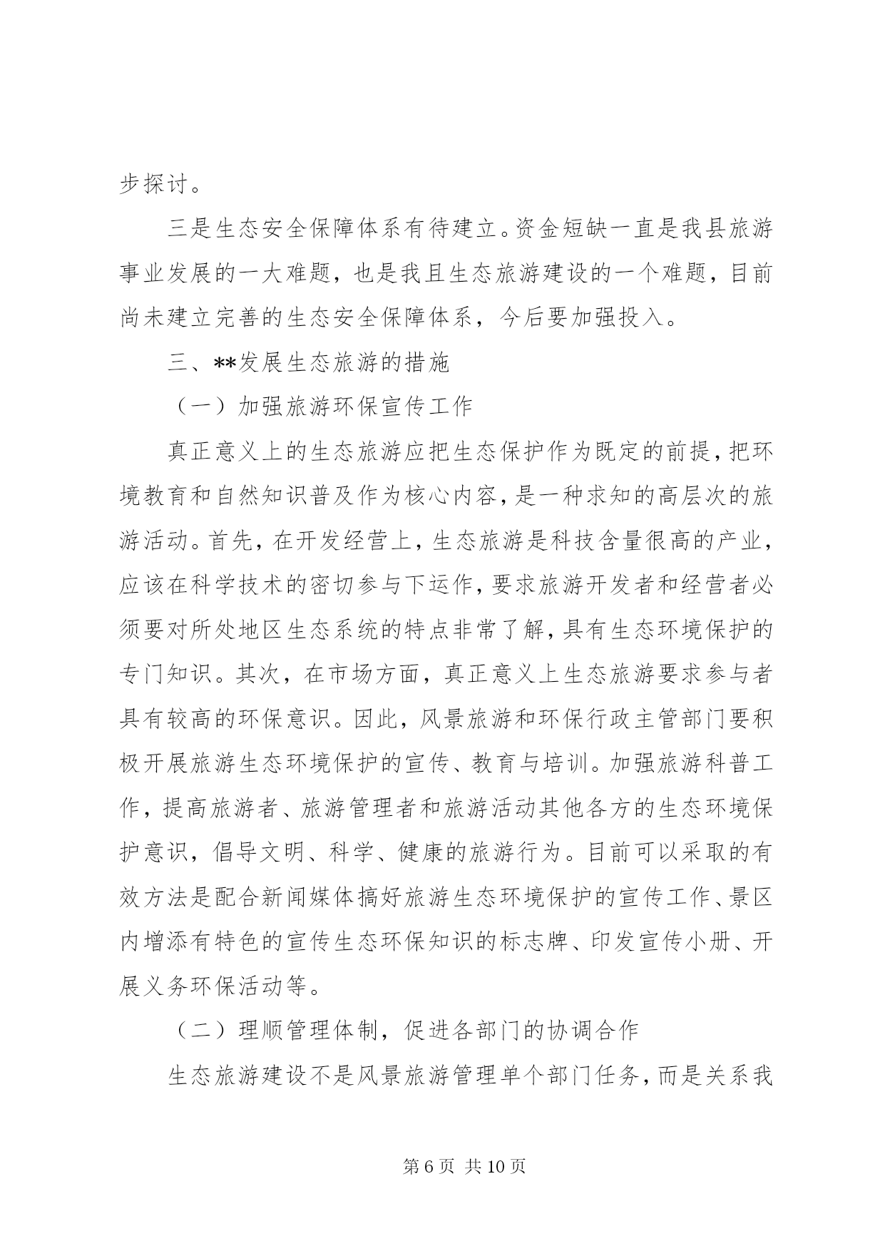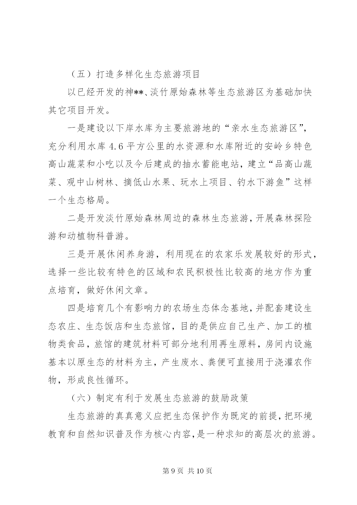 第PAGE\*Arabic\*MERGEFORMAT10页共NUMPAGES\*MERGEFORMAT10页旅游生态发展调研报告生态旅游作为常规旅游的一种特殊形式,游客在观赏和游览古今文化的同时,置身于自然的环境中尽情的去欣赏风景和野生动植物,而且强调被观览的景物不应受到损失。并且,在生态旅游的过程中,必须使旅游者受到生动具体的生态教育,在全球人类面临生存环境危机的背景下,随着人们环境意识的觉醒,绿色运动及绿色消费席卷全球,生态旅游作为一种新的旅游形态,已经成为国际上近年来新兴的热点旅游项目。一、生态旅游的特点一是保护性。生态旅游是针对传统旅游活动对旅游资源和环境的负面影响而提出的,保护性是它区别与传统旅游的最大特点。生态旅游保护性的实质是要求旅游者和旅游业约束自己的行为,以保护旅游资源和旅游环境。二是专业性。生态旅游具有较高的科学文化内涵,这就要求旅游设施,旅游项目,旅游路线,旅游服务的设计和管理均要体现出很强的专业性,以使游客在较短的时间内获得回归大自然的精神享受和满足,启发和提高游客热爱和保护大自然意识,进而自觉地保护旅游资源和环境。三是普及性。在我国生态旅游的普及性不仅体现在生态旅游者的普及,也体现在旅游资源的普及。生态旅游是建立在传统旅游基础上的。因此,普通的工人、农民、职工、学生等都可以成为生态旅游者。二、**生态旅游的现状和问题(一)资源现状**县位于**省东南部,是**市的西大门,区域面积2000平方公里,人口*万人。**历史悠久,东晋永和三年(公元347年)立县,原名乐安、永安。北宋景德四年(10**年),宋真宗以其“洞天名山,屏蔽周卫,而多神仙之宅”,下诏改名为**,意为“仙人居住的地方”。现在的**已成为华东地区闻名的生态旅游县,并享有“国家级风景名胜区”、“国家aaaa级旅游区”、“中国工艺品之都”、“中国杨梅之乡”、“中国民间艺术之乡”等荣誉称号,社会经济得到稳定、健康和持续发展。根据20**年的统计资料显示,全县有林地面积236万亩(其中生态公益林面积113万亩),山高林密,全县森林覆盖率77.2%,林木蓄积量400万立方米,居**省前列。由于森林效应,加上市县域内基本没有污染企业,整体空气质量等级很高。水质优良,溪流清澈见底,饮用水断面水质达到i级标准。此外,**的珍稀动植物资源也非常丰富,生物多样性十分突出。淡竹景区,清山绿水,十分苍翠;景区内的俞坑常绿阔叶林自然保护区,是省内乃至全国少有似的原始林沟谷常绿阔叶林保护区之一,有25种国家重点保护树种和近百种珍禽异兽,百年以上的古树有几千棵;朱砂坑原始林区是保持自然状态最长的林区,落叶阔叶林、常绿阔叶林、针叶阔叶林、针叶阔叶混交林,林相完整,根据初步调查,有种子植物近千种,从而有“森林王国”美誉。**境内丰富的旅游资源又为境内发展生态旅游提供保障,**风景名胜区为国家级风景名胜区和国家4a级旅游区,还拥有两处省级文化保护区、一处市级风景名胜区和十大县级风景名胜区,这些都使得**境内山清水秀、鸟语花香,展现出十分优异的生态环境资源质量。**旅游资源门类齐全,既是观光揽胜、回归自然的好去处,又是体验民俗、寻文访古的好地方,更是休闲度假、养生保健的天然氧吧,具有发展生态旅游的明显优势。(二)发展现状和优势近几年,**生态旅游紧紧围绕建设“长三角地区重要的旅游休闲胜地和**省绿色农产品生产基地”这一发展目标,以“生态**、休闲胜地”作为主题品牌,旅游业得到快速发展,20**年,全县各景区共接待游客215万人次,旅游门票收入达2160万元,旅游经济总收入达9.2亿元。**旅游目前已经成为**经济发展的新亮点。一是旅游产业的框架初步形成。共有7个景区(点)对游客开放;旅行社已发展到12家,旅游星级标准饭店15家,规模较大的旅游商品企业6家,农家乐示范村16个,直接从事旅游服务人员近4000人,初步形成了“吃、住、行、游、购、娱”基本配套的旅游服务体系。目前旅游产业呈现出良好的发展势头,一些具有潜力和特色的旅游产品,也正在积极地筹划、建设和逐步开放之中,旅游整体实力不断壮大。二是基础设施正逐步改善。交通方面,今年称得上是**交通的“翻身年”。台金高速公路**东段于20**年底建成通车,**告别了不通高速公路的历史。目前,**有台金、诸永两条高速公路,一条35省道干线和乡村康庄工程、乡道硬化等多项主要工程在建,道路总长700多公里,计划总投资75亿元,是**有史以来交通建设投资最多的时期。高速公路修通后,**的区位条件将得到极大的改善。城市建设和基础设施建设方面,**县坚持“拓东—改中—扩西”的总要求,继续拉开城市框架,加快县域中心城市建设。目前,作为城市主干道的西二路、西三路已完成了路基工程,计划于今年完工。西门片区拆迁改造工程进展顺利