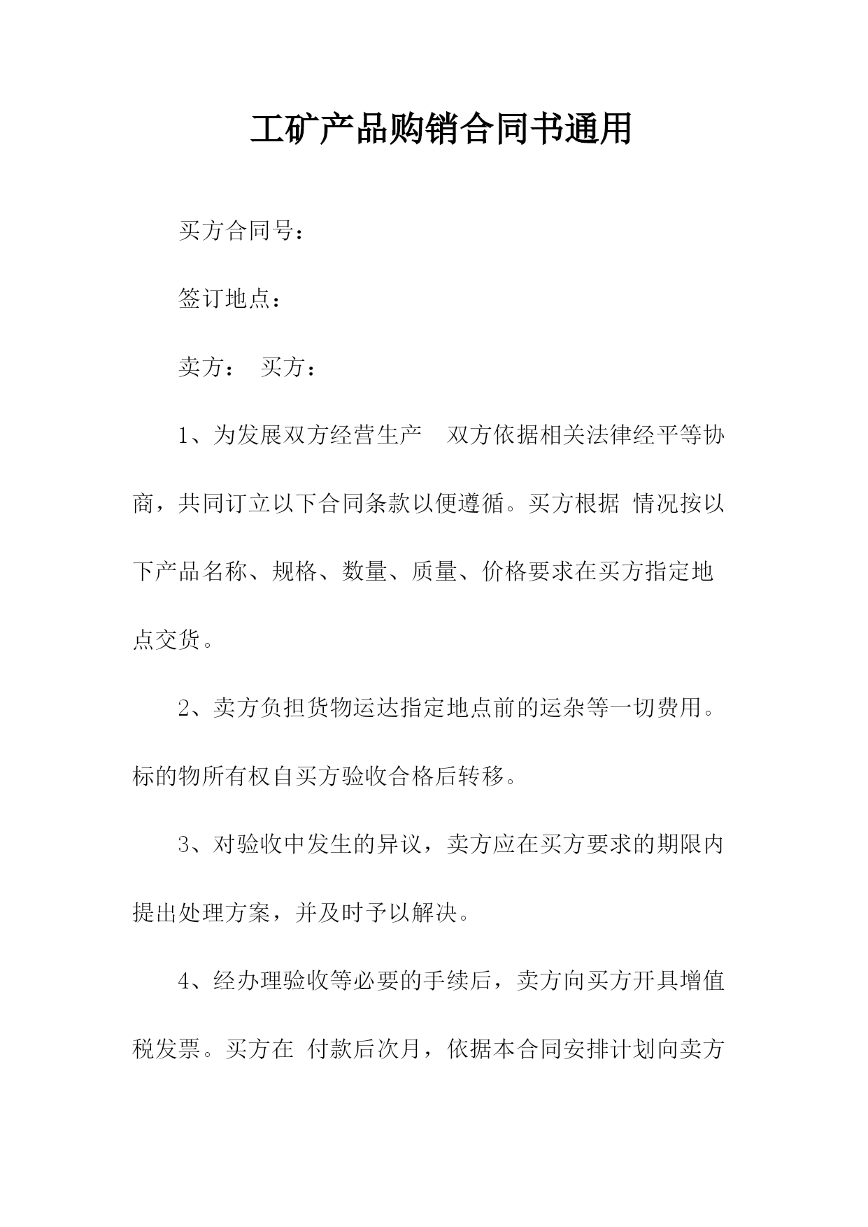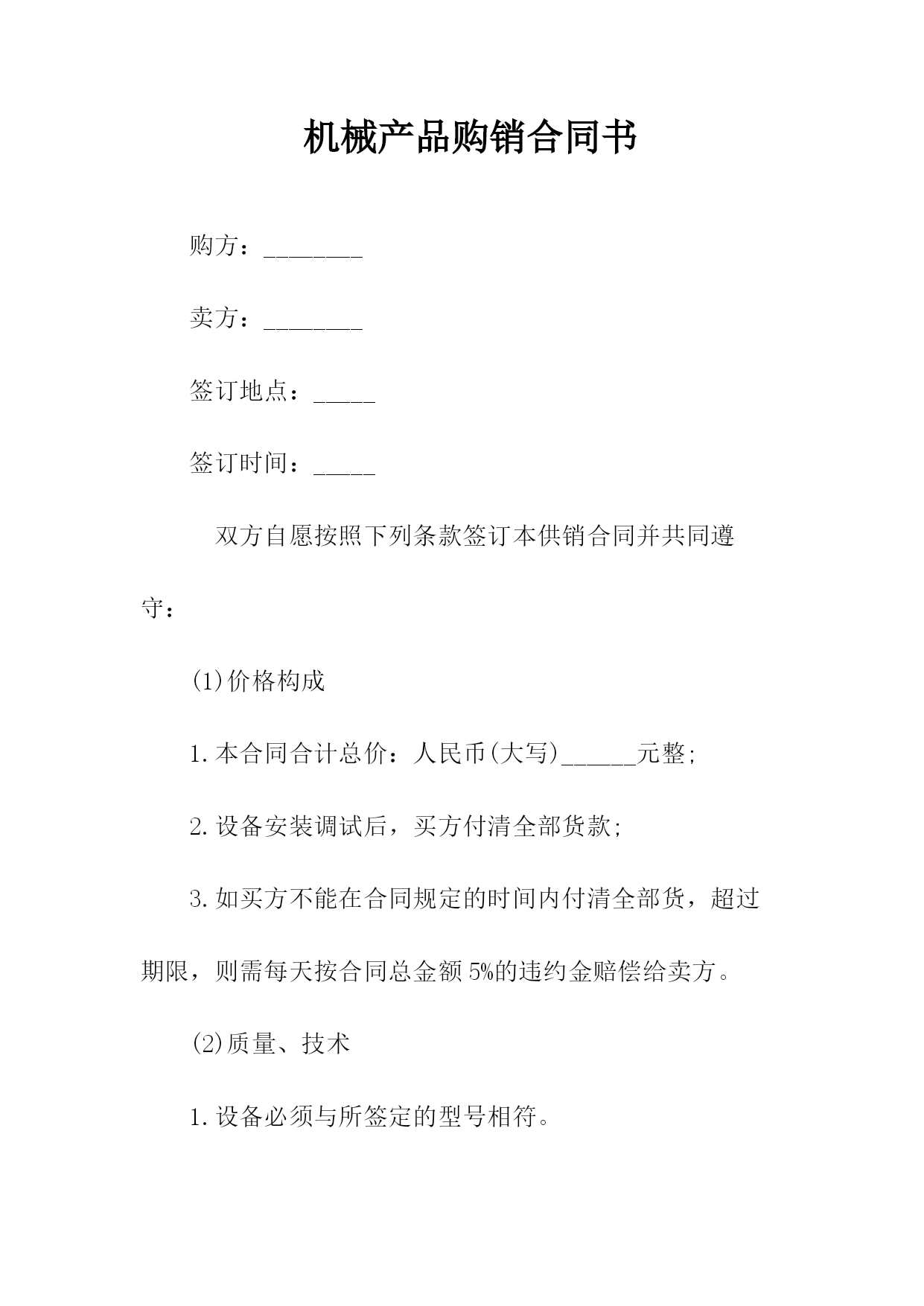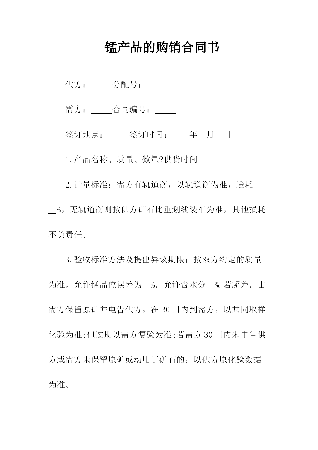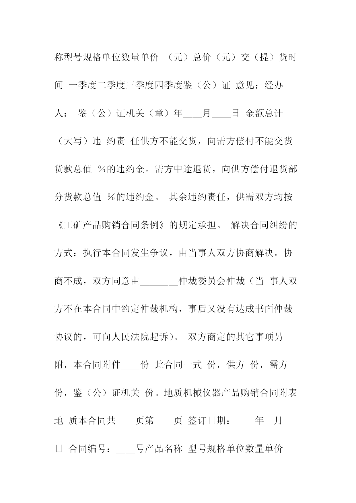 机械购销合同相关合同通用版83;标准产品购销合同书表格通用版83;酒水购销标准版标准合同书;电缆购销标准版标准合同书;电脑计算机产品购销标准版标准合同书;服装购销标准版标准合同书;农副产品购销合同依照《民法典》和《工矿产品购销合同条例》,经双方协商一致,签订本合同并严肃执行。本合同共__页第__页签订地点____签订时间__年__月__日合同编号:____号需方代表人供方代表人订货单位XX编码供货单位XX编码结算单位电报挂号结算单位电报挂号通讯地址电话通讯地址电报挂号结算帐号结算电话结算方式结算期限到站整车代签合同单位代表帐号收货单位零担记事质量标准:验收方法及期限:运杂费需方承负:包装费用及要求:通讯地址交货方式供方运输方式交(提)货地点需方产品名称型号规格单位数量单价(元)总价(元)交(提)货时间一季度二季度三季度四季度鉴(公)证意见:经办人:鉴(公)证机关(章)年____月____日金额总计(大写)违约责任供方不能交货,向需方偿付不能交货货款总值%的违约金。需方中途退货,向供方偿付退货部分货款总值%的违约金。其余违约责任,供需双方均按《工矿产品购销合同条例》的规定承担。解决合同纠纷的方式:执行本合同发生争议,由当事人双方协商解决。协商不成,双方同意由____仲裁委员会仲裁(当事人双方不在本合同中约定仲裁机构,事后又没有达成书面仲裁协议的,可向人民法院起诉)。双方商定的其它事项另附,本合同附件__份此合同一式份,供方份,需方份,鉴(公)证机关份。地质机械仪器产品购销合同附表地质本合同共__页第__页签订日期:__年_月_日合同编号:__号产品名称型号规格单位数量单价(元)总价(元)交(提)货时间备注一季度二季度三季度四季度颁布单位:国家工商管理局经济合同司颁布____日期:1991返机械产品购销合同书购方:________卖方:________签订地点:_____签订时间:_____双方自愿按照下列条款签订本供销合同并共同遵守:(1)价格构成1.本合同合计总价:人民币(大写)______元整;2.设备安装调试后,买方付清全部货款;3.如买方不能在合同规定的时间内付清全部货,超过期限,则需每天按合同总金额5%的违约金赔偿给卖方。(2)质量、技术1.设备必须与所签定的型号相符。2.符合制造厂家的出厂标准。(3)供货方式卖方负责运输费用,并按买方约定时间送到指定位置。(4)检验和交接设备抵达和拆包时,双方须派代表在现场清点检验,签署并记录在案。(5)安装和培训1.卖方提供要求,买方负责装修水,电及其他所需环境要求。2.卖方负责在国内的设备安装、调试及操作人员的培训。(6)售后服务:以上设备免费保修一年,终身维护。(备注:买方需使用卖方指定的耗材,否则,由此产生的机器故障不在保修范围内。)(7)解决合同纠纷的方式合同签订后,未经双方同意不得撤消合同,如有未尽事宜双方可协商解决,双方协商或调节不成时,由______仲裁委员会仲裁。(8)本合同一式两份,双方各执一份,自双方签字后生效。买方(盖章):______卖方(盖章):______代表人(签字):_____代表人(签字):_____签署日期:_____签署日期:_____锰产品的购销合同书供方:_____分配号:_____需方:_____合同编号:_____签订地点:_____签订时间:____年__月__日1.产品名称、质量、数量?供货时间2.计量标准:需方有轨道衡,以轨道衡为准,途耗__%,无轨道衡则按供方矿石比重划线装车为准,其他损耗不负责任。3.验收标准方法及提出异议期限:按双方约定的质量为准,允许锰品位误差为__%,允许含水分__%.若超差,由需方保留原矿并电告供方,在30日内到需方,以共同取样化验为准;但过期以需方复验为准;若需方30日内未电告供方或需方未保留原矿或动用了矿石的,以供方原化验数据为准。4.运输方式及其费用负担:运输由供方代办到需方指定火车站。发车后,在__小时内电告需方:货物品种、数量、质量(猛、铁、磷)车号、发车日期等。短途运杂费每吨__元,火车运杂费凭铁路运单结算,每吨收服务费__元(交省锰矿公司)以上费用均由需方负担。5.价格:锰矿石按国家物价局、冶金工业部__规定执行,富猛渣按___规定执行,若国家价格变动,按新文件规定执行。6.结算方式及期限:供方托收承付,货到需方15天内付款(包括其他几项承付费用)。7.违约责任:供方如有特殊原因不能及时供货,必须提前一个半月通知需方,否则按未发部分货款总额的1%承付违约金,需方不按时付款,按每日万分之___承付滞纳金。8.解决合同纠纷的方式:双方发生纠纷,协商解决。协调不成,向仲裁机关申请仲裁或向人民法院起诉。(两者任选一)9.其他约定事项:供方:___________需方:______