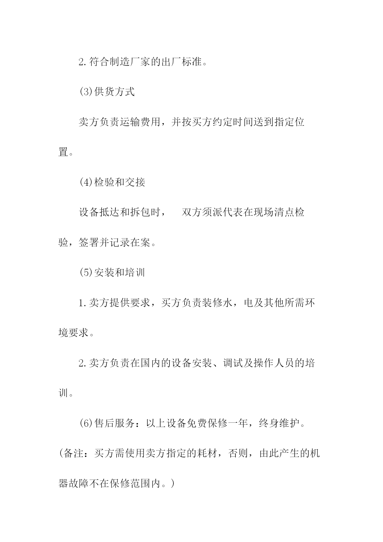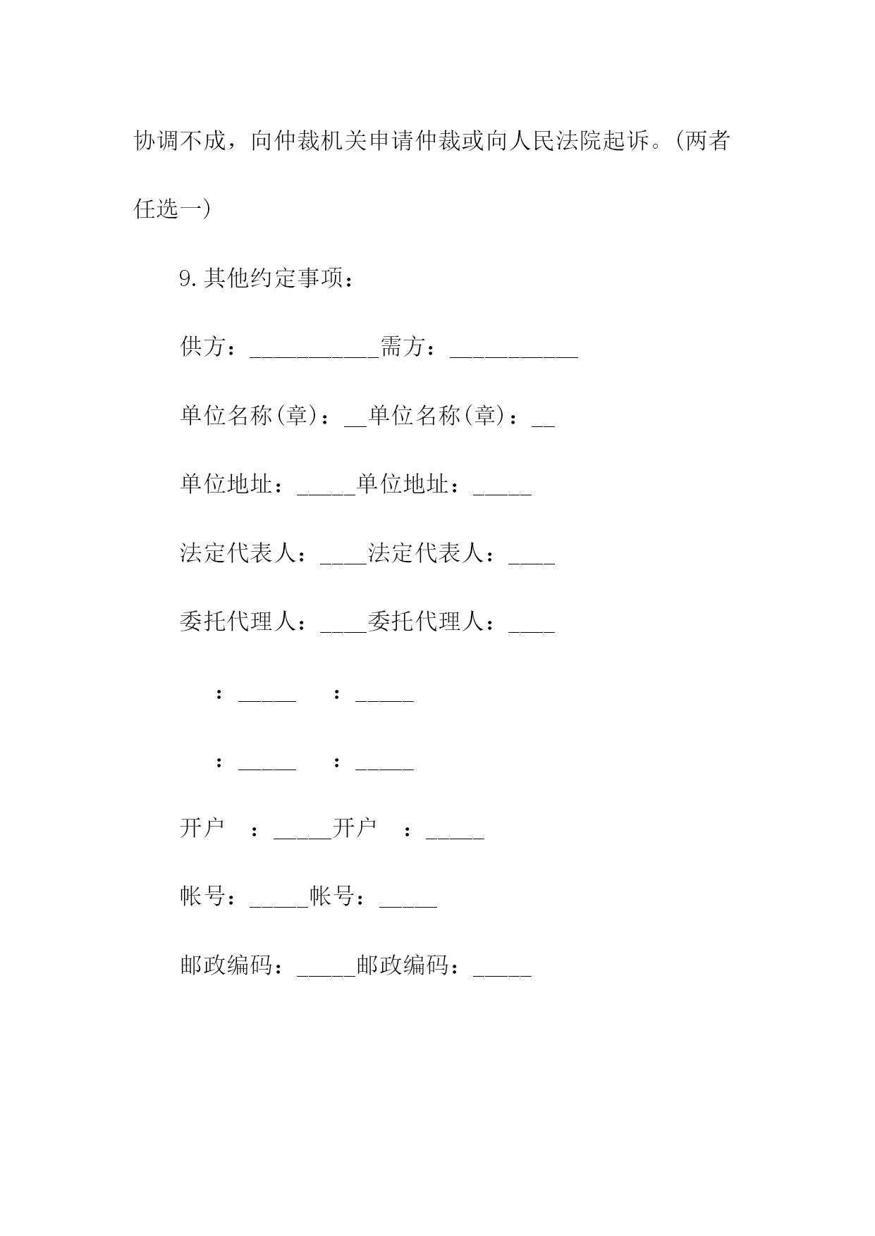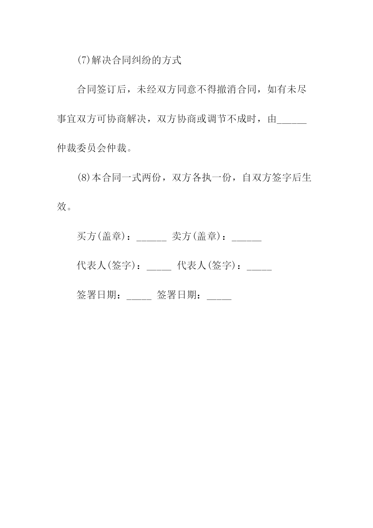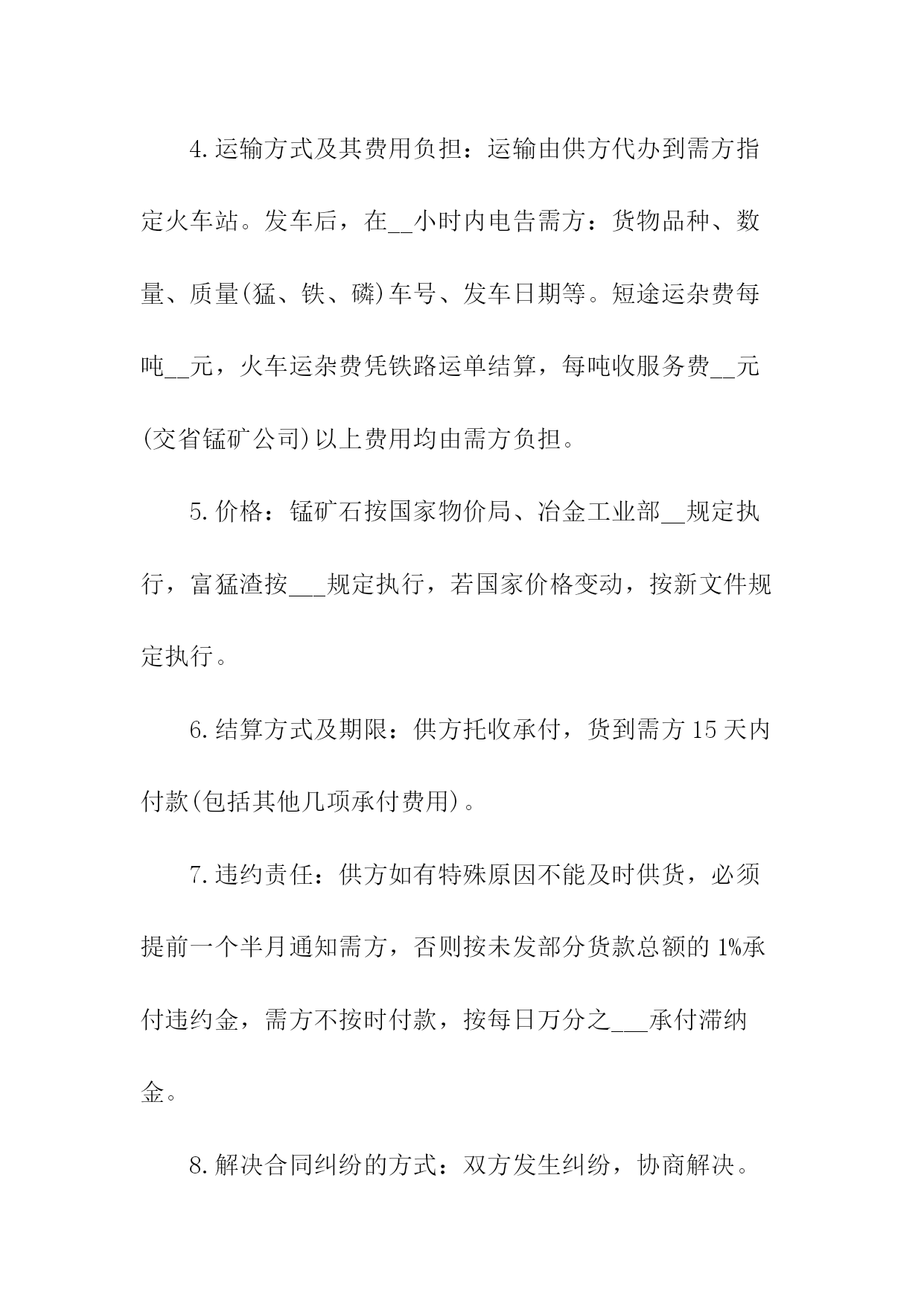 机械购销合同相关合同通用版83;标准产品购销合同书表格通用版83;酒水购销标准版标准合同书;电缆购销标准版标准合同书;电脑计算机产品购销标准版标准合同书;服装购销标准版标准合同书;农副产品购销合同依照《民法典》和《工矿产品购销合同条例》,经双方协商一致,签订本合同并严肃执行。本合同共__页第__页签订地点____签订时间__年__月__日合同编号:____号需方代表人供方代表人订货单位XX编码供货单位XX编码结算单位电报挂号结算单位电报挂号通讯地址电话通讯地址电报挂号结算帐号结算电话结算方式结算期限到站整车代签合同单位代表帐号收货单位零担记事质量标准:验收方法及期限:运杂费需方承负:包装费用及要求:通讯地址交货方式供方运输方式交(提)货地点需方产品名称型号规格单位数量单价(元)总价(元)交(提)货时间一季度二季度三季度四季度鉴(公)证意见:经办人:鉴(公)证机关(章)年____月____日金额总计(大写)违约责任供方不能交货,向需方偿付不能交货货款总值%的违约金。需方中途退货,向供方偿付退货部分货款总值%的违约金。其余违约责任,供需双方均按《工矿产品购销合同条例》的规定承担。解决合同纠纷的方式:执行本合同发生争议,由当事人双方协商解决。协商不成,双方同意由____仲裁委员会仲裁(当事人双方不在本合同中约定仲裁机构,事后又没有达成书面仲裁协议的,可向人民法院起诉)。双方商定的其它事项另附,本合同附件__份此合同一式份,供方份,需方份,鉴(公)证机关份。地质机械仪器产品购销合同附表地质本合同共__页第__页签订日期:__年_月_日合同编号:__号产品名称型号规格单位数量单价(元)总价(元)交(提)货时间备注一季度二季度三季度四季度颁布单位:国家工商管理局经济合同司颁布____日期:1991返机械产品购销合同书购方:________卖方:________签订地点:_____签订时间:_____双方自愿按照下列条款签订本供销合同并共同遵守:(1)价格构成1.本合同合计总价:人民币(大写)______元整;2.设备安装调试后,买方付清全部货款;3.如买方不能在合同规定的时间内付清全部货,超过期限,则需每天按合同总金额5%的违约金赔偿给卖方。(2)质量、技术1.设备必须与所签定的型号相符。2.符合制造厂家的出厂标准。(3)供货方式卖方负责运输费用,并按买方约定时间送到指定位置。(4)检验和交接设备抵达和拆包时,双方须派代表在现场清点检验,签署并记录在案。(5)安装和培训1.卖方提供要求,买方负责装修水,电及其他所需环境要求。2.卖方负责在国内的设备安装、调试及操作人员的培训。(6)售后服务:以上设备免费保修一年,终身维护。(备注:买方需使用卖方指定的耗材,否则,由此产生的机器故障不在保修范围内。)(7)解决合同纠纷的方式合同签订后,未经双方同意不得撤消合同,如有未尽事宜双方可协商解决,双方协商或调节不成时,由______仲裁委员会仲裁。(8)本合同一式两份,双方各执一份,自双方签字后生效。买方(盖章):______卖方(盖章):______代表人(签字):_____代表人(签字):_____签署日期:_____签署日期:_____锰产品的购销合同书供方:_____分配号:_____需方:_____合同编号:_____签订地点:_____签订时间:____年__月__日1.产品名称、质量、数量?供货时间2.计量标准:需方有轨道衡,以轨道衡为准,途耗__%,无轨道衡则按供方矿石比重划线装车为准,其他损耗不负责任。3.验收标准方法及提出异议期限:按双方约定的质量为准,允许锰品位误差为__%,允许含水分__%.若超差,由需方保留原矿并电告供方,在30日内到需方,以共同取样化验为准;但过期以需方复验为准;若需方30日内未电告供方或需方未保留原矿或动用了矿石的,以供方原化验数据为准。4.运输方式及其费用负担:运输由供方代办到需方指定火车站。发车后,在__小时内电告需方:货物品种、数量、质量(猛、铁、磷)车号、发车日期等。短途运杂费每吨__元,火车运杂费凭铁路运单结算,每吨收服务费__元(交省锰矿公司)以上费用均由需方负担。5.价格:锰矿石按国家物价局、冶金工业部__规定执行,富猛渣按___规定执行,若国家价格变动,按新文件规定执行。6.结算方式及期限:供方托收承付,货到需方15天内付款(包括其他几项承付费用)。7.违约责任:供方如有特殊原因不能及时供货,必须提前一个半月通知需方,否则按未发部分货款总额的1%承付违约金,需方不按时付款,按每日万分之___承付滞纳金。8.解决合同纠纷的方式:双方发生纠纷,协商解决。协调不成,向仲裁机关申请仲裁或向人民法院起诉。(两者任选一)9.其他约定事项:供方:___________需方:______
