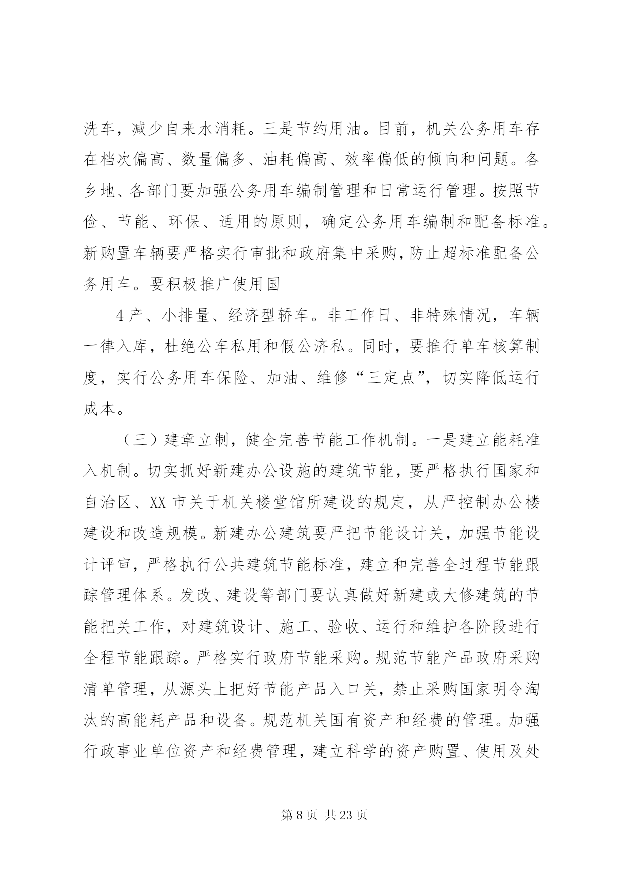 第PAGE\*Arabic\*MERGEFORMAT23页共NUMPAGES\*MERGEFORMAT23页全县公共机构节能工作会议讲话(2012年8月30日)同志们:今天,我们召开全县公共机构节能工作会议,主要是传达贯彻省、市公共机构节能工作会议精神,总结去年以来我县公共机构节能工作情况,安排部署下一阶段的工作任务。刚才,振山局长传达了省、市节能工作会议精神,通报了去年以来节能工作,并对下半年重点工作进行了安排部署。希望大家统一思想,高度重视,精心组织,强化措施,扎扎实实地完成好各项工作任务,确保我县公共机构节能工作取得实效。下面,就做好全县公共机构节能工作讲三点意见:一、统一思想,提高认识,增强做好公共机构节能工作的责任感和紧迫感公共机构节能工作地位重要,影响深远,中央和省、市都非常重视这项工作。温家宝总理在去年和今年的政府工作报告中都强调要推进公共机构节能,在全国节能减排工作电视电话会议上要求,做好节能减排,各类公共机构要发挥示范带头作用,国家机构要做表率;省、市高度重视这项工作,省里出台了《XX省公共机构节能办法》,耿-1节能目标任务,全面摸清本单位设备能耗、建筑能耗、人均能耗等真实情况,结合实际制定整改方案,扎实推进节能工作顺利开展。二要加强管理,从严控制能耗。公共机构节能工作面广量大,是一项经常性、持续性的工作。各级、各部门要进一步加强机关管理,教育广大干部职工自觉养成人走灯灭、节约水电的良好习惯,杜绝常明灯、长流水现象;积极推广使用高效照明产品和节水设备,减少公共机构水电消耗;抓好办公用品和办公设备的使用管理,积极推进电子政务,减少纸质文件印发数量,提倡办公耗材循环利用。要坚持日常工作常抓不放、重点工作全力以赴的原则,抓住重点环节,采取有力措施,确保工作取得成效。三要强化宣传,营造浓厚氛围。各级、各部门要围绕建设节约型机关,进一步加大宣传工作力度,充分利用各种宣传媒体和手段,广泛宣传节能降耗的重大意义、方针政策、基本知识和先进经验,大力宣扬节能工作中的好做法、好典型,弘扬勤俭节约的传统美德和艰苦奋斗的优良传统,倡导节能环保理念,倡导低碳生活方式,倡导生态社会文明,发挥示范引领作用,引领和推动全社会形成节能风尚和节约文化,营造人人崇尚节约、人人参与节能的良好氛围。三、加强领导,齐抓共管,确保公共机构节能工作落-3好的要表扬,差的要批评,做到奖惩严明,有力促进和推动全县公共机构节能工作的开展。同时,财政部门要按照规定,将公共机构节能工作经费纳入财政预算,提高公共机构节能工作保障力度,确保全县公共机构节能工作顺利开展。同志们,推进公共机构节能、降低机关运行成本,功在当代,利在千秋,任重道远。各级、各部门一定要以强烈的责任感和使命感,牢固树立低碳环保理念和勤俭节约意识,以更加积极的工作态势,更加务实的工作作风,更加扎实的工作措施,认真做好公共机构节能工作,加快推进节约型机关建设,全面完成公共机构节能目标任务,为促进我县绿色跨越发展做出新的更大的贡献。谢谢大家。第二篇:在全旗公共机构节能工作会议上的讲话在全旗公共机构节能工作会议上的讲话旗委常委、旗政府副旗长何志伟(2010年7月日)同志们:今天召开全旗公共机构节能工作会议,主要是传达全区公共机构节能工作会议的精神,动员全旗各地、各部门,迅速行动起来,认真做好公共机构节能工作,扎实推进节约型机关建设。刚才,王吉祥主任传达了全区公共机构节能工作会议的精神,政府办王会计对我旗的公共机构节能工作统计工作进行了详细讲解,讲得很好、很全面,我完全同意,请大家认真领会,抓好落实。下面,我就推进全旗公共机构节能工作,强调三点意见。一、充分认识做好公共机构节能工作的重要意义2007年12月28日,经全国人大常委会讨论通过,胡锦涛主席发布了第77号主席令,颁布了新修订的《中华人民共和国节约能源法》,其中明确了公共机构节能的有关要求。2008年8月1日,温家宝总理发布了第531号国务院令,颁布了《公共机构节能条例》。6月25日,市政府专门召开了全市公共机构节能工作会议,对抓好公共机构节能工作作了具体部署。这充分说明,从中央到地方,都高度重视公共机构节能工作。这项工作的重要性,主要表现在以下三个方面:首先,公共机构节能是可持续发展的必然要求。发展与节约不是对立的,发展必须节约,节约有利发展。建设资源1节约型和环境友好型社会,是党中央、国务院的一项重大战略决策,也是我国当前和今后经济社会发展面临的一个紧迫而重大的课题。但就目前来看,我国经济增长方式粗放、结构不尽合理的问题还比较突出,能源消耗量比较大,是世界上第二大能源消费国,消费总量约占全球的15%左右。我国的能源资源虽然丰富,但人均能源资源储量均低于世界平均水平,可以说,能源问题已成为制约经济社会发展和全面建设小康社会