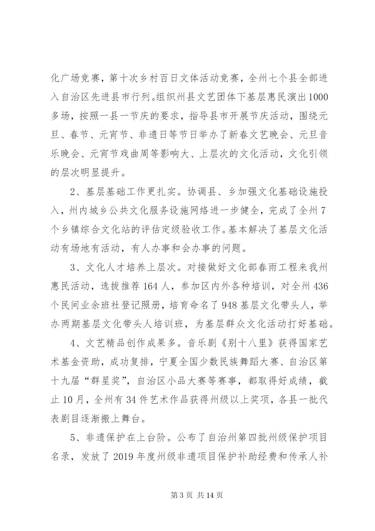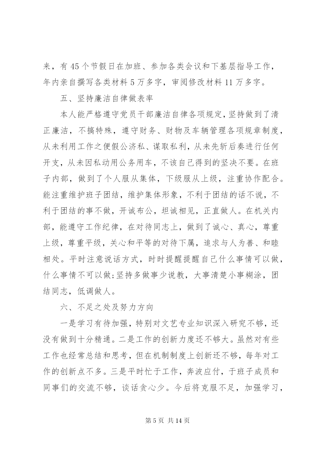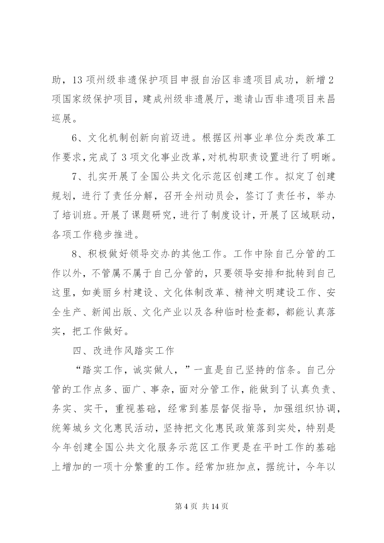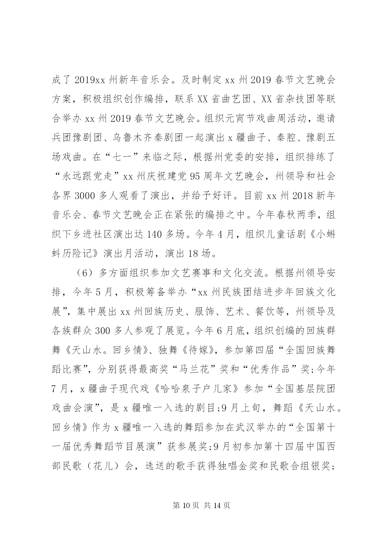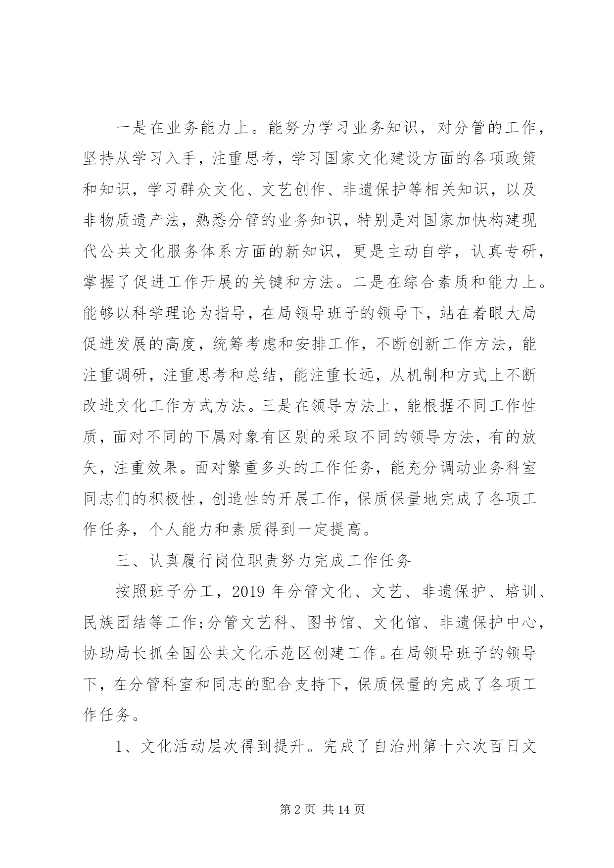 第PAGE\*Arabic\*MERGEFORMAT14页共NUMPAGES\*MERGEFORMAT14页XX年3月公务员述职报告按照州委组织部关于县级干部年度考核工作要求,现就本人2019年学习贯彻习总书记系列讲话精神、落实区州党委决策部署,牢固树立“四种意识”情况,以及严守政治纪律和政治规矩的立场观点、现实表现情况,履行岗位职责暨德能勤绩廉等方面的现实表现报告如下:一、抓好自身学习加强党性和道德修养一是在政治学习上。能认真学习十八大、十八届六全会精神,以及习近平总书记系列讲话精神,深刻领会精神内涵,深刻领会x疆工作的“总目标”和“生命线”,坚持正确的政治方向,坚定理想信念,坚打牢思想基础,使思想觉悟进一步提高,自觉投身于维护x疆稳定和长治久安的具体工作中去。二是坚决贯彻执行区、州党委决策部署,牢固树立“四种意识”,积极投身反对分裂,“去极端化”各项工作,在大是大非问题上能头脑清醒的,立场坚定,在思想上、行动上、言论上和中央保持高度一致,在重大事件和关键时刻特别是在维稳和反恐斗争中能立场坚定、旗帜鲜明、坚决斗争。三是不断加强党性修养,能严守政治纪律和政治规矩,坚持原则,坚持组织程序,坚持民主集中制原则,坚持讲党性、重品行、做表率,明辨是非、以一个共产党员的标准和一个领导干部的标准严格要求自己。二、注重能力锻炼提高综合素质一是在业务能力上。能努力学习业务知识,对分管的工作,坚持从学习入手,注重思考,学习国家文化建设方面的各项政策和知识,学习群众文化、文艺创作、非遗保护等相关知识,以及非物质遗产法,熟悉分管的业务知识,特别是对国家加快构建现代公共文化服务体系方面的新知识,更是主动自学,认真专研,掌握了促进工作开展的关键和方法。二是在综合素质和能力上。能够以科学理论为指导,在局领导班子的领导下,站在着眼大局促进发展的高度,统筹考虑和安排工作,不断创新工作方法,能注重调研,注重思考和总结,能注重长远,从机制和方式上不断改进文化工作方式方法。三是在领导方法上,能根据不同工作性质,面对不同的下属对象有区别的采取不同的领导方法,有的放矢,注重效果。面对繁重多头的工作任务,能充分调动业务科室同志们的积极性,创造性的开展工作,保质保量地完成了各项工作任务,个人能力和素质得到一定提高。三、认真履行岗位职责努力完成工作任务按照班子分工,2019年分管文化、文艺、非遗保护、培训、民族团结等工作;分管文艺科、图书馆、文化馆、非遗保护中心,协助局长抓全国公共文化示范区创建工作。在局领导班子的领导下,在分管科室和同志的配合支持下,保质保量的完成了各项工作任务。1、文化活动层次得到提升。完成了自治州第十六次百日文化广场竞赛,第十次乡村百日文体活动竞赛,全州七个县全部进入自治区先进县市行列。组织州县文艺团体下基层惠民演出1000多场,按照一县一节庆的要求,指导县市开展节庆活动,围绕元旦、春节、元宵节、非遗日等节日举办了新春文艺晚会、元旦音乐晚会、元宵节戏曲周等影响大、上层次的文化活动,文化引领的层次明显提升。2、基层基础工作更扎实。协调县、乡加强文化基础设施投入,州内城乡公共文化服务设施网络进一步健全,完成了全州7个乡镇综合文化站的评估定级验收工作。基本解决了基层文化活动有场地有活动,有人办事和会办事的问题。3、文化人才培养上层次。对接做好文化部春雨工程来我州惠民活动,选拔推荐164人,参加区内外各种培训,对全州436个民间业余班社登记照册,培育命名了948基层文化带头人,举办两期基层文化带头人培训班,为基层群众文化活动打好基础。4、文艺精品创作成果多。音乐剧《别十八里》获得国家艺术基金资助,成功复排,宁夏全国少数民族舞蹈大赛、自治区第十九届“群星奖”,自治区小品大赛等赛事,都取得好成绩,截止10月,全州有34件艺术作品获得州级以上奖项,各县一批代表剧目逐渐搬上舞台。5、非遗保护在上台阶。公布了自治州第四批州级保护项目名录,发放了2019年度州级非遗项目保护补助经费和传承人补助,13项州级非遗保护项目申报自治区非遗项目成功,新增2项国家级保护项目,建成州级非遗展厅,邀请山西非遗项目来昌巡展。6、文化机制创新向前迈进。根据区州事业单位分类改革工作要求,完成了3项文化事业改革,对机构职责设置进行了明晰。7、扎实开展了全国公共文化示范区创建工作。拟定了创建规划,进行了责任分解,召开全州动员会,签订了责任书,举办了培训班。开展了课题研究,进行了制度设计,开展了区域联动,各项工作稳步推进。8、积极做好领导交办的其他工作。工作中除自己分管的工作以外,不管属不属于自己分管的,只要领导安排和批转到自己这里,如美丽乡村建设、文化体制改革、精神文明建设工作、安全生产、新闻出版、文化产业以及各种临时检查都,都能认真落实,把工作做好。四、改进作风踏实工作