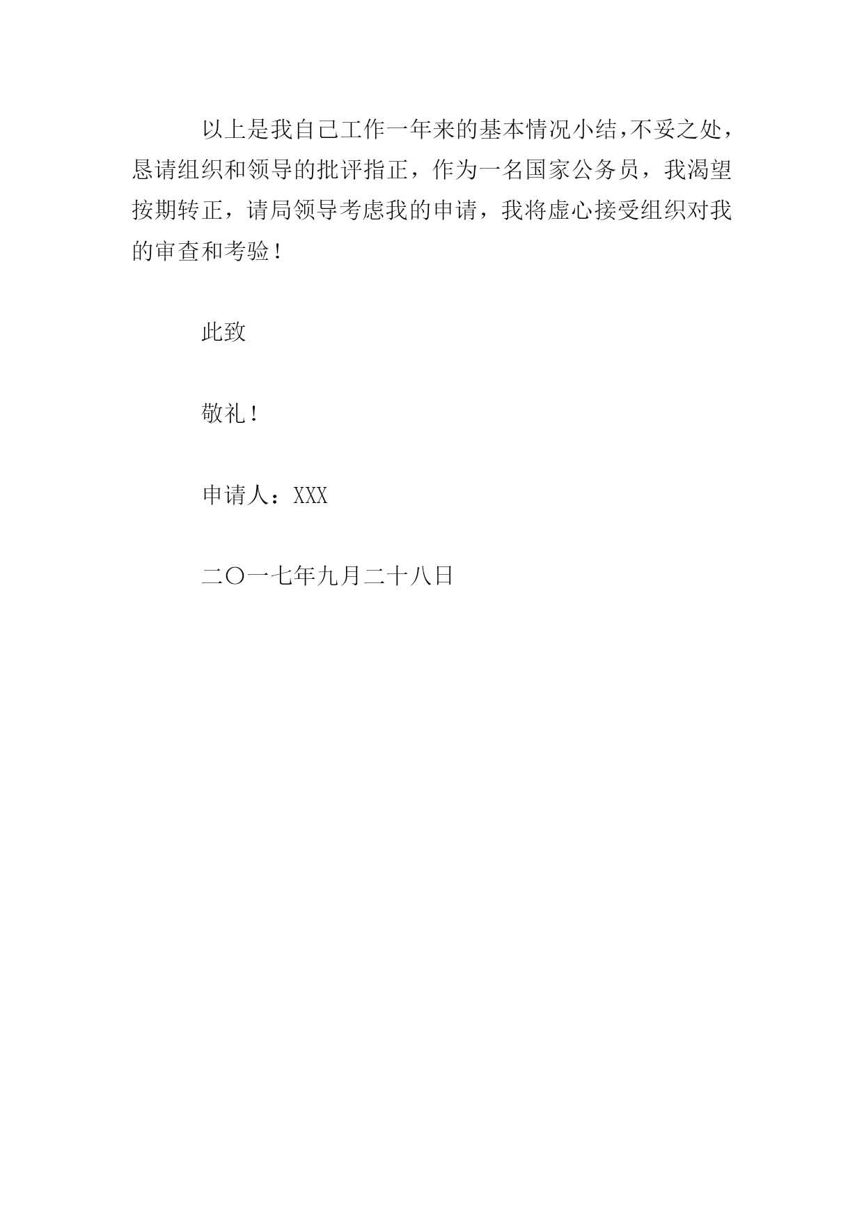 招考国家公务员转正申请招考国家公务员转正申请尊敬的领导:2016年,我通过公务员招考,我幸运地成为XXXX的一名工作人员。从上班至今,时间已经过去一年了,期间在领导和同事们的帮助下,经过不断学习和工作锻炼,使我提高了工作能力和业务素质,积累了大量的工作经验,同时认清了自己的不足,为日后的改进与提高指明了方向。在实习期满之际,我郑重向局领导提出转正申请。为了便于局领导对我的考察,现将个人一年来的思想、工作、学习方面的情况汇报如下:一、思想政治方面一年来,我利用单位统一组织安排的政治学习,和各种闲暇时间,通过各种文件,以及网络、电视等方式,主动加强政治学习,多关注社会热点,及时了解国家和自治区的方针政策,认真学习贯彻十八大及六中全会精神和习主席一系列重要讲话精神。同时我始终用党的最新理论成果武装自己,始终与党中央保持一致,不断提高自己的思想觉悟,参加工作后于2016年12月递交了入党申请书,2017年7月被推荐为入党积极分子。二、工作方面参加工作后,我一直在水政监察大队工作,一年来让我对水政相关的认识以及面对工作的心态都有颇为深刻的变化,使我更加坚定了做好本职工作的信心。在局领导的关怀与培养下,我认真学习、努力工作,积极投身到本部门的工作中,逐渐进入了工作角色,较好地完成了各项工作任务。具体工作如下:.....。积极配合协助局里安排的其他事宜。积极完成了局领导安排的其他临时性工作。在工作中遇到难以处理的情况,我及时向领导请示、汇报,让领导了解掌握工作的实际情况和出现的问题,为解决问题贡献自己的力量。三、学习生活方面在工作过程中,我深深感到加强自身学习、提高自身素质的紧迫性,一是向书本学习,坚持每天挤出一定的时间不断充实自己,端正态度,改进方法,广泛汲取各种“营养”;二是向周围的领导同事学习,工作中我始终保持谦虚谨慎、虚心求教的态度,主动向领导、同事们请教,学习他们求真务实的工作作风和处理问题的方法;三是向实践学习,把所学的知识运用于实际工作中,在实践中检验所学知识,查找不足,提高自己,防止和克服浅尝辄止、一知半解的倾向。四、不足和措施一年来,我全身心的投入到工作中去,认真履行了自己的职责,比较圆满地完成了自己的工作任务。但是,也存在一些不足,如我对执法工作的认识不够具体、社会经验不足、对民族文化了解不深造成沟通困难、对工作任务有时比较怠慢等,今后我一定从自身情况出发,克服缺点,弥补不足。我会继续努力,按照“外树形象、内强素质”的要求,进一步提高和完善自我的工作能力和工作水平。具体有:一、继续加强理论知识的学习;二、在工作实践中,多看、多想、多做,加强和民族同志的沟通,注意经验的积累;三、平时工作中,多向领导同事学习,通过书本、网络和培训等方式提高写作能力;四、制定完善的工作计划,从而更好的完成领导交付的各项任务,在今后的工作中争取真正成为一名素质高、业务精的工作人员。以上是我自己工作一年来的基本情况小结,不妥之处,恳请组织和领导的批评指正,作为一名国家公务员,我渴望按期转正,请局领导考虑我的申请,我将虚心接受组织对我的审查和考验!此致敬礼!申请人:XXX二〇一七年九月二十八日