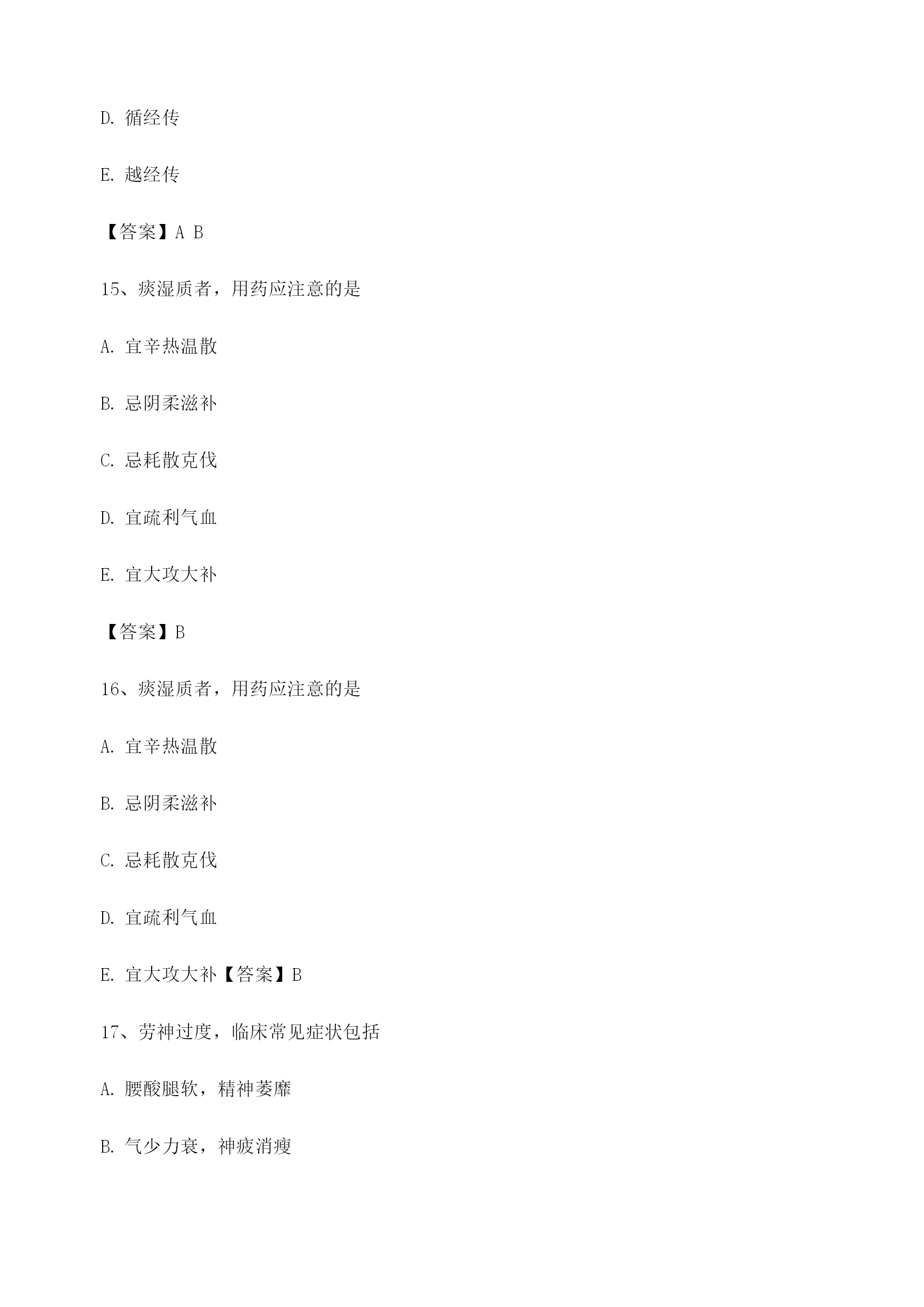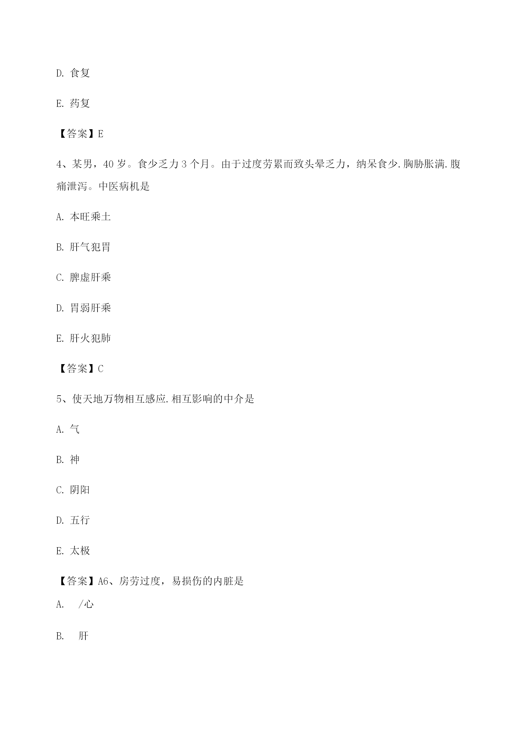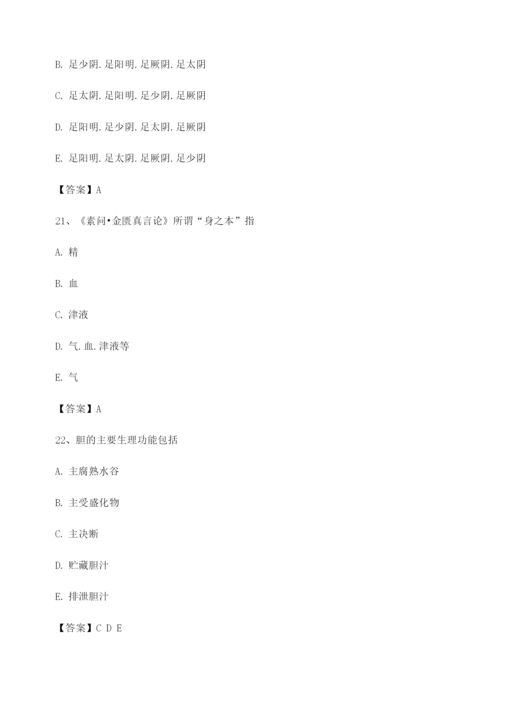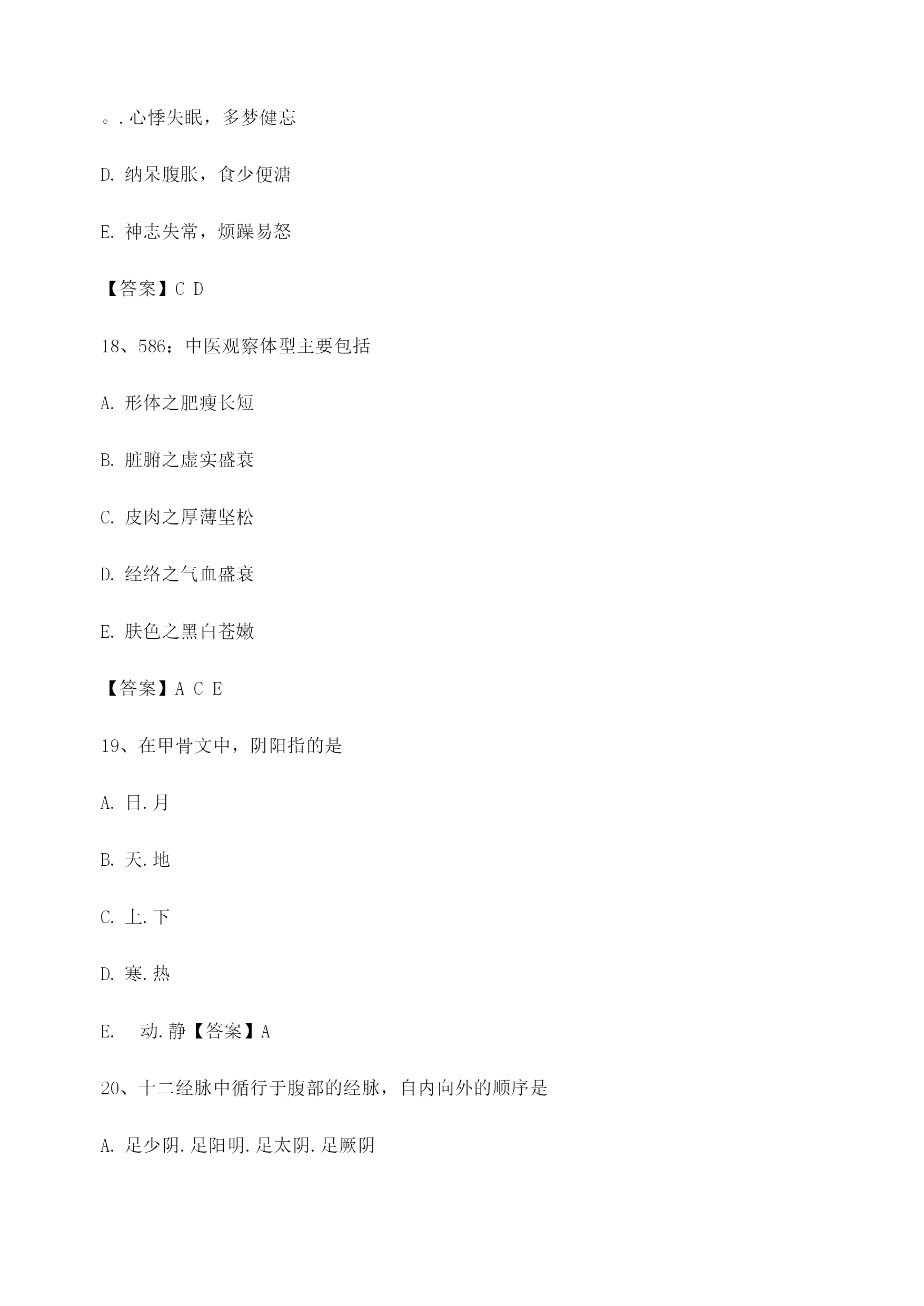 中医基础理论考试模拟题库1、饮停于胸胁的病证名是悬饮痰饮溢饮支饮留饮【答案】A2、属于胃的生理特性的是入.喜燥喜满喜润喜运喜升【答案】C3、某男,51岁。近三年来反复出现眩晕耳鸣,头痛耳胀,面色潮红,急躁易怒,失眠多梦。经治疗后基本证候消失,两天前自购人参调补,眩晕诸症复作,其发病类型是重感致复合病劳复食复药复【答案】E4、某男,40岁。食少乏力3个月。由于过度劳累而致头晕乏力,纳呆食少.胸胁胀满.腹痛泄泻。中医病机是本旺乘土肝气犯胃脾虚肝乘胃弱肝乘肝火犯肺【答案】C5、使天地万物相互感应.相互影响的中介是气神阴阳五行太极【答案】A6、房劳过度,易损伤的内脏是/心肝5肾肺【答案】D7、被后人称为“补土派”的医家代表是李中梓李东垣陈无择叶天士刘完素【答案】B8、临床表现中属于偏阴质的有^面色偏白或欠华精力偏弱胆小易惊性格内向工作潜力大【答案】ABCD9、具有抑制.偏寒.多静等特征的体质是平和质偏阳质偏阴质痰湿质气虚质【答案】C10、中医养生原则确立基础包括对病因及发病条件的研究对人体生长壮老已生命规律的研究对预防疾病的实践总结对衰老机制认识的不断深化延缓衰老的养生实践【答案】ABCDE11、过饥可以出现的变化有^脾胃虚弱营养不良正气不足生长发育迟缓脏腑功能衰退【答案】ABCDE12、中医学认为,人体生命的本原物质是津液血液精汁水谷精微精气【答案】E13、劳力过度,易损伤的内脏是/心肺肺脾。.心脾D.肝脾£.心肾【答案】B14、温病三焦转变的规律有顺传逆传表里传循经传越经传【答案】AB15、痰湿质者,用药应注意的是宜辛热温散忌阴柔滋补忌耗散克伐宜疏利气血宜大攻大补【答案】B16、痰湿质者,用药应注意的是宜辛热温散忌阴柔滋补忌耗散克伐宜疏利气血宜大攻大补【答案】B17、劳神过度,临床常见症状包括腰酸腿软,精神萎靡气少力衰,神疲消瘦。.心悸失眠,多梦健忘纳呆腹胀,食少便溏神志失常,烦躁易怒【答案】CD18、586:中医观察体型主要包括形体之肥瘦长短脏腑之虚实盛衰皮肉之厚薄坚松经络之气血盛衰肤色之黑白苍嫩【答案】ACE19、在甲骨文中,阴阳指的是日.月天.地上.下寒.热动.静【答案】A20、十二经脉中循行于腹部的经脉,自内向外的顺序是足少阴.足阳明.足太阴.足厥阴足少阴.足阳明.足厥阴.足太阴足太阴.足阳明.足少阴.足厥阴足阳明.足少阴.足太阴.足厥阴足阳明.足太阴.足厥阴.足少阴【答案】A21、《素问•金匮真言论》所谓“身之本”指TOC\o"1-5"\h\z精血津液气.血.津液等气【答案】A22、胆的主要生理功能包括主腐熟水谷主受盛化物主决断贮藏胆汁排泄胆汁【答案】CDE23、足三阳经的走向规律是从足走头从头走足从胸走手从手走头从足走腹【答案】B24、中国传统文化的基本精神是贵和尚中伦理道德恒动变化尊经奉典整体宏观【答案】A25、不属于风邪性质的是善行主动开泄数变升散【答案】E26、在脉中运行迟缓涩滞,停积不行的血是血府瘀血离经之血鲜血以上都不是【答案】B27、与结石的形成关系不密切的是饮食不当情志内伤服药不当体质差异气候因素【答案】E28、分布于头后部的经脉是太阳经阳明经少阳经厥阴经太阴经【答案】A29、津液输布和排泄障碍可形成的病理产物包括TOC\o"1-5"\h\z湿水饮瘀痰【答案】ABCE30、开创脏腑证治先河的医家是巢元方陈无择张仲景钱乙王清任【答案】D31、《素问•至真要大论》:“诸湿肿满,皆属于”TOC\o"1-5"\h\z肺脾肾5/心【答案】B32、导致子宫脱垂.脱肛的基本病机为气滞气逆气陷气闭气脱【答案】C33、“阴阳之征兆”指的是寒与热水与火上与下内与外动与静【答案】B34、中医学对发病原理的认识主要是正邪相搏阴阳失调饮食失调气血失常脏腑失调【答案】A35、某女,23岁。心烦,舌赤糜烂,尿少尿赤。中医病机是北大肠实热,腑气不通M经实火,移热小肠肾气虚弱,蒸化无权肝气郁滞,郁而化火脾失健运,腹胀腹泻【答案】B36、津亏血瘀的病机是津液亏虚,不能化血血行阻滞,不能化津血脉瘀阻,津液停聚津液枯涸,燥热内生津液亏耗,血行郁滞【答案】E37、温燥的常见发病季节在夏末初秋近冬深秋长夏季节冬末春初春末夏初【答案