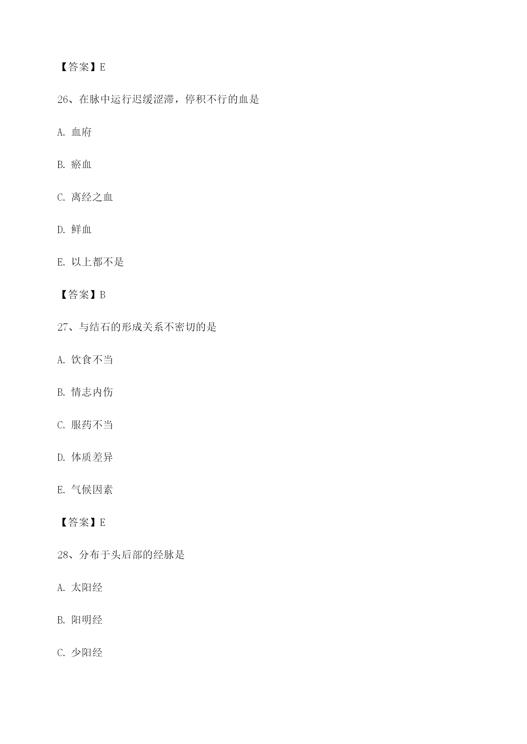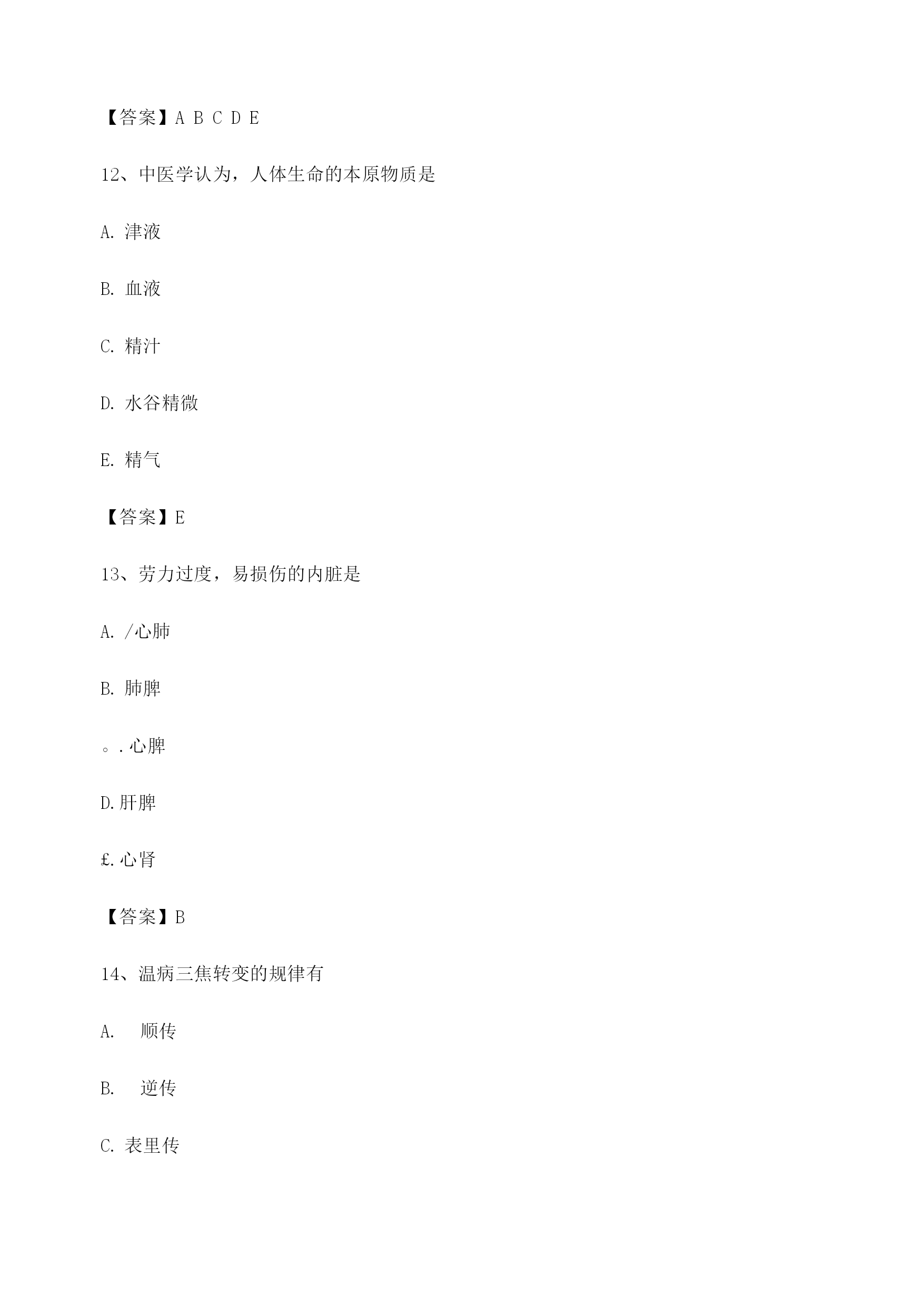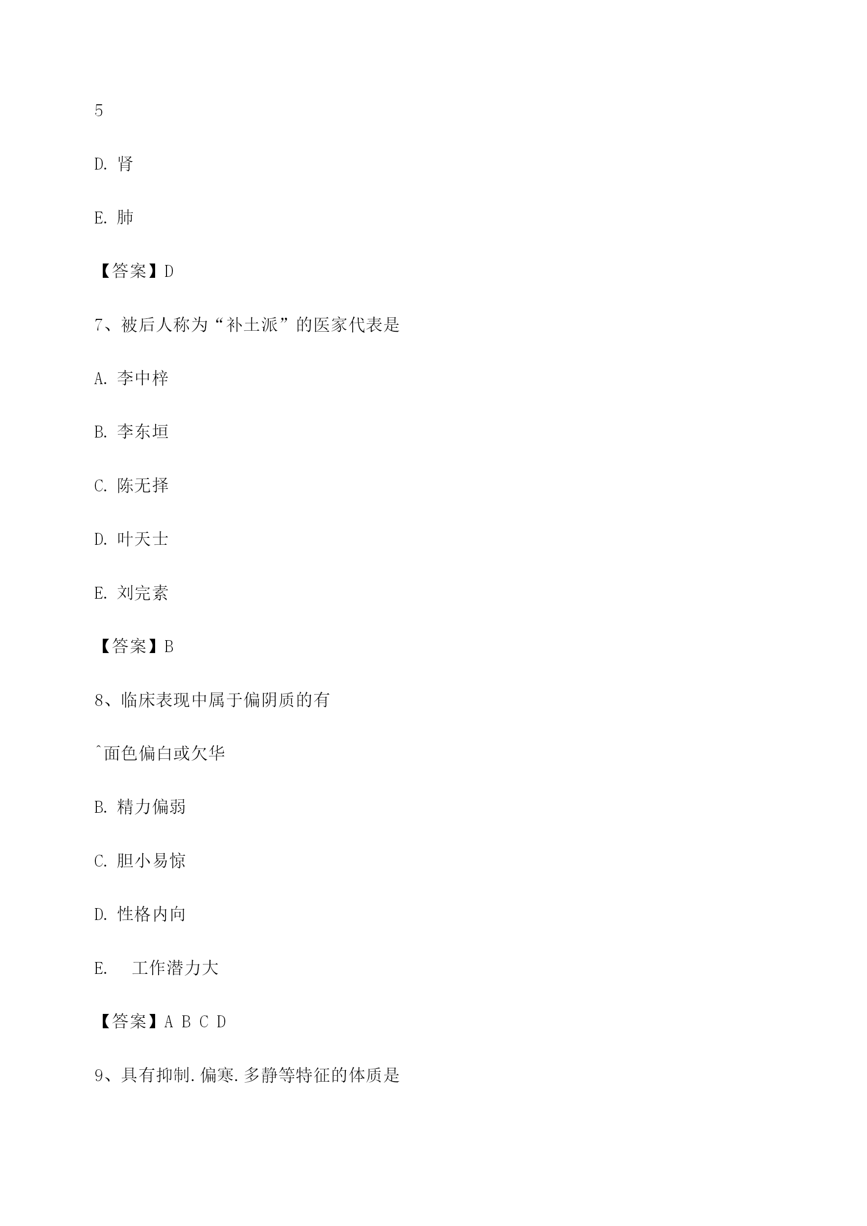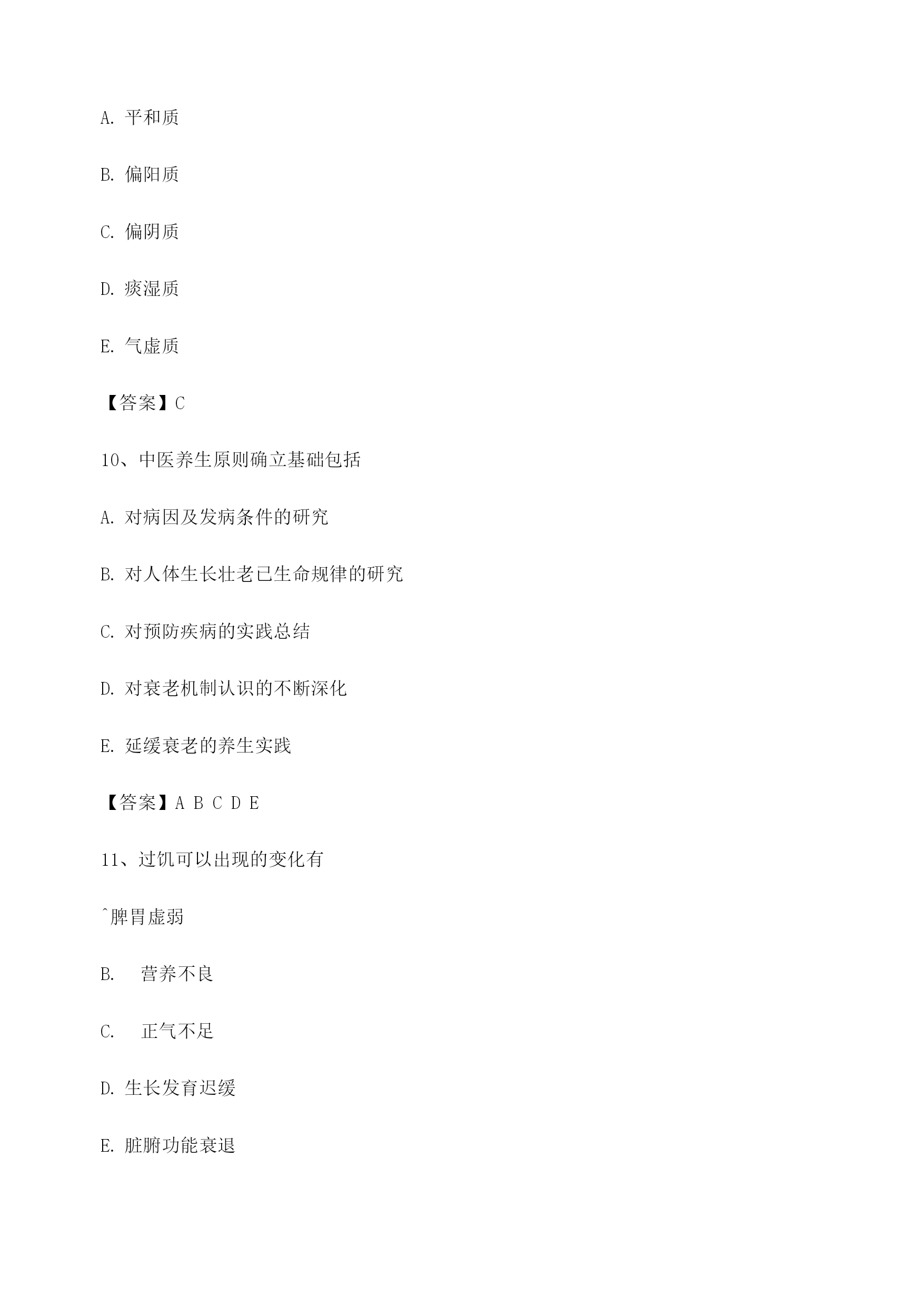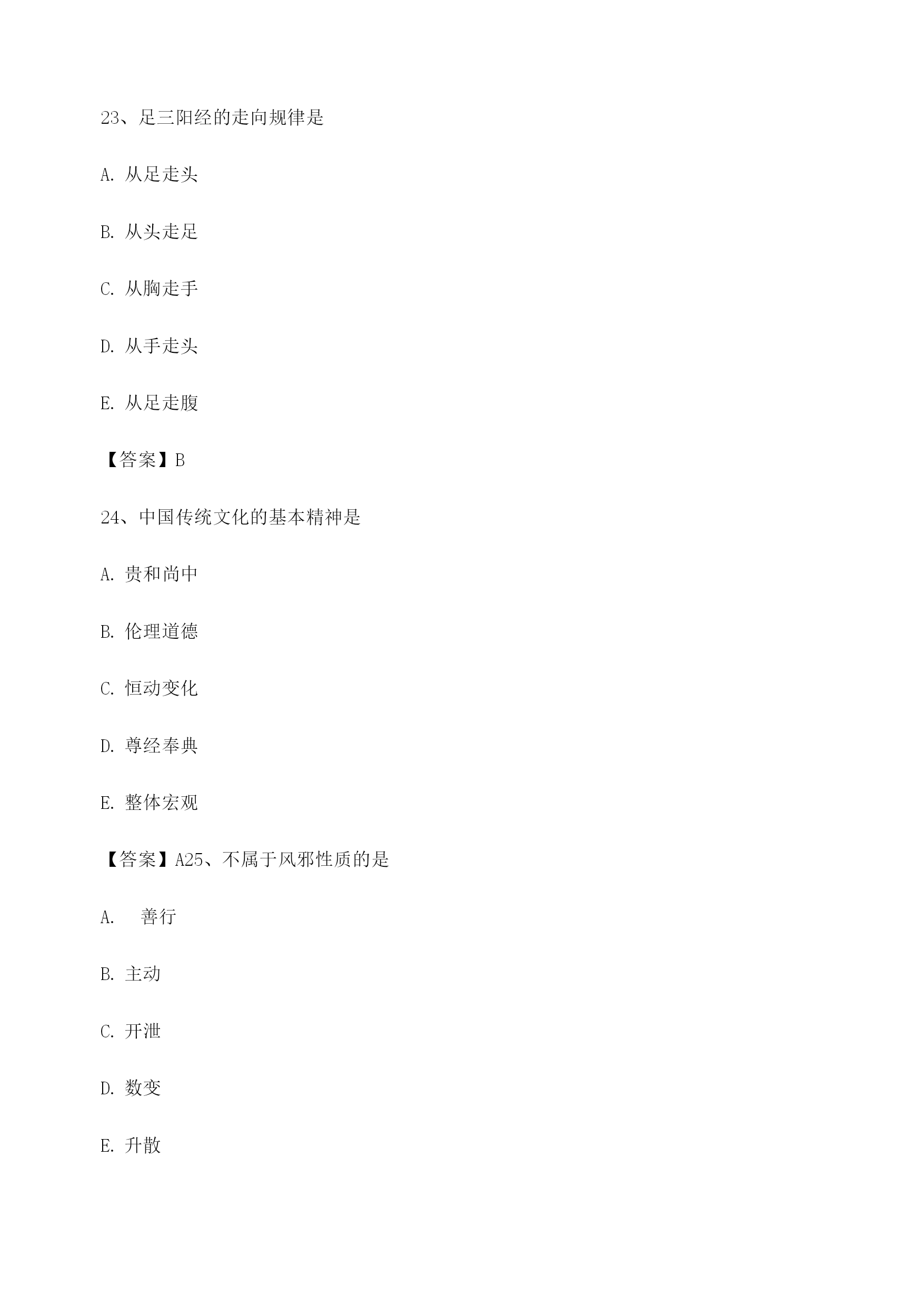 中医基础理论考试模拟题库1、饮停于胸胁的病证名是悬饮痰饮溢饮支饮留饮【答案】A2、属于胃的生理特性的是入.喜燥喜满喜润喜运喜升【答案】C3、某男,51岁。近三年来反复出现眩晕耳鸣,头痛耳胀,面色潮红,急躁易怒,失眠多梦。经治疗后基本证候消失,两天前自购人参调补,眩晕诸症复作,其发病类型是重感致复合病劳复食复药复【答案】E4、某男,40岁。食少乏力3个月。由于过度劳累而致头晕乏力,纳呆食少.胸胁胀满.腹痛泄泻。中医病机是本旺乘土肝气犯胃脾虚肝乘胃弱肝乘肝火犯肺【答案】C5、使天地万物相互感应.相互影响的中介是气神阴阳五行太极【答案】A6、房劳过度,易损伤的内脏是/心肝5肾肺【答案】D7、被后人称为“补土派”的医家代表是李中梓李东垣陈无择叶天士刘完素【答案】B8、临床表现中属于偏阴质的有^面色偏白或欠华精力偏弱胆小易惊性格内向工作潜力大【答案】ABCD9、具有抑制.偏寒.多静等特征的体质是平和质偏阳质偏阴质痰湿质气虚质【答案】C10、中医养生原则确立基础包括对病因及发病条件的研究对人体生长壮老已生命规律的研究对预防疾病的实践总结对衰老机制认识的不断深化延缓衰老的养生实践【答案】ABCDE11、过饥可以出现的变化有^脾胃虚弱营养不良正气不足生长发育迟缓脏腑功能衰退【答案】ABCDE12、中医学认为,人体生命的本原物质是津液血液精汁水谷精微精气【答案】E13、劳力过度,易损伤的内脏是/心肺肺脾。.心脾D.肝脾£.心肾【答案】B14、温病三焦转变的规律有顺传逆传表里传循经传越经传【答案】AB15、痰湿质者,用药应注意的是宜辛热温散忌阴柔滋补忌耗散克伐宜疏利气血宜大攻大补【答案】B16、痰湿质者,用药应注意的是宜辛热温散忌阴柔滋补忌耗散克伐宜疏利气血宜大攻大补【答案】B17、劳神过度,临床常见症状包括腰酸腿软,精神萎靡气少力衰,神疲消瘦。.心悸失眠,多梦健忘纳呆腹胀,食少便溏神志失常,烦躁易怒【答案】CD18、586:中医观察体型主要包括形体之肥瘦长短脏腑之虚实盛衰皮肉之厚薄坚松经络之气血盛衰肤色之黑白苍嫩【答案】ACE19、在甲骨文中,阴阳指的是日.月天.地上.下寒.热动.静【答案】A20、十二经脉中循行于腹部的经脉,自内向外的顺序是足少阴.足阳明.足太阴.足厥阴足少阴.足阳明.足厥阴.足太阴足太阴.足阳明.足少阴.足厥阴足阳明.足少阴.足太阴.足厥阴足阳明.足太阴.足厥阴.足少阴【答案】A21、《素问•金匮真言论》所谓“身之本”指TOC\o"1-5"\h\z精血津液气.血.津液等气【答案】A22、胆的主要生理功能包括主腐熟水谷主受盛化物主决断贮藏胆汁排泄胆汁【答案】CDE23、足三阳经的走向规律是从足走头从头走足从胸走手从手走头从足走腹【答案】B24、中国传统文化的基本精神是贵和尚中伦理道德恒动变化尊经奉典整体宏观【答案】A25、不属于风邪性质的是善行主动开泄数变升散【答案】E26、在脉中运行迟缓涩滞,停积不行的血是血府瘀血离经之血鲜血以上都不是【答案】B27、与结石的形成关系不密切的是饮食不当情志内伤服药不当体质差异气候因素【答案】E28、分布于头后部的经脉是太阳经阳明经少阳经厥阴经太阴经【答案】A29、津液输布和排泄障碍可形成的病理产物包括TOC\o"1-5"\h\z湿水饮瘀痰【答案】ABCE30、开创脏腑证治先河的医家是巢元方陈无择张仲景钱乙王清任【答案】D31、《素问•至真要大论》:“诸湿肿满,皆属于”TOC\o"1-5"\h\z肺脾肾5/心【答案】B32、导致子宫脱垂.脱肛的基本病机为气滞气逆气陷气闭气脱【答案】C33、“阴阳之征兆”指的是寒与热水与火上与下内与外动与静【答案】B34、中医学对发病原理的认识主要是正邪相搏阴阳失调饮食失调气血失常脏腑失调【答案】A35、某女,23岁。心烦,舌赤糜烂,尿少尿赤。中医病机是北大肠实热,腑气不通M经实火,移热小肠肾气虚弱,蒸化无权肝气郁滞,郁而化火脾失健运,腹胀腹泻【答案】B36、津亏血瘀的病机是津液亏虚,不能化血血行阻滞,不能化津血脉瘀阻,津液停聚津液枯涸,燥热内生津液亏耗,血行郁滞【答案】E37、温燥的常见发病季节在夏末初秋近冬深秋长夏季节冬末春初春末夏初【答案