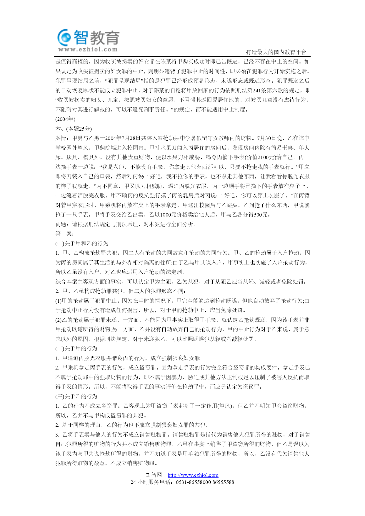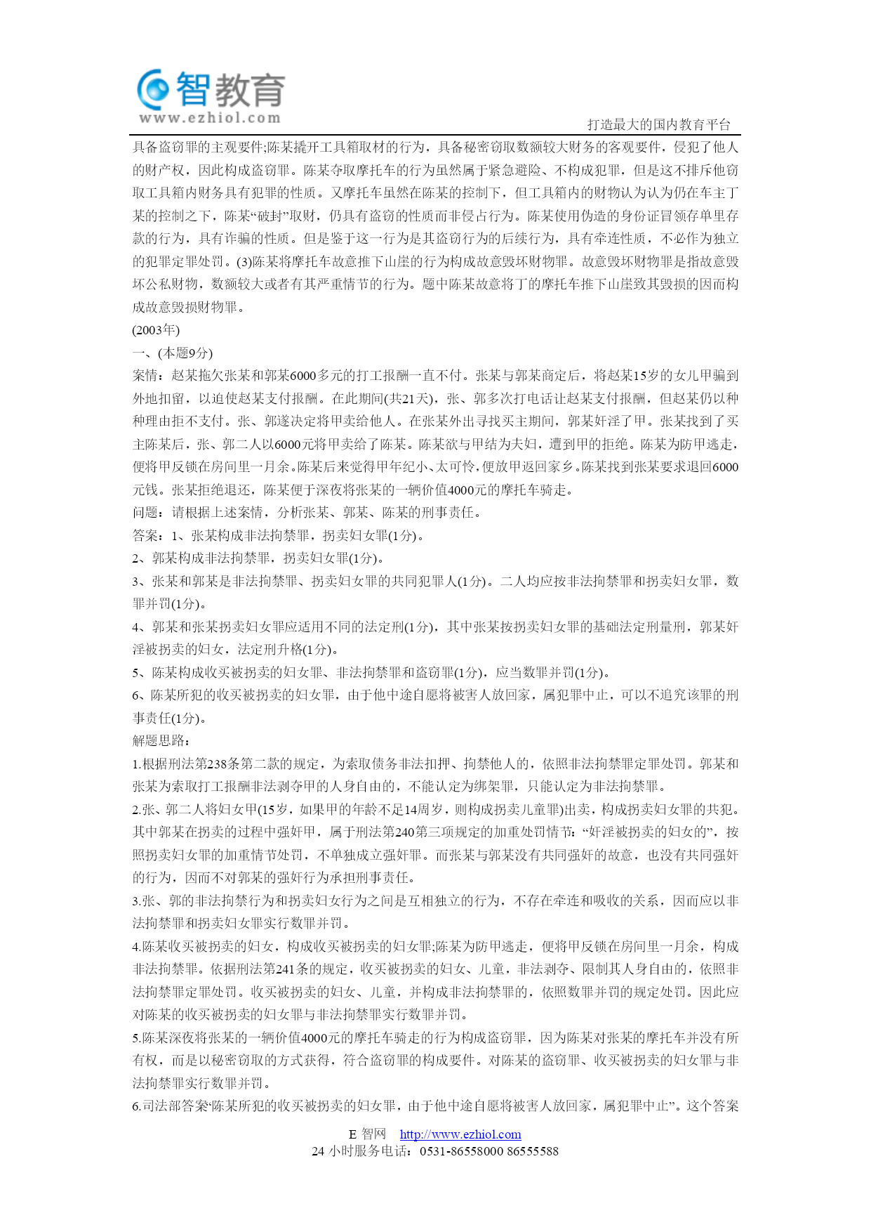 打造最大的国内教育平台E智网HYPERLINK"http://www.ezhiol.com"http://www.ezhiol.com24小时服务电话:0531-8655800086555588更多试题请访问HYPERLINK"http://www.ezhiol.com"http://www.ezhiol.com下载(2002年)一、(本题10分)李某长期在甲市行人较多的马路边寻问行人是否需要身份证,然后将需要身份证的人的照片、住址等资料送交何某伪造。何某伪造后,李某再交给购买者。在此期间,李某使用伪造的身份证办理手机入网手续并使用手机,造成电信资费损失3000余元。为了防止司法人员的抓捕,李某一直将一把三角刮刀藏在内衣口袋中。2001年4月下旬的一天晚上,李某在马路上寻问行人是否需要身份证时,发现钱某孤身一人行走,便窜至其背后将其背包(内有价值2000元的财物)夺走后迅速逃跑。钱某大声呼喊抓强盗。适逢民警赵某经过此地,赵某将李某拦住。此时李某掏出三角刮刀,朝赵某的腰部捅了一刀后逃离,致赵某重伤。甲市公安机关抓获李某后,与李某居住地乙市公安机关联系,发现李某是因为在乙市使用信用卡透支l万元后,为逃避银行催收而逃至甲市的。请结合上述案情,分析李某各行为的性质,并请说明理由。答案:(1)李某构成伪造居民身份证罪。(2)李某使用伪造的身份证办理手机入网手续并使用手机,造成电信资费损失数额较大,构成诈骗罪。(3)李某将钱某的背包抢走的行为属于抢夺行为;后来为抗拒抓捕而将民警赵某捅成重伤的行为构成抢劫罪。(4)李某在乙市使用信用卡透支l万元,而且逃避银行催收的行为构成信用卡诈骗罪。透支后逃避银行催收,属于恶意透支,构成信用卡诈骗罪。解题思路:本题考查伪造居民身份证罪、诈骗罪、抢劫罪和倍用卡诈骗罪。(1)《刑法》第280条第3款规定了伪造居民身份证罪。本案中,李某提供相关资料,何某伪造身份匪,再由李某出售;李某虽然没有直接伪造,其故意为直接伪造者何某提供帮助,帮助何某实施犯罪,李某和何某构成共同犯罪,所以李某构成伪造居民身份证罪。(2)本案中,李某以逃避电话费追收为目的,使用伪造的身份证办理手机入网手续并使用手机,造成电信资费损失3000元。李某的这一行为实质上是以非法占有为目的,虚构事实的手段使电话公司同意李某先使用后付费,最终达到占有应交纳的电话费的目的。教材明确指出:“以虚假、冒用的身份证件办理入网手续并使用移动电话,造成电信资费损失数额较大的,成立诈骗罪。”(3)本案中,李某虽然在抢夺过程中携带了一把三角刮刀,但这并不是属于《刑法》第267条第2款规定的“携带凶器抢夺”的情况。李某携带了三角刮刀,是为了防止司法人员的抓捕,不是为了在抢夺过程中使被害人产生恐惧;李某是把三角刮刀藏在内衣口袋中,在实施抢夺的过程中也没有展示;因此,李某一开始抢夺钱某背包的行为的性质属于抢夺。后来,李某为抗拒抓捕而将民警赵某捅成重伤的行为,属于为抗拒抓捕当场使用暴力,依据《刑法》第269条的规定,已经转化为抢劫罪。(4)《刑法》第196条规定了构成该罪的四种法定情形:“(一)使用伪造的信用卡的;(二)使用作废的信用卡的;(三)冒用他人信用卡的;(四)恶意透支的。在本案中,李某在乙市使用信用卡透支l万元,而且逃避银行催收的行为,属于《刑法》第196条第2款规定的恶意透支行为,构成信用卡诈骗罪。二、(本题10分)2001年3月13日下午,陈某因曾揭发他人违法行为,被两名加害人报复砍伤。陈某逃跑过程中,两加害人仍不罢休,持刀追赶陈。途中,陈某多次拦车欲乘,均遭出租车司机拒载。当两加害人即将追上时,适逢一中年妇女丁某骑摩托车(价值9000元)缓速行驶,陈某当即哀求丁某将自己带走,但也遭拒绝。眼见两加害人已经逼近,情急之下,陈某一手抓住摩托车,一手将丁某推下摩托车(丁某倒地,但未受伤害),骑车逃走。陈某骑车至安全地方(离原地约2公里)停歇一会后,才想到摩托车怎么处理。陈某将摩托车尾部工具箱的锁撬开,发现内有现金3000元和一张未到期的定期存单(面额2万元)。陈某顿生贪欲,将2000元现金和存单据为已有,并将摩托车推至山下摔坏。几日后,陈某使用伪造的身份证在到期之前将存单中的2万元取出。此后逃往外地。试分析陈某上述各行为的性质,并说明理由。答案及解析:(1)陈某将丁某推下摩托车然后骑车逃走的行为属于紧急避险。陈某为了使本人的人身权利免受正在发生的危险,不得已给丁某造成损害,但该损害没有超过必要限度给丁某造成不应有的损害。(2)陈某将丁某的3000元现金和存折据为已有,以及使用伪造的身份证冒领存单里存款的行为构成盗窃罪。也有种观点认为构成侵占罪,法律教育网采纳的是前种观点。理由是:陈某见财起意,产生了非法占有的目的,具备盗窃罪