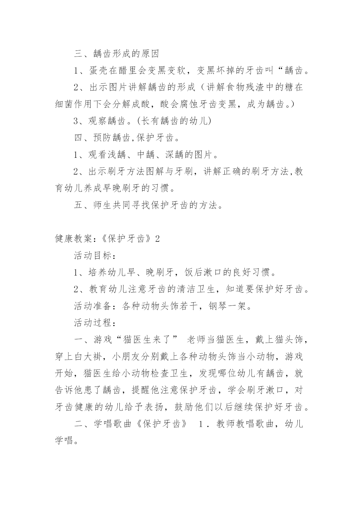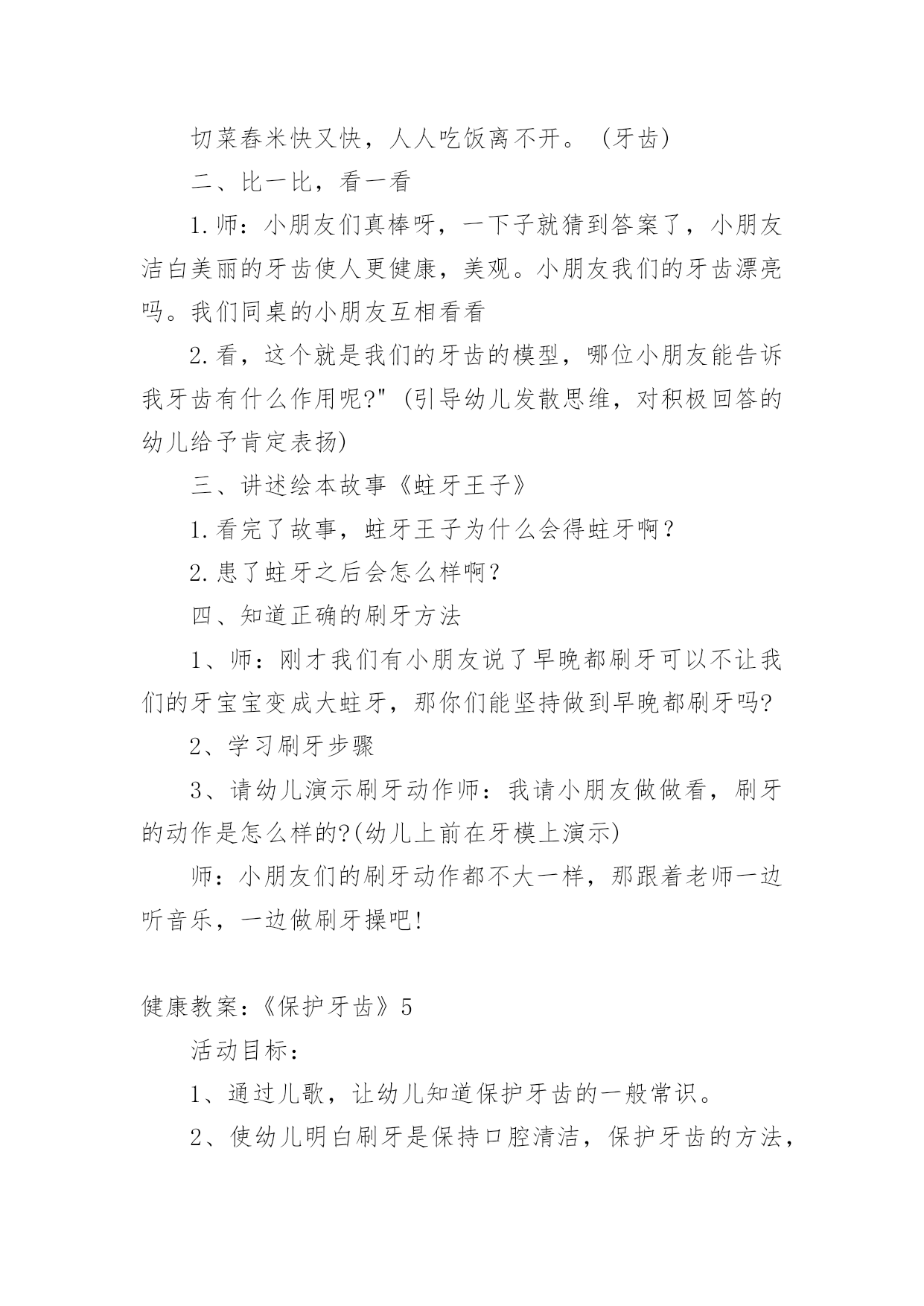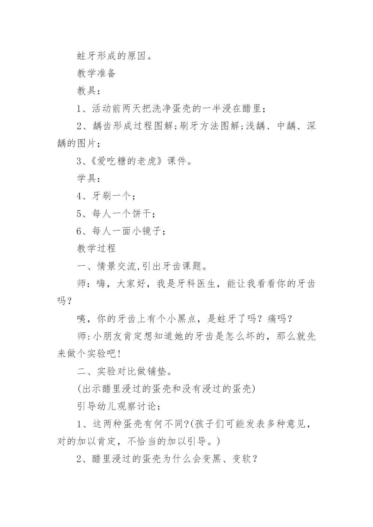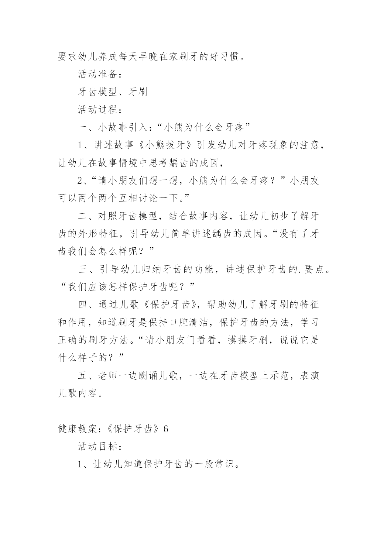 健康教案:《保护牙齿》作为一位杰出的教职工,时常要开展教案准备工作,教案有助于顺利而有效地开展教学活动。那么问题来了,教案应该怎么写?下面是小编为大家收集的健康教案:《保护牙齿》,欢迎阅读,希望大家能够喜欢。健康教案:《保护牙齿》1设计意图在日常活动中,我发现幼儿对牙齿的了解并不深入,有坚持早晚刷牙习惯的幼儿并不多,许多小朋友都检查出了龋齿,如何保护牙齿成了一件迫不及待的事。但关于牙齿的保健常识却知之甚少。让幼儿亲身体验龋齿的形成原因以及了解预防龋齿的有关知识,必须尽快让幼儿掌握正确的刷牙方法,了解牙齿的保健常识。从而达到教育幼儿坚持早晚刷牙,养成早晚刷牙的'良好卫生习惯的目标。教学目标1、使幼儿了解龋齿形成的原因以及预防龋齿的有关知识,掌握正确的刷牙方法。2、教育幼儿坚持早晚刷牙,养成早晚刷牙的良好卫生习惯。活动重点:了解牙齿的重要性,学会正确的刷牙方法。活动难点:蛀牙形成的原因。教学准备教具:1、活动前两天把洗净蛋壳的一半浸在醋里;2、龋齿形成过程图解;刷牙方法图解;浅龋、中龋、深龋的图片;3、《爱吃糖的老虎》课件。学具:4、牙刷一个;5、每人一个饼干;6、每人一面小镜子;教学过程一、情景交流,引出牙齿课题。师:嗨,大家好,我是牙科医生,能让我看看你的牙齿吗?咦,你的牙齿上有个小黑点,是蛀牙了吗?痛吗?师:小朋友肯定想知道她的牙齿是怎么坏的,那么就先来做个实验吧!二、实验对比做铺垫。(出示醋里浸过的蛋壳和没有浸过的蛋壳)引导幼儿观察讨论:1、这两种蛋壳有何不同?(孩子们可能发表多种意见,对的加以肯定,不恰当的加以引导。)2、醋里浸过的蛋壳为什么会变黑、变软?三、龋齿形成的原因1、蛋壳在醋里会变黑变软,变黑坏掉的牙齿叫“龋齿。2、出示图片讲解龋齿的形成(讲解食物残渣中的糖在细菌作用下会分解成酸,酸会腐蚀牙齿变黑,成为龋齿。)3、观察龋齿。(长有龋齿的幼儿)四、预防龋齿,保护牙齿。1、观看浅龋、中龋、深龋的图片。2、出示刷牙方法图解与牙刷,讲解正确的刷牙方法,教育幼儿养成早晚刷牙的习惯。五、师生共同寻找保护牙齿的方法。健康教案:《保护牙齿》2活动目标:1、培养幼儿早、晚刷牙,饭后漱口的良好习惯。2、教育幼儿注意牙齿的清洁卫生,知道要保护好牙齿。活动准备:各种动物头饰若干,钢琴一架。活动过程:一、游戏“猫医生来了”老师当猫医生,戴上猫头饰,穿上白大褂,小朋友分别戴上各种动物头饰当小动物,游戏开始,猫医生给小动物检查卫生,发现哪位幼儿有龋齿,就告诉他患了龋齿,提醒他注意保护牙齿,学会刷牙漱口,对牙齿健康的幼儿给予表扬,鼓励他们以后继续保护好牙齿。二、学唱歌曲《保护牙齿》1.教师教唱歌曲,幼儿学唱。2.教师弹琴伴奏,幼儿齐唱。3.幼儿边唱歌,边表演动作。三、教师小结:小朋友,以后每天晚上睡觉前和早晨起床后都要刷牙,饭后漱口,少吃糖果和零食,看哪一位小朋友牙齿保护得好。活动延伸1、与家长配合,请他们提醒幼儿坚持每天早、晚用正确的`方法刷牙。2、引导幼儿开展“比比谁的牙齿好”活动。附:谜语《牙齿》健康卫士穿白衣,上下两排真整齐,口中饭菜它磨碎,早晚用刷把澡洗。儿歌《保护牙齿》小小牙齿用处大,吃饭说话都用它,吃过食物漱漱口,早晚记住把牙刷,天天用它要爱护,少生病来健康佳。情境表演:小白兔看见山羊公公,捂着脸“哎哟,哎哟”地叫着,就赶快跑过去问:“山羊公公,您怎样啦?”山羊公公说:“我牙痛的厉害,要去医院拨牙”“为什么您要拨牙呀?”“唉,医生说我从不刷牙,所以牙齿上有许多细菌就在那里筑窝了,牙齿变成了空洞洞,成了细菌的家,所以我一吃东西牙就痛。没办法只好把牙拨掉。”小白兔一听着了急忙说:“山羊公公,有什么办法能不把牙拨掉呢?”山羊说:“你千万要记住,吃完东西要漱口。每天早晚要刷牙,这样你的牙齿就不会有细菌来了。”小白兔一听忙说:“那我得赶快刷牙,可是我不会刷牙怎么办呢?”健康教案:《保护牙齿》3活动目标:1、通过动画课件知道保护牙齿的重要性。2、了解牙齿的功能,增强保护牙齿的意识。3、在游戏中培养幼儿每天早晚在家刷牙的好习惯。活动准备:牙齿模型、牙刷、动画片《小红脸和小蓝脸》、保护牙齿的PPT活动重难点:重点:通过动画课件知道保护牙齿的重要性。难点:学习刷牙的方法并养成每天早晚刷牙的好习惯活动过程:一、开始部分1、教师手拿小杯子,让幼儿闻一闻水是什么味的。提问:(1)你闻的水是什么味?(2)这么臭的水是哪儿的水呢?2、告知孩子水为什么这么臭3、请幼儿说一说餐后是如何漱口的4、教师边动作边示范朗读儿歌。手拿小水杯,喝口清清水,鼓起小嘴巴,发出咕噜噜。连续漱三口,食物残渣全跑掉,我的牙齿最健康。二、进行部分1、看动画《小红脸和小蓝脸》提问:“视频中小明的牙齿为什么会疼?”教师进行总结:小明睡觉还吃甜食,招来了小细菌,小细菌可不老实了在他的.