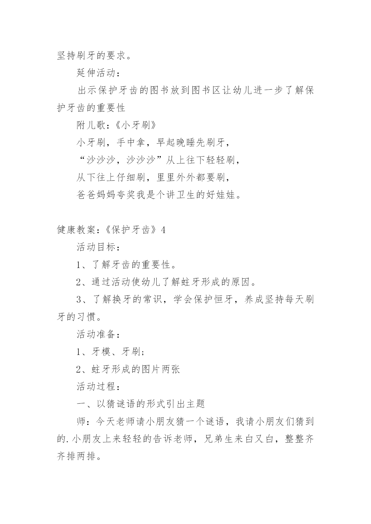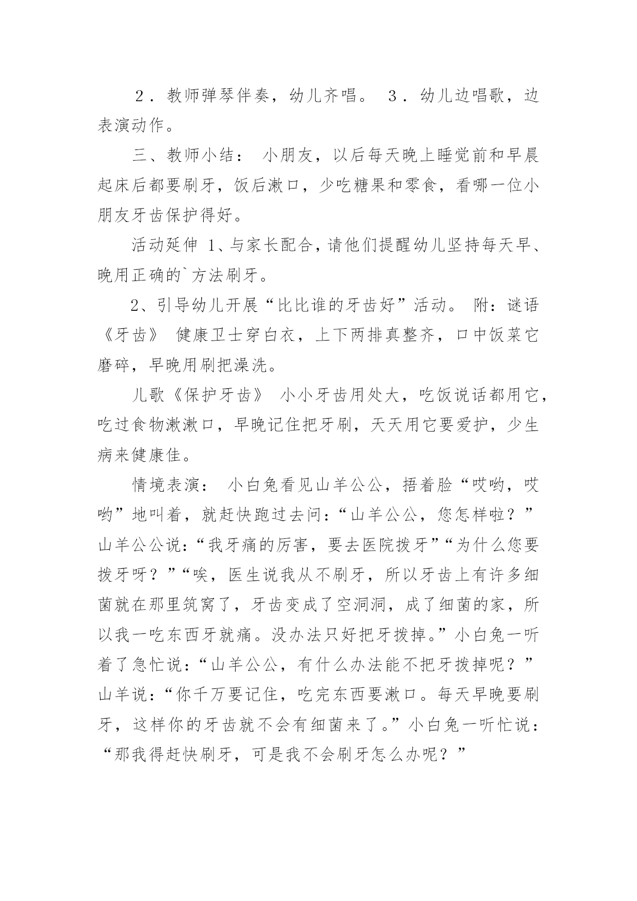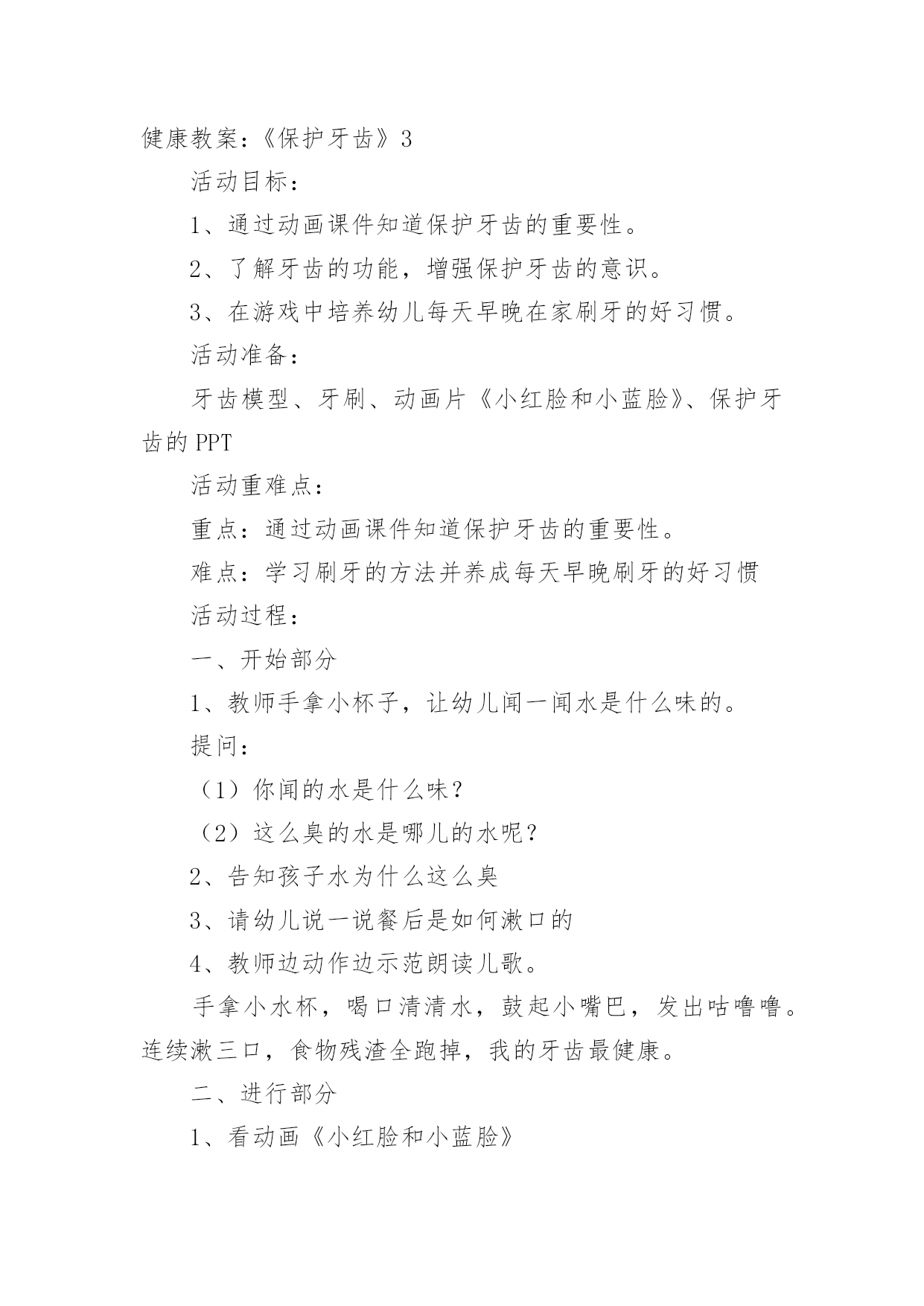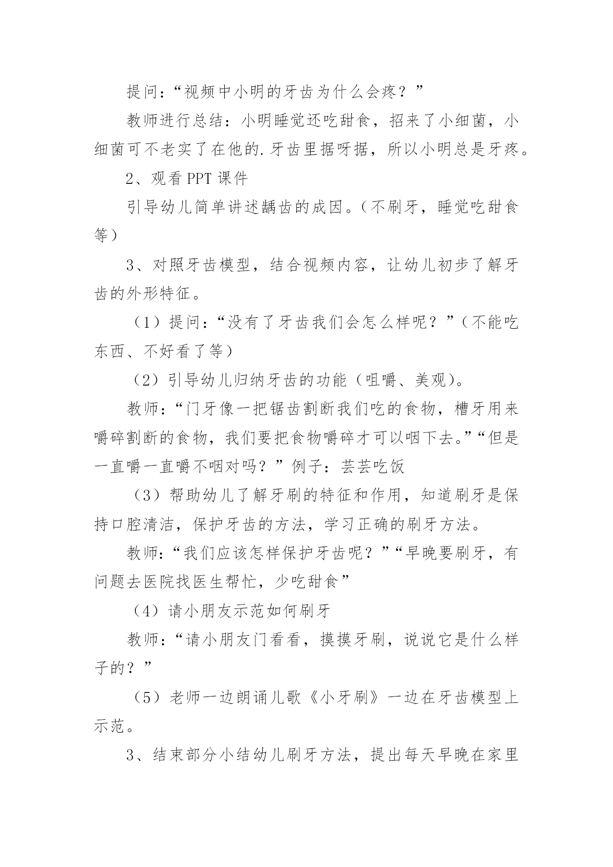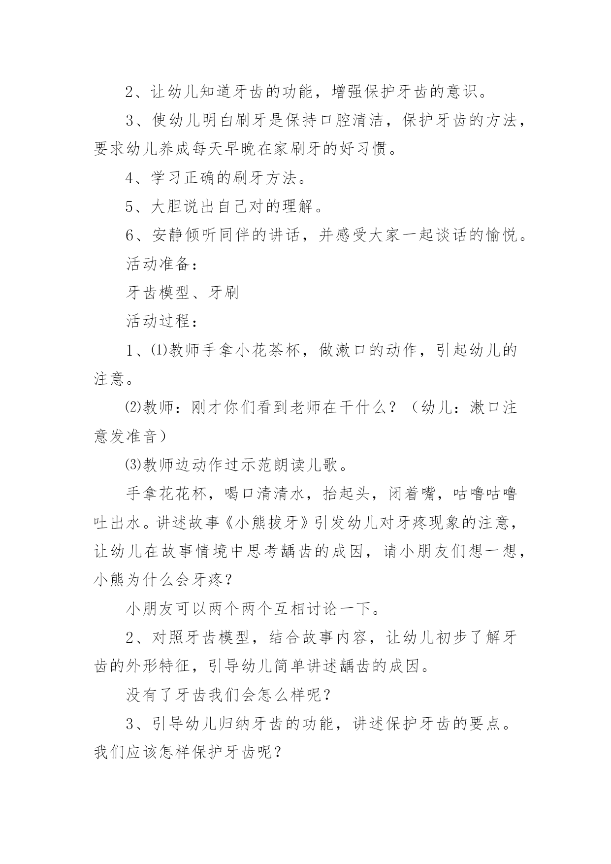 健康教案:《保护牙齿》作为一位杰出的教职工,时常要开展教案准备工作,教案有助于顺利而有效地开展教学活动。那么问题来了,教案应该怎么写?下面是小编为大家收集的健康教案:《保护牙齿》,欢迎阅读,希望大家能够喜欢。健康教案:《保护牙齿》1设计意图在日常活动中,我发现幼儿对牙齿的了解并不深入,有坚持早晚刷牙习惯的幼儿并不多,许多小朋友都检查出了龋齿,如何保护牙齿成了一件迫不及待的事。但关于牙齿的保健常识却知之甚少。让幼儿亲身体验龋齿的形成原因以及了解预防龋齿的有关知识,必须尽快让幼儿掌握正确的刷牙方法,了解牙齿的保健常识。从而达到教育幼儿坚持早晚刷牙,养成早晚刷牙的'良好卫生习惯的目标。教学目标1、使幼儿了解龋齿形成的原因以及预防龋齿的有关知识,掌握正确的刷牙方法。2、教育幼儿坚持早晚刷牙,养成早晚刷牙的良好卫生习惯。活动重点:了解牙齿的重要性,学会正确的刷牙方法。活动难点:蛀牙形成的原因。教学准备教具:1、活动前两天把洗净蛋壳的一半浸在醋里;2、龋齿形成过程图解;刷牙方法图解;浅龋、中龋、深龋的图片;3、《爱吃糖的老虎》课件。学具:4、牙刷一个;5、每人一个饼干;6、每人一面小镜子;教学过程一、情景交流,引出牙齿课题。师:嗨,大家好,我是牙科医生,能让我看看你的牙齿吗?咦,你的牙齿上有个小黑点,是蛀牙了吗?痛吗?师:小朋友肯定想知道她的牙齿是怎么坏的,那么就先来做个实验吧!二、实验对比做铺垫。(出示醋里浸过的蛋壳和没有浸过的蛋壳)引导幼儿观察讨论:1、这两种蛋壳有何不同?(孩子们可能发表多种意见,对的加以肯定,不恰当的加以引导。)2、醋里浸过的蛋壳为什么会变黑、变软?三、龋齿形成的原因1、蛋壳在醋里会变黑变软,变黑坏掉的牙齿叫“龋齿。2、出示图片讲解龋齿的形成(讲解食物残渣中的糖在细菌作用下会分解成酸,酸会腐蚀牙齿变黑,成为龋齿。)3、观察龋齿。(长有龋齿的幼儿)四、预防龋齿,保护牙齿。1、观看浅龋、中龋、深龋的图片。2、出示刷牙方法图解与牙刷,讲解正确的刷牙方法,教育幼儿养成早晚刷牙的习惯。五、师生共同寻找保护牙齿的方法。健康教案:《保护牙齿》2活动目标:1、培养幼儿早、晚刷牙,饭后漱口的良好习惯。2、教育幼儿注意牙齿的清洁卫生,知道要保护好牙齿。活动准备:各种动物头饰若干,钢琴一架。活动过程:一、游戏“猫医生来了”老师当猫医生,戴上猫头饰,穿上白大褂,小朋友分别戴上各种动物头饰当小动物,游戏开始,猫医生给小动物检查卫生,发现哪位幼儿有龋齿,就告诉他患了龋齿,提醒他注意保护牙齿,学会刷牙漱口,对牙齿健康的幼儿给予表扬,鼓励他们以后继续保护好牙齿。二、学唱歌曲《保护牙齿》1.教师教唱歌曲,幼儿学唱。2.教师弹琴伴奏,幼儿齐唱。3.幼儿边唱歌,边表演动作。三、教师小结:小朋友,以后每天晚上睡觉前和早晨起床后都要刷牙,饭后漱口,少吃糖果和零食,看哪一位小朋友牙齿保护得好。活动延伸1、与家长配合,请他们提醒幼儿坚持每天早、晚用正确的`方法刷牙。2、引导幼儿开展“比比谁的牙齿好”活动。附:谜语《牙齿》健康卫士穿白衣,上下两排真整齐,口中饭菜它磨碎,早晚用刷把澡洗。儿歌《保护牙齿》小小牙齿用处大,吃饭说话都用它,吃过食物漱漱口,早晚记住把牙刷,天天用它要爱护,少生病来健康佳。情境表演:小白兔看见山羊公公,捂着脸“哎哟,哎哟”地叫着,就赶快跑过去问:“山羊公公,您怎样啦?”山羊公公说:“我牙痛的厉害,要去医院拨牙”“为什么您要拨牙呀?”“唉,医生说我从不刷牙,所以牙齿上有许多细菌就在那里筑窝了,牙齿变成了空洞洞,成了细菌的家,所以我一吃东西牙就痛。没办法只好把牙拨掉。”小白兔一听着了急忙说:“山羊公公,有什么办法能不把牙拨掉呢?”山羊说:“你千万要记住,吃完东西要漱口。每天早晚要刷牙,这样你的牙齿就不会有细菌来了。”小白兔一听忙说:“那我得赶快刷牙,可是我不会刷牙怎么办呢?”健康教案:《保护牙齿》3活动目标:1、通过动画课件知道保护牙齿的重要性。2、了解牙齿的功能,增强保护牙齿的意识。3、在游戏中培养幼儿每天早晚在家刷牙的好习惯。活动准备:牙齿模型、牙刷、动画片《小红脸和小蓝脸》、保护牙齿的PPT活动重难点:重点:通过动画课件知道保护牙齿的重要性。难点:学习刷牙的方法并养成每天早晚刷牙的好习惯活动过程:一、开始部分1、教师手拿小杯子,让幼儿闻一闻水是什么味的。提问:(1)你闻的水是什么味?(2)这么臭的水是哪儿的水呢?2、告知孩子水为什么这么臭3、请幼儿说一说餐后是如何漱口的4、教师边动作边示范朗读儿歌。手拿小水杯,喝口清清水,鼓起小嘴巴,发出咕噜噜。连续漱三口,食物残渣全跑掉,我的牙齿最健康。二、进行部分1、看动画《小红脸和小蓝脸》提问:“视频中小明的牙齿为什么会疼?”教师进行总结:小明睡觉还吃甜食,招来了小细菌,小细菌可不老实了在他的.