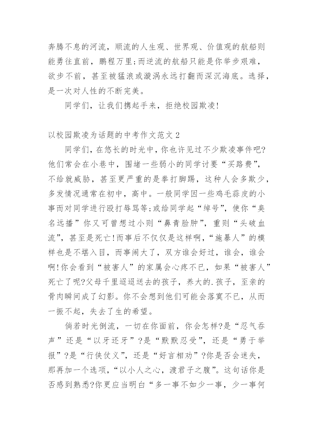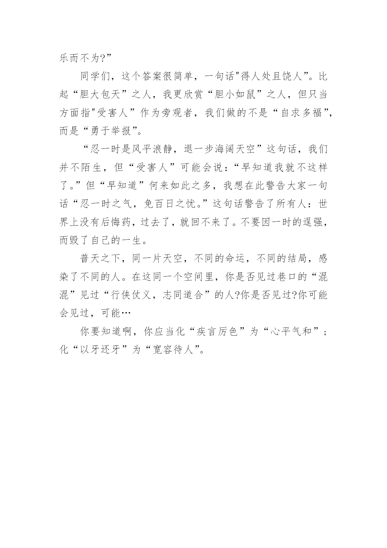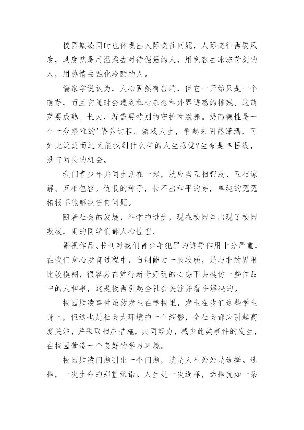 以校园欺凌为话题的中考作文以校园欺凌为话题的中考作文范文在我们平凡的日常里,大家或多或少都会接触过作文吧,借助作文可以宣泄心中的情感,调节自己的心情。那么一般作文是怎么写的呢?下面是小编精心整理的以校园欺凌为话题的中考作文范文,仅供参考,欢迎大家阅读。以校园欺凌为话题的中考作文范文1校园是我们增长知识、接受教育的地方,本不该为欺凌事件的阴影笼罩,可据有关方面统计,全国绝大多数地区未成年人犯罪增多,有些地区年增幅在30%以上,作案者和受害者绝大多数为像我们这样的在校学生。从80年代末到现在已出现了一个未成年人犯罪高峰,我国出现的校园欺凌事件并不是孤立的。由于影视业的商业化,欺凌恐怖影视作品越来越多,充斥我们的视野,许多作品中对于犯罪过程细节的描述,成了不少青少年模仿的根源,而校园又成了他们“付诸实践“的理想场所。校园欺凌事件的存在,受影响的绝非个别学生,我们全体青少年都会受此不良影响。校园本应是我们学习的净土,但屡见不鲜的校园欺凌却打破了校园应有的宁静。花季少年身上的欺凌倾向十分令人担忧。说来说去,就是一句话“冤冤相报何时了?“校园欺凌同时也体现出人际交往问题,人际交往需要风度,风度就是用温柔去对待倔强的人,用宽容去冰冻苛刻的人,用热情去融化冷酷的人。儒家学说认为,人心固然有善端,但它一开始只是一个萌芽,而且它随时会遭到私心杂念和外界诱惑的摧残。这萌芽要成熟、长大,就需要特别的守护和滋养。提高德性是一个十分艰难的'修养过程。游戏人生,看起来固然潇洒,可如此泛泛而过又能找到什么样的人生感觉?生命是单程线,没有回头的机会。我们青少年共同生活在一起,就应当互相帮助、互相谅解、互相包容。仇恨的种子,长不出和平的芽,单纯的冤冤相报不能解决任何问题。随着社会的发展,科学的进步,现在校园里出现了校园欺凌,闹的同学们都人心惶惶。影视作品、书刊对我们青少年犯罪的诱导作用十分严重,在我们身心发育过程中,自制能力一般较弱,是与非的界限比较模糊,很容易在觉得新奇好玩的心态下去模仿一些作品中的人和事,这是极需引起全社会关注并着手解决的。校园欺凌事件虽然发生在学校里,发生在我们这些学生身上,但这也是社会大环境的一个缩影,全社会都应引起高度关注,并采取相应措施,共同努力,减少此类事件的发生,在校园营造一个良好的学习环境。校园欺凌问题引出一个问题,就是人生处处是选择。选择,一次生命的郑重承诺。人生是一次选择,选择犹如一条奔腾不息的河流,顺流的人生观、世界观、价值观的航船则能勇往直前,鹏程万里;而逆流的航船只能是你举步艰难,欲步不前,甚至被猛浪或漩涡永远打翻而深沉海底。选择,是一次对人性的不断完美。同学们,让我们携起手来,拒绝校园欺凌!以校园欺凌为话题的中考作文范文2同学们,在悠长的时光中,你也许见过不少欺凌事件吧?他们常会在小巷中,围堵一些弱小的同学讨要“买路费”,不给就威胁,甚至更严重的是拳打脚踢,这种人会多欺少,多发情况通常在初中,高中。一般同学因一些鸡毛蒜皮的小事而对同学进行殴打辱骂等;或给同学起“绰号”,使你“臭名远播”你又可曾想过小则“鼻青脸肿”,重则“头破血流”,甚至是死亡!而事后不仅仅是这样啊,“施暴人”的模样也是不堪入目,而事闹大了,双方谁会好过,谁会,谁会啊!你会看到“被害人”的家属会心疼不已,如果“被害人”死亡了呢?父母千里迢迢送去的孩子,养大的.孩子,至亲的骨肉瞬间成了幻影。你不会想到他们可能会落寞不已,从而一振不起,失去了生的希望。倘若时光倒流,一切在你面前,你会怎样?是“忍气吞声”还是“以牙还牙”?是“默默忍受”,还是“勇于举报”?是“行侠仗义”,还是“好言相劝”?你是否会迷失,那再加一个选项,“以小人之心,渡君子之腹”。这句话你是否感到熟悉?你更应当明白“多一事不如少一事,少一事何乐而不为?”同学们,这个答案很简单,一句话"得人处且饶人”。比起“胆大包天”之人,我更欣赏“胆小如鼠”之人,但只当方面指"受害人”作为旁观者,我们做的不是“自求多福”,而是“勇于举报”。“忍一时是风平浪静,退一步海阔天空”这句话,我们并不陌生,但“受害人”可能会说:“早知道我就不这样了。”但“早知道”何来如此之多,我想在此警告大家一句话“忍一时之气,免百日之忧。”这句话警告了所有人:世界上没有后悔药,过去了,就回不来了。不要因一时的逞强,而毁了自己的一生。普天之下,同一片天空,不同的命运,不同的结局,感染了不同的人。在这同一个空间里,你是否见过巷口的“混混”见过“行侠仗义,志同道合”的人?你是否见过?你可能会见过,可能…你要知道啊,你应当化“疾言厉色”为“心平气和”;化“以牙还牙”为“宽容待人”。