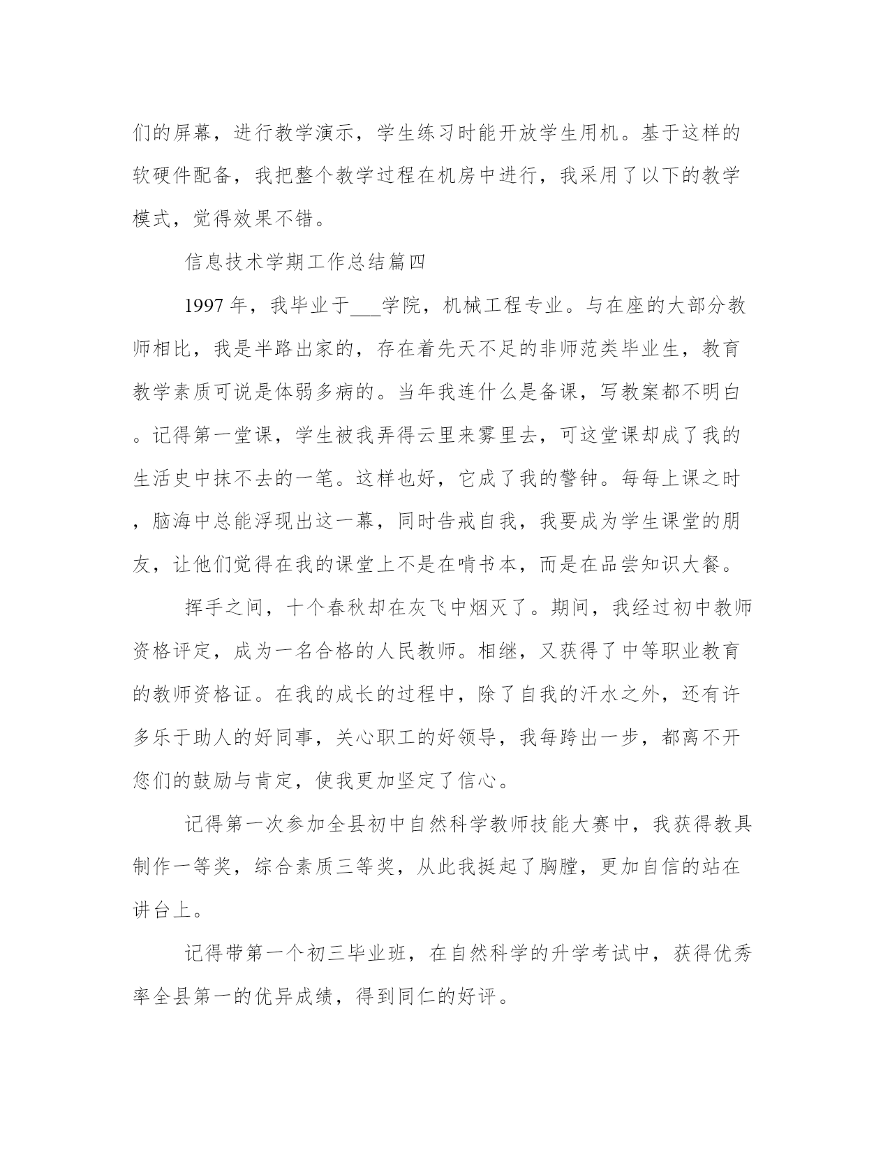 信息技术学期工作总结(实用8篇)总结是在一段时间内对学习和工作生活等表现加以总结和概括的一种书面材料,它可以促使我们思考,我想我们需要写一份总结了吧。大家想知道怎么样才能写一篇比较优质的总结吗?以下是小编精心整理的总结范文,供大家参考借鉴,希望可以帮助到有需要的朋友。信息技术学期工作总结篇一本学期,我担任三年级、五年级的信息技术和三(1)班、三(4)班科学的教学工作。回顾这一学期,本人能够努力工作,认真学习,顺利完成了教学和管理工作。在工作中我享受到收获的喜悦,也发现了一些存在的问题。以下我分学科对自己的教学工作作出总结。认真备课。虽然没有把所有的教案都写在备课本上,但我重温了一遍中学信息技术课程指导纲要,拿到教材后进行了认真的钻研,找出重点、难点。上网查资料,集中别人的优点确定自己的教学思路。为了学生能更直观地感受所学的知识内容,我积极制作课件,准备各种直观教学软件,搜集制作各知识点、优秀作品展示给学生。努力上好每节课。做好课前准备,不打无准备之仗,尤其本学科主要课程都要上机完成,开学初我就把所有电脑重新安装了系统,并按教学需求安装了必须的应用软件,还特别想办法给每台电脑安装了硬盘保护系统,保证每台电脑在不出硬件故障的情况下正常运行。上课时认真讲课,力求抓住重点,突破难点,精讲精练。运用多种教学方法,从学生的实际出发,注意调动学生学习的积极性和创造性思维,使学生有举一反三的能力。在学生完成上机任务时,在各台计算机前巡视,注意对学困生进行手把手的辅导,课后及时做反思,找出不足。我自知自己是半路出家,业务知识不够扎实,不够精深。因此课外自觉学习业务知识,努力提高自己的业务水平。除了听课、评课、参加教研组教研活动外,我还注意到要自学。积极学习各种理论,以充实自己,以便在工作中以坚实的理论作为指导,更好地进行教育教学。我还利用业余时间认真学习专业知识,学习制作课件、网站,为学校的教育教学服务。在工作中,我时常会碰到一些问题,有些经过思考改进已经解决。有些还需要一段时间来提高和改进。以下几方面是我的努力方向:(1)加强机房纪律和机器使用道德方面的教育,使学生不仅在班级集中注意力学习,在机房上机时也要按规定严格约束自己。(2)在网站设计和多媒体课件制作上下功夫,努力使学校的多媒体课件的水平在原有的基础上有更大的进步。(3)对差生多些关心,多点爱心,再多一些耐心,使他们在对计算机的认识上有更大进步。(4)加强自身基本功的训练,课堂上做到精讲精练,注重对学生能力的培养,知识上做到课课清、段段清。科学学科是我今年新任教的学科,以前只任过一年的六年级常识。但我知道这门课知识面非常广,实验非常多,不仅要让学生掌握很多的知识,更要培养学生动手和分析的能力,因此,对于这门学科,我丝毫不敢怠慢。拿到科学教材后,我整体浏览了遍,初步了解了一下本学期的教学内容。然后,我又仔细研读了教师用书,对教学目标和教学方法有了大致的认识。上课前,我认真研读教材和教师用书,上网查阅资料,先理清整个单元的教学思路,找出重点难点,然后根据本地环境和学校实际开始教学设计。在做教学设计时,我尽量体现学生的主体地位,让学生去自主探究,产生对科学的兴趣,掌握自主学习的方法,锻炼自主分析的能力。科学课有很多的实验,这些实验能帮助学生更好地进行探究活动。但由于学校场地有限,实验室不够,我和余武来老师的又有很多时候是冲突的,所以实验很难进行。因此,我在课前就精心准备,尽量每个实验都做,虽然只是演示实验,但也能给学生以直观的感受,引起他们的好奇心,吸引他们的注意,引导他们进行观察和思考。有时候,我又在课堂上引导学生设计实验,强调注意的要点,在有条件的情况下,布置学生回家去进行实验,填写好实验记录,回校后再与同学们一起交流。课堂上,我尽量做到精讲,注重引导学生去观察、回忆和思考。认真作好板书,对知识点进行有条理的梳理。并尽量在课堂上空出一定的时间让学生进行作业,对整堂课学习的内容进行总结和回顾,及时查找出不足之处。课后及时反思课堂上遇到的问题,有不懂的时候就跑去请教有经验的余武来老师,在他的指导下使我又有了新的认识,教学能力又得到了提高。对于学生在课堂上完成的每次作业,我都认真批改。尤其是第一单元,我详细作了记录,了解了学生对知识的掌握情况,知道了哪些学生在学习上是有困难的。在以后教学中,我就特别注意照顾到他们。在期末复习期间,我带领学生先全面复习了四个单元的内容,把所有知识点进行了罗列。然后我又有针对性地对一些学生比较有困难的和未曾见到过的内容进行了重点指导,帮助他们克服难题。总之,在这一学期中,我不仅在业务能力上,还是在教育教学上都有了一定的提高。金无足赤,人无完人,在教学工作中难免有缺陷,例如,课堂语言平缓,语言不够生动,理论知识不够,教学经
