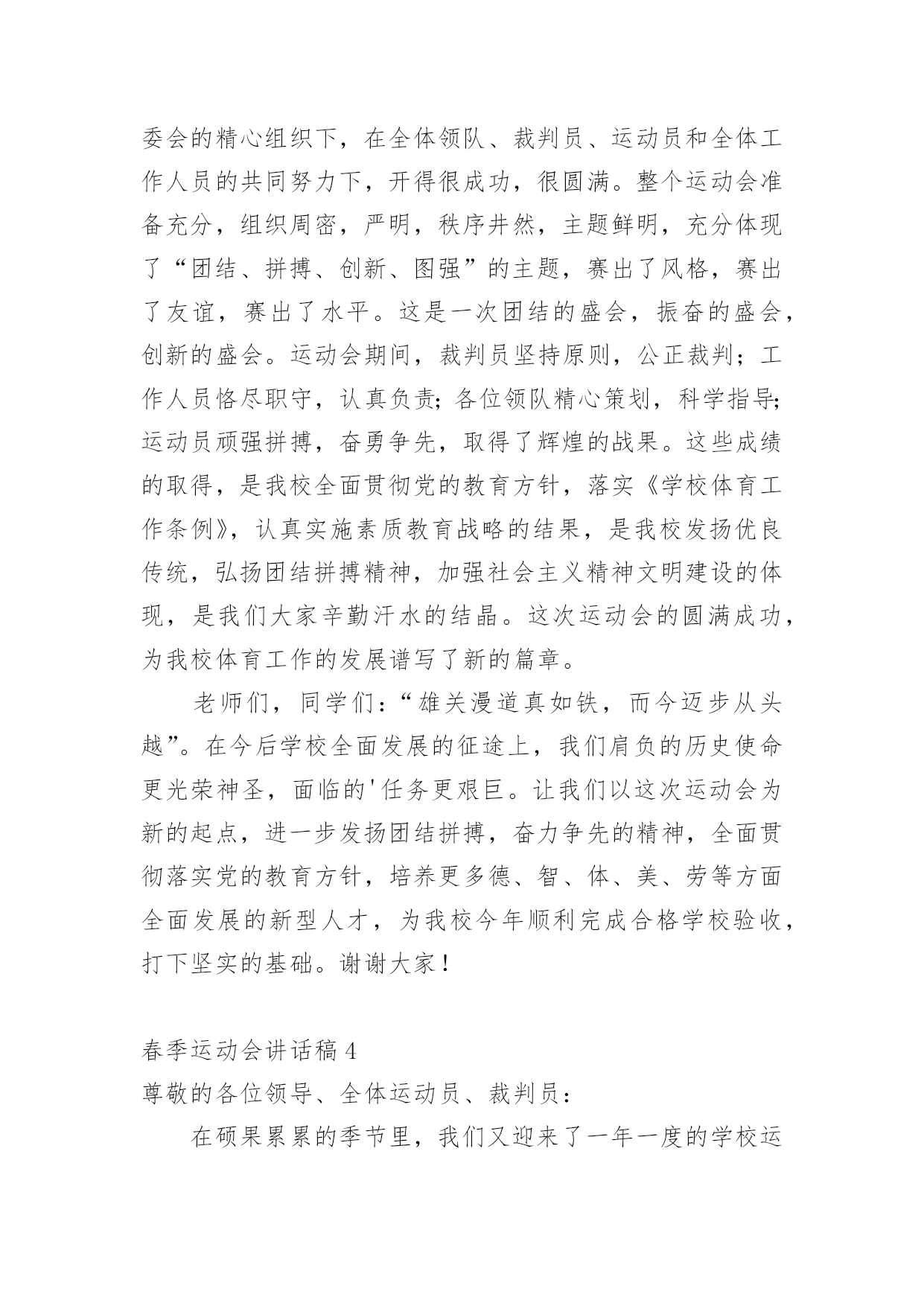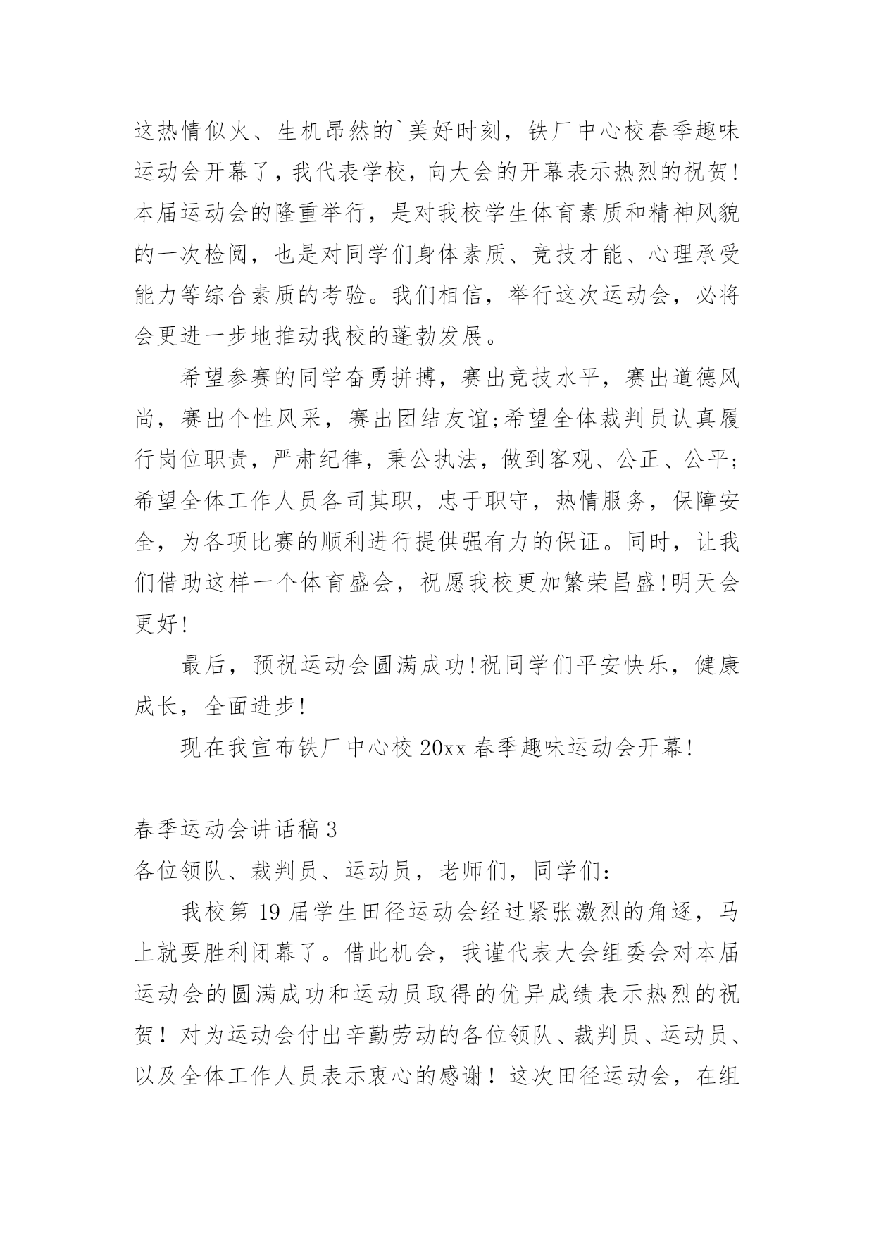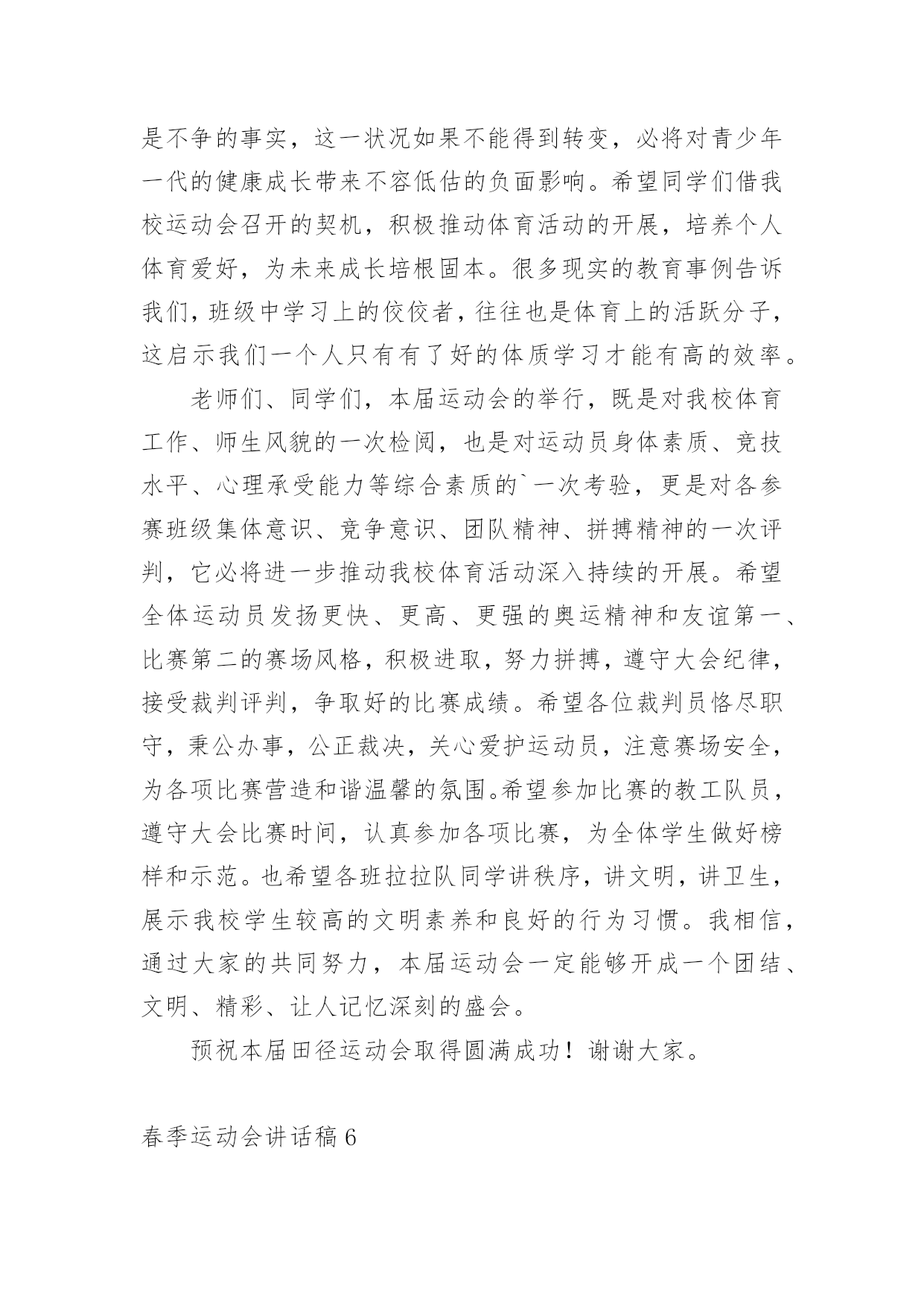 春季运动会讲话稿在社会发展不断提速的今天,各种讲话稿频频出现,讲话稿通过讲话人口头表达后,可以起到传播真理、经验,抒发感情,发表意见的作用。相信写讲话稿是一个让许多人都头痛的问题,下面是小编为大家整理的春季运动会讲话稿,仅供参考,欢迎大家阅读。春季运动会讲话稿1各位老师,各位同学:大家早上好!春雨滋润了美丽的校园,春天承载着我们的希望,在这春意盎然的季节里,我们即将迎来长河小学春季田径运动会,这是我们期盼已久的日子。运动会是一个让各个班级、每位同学展示风采的舞台。运动会是一个竞技场,优胜劣汰,来不得半点虚假。同一起跑线上,你付出多少汗水,就会有多少回报。没有顽强的拼搏,就不会有优异的成绩;没有坚定的信念,运动场上就不会有你亮丽的身影。为了这次运动会的顺利举行,全校师生做了大量的准备工作。为了开幕式能别开生面,各年级群策群力,班主任们和同学们都认真积极准备,只为了能够更好地展示长小学子的激-情与活力。为了在运动场上能有好的表现,班主任们认真选拔运动员,体育老师们悉心指导。不下雨的清晨和放学后,都能看到同学们在跑道上奔跑,为田径比赛而备战;课间能够听到同学们在交流“怎样能发挥最好”,“如何为班级争光”,每到这个时候,老师都感动于你们的积极心态和集体情怀。但是,运动并不是仅仅体现于一次运动会,它更多地是体现在我们平时的学习和生活中。学校的大课间活动,不少同学做广播操懒懒散散,动作不到位,开展活动时积极性不够,这些都是不好的现象。大课间活动,同学们也要用运动会的精神认真对待,认真到位地完成每一次的.广播操,积极活跃地开展老师安排的体育活动,比如接力赛、短绳、长绳、踢毽子、蛙跳等等。另外,放学后的操场跑道上时常能看到不少班级在跑步,这是非常值得表扬和其他班级学习的。希望在运动会之后能还能看到很多身影在操场上跑步锻炼。在这里,老师也要提醒同学们,运动会不仅仅是运动的盛会,竞技的盛会。也是精神的盛会,友谊的盛会。“重在参与”展现我们的积极心态,“为班级争光”蕴藏着我们的集体主义情怀,“虽败犹荣”更深含着我们乐观向上的情操。运动会不仅可以检验我们的运动水平,检验我们班级的凝聚力,还可以充分展示我们同学们朝气蓬勃的精神风貌。因此,运动会上,我们要“赛出水平,赛出风格”!春季运动会讲话稿2尊敬的各位老师、同学们:大家好!在这春光明媚、春风和煦、春暖花开的美好季节里,在这热情似火、生机昂然的`美好时刻,铁厂中心校春季趣味运动会开幕了,我代表学校,向大会的开幕表示热烈的祝贺!本届运动会的隆重举行,是对我校学生体育素质和精神风貌的一次检阅,也是对同学们身体素质、竞技才能、心理承受能力等综合素质的考验。我们相信,举行这次运动会,必将会更进一步地推动我校的蓬勃发展。希望参赛的同学奋勇拼搏,赛出竞技水平,赛出道德风尚,赛出个性风采,赛出团结友谊;希望全体裁判员认真履行岗位职责,严肃纪律,秉公执法,做到客观、公正、公平;希望全体工作人员各司其职,忠于职守,热情服务,保障安全,为各项比赛的顺利进行提供强有力的保证。同时,让我们借助这样一个体育盛会,祝愿我校更加繁荣昌盛!明天会更好!最后,预祝运动会圆满成功!祝同学们平安快乐,健康成长,全面进步!现在我宣布铁厂中心校20xx春季趣味运动会开幕!春季运动会讲话稿3各位领队、裁判员、运动员,老师们,同学们:我校第19届学生田径运动会经过紧张激烈的角逐,马上就要胜利闭幕了。借此机会,我谨代表大会组委会对本届运动会的圆满成功和运动员取得的优异成绩表示热烈的祝贺!对为运动会付出辛勤劳动的各位领队、裁判员、运动员、以及全体工作人员表示衷心的感谢!这次田径运动会,在组委会的精心组织下,在全体领队、裁判员、运动员和全体工作人员的共同努力下,开得很成功,很圆满。整个运动会准备充分,组织周密,严明,秩序井然,主题鲜明,充分体现了“团结、拼搏、创新、图强”的主题,赛出了风格,赛出了友谊,赛出了水平。这是一次团结的盛会,振奋的盛会,创新的盛会。运动会期间,裁判员坚持原则,公正裁判;工作人员恪尽职守,认真负责;各位领队精心策划,科学指导;运动员顽强拼搏,奋勇争先,取得了辉煌的战果。这些成绩的取得,是我校全面贯彻党的教育方针,落实《学校体育工作条例》,认真实施素质教育战略的结果,是我校发扬优良传统,弘扬团结拼搏精神,加强社会主义精神文明建设的体现,是我们大家辛勤汗水的结晶。这次运动会的圆满成功,为我校体育工作的发展谱写了新的篇章。老师们,同学们:“雄关漫道真如铁,而今迈步从头越”。在今后学校全面发展的征途上,我们肩负的历史使命更光荣神圣,面临的'任务更艰巨。让我们以这次运动会为新的起点,进一步发扬团结拼搏,奋力争先的精神,全面贯彻落实党的教育方针,培养更多德、智、体、美、劳等方面全面发展的新型人才,为我校今年顺利完成合格学校验收,打下坚实