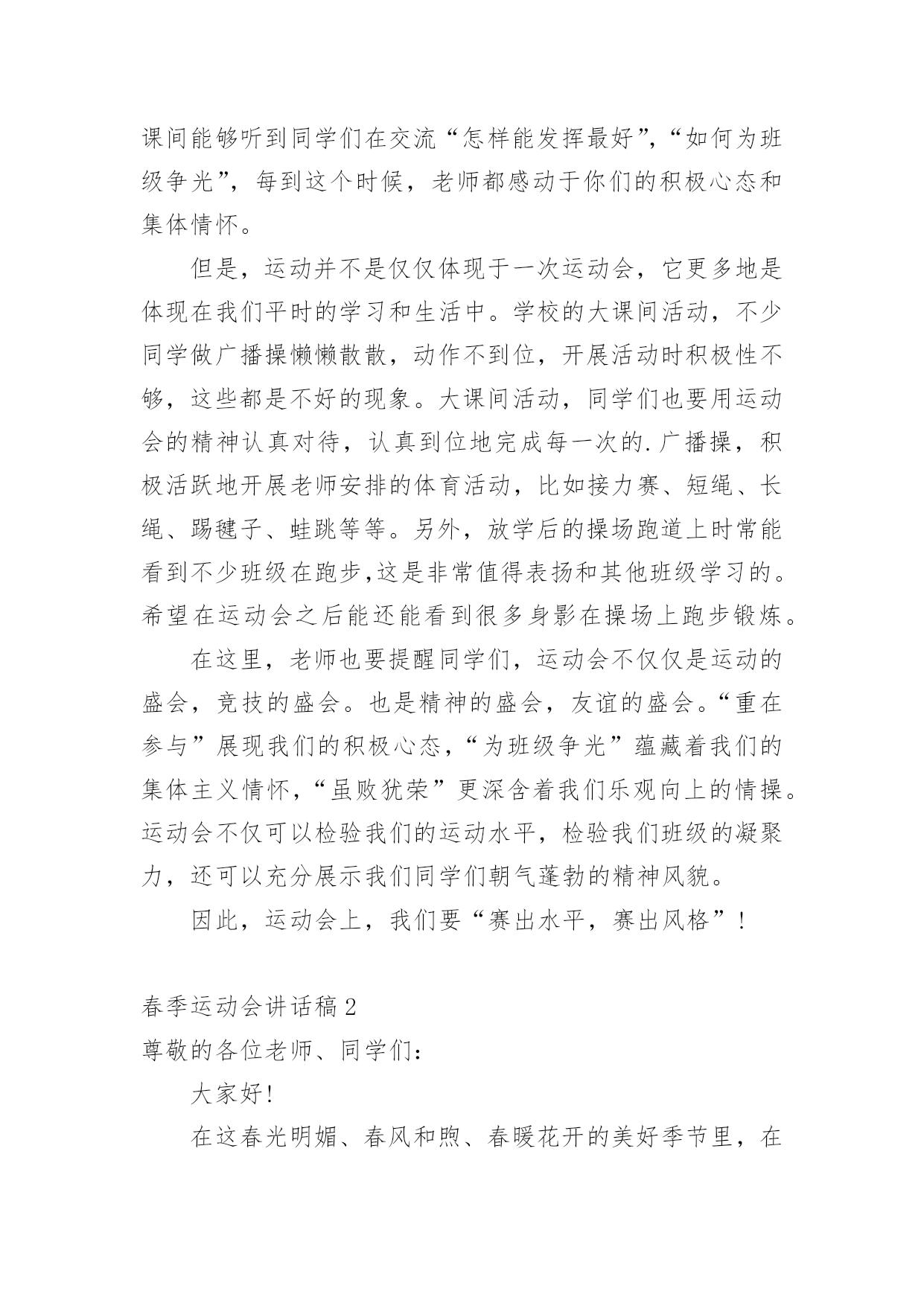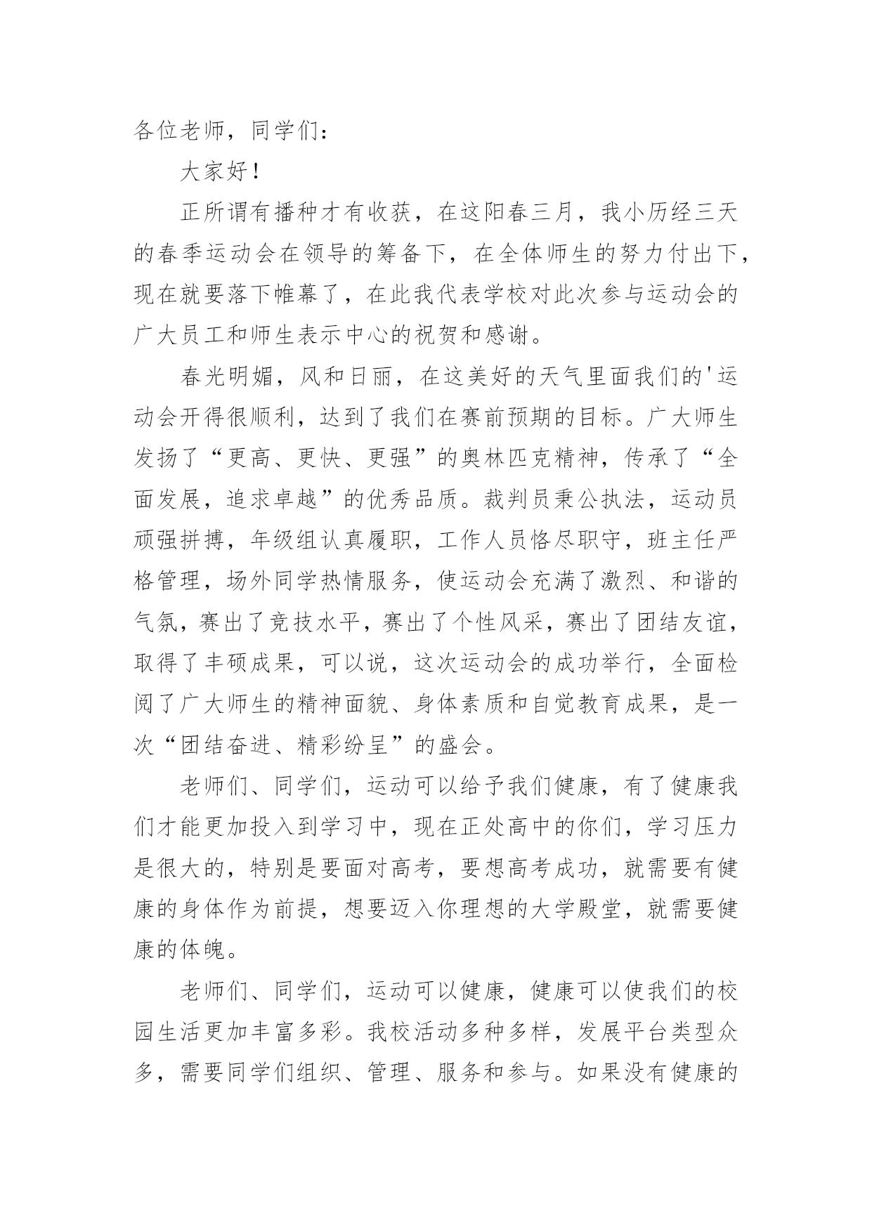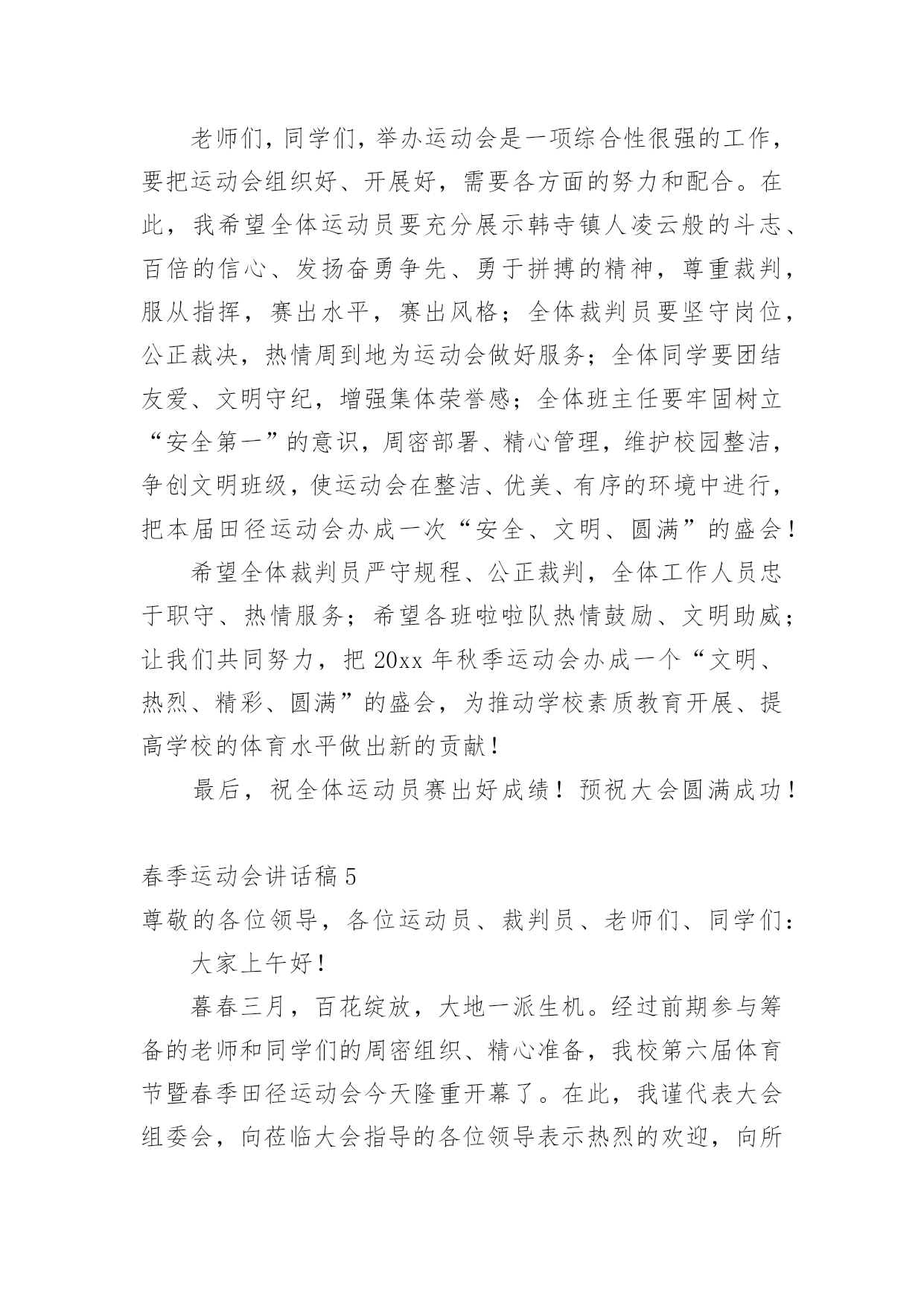 春季运动会讲话稿在社会发展不断提速的今天,各种讲话稿频频出现,讲话稿通过讲话人口头表达后,可以起到传播真理、经验,抒发感情,发表意见的作用。相信写讲话稿是一个让许多人都头痛的问题,下面是小编为大家整理的春季运动会讲话稿,仅供参考,欢迎大家阅读。春季运动会讲话稿1各位老师,各位同学:大家早上好!春雨滋润了美丽的校园,春天承载着我们的希望,在这春意盎然的季节里,我们即将迎来长河小学春季田径运动会,这是我们期盼已久的日子。运动会是一个让各个班级、每位同学展示风采的舞台。运动会是一个竞技场,优胜劣汰,来不得半点虚假。同一起跑线上,你付出多少汗水,就会有多少回报。没有顽强的拼搏,就不会有优异的成绩;没有坚定的信念,运动场上就不会有你亮丽的身影。为了这次运动会的顺利举行,全校师生做了大量的准备工作。为了开幕式能别开生面,各年级群策群力,班主任们和同学们都认真积极准备,只为了能够更好地展示长小学子的激-情与活力。为了在运动场上能有好的表现,班主任们认真选拔运动员,体育老师们悉心指导。不下雨的清晨和放学后,都能看到同学们在跑道上奔跑,为田径比赛而备战;课间能够听到同学们在交流“怎样能发挥最好”,“如何为班级争光”,每到这个时候,老师都感动于你们的积极心态和集体情怀。但是,运动并不是仅仅体现于一次运动会,它更多地是体现在我们平时的学习和生活中。学校的大课间活动,不少同学做广播操懒懒散散,动作不到位,开展活动时积极性不够,这些都是不好的现象。大课间活动,同学们也要用运动会的精神认真对待,认真到位地完成每一次的.广播操,积极活跃地开展老师安排的体育活动,比如接力赛、短绳、长绳、踢毽子、蛙跳等等。另外,放学后的操场跑道上时常能看到不少班级在跑步,这是非常值得表扬和其他班级学习的。希望在运动会之后能还能看到很多身影在操场上跑步锻炼。在这里,老师也要提醒同学们,运动会不仅仅是运动的盛会,竞技的盛会。也是精神的盛会,友谊的盛会。“重在参与”展现我们的积极心态,“为班级争光”蕴藏着我们的集体主义情怀,“虽败犹荣”更深含着我们乐观向上的情操。运动会不仅可以检验我们的运动水平,检验我们班级的凝聚力,还可以充分展示我们同学们朝气蓬勃的精神风貌。因此,运动会上,我们要“赛出水平,赛出风格”!春季运动会讲话稿2尊敬的各位老师、同学们:大家好!在这春光明媚、春风和煦、春暖花开的美好季节里,在这热情似火、生机昂然的`美好时刻,铁厂中心校春季趣味运动会开幕了,我代表学校,向大会的开幕表示热烈的祝贺!本届运动会的隆重举行,是对我校学生体育素质和精神风貌的一次检阅,也是对同学们身体素质、竞技才能、心理承受能力等综合素质的考验。我们相信,举行这次运动会,必将会更进一步地推动我校的蓬勃发展。希望参赛的同学奋勇拼搏,赛出竞技水平,赛出道德风尚,赛出个性风采,赛出团结友谊;希望全体裁判员认真履行岗位职责,严肃纪律,秉公执法,做到客观、公正、公平;希望全体工作人员各司其职,忠于职守,热情服务,保障安全,为各项比赛的顺利进行提供强有力的保证。同时,让我们借助这样一个体育盛会,祝愿我校更加繁荣昌盛!明天会更好!最后,预祝运动会圆满成功!祝同学们平安快乐,健康成长,全面进步!现在我宣布铁厂中心校20xx春季趣味运动会开幕!春季运动会讲话稿3各位领队、裁判员、运动员,老师们,同学们:我校第19届学生田径运动会经过紧张激烈的角逐,马上就要胜利闭幕了。借此机会,我谨代表大会组委会对本届运动会的圆满成功和运动员取得的优异成绩表示热烈的祝贺!对为运动会付出辛勤劳动的各位领队、裁判员、运动员、以及全体工作人员表示衷心的感谢!这次田径运动会,在组委会的精心组织下,在全体领队、裁判员、运动员和全体工作人员的共同努力下,开得很成功,很圆满。整个运动会准备充分,组织周密,严明,秩序井然,主题鲜明,充分体现了“团结、拼搏、创新、图强”的主题,赛出了风格,赛出了友谊,赛出了水平。这是一次团结的盛会,振奋的盛会,创新的盛会。运动会期间,裁判员坚持原则,公正裁判;工作人员恪尽职守,认真负责;各位领队精心策划,科学指导;运动员顽强拼搏,奋勇争先,取得了辉煌的战果。这些成绩的取得,是我校全面贯彻党的教育方针,落实《学校体育工作条例》,认真实施素质教育战略的结果,是我校发扬优良传统,弘扬团结拼搏精神,加强社会主义精神文明建设的体现,是我们大家辛勤汗水的结晶。这次运动会的圆满成功,为我校体育工作的发展谱写了新的篇章。老师们,同学们:“雄关漫道真如铁,而今迈步从头越”。在今后学校全面发展的征途上,我们肩负的历史使命更光荣神圣,面临的'任务更艰巨。让我们以这次运动会为新的起点,进一步发扬团结拼搏,奋力争先的精神,全面贯彻落实党的教育方针,培养更多德、智、体、美、劳等方面全面发展的新型人才,为我校今年顺利完成合格学校验收,打下坚实