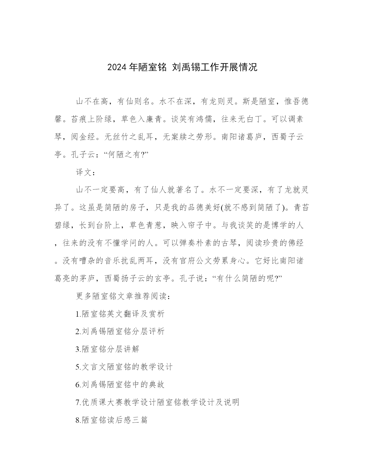 2024年陋室铭刘禹锡工作开展情况山不在高,有仙则名。水不在深,有龙则灵。斯是陋室,惟吾德馨。苔痕上阶绿,草色入廉青。谈笑有鸿儒,往来无白丁。可以调素琴,阅金经。无丝竹之乱耳,无案牍之劳形。南阳诸葛庐,西蜀子云亭。孔子云:“何陋之有?”译文:山不一定要高,有了仙人就著名了。水不一定要深,有了龙就灵异了。这虽是简陋的房子,只是我的品德美好(就不感到简陋了)。青苔碧绿,长到台阶上,草色青葱,映入帘子中。与我谈笑的是博学的人,往来的没有不懂学问的人。可以弹奏朴素的古琴,阅读珍贵的佛经。没有嘈杂的音乐扰乱两耳,没有官府公文劳累身心。它好比南阳诸葛亮的茅庐,西蜀扬子云的玄亭。孔子说:“有什么简陋的呢?”更多陋室铭文章推荐阅读:1.陋室铭英文翻译及赏析2.刘禹锡陋室铭分层评析3.陋室铭分层讲解5.文言文陋室铭的教学设计6.刘禹锡陋室铭中的典故7.优质课大赛教学设计陋室铭教学设计及说明8.陋室铭读后感三篇9.陋室铭公开课优秀教案10.陋室铭原文注释及赏析