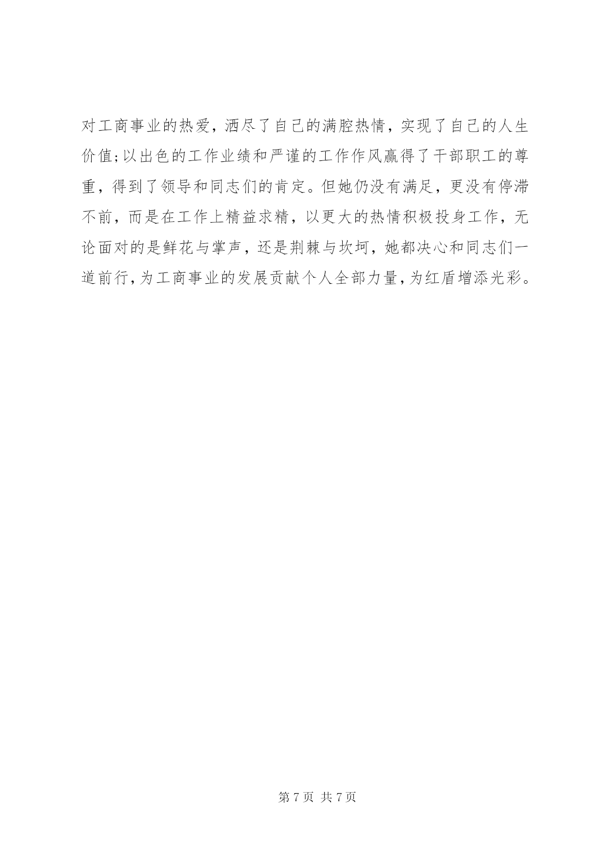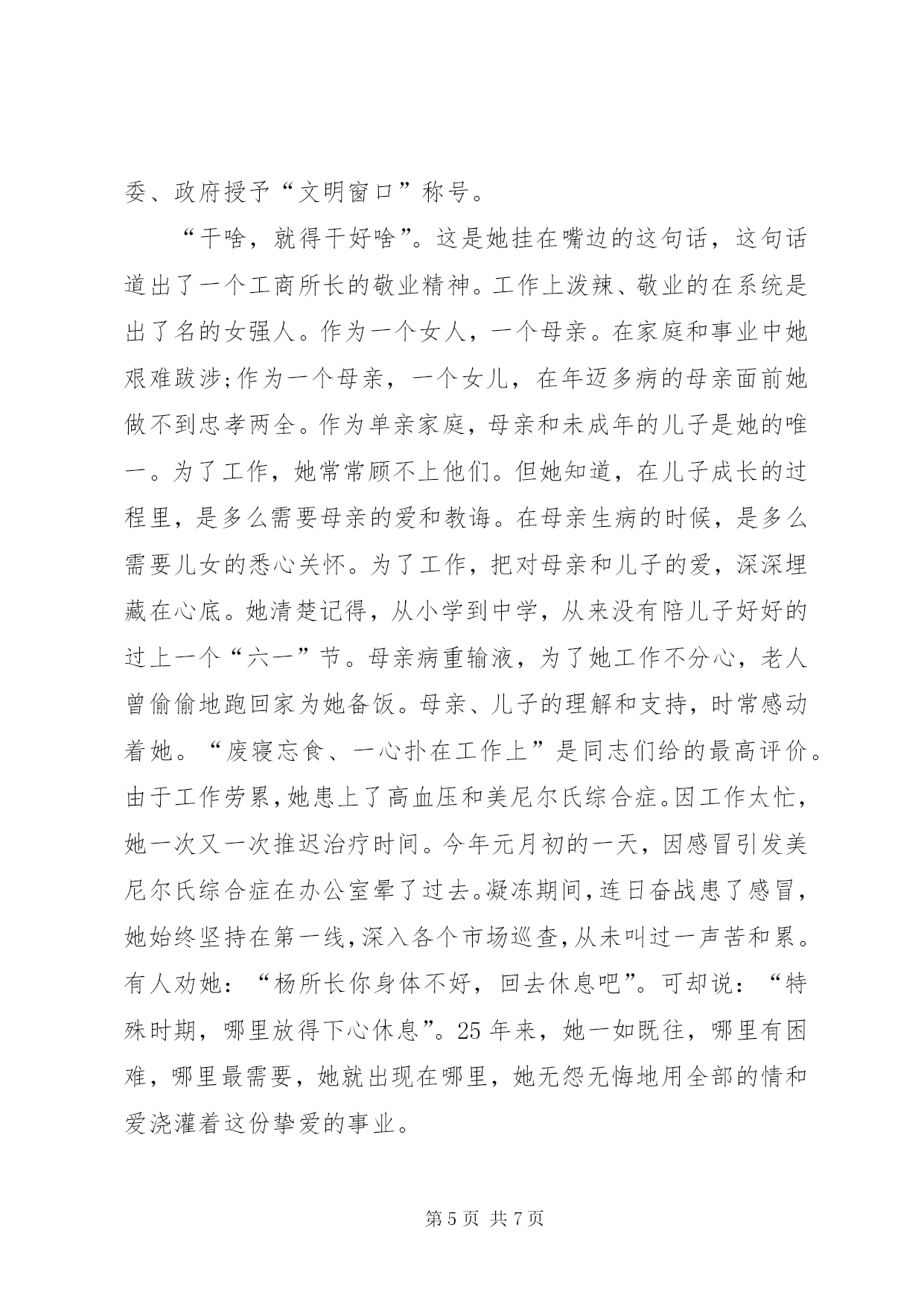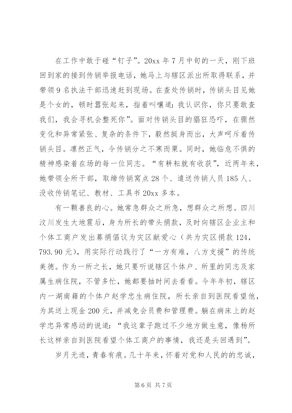 第PAGE\*Arabic\*MERGEFORMAT7页共NUMPAGES\*MERGEFORMAT7页基层工商所长先进事迹材料基层工商所长先进事迹材料“谁说女子不如男”。我工商系统的**,她性格爽朗,待人真诚,工作干练、泼辣。具有大学文化程度的她,今年43岁。从1984年5月参加工作至今,一直从事工商工作。一名普通的共产党员,参加工作十几年来,始终以满腔的工作热情、务实的工作态度,扎实的工作作风,赢得了领导和同志们的认可和好评。她用自己的青春谱写了工商人的那一份执著。她终于职守,认真履行职责,在平凡的工作岗位上作出了不平凡的成绩。她曾在多个基层工商所担任过所长,特别是在大十字工商所任所长不到6年的时间里,连续6年被市工商局评为优秀工作者;20xx至20xx年连续3年被市工商局评为“优秀共产党员”。20xx年被市妇联评为“三八红旗手”,同时分别被XX省工商局和市工商局评为“再就业先进工作者”;06-07年被市评为“整脏治乱先进工作者”。大十字工商所也在她的带领下,年年荣获全系统绩效考评一等奖,20xx年度还被XX省工商局、XX省人事厅授予全省工商系统“先进集体”荣誉称号。在这一连串荣誉的背后,也记载着她脚踏实地,辛勤工作,甘于奉献,执法为民的光荣足迹。常言道。“家合万事兴”。为加强班子团结,要求所领导班子成员之间要讲党性、讲原则,也要讲友谊,讲谅解。所领导干部经常和职工交流思想,沟通情况,增进理解。大家坦诚相见、求同存异,互相尊重、互相支持。大十字工商所的干部职工在她的领导下,精诚团结,和睦相处,快乐的工作着。作为一名工商基层领导干部---工商所所长、党支部书记,她知道,要带好一班人,不仅要具有较强的业务知识,还要有较强的组织和协调能力,这样才能凝聚人心。她从抓学习入手,通过制定严格的学习计划,加强干部职工的政治理论和业务知识的学习,提高干部职工的思想和业务能力。她要求所里的干部职工要做到四个一样,即领导在与不在一个样、上班期间和值班期间一个样、工作期间和八小时以外一个样、有人监督和无人监督一个样。由于她率先垂范,原来轻视学习、放松学习的干部逐渐变成了关心时事政治、要求上进的干部;原来不会干、跟着干、推着干的干部逐渐转为爱岗敬业、安心干、愿意干、积极干的工作先进。几年来,大十字工商所的干部职工在系统举行的练兵比赛中获得优异成绩,成为队伍中的业务标兵和岗位能手。工商所长虽然官不大,但在别人眼里,或对某些人来说,他手中确实有着很大的实权。身在一线,接触形形色色的市场主体,面临着许多诱惑,她洁身自好,两袖清风。她深知“其身正、不令而行,其身不正、虽令不行”的道理。常说,“吃人家的嘴软,拿人家的手短,不吃不占,心里坦然”。她不论亲疏远近,严格按照制度办事,做到一视同仁。一次,一位违法的经营户主为逃避处罚,托熟人拉关系给送礼,希望能高抬贵手,减轻处罚。则对他动之以情,晓之以理,最后,他乐意地接受了工商部门的处罚。做为从小在县里长大的,有很多亲戚朋友同学,要想处理好法与情的关系并非易事。有个开服装店的同学,想用别人的再就业优惠证办理工商营业执照。没有因为同学情面而开“后门”。有时她的亲属朋友对她说:“你当所长我们一点光都沾不上”。就是这样,对权利、对情感有着自己的独到见解。多少次被查违规业户送去的钱物被她拒之门外,多少个体户和关系人的请吃被她推辞,多少次亲戚朋友的说情被她劝阻。除她坚持原则外,她还要求班子成员要常修为政之德、常怀律己之心,自觉抵制拜金主义、享乐主义和极端个人主义的侵蚀。在她的影响下,所里干部令行禁止,拒腐防败蔚然成风,没有一件违法违纪案件发生,无一人受党纪政纪处分。市工商局辖区7个工商所,7个工商所长中,她是唯一的一位女所长。巾帼不让须眉。作为女同志,要管好市区这样一个纷繁复杂的大市场,难度可想而之。但她总是冲锋在前,她始终牢记维护、发展、实现好各类市场主体和消费者的合法利益,构建规范有序、和谐诚信的市场环境是自己工作的奋斗目标。近年来,她带领全所同志深入扎实开展整顿规范市场经济秩序工作。全面清理和规范了经营主体资格;强化了日常监管;健全了市场准入体系;推进了安全监管长效机制建设;建立和完善了一系列监管制度;严厉打击各类违法行为。两年来,她先后组织80余人次深入各类市场开展法律法规的宣传,发放宣传资料20xx0余份;提供咨询服务20xx余人次;现场处理纠纷50起;组织开展各类专项整治80余次,出动执车辆200余台次,执法人员3200余人次,查获各类假冒伪劣商品价值近60余万元。查处各类经济违法违章案件147件,罚款202452余元。受理消费者投诉127起,处理127起,为消费者挽回经济损失42153元。始终认为,工商部门作为职能部基层工商所长先进事迹材料门,执政的目的是为民。她是这样想的,也是这样