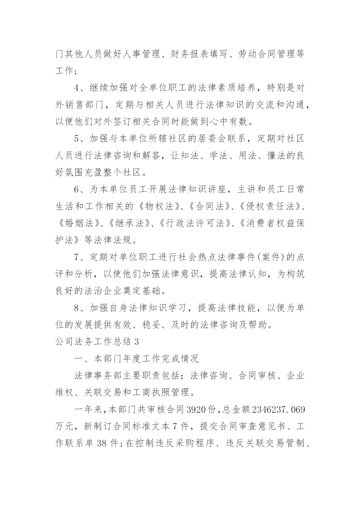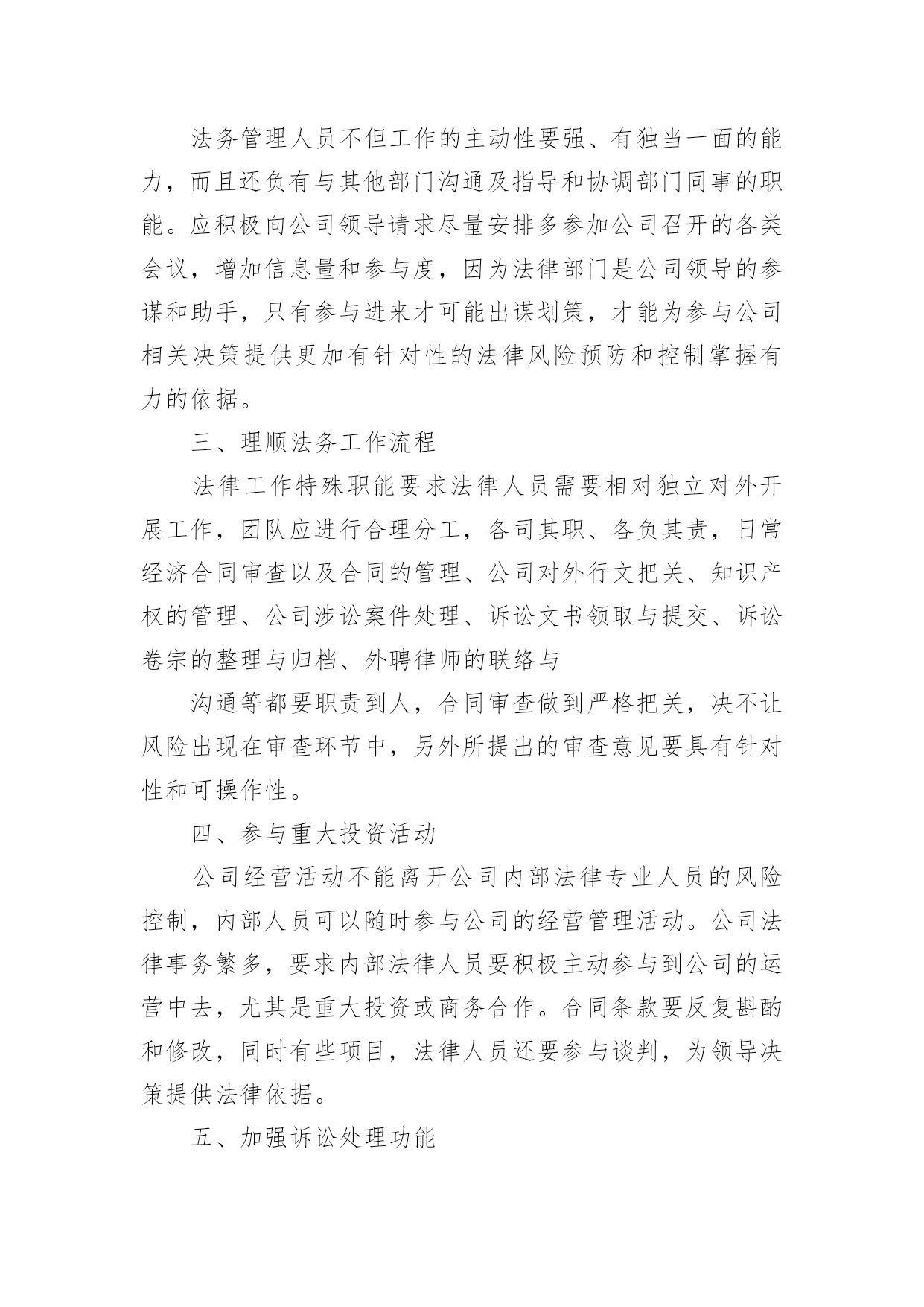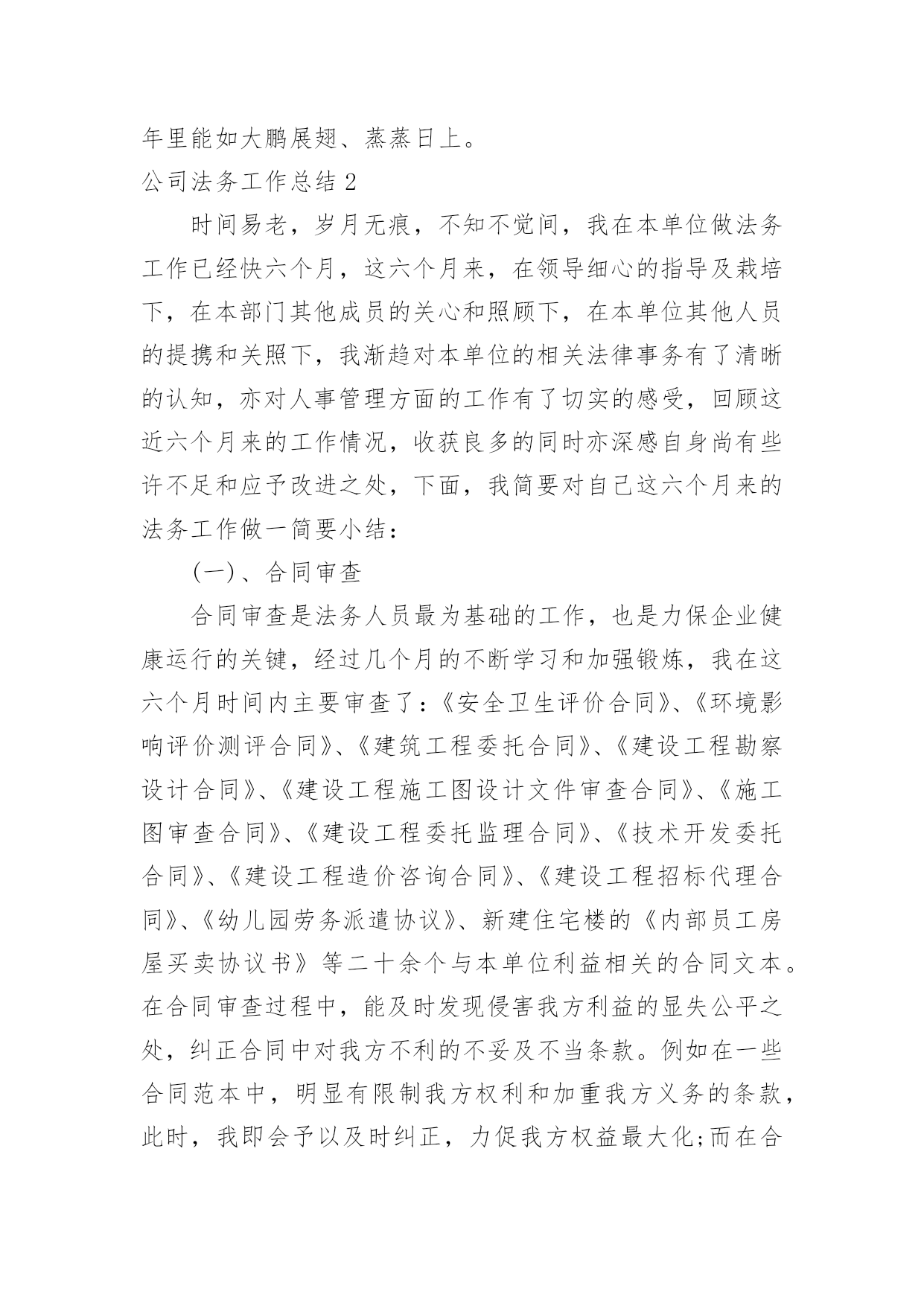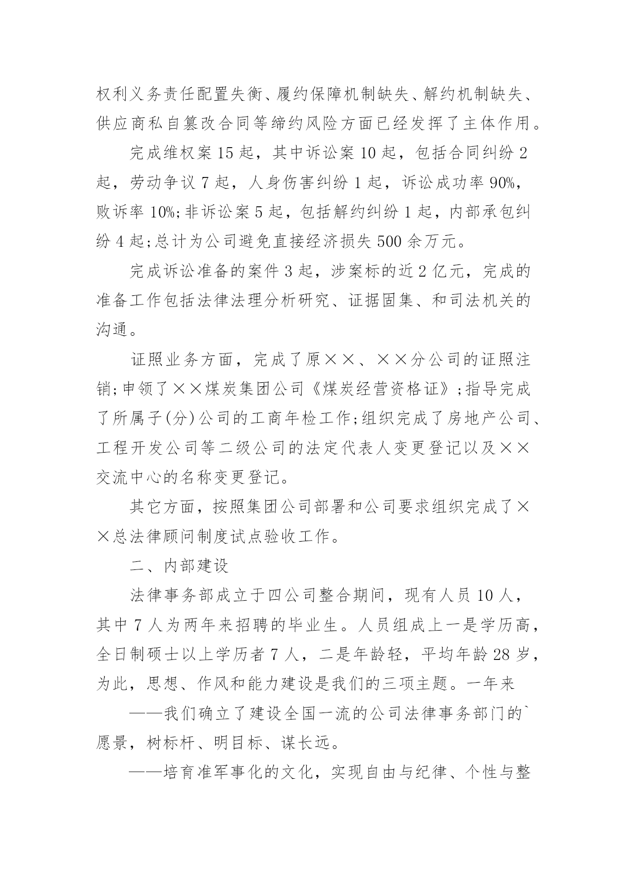 公司法务工作总结公司法务工作总结总结是事后对某一阶段的学习或工作情况作加以回顾检查并分析评价的书面材料,它可以使我们更有效率,让我们抽出时间写写总结吧。如何把总结做到重点突出呢?以下是小编帮大家整理的公司法务工作总结,仅供参考,欢迎大家阅读。公司法务工作总结1时间白驹过隙,匆匆而逝,一晃20xx年上半年已然过去,停下来回头想想,纵有百感交集亦有千头万绪。上半年,主要负责公司合同审查、法律建议及诉讼仲裁执行方面的工作。合同审查:在合同审查方面完善及起草传统业务反担保合同,根据公证处及房管局的要求进行相应的完善。除了审查金马公司日常业务合同外,一年来,也审查了日常活动的合同,比如花卉合同、装饰装修合同、公司员工入职离职相关手续等。法律建议:本公司及在日常运营中,业务人员关于业务办理、合同签订等有诸多法律层面的疑问,我负责随时对他们的疑问给予法律上的建议及指导。诉讼仲裁执行案件:协助处理涉诉案件、协助律所进行追偿,准备律所所需资料,跟进追偿进度。参加培训及部门学习公司组织了早上的学习及培训,通过一段时间的学习交流,丰富了知识面,更有利于工作的开展。些许感悟工作上得益于领导的指点,我也更加明白如何把工作做的更到位,如何处理法律与业务之间的冲突,如何坚守自己的立场,这使我有了很多思考,对我的工作起了更大的作用。对于后期未来工作展望,我希望不断提升自身的`综合素质,平时尽量不影响工作情况下挤出时间参加案件处理与审判,多沟通多交流,透彻了解希望通过合同所想达到的目的,我希望通过自己能为公司切实规避掉风险,努力使自己随时保持精力充沛,快速提升自己。对于公司的建议和意见方面,有三点:第一在经济有下调痕迹的今天,我觉得风控部是一个非常重要的部门,应发挥其作用,增加其决定权。第二,加强培训及学习,只有学习型的企业才能走在前列。第三,完善内部治理结构,责任落实到人,有效解决存在的问题,不能相互推诿,科学的业务操作流程和管理流程才能保障业务持续、稳健的发展,做到制度约束人而不是人约束人。新的一年,希望我和公司能够互相成就,希望公司20xx年里能如大鹏展翅、蒸蒸日上。公司法务工作总结2时间易老,岁月无痕,不知不觉间,我在本单位做法务工作已经快六个月,这六个月来,在领导细心的指导及栽培下,在本部门其他成员的关心和照顾下,在本单位其他人员的提携和关照下,我渐趋对本单位的相关法律事务有了清晰的认知,亦对人事管理方面的工作有了切实的感受,回顾这近六个月来的工作情况,收获良多的同时亦深感自身尚有些许不足和应予改进之处,下面,我简要对自己这六个月来的法务工作做一简要小结:(一)、合同审查合同审查是法务人员最为基础的工作,也是力保企业健康运行的关键,经过几个月的不断学习和加强锻炼,我在这六个月时间内主要审查了:《安全卫生评价合同》、《环境影响评价测评合同》、《建筑工程委托合同》、《建设工程勘察设计合同》、《建设工程施工图设计文件审查合同》、《施工图审查合同》、《建设工程委托监理合同》、《技术开发委托合同》、《建设工程造价咨询合同》、《建设工程招标代理合同》、《幼儿园劳务派遣协议》、新建住宅楼的《内部员工房屋买卖协议书》等二十余个与本单位利益相关的合同文本。在合同审查过程中,能及时发现侵害我方利益的显失公平之处,纠正合同中对我方不利的不妥及不当条款。例如在一些合同范本中,明显有限制我方权利和加重我方义务的条款,此时,我即会予以及时纠正,力促我方权益最大化;而在合同争议解决方式上,一些合同约定的仲裁和诉讼解决方式不甚明确,此时,我即会及时予以指出,要么仲裁要么诉讼,以便明确争议的解决方式,不致产生不必要的纠纷;还有,在一些国家有相关范本的合同中,一些单位会自行修改合同范本,以减轻自身义务,此时,如果不审慎审查,难以查出破绽之处,此时,我即会逐条逐句读完合同,以更正合同范本中已被修改并且减轻对方责任的条款。通过我及时、有效、认真的合同审查和合同把关,大大提高了本单位对外签订合同的履约率,也加速了其他部门工作效率的提高,尽量避免了本单位不必要的'诉讼之苦,力保单位各项工作和各部门工作能健康发展和顺利运行。通过审慎的法律把关和合同审查,在我于本单位工作的六个月时间内,本单位未发生一起诉讼案件,亦未产生任何法律纠纷,这使得本单位职工有充裕的时间搞科研生产和开发,为单位科研创造提供了良好的内部环境和外部氛围。(二)、“xx”普法宣传的知识竞赛出题及阅卷工作20xx年是“xx”普法工作宣传的成果验收年,我单位积极响应国家号召,加强对员工的法律教育和宣传,我1草拟了本单位的“xx”普法宣传的年终总结报告,系统梳理了本单位在“xx”普法工作中所作出的努力和贡献,并对全单位六百余名员工进行了法律知识答卷考评,全单位员工积极答卷,试卷回收有效率达100%。这有效增强了全所员工的法律素养,