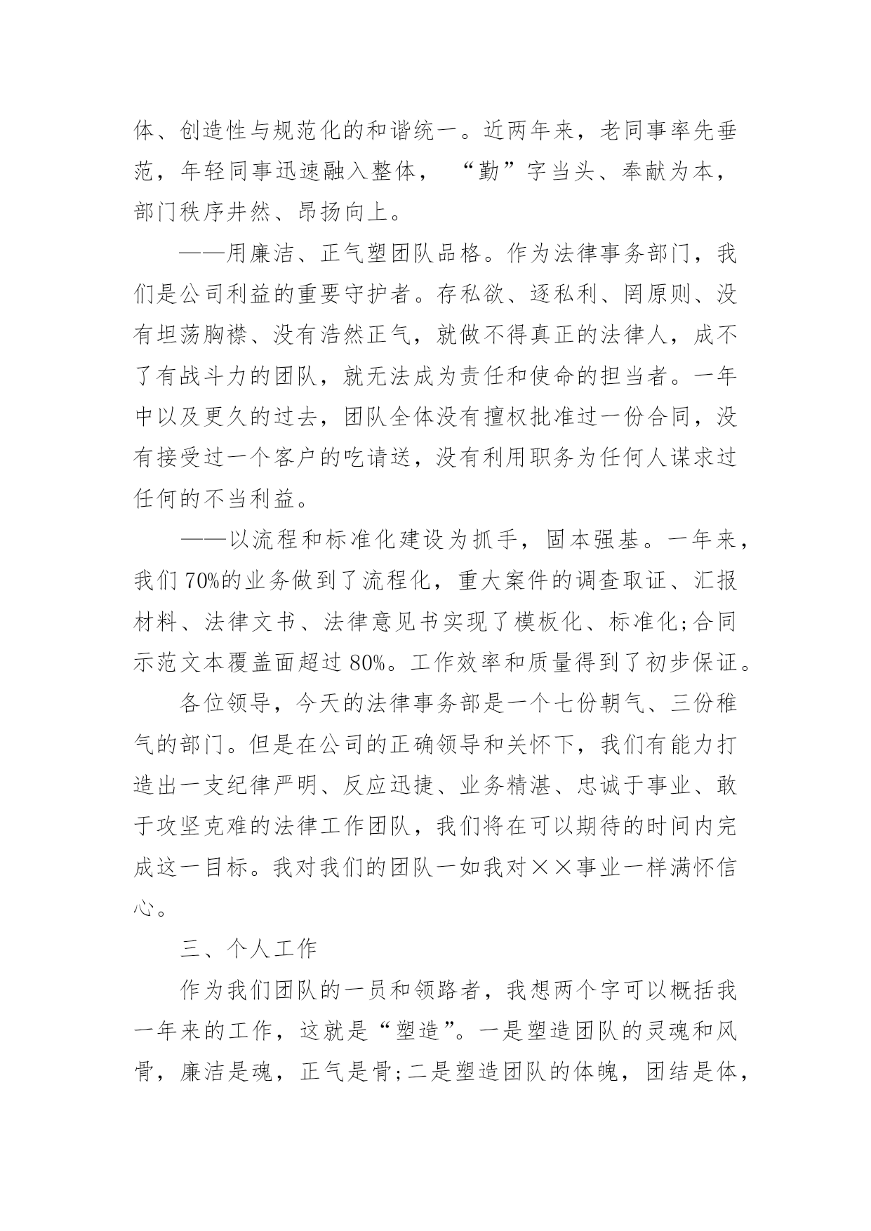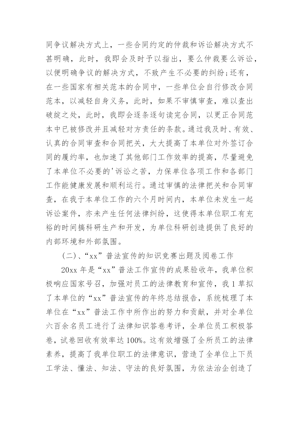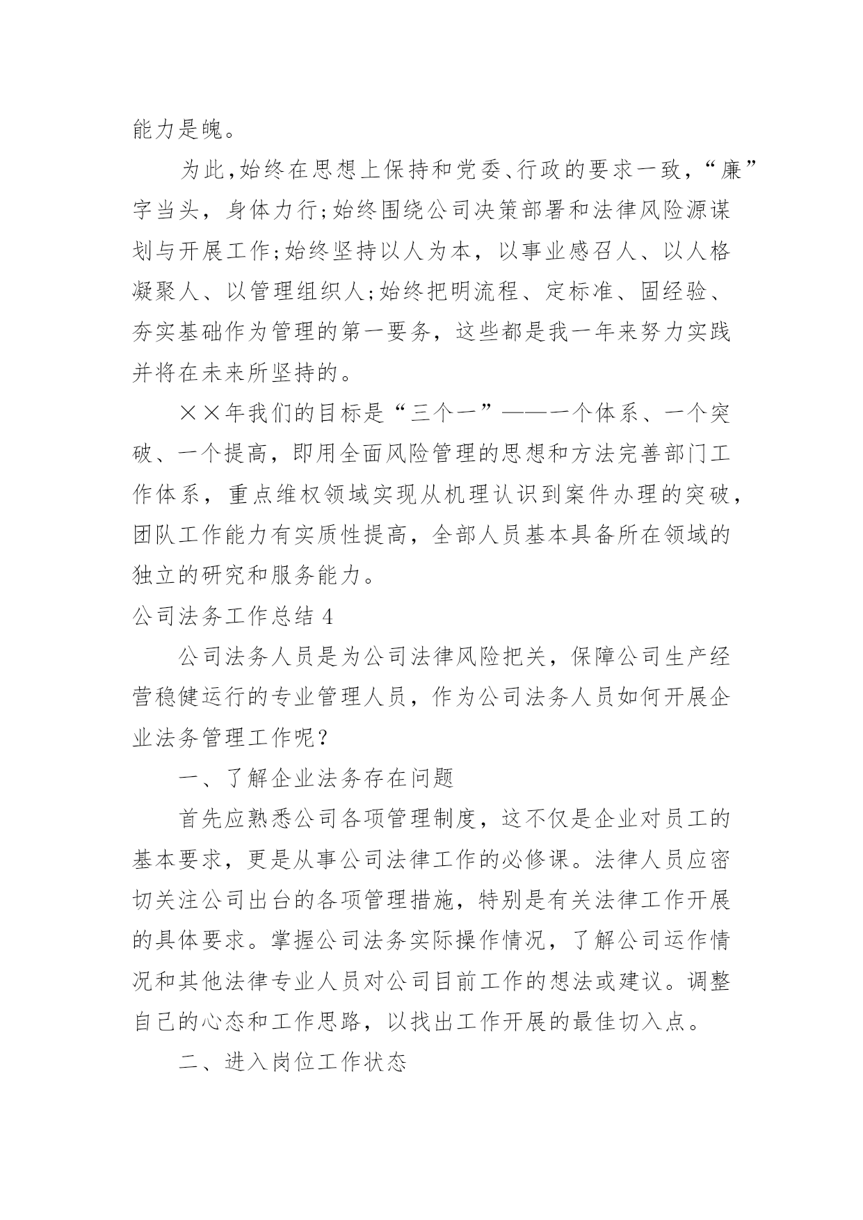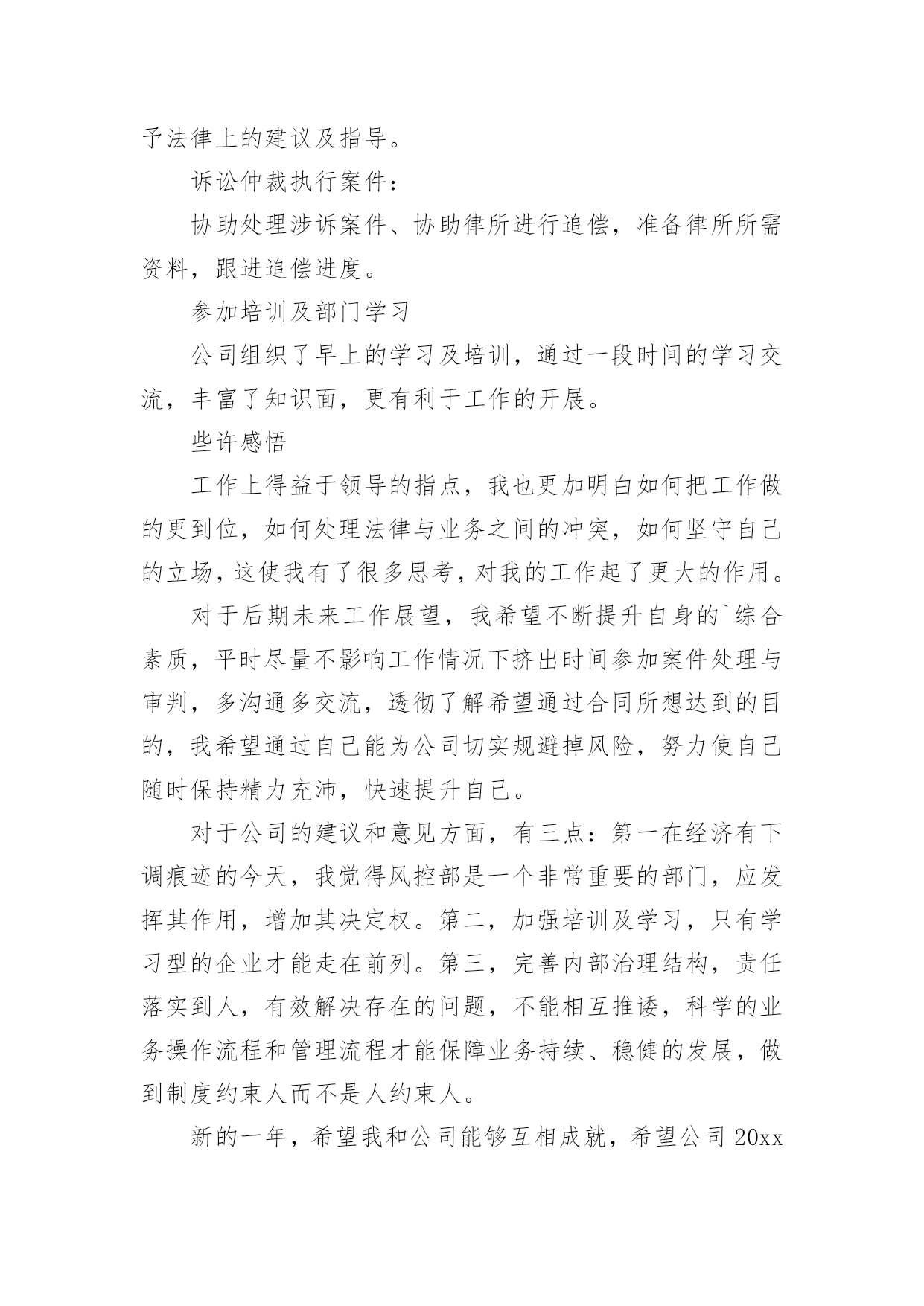 公司法务工作总结公司法务工作总结总结是事后对某一阶段的学习或工作情况作加以回顾检查并分析评价的书面材料,它可以使我们更有效率,让我们抽出时间写写总结吧。如何把总结做到重点突出呢?以下是小编帮大家整理的公司法务工作总结,仅供参考,欢迎大家阅读。公司法务工作总结1时间白驹过隙,匆匆而逝,一晃20xx年上半年已然过去,停下来回头想想,纵有百感交集亦有千头万绪。上半年,主要负责公司合同审查、法律建议及诉讼仲裁执行方面的工作。合同审查:在合同审查方面完善及起草传统业务反担保合同,根据公证处及房管局的要求进行相应的完善。除了审查金马公司日常业务合同外,一年来,也审查了日常活动的合同,比如花卉合同、装饰装修合同、公司员工入职离职相关手续等。法律建议:本公司及在日常运营中,业务人员关于业务办理、合同签订等有诸多法律层面的疑问,我负责随时对他们的疑问给予法律上的建议及指导。诉讼仲裁执行案件:协助处理涉诉案件、协助律所进行追偿,准备律所所需资料,跟进追偿进度。参加培训及部门学习公司组织了早上的学习及培训,通过一段时间的学习交流,丰富了知识面,更有利于工作的开展。些许感悟工作上得益于领导的指点,我也更加明白如何把工作做的更到位,如何处理法律与业务之间的冲突,如何坚守自己的立场,这使我有了很多思考,对我的工作起了更大的作用。对于后期未来工作展望,我希望不断提升自身的`综合素质,平时尽量不影响工作情况下挤出时间参加案件处理与审判,多沟通多交流,透彻了解希望通过合同所想达到的目的,我希望通过自己能为公司切实规避掉风险,努力使自己随时保持精力充沛,快速提升自己。对于公司的建议和意见方面,有三点:第一在经济有下调痕迹的今天,我觉得风控部是一个非常重要的部门,应发挥其作用,增加其决定权。第二,加强培训及学习,只有学习型的企业才能走在前列。第三,完善内部治理结构,责任落实到人,有效解决存在的问题,不能相互推诿,科学的业务操作流程和管理流程才能保障业务持续、稳健的发展,做到制度约束人而不是人约束人。新的一年,希望我和公司能够互相成就,希望公司20xx年里能如大鹏展翅、蒸蒸日上。公司法务工作总结2时间易老,岁月无痕,不知不觉间,我在本单位做法务工作已经快六个月,这六个月来,在领导细心的指导及栽培下,在本部门其他成员的关心和照顾下,在本单位其他人员的提携和关照下,我渐趋对本单位的相关法律事务有了清晰的认知,亦对人事管理方面的工作有了切实的感受,回顾这近六个月来的工作情况,收获良多的同时亦深感自身尚有些许不足和应予改进之处,下面,我简要对自己这六个月来的法务工作做一简要小结:(一)、合同审查合同审查是法务人员最为基础的工作,也是力保企业健康运行的关键,经过几个月的不断学习和加强锻炼,我在这六个月时间内主要审查了:《安全卫生评价合同》、《环境影响评价测评合同》、《建筑工程委托合同》、《建设工程勘察设计合同》、《建设工程施工图设计文件审查合同》、《施工图审查合同》、《建设工程委托监理合同》、《技术开发委托合同》、《建设工程造价咨询合同》、《建设工程招标代理合同》、《幼儿园劳务派遣协议》、新建住宅楼的《内部员工房屋买卖协议书》等二十余个与本单位利益相关的合同文本。在合同审查过程中,能及时发现侵害我方利益的显失公平之处,纠正合同中对我方不利的不妥及不当条款。例如在一些合同范本中,明显有限制我方权利和加重我方义务的条款,此时,我即会予以及时纠正,力促我方权益最大化;而在合同争议解决方式上,一些合同约定的仲裁和诉讼解决方式不甚明确,此时,我即会及时予以指出,要么仲裁要么诉讼,以便明确争议的解决方式,不致产生不必要的纠纷;还有,在一些国家有相关范本的合同中,一些单位会自行修改合同范本,以减轻自身义务,此时,如果不审慎审查,难以查出破绽之处,此时,我即会逐条逐句读完合同,以更正合同范本中已被修改并且减轻对方责任的条款。通过我及时、有效、认真的合同审查和合同把关,大大提高了本单位对外签订合同的履约率,也加速了其他部门工作效率的提高,尽量避免了本单位不必要的'诉讼之苦,力保单位各项工作和各部门工作能健康发展和顺利运行。通过审慎的法律把关和合同审查,在我于本单位工作的六个月时间内,本单位未发生一起诉讼案件,亦未产生任何法律纠纷,这使得本单位职工有充裕的时间搞科研生产和开发,为单位科研创造提供了良好的内部环境和外部氛围。(二)、“xx”普法宣传的知识竞赛出题及阅卷工作20xx年是“xx”普法工作宣传的成果验收年,我单位积极响应国家号召,加强对员工的法律教育和宣传,我1草拟了本单位的“xx”普法宣传的年终总结报告,系统梳理了本单位在“xx”普法工作中所作出的努力和贡献,并对全单位六百余名员工进行了法律知识答卷考评,全单位员工积极答卷,试卷回收有效率达100%。这有效增强了全所员工的法律素养,