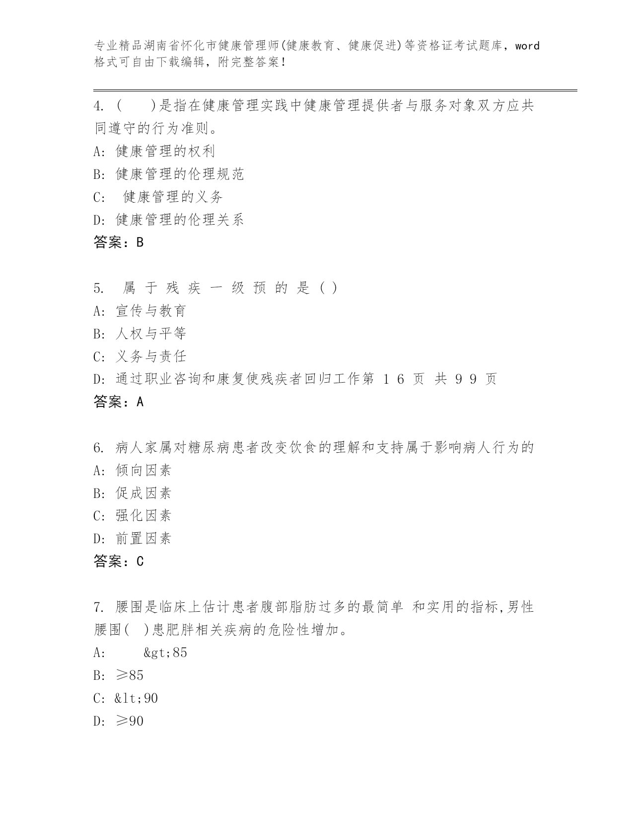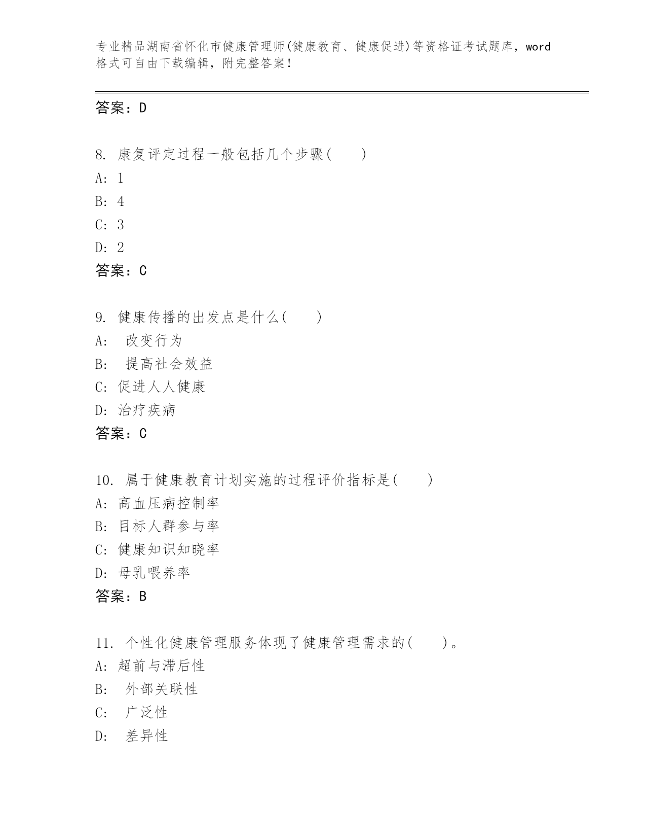 湖南省怀化市健康管理师(健康教育、健康促进)等资格证考试及参考答案(名师推荐)