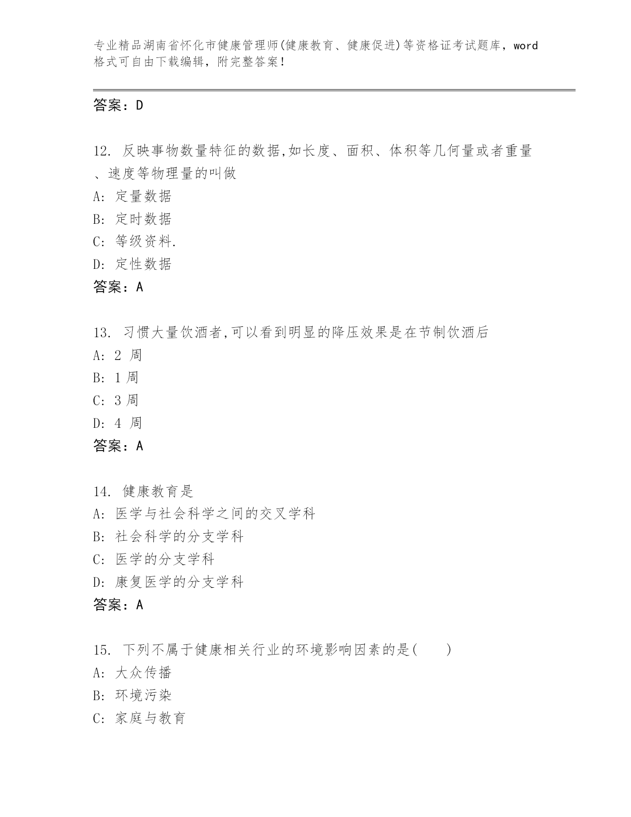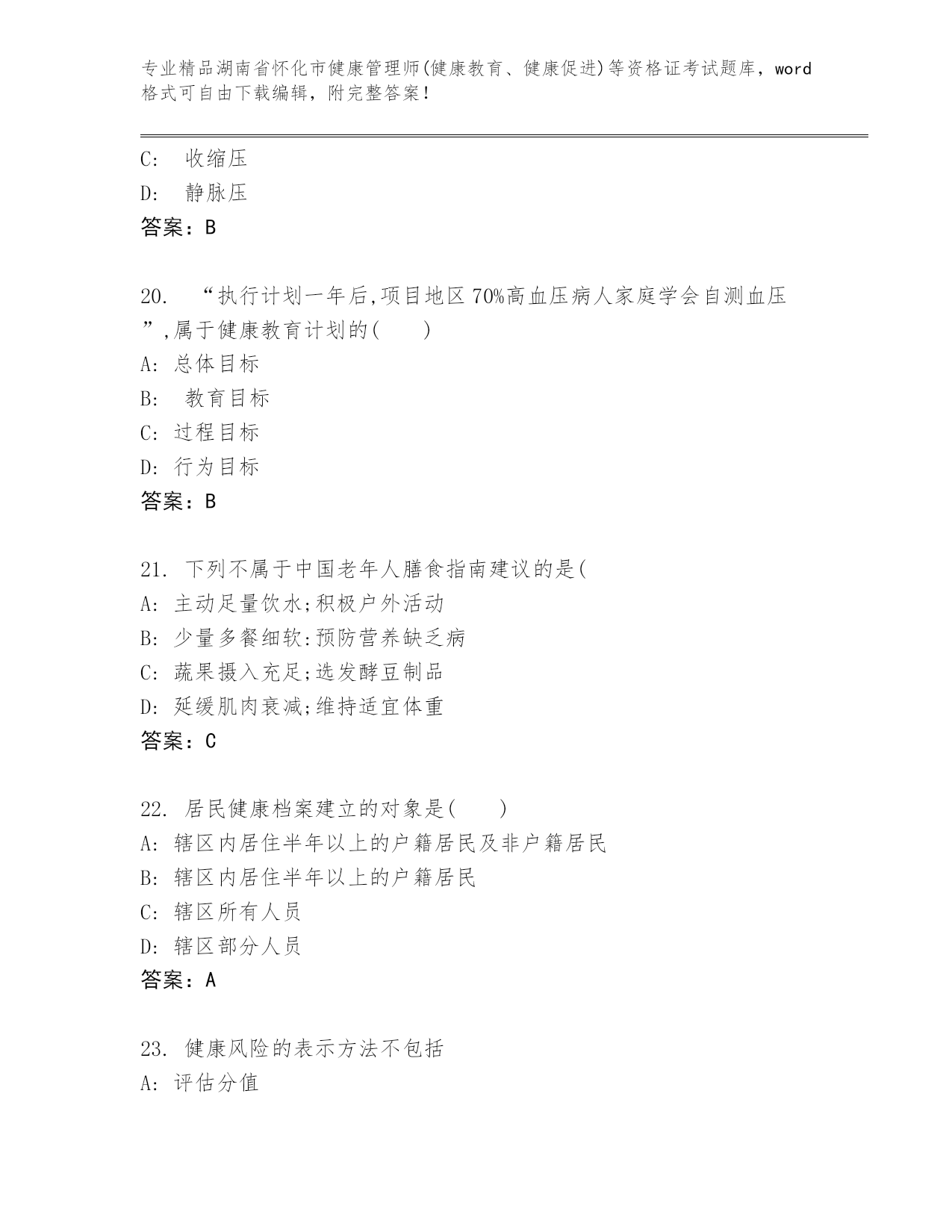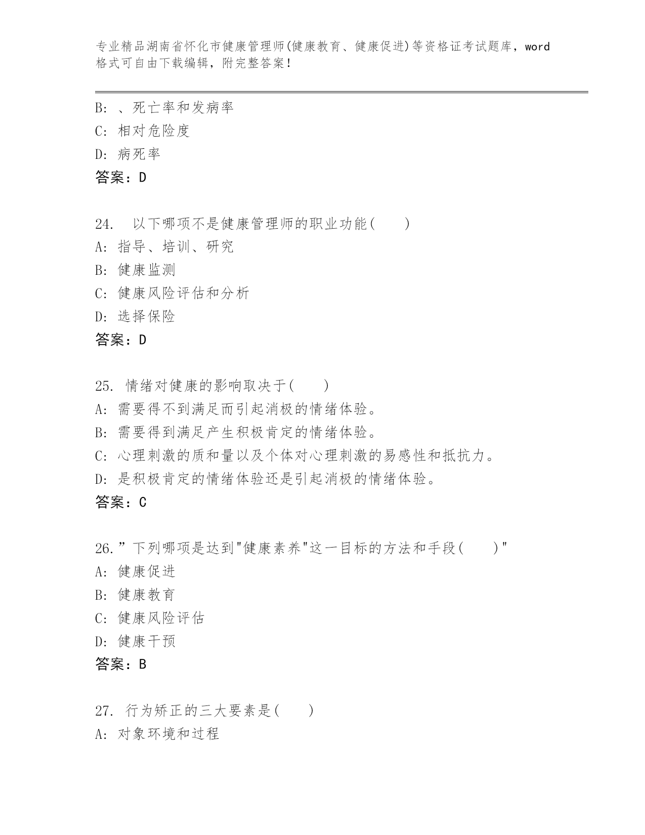 湖南省怀化市健康管理师(健康教育、健康促进)等资格证考试及参考答案(名师推荐).docx