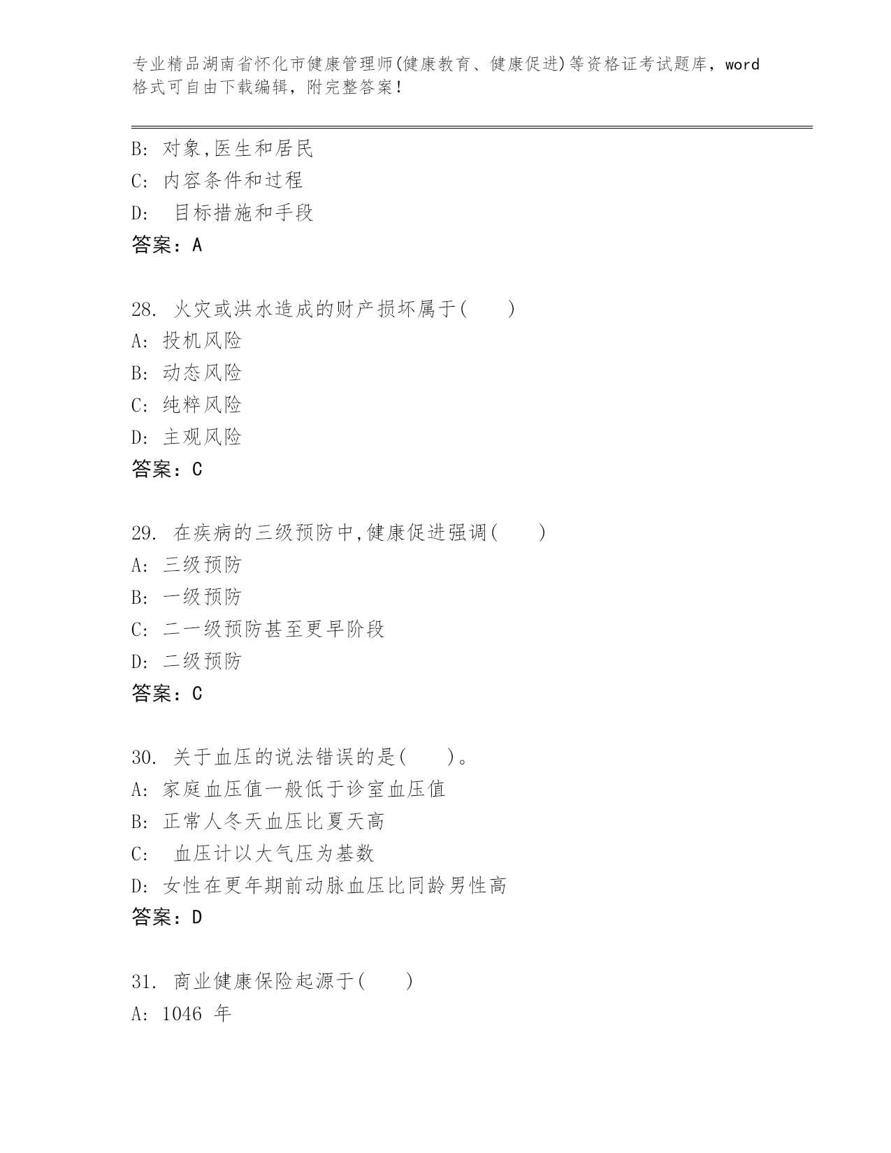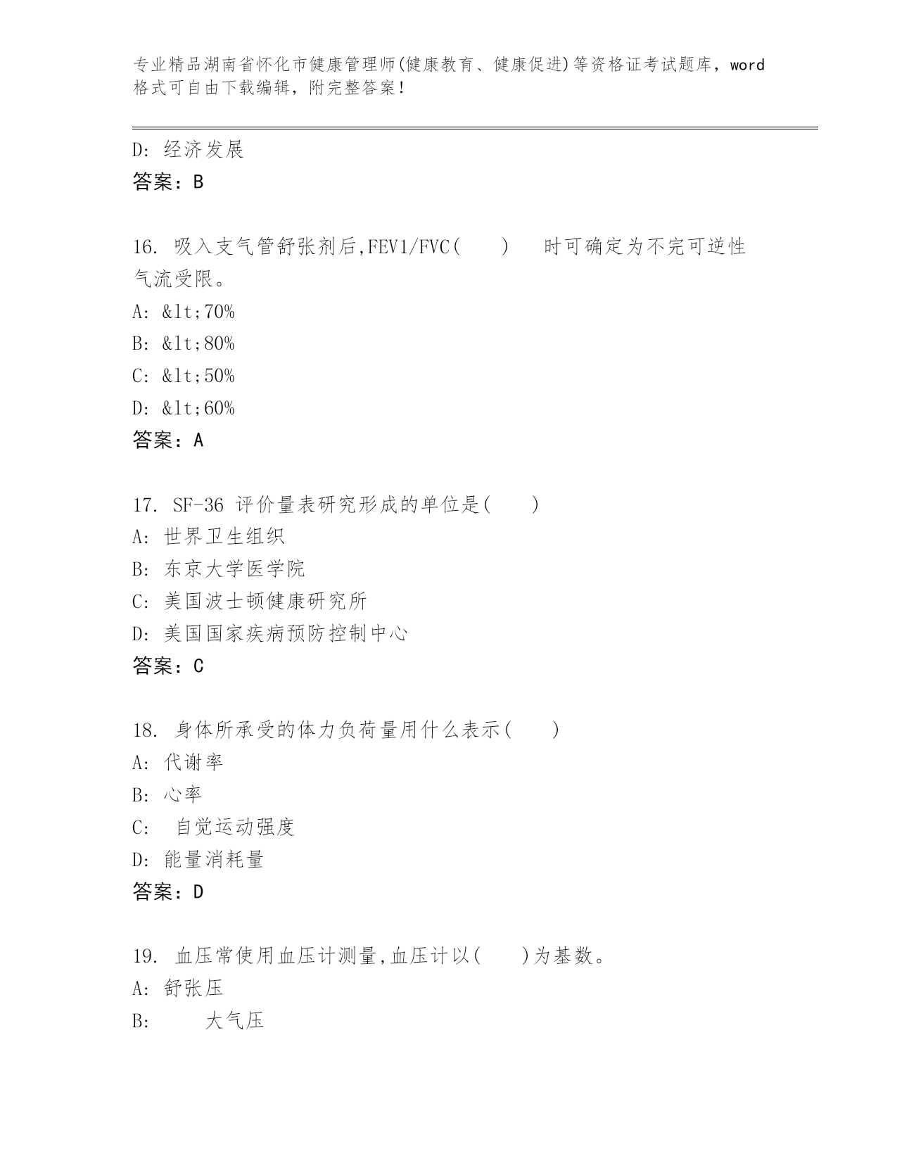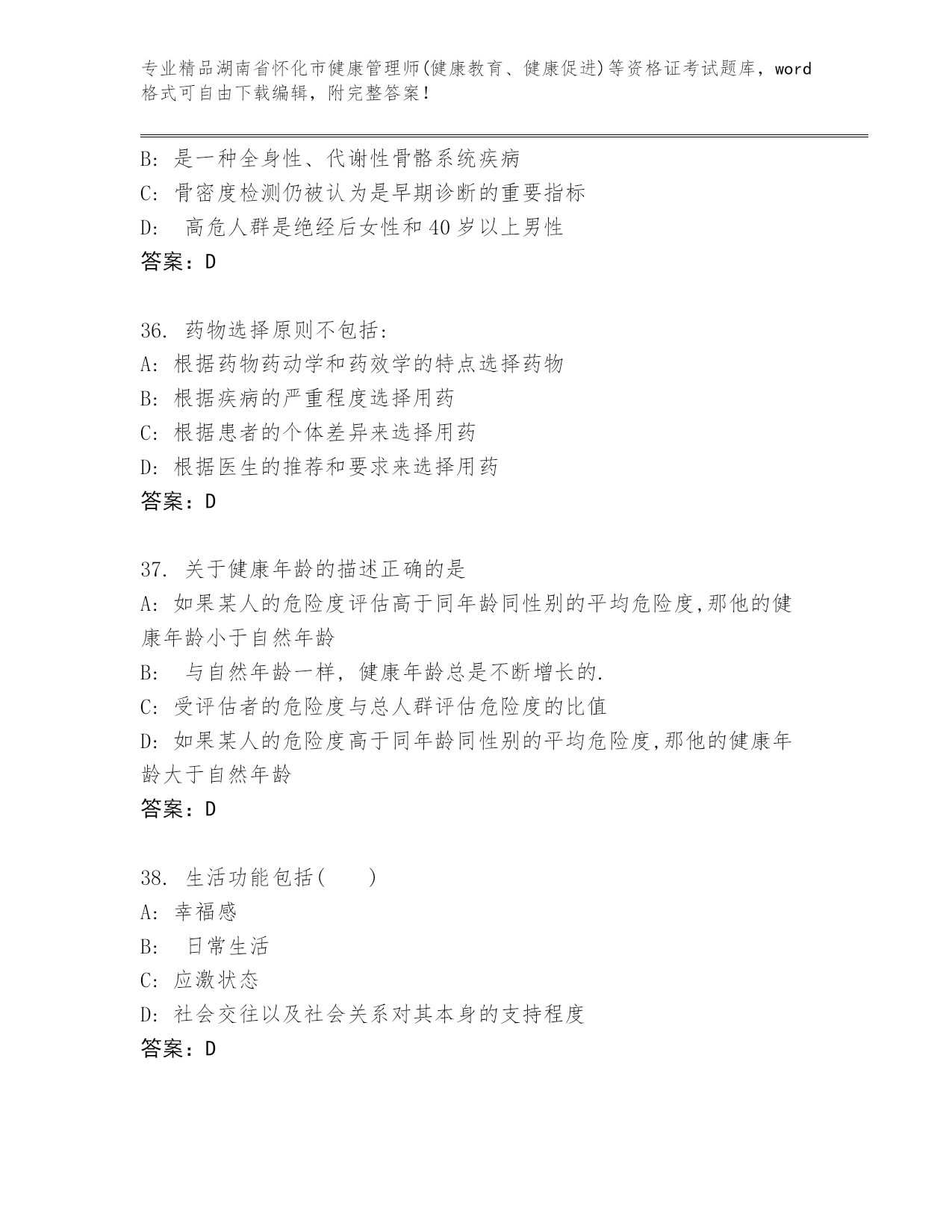 湖南省怀化市健康管理师(健康教育、健康促进)等资格证考试及参考答案(名师推荐).docx