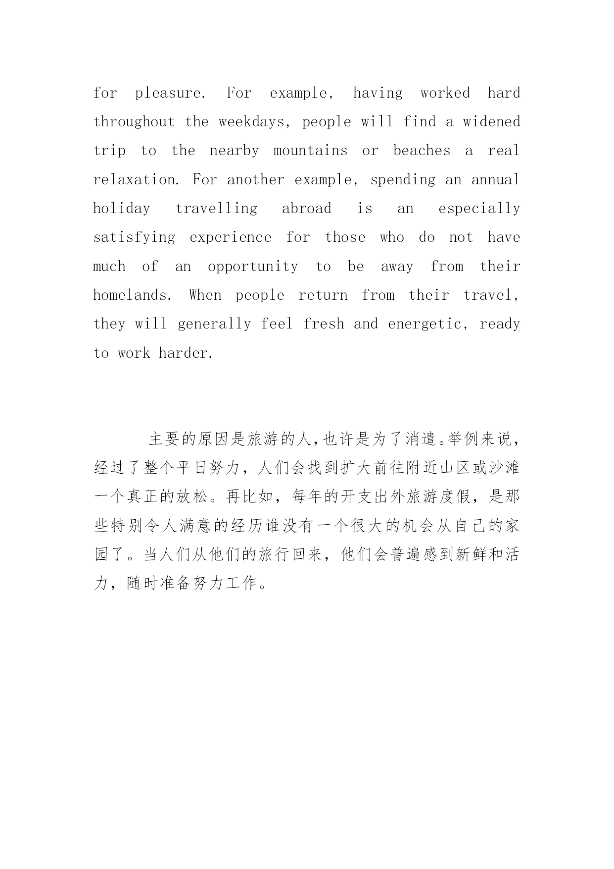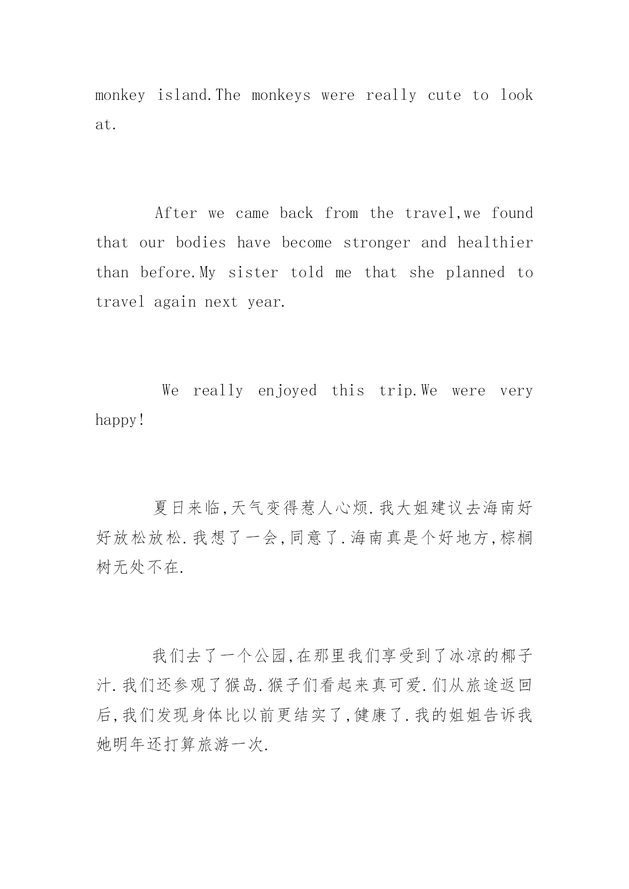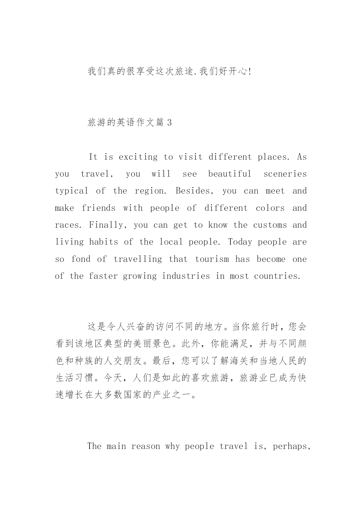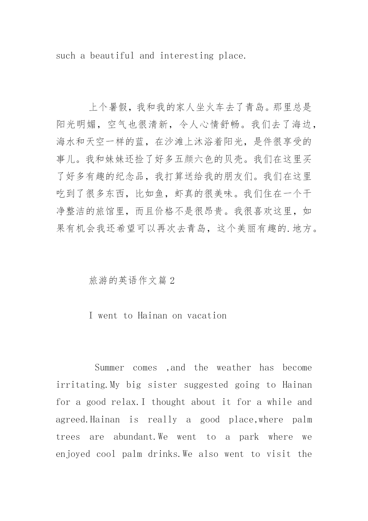 旅游的作文英文关于旅游的作文英文作为英语专业的学生,你一定写过很多英语作文吧,比如旅游类的。以下是百分网小编给大家带来外出旅游的英语作文,以供参阅。旅游的英语作文篇1Lastsummervacation,myfamilyandIwenttoQingdaobytrain.Therewasalwayssunshineandfreshair,whichmadeussocomfortable.Wewenttotheseaside,theseawasasblueasthesky,andbathinginthesunshineonthebeach,wasreallyanenjoyablething.Ialsopickedupalotofcolorfulshellswithmylittlesister.Thereweboughtmanyinterestingsouvenirs,Iwasplaningtosendthemtomyfriends.Weatemanytingsthere,suchasfish,prawn,andsoon.Theyareverydelicious.Thenwelivedinacleanandtidyhotel,andthepricewasnotsoexpensive.IlikeQingdaoverymuch,andifIgotachance,Ihopetocomehereagain,itissuchabeautifulandinterestingplace.上个暑假,我和我的家人坐火车去了青岛。那里总是阳光明媚,空气也很清新,令人心情舒畅。我们去了海边,海水和天空一样的蓝,在沙滩上沐浴着阳光,是件很享受的事儿。我和妹妹还捡了好多五颜六色的贝壳。我们在这里买了好多有趣的纪念品,我打算送给我的朋友们。我们在这里吃到了很多东西,比如鱼,虾真的很美味。我们住在一个干净整洁的旅馆里,而且价格不是很昂贵。我很喜欢这里,如果有机会我还希望可以再次去青岛,这个美丽有趣的.地方。旅游的英语作文篇2IwenttoHainanonvacationSummercomes,andtheweatherhasbecomeirritating.MybigsistersuggestedgoingtoHainanforagoodrelax.Ithoughtaboutitforawhileandagreed.Hainanisreallyagoodplace,wherepalmtreesareabundant.Wewenttoaparkwhereweenjoyedcoolpalmdrinks.Wealsowenttovisitthemonkeyisland.Themonkeyswerereallycutetolookat.Afterwecamebackfromthetravel,wefoundthatourbodieshavebecomestrongerandhealthierthanbefore.Mysistertoldmethatsheplannedtotravelagainnextyear.Wereallyenjoyedthistrip.Wewereveryhappy!夏日来临,天气变得惹人心烦.我大姐建议去海南好好放松放松.我想了一会,同意了.海南真是个好地方,棕榈树无处不在.我们去了一个公园,在那里我们享受到了冰凉的椰子汁.我们还参观了猴岛.猴子们看起来真可爱.们从旅途返回后,我们发现身体比以前更结实了,健康了.我的姐姐告诉我她明年还打算旅游一次.我们真的很享受这次旅途.我们好开心!旅游的英语作文篇3Itisexcitingtovisitdifferentplaces.Asyoutravel,youwillseebeautifulsceneriestypicaloftheregion.Besides,youcanmeetandmakefriendswithpeopleofdifferentcolorsandraces.Finally,youcangettoknowthecustomsandlivinghabitsofthelocalpeople.Todaypeoplearesofondoftravellingthattourismhasbecomeoneofthefastergrowingindustriesinmostcountries.这是令人兴奋的访问不同的地方。当你旅行时,您会看到该地区典型的美丽景色。此外,你能满足,并与不同颜色和种族的人交朋友。最后,您可以了解海关和当地人民的生活习惯。今天,人们是如此的喜欢旅游,旅游业已成为快速增长在大多数国家的产业之一。Themainreasonwhypeople