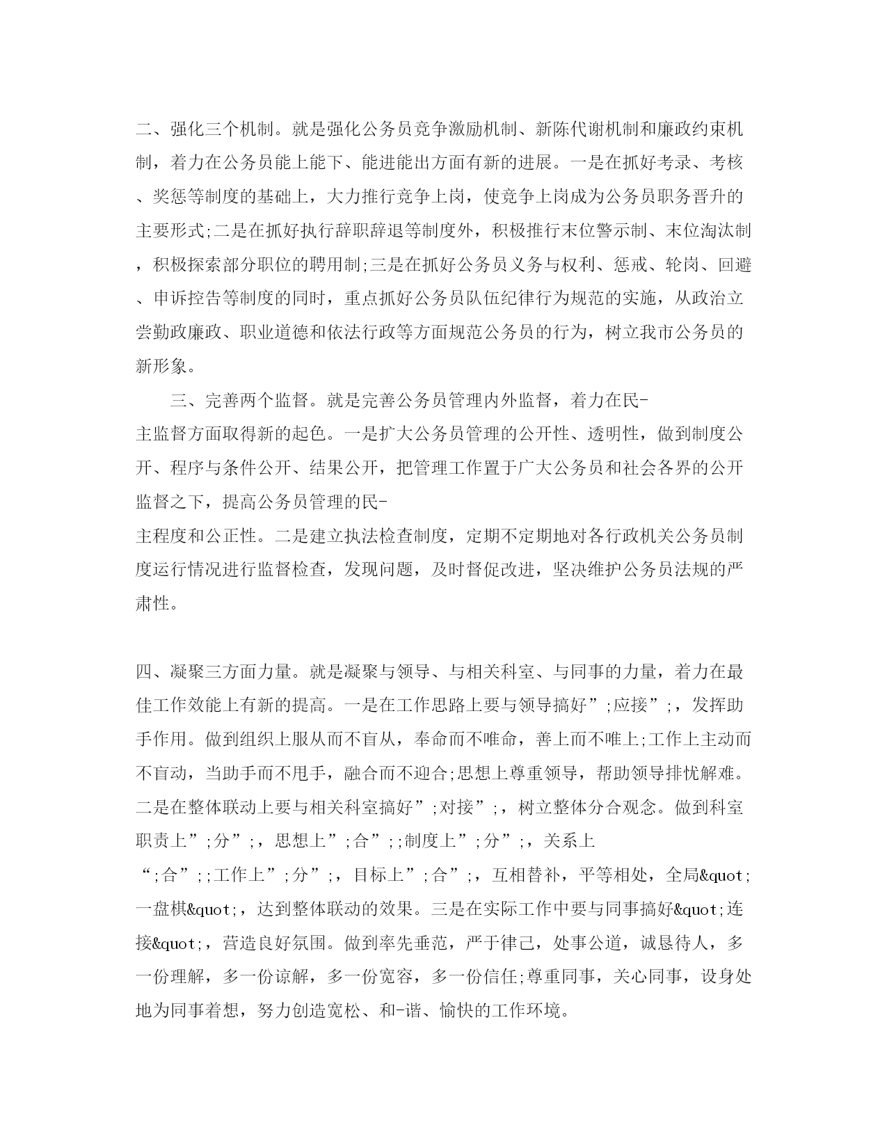 此资料由网络收集而来,如有侵权请告知上传者立即删除。资料共分享,我们负责传递知识。公务员岗位竞聘演讲稿尊敬的各位领导,评委们:大家好!光阴似箭,一晃我已经是个______;______;岁的人了。回首我参加工作的______;______;年来,(……;……;做过的工作,最好说些在某工作中负责的与学到的,取得过的成绩)。生长与变化是一切生命的法则,昨日的答案不适用于今日的问题;;正如今天的方法不能解决明天的需求一样。今天我竞争的是科长职位,职位意味着责任和义务。由于我现在从事的是公务员管理工作,所以假若我是公务员管理科科长,我的工作目标是:按照建设高素质专业化公务员队伍的总要求和这次机构改革后政府职能定位是”;服务”;,着力在”;竞争激励”;上下功夫,在”;高素质专业化”;方面做文章,在”;管理服务上”;求实效,努力建设一支人民满意的精干、廉洁、高效的公务员队伍,更好地为我市经济建设和社会发展服务。为实现这一工作目标,我的主要工作思路是”;2323”;,就是创新两个办法,强化三个机制,完善两个监督,凝聚三方面力量。一、创新两个办法。就是创新公务员管理办法,着力在公务员管理规范化、科学化、制度化上有新的突破。也就是在现有的公务员管理基础上,采用先进的管理手段,建起公务员微机管理系统和档案管理系统,使我市公务员”;进、管、出”;三个环节的管理更加有序、科学规范,根除管理工作中的随意性。二、强化三个机制。就是强化公务员竞争激励机制、新陈代谢机制和廉政约束机制,着力在公务员能上能下、能进能出方面有新的进展。一是在抓好考录、考核、奖惩等制度的基础上,大力推行竞争上岗,使竞争上岗成为公务员职务晋升的主要形式;二是在抓好执行辞职辞退等制度外,积极推行末位警示制、末位淘汰制,积极探索部分职位的聘用制;三是在抓好公务员义务与权利、惩戒、轮岗、回避、申诉控告等制度的同时,重点抓好公务员队伍纪律行为规范的实施,从政治立尝勤政廉政、职业道德和依法行政等方面规范公务员的行为,树立我市公务员的新形象。三、完善两个监督。就是完善公务员管理内外监督,着力在民-主监督方面取得新的起色。一是扩大公务员管理的公开性、透明性,做到制度公开、程序与条件公开、结果公开,把管理工作置于广大公务员和社会各界的公开监督之下,提高公务员管理的民-主程度和公正性。二是建立执法检查制度,定期不定期地对各行政机关公务员制度运行情况进行监督检查,发现问题,及时督促改进,坚决维护公务员法规的严肃性。四、凝聚三方面力量。就是凝聚与领导、与相关科室、与同事的力量,着力在最佳工作效能上有新的提高。一是在工作思路上要与领导搞好”;应接”;,发挥助手作用。做到组织上服从而不盲从,奉命而不唯命,善上而不唯上;工作上主动而不盲动,当助手而不甩手,融合而不迎合;思想上尊重领导,帮助领导排忧解难。二是在整体联动上要与相关科室搞好”;对接”;,树立整体分合观念。做到科室职责上”;分”;,思想上”;合”;;制度上”;分”;,关系上“;合”;;工作上”;分”;,目标上”;合”;,互相替补,平等相处,全局"一盘棋",达到整体联动的效果。三是在实际工作中要与同事搞好"连接",营造良好氛围。做到率先垂范,严于律己,处事公道,诚恳待人,多一份理解,多一份谅解,多一份宽容,多一份信任;尊重同事,关心同事,设身处地为同事着想,努力创造宽松、和-谐、愉快的工作环境。各位领导、各位评委、各位同仁,我深知,人事部门科长职位担子的厚重,特别是公务员管理科科长职位,责任更大,要求更高。但是,我坚信,只要心里始终装着事业,有公仆观念,群众观点,全力尽为民之责,就一定会使我市公务员管理工作上台阶、上水平、上档次。如果我这次竞岗成功,这是大家的厚爱和鼓励,我一定以踏实的工作作风、求实的工作态度、进取的工作精神,恪尽职守,履行职责,以实际行动履行自己的诺言。如果我竞岗落选,说明我还有差距,决不气馁。因为从事何种工作岗位并不重要,重要的是如何对待工作,如何在岗位上发掘美的闪光点。我将一如既往,在局党组的领导下,与各位同仁一道,同心同德,努力拼搏,为______;______;做出一番成绩!谢谢大家!