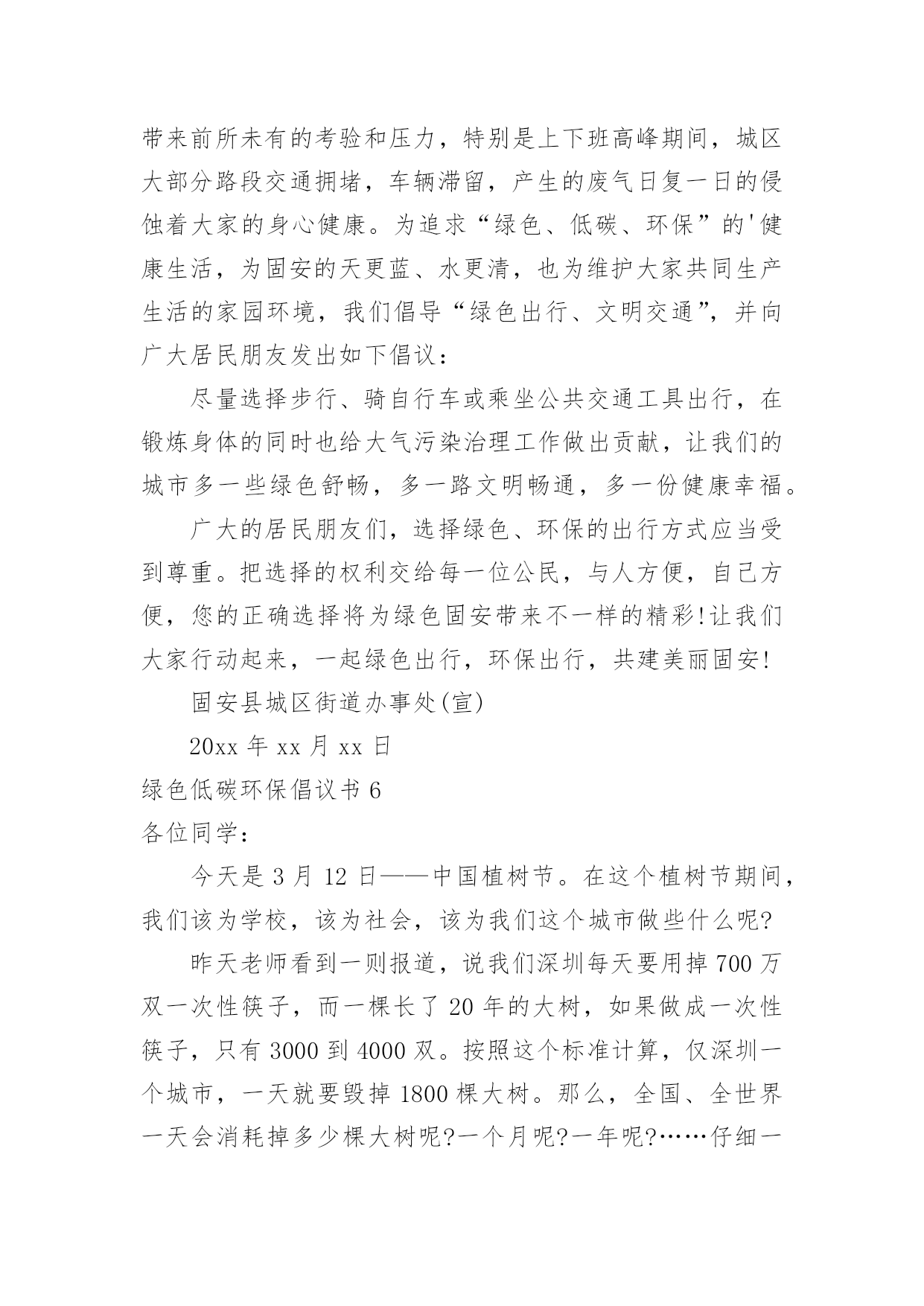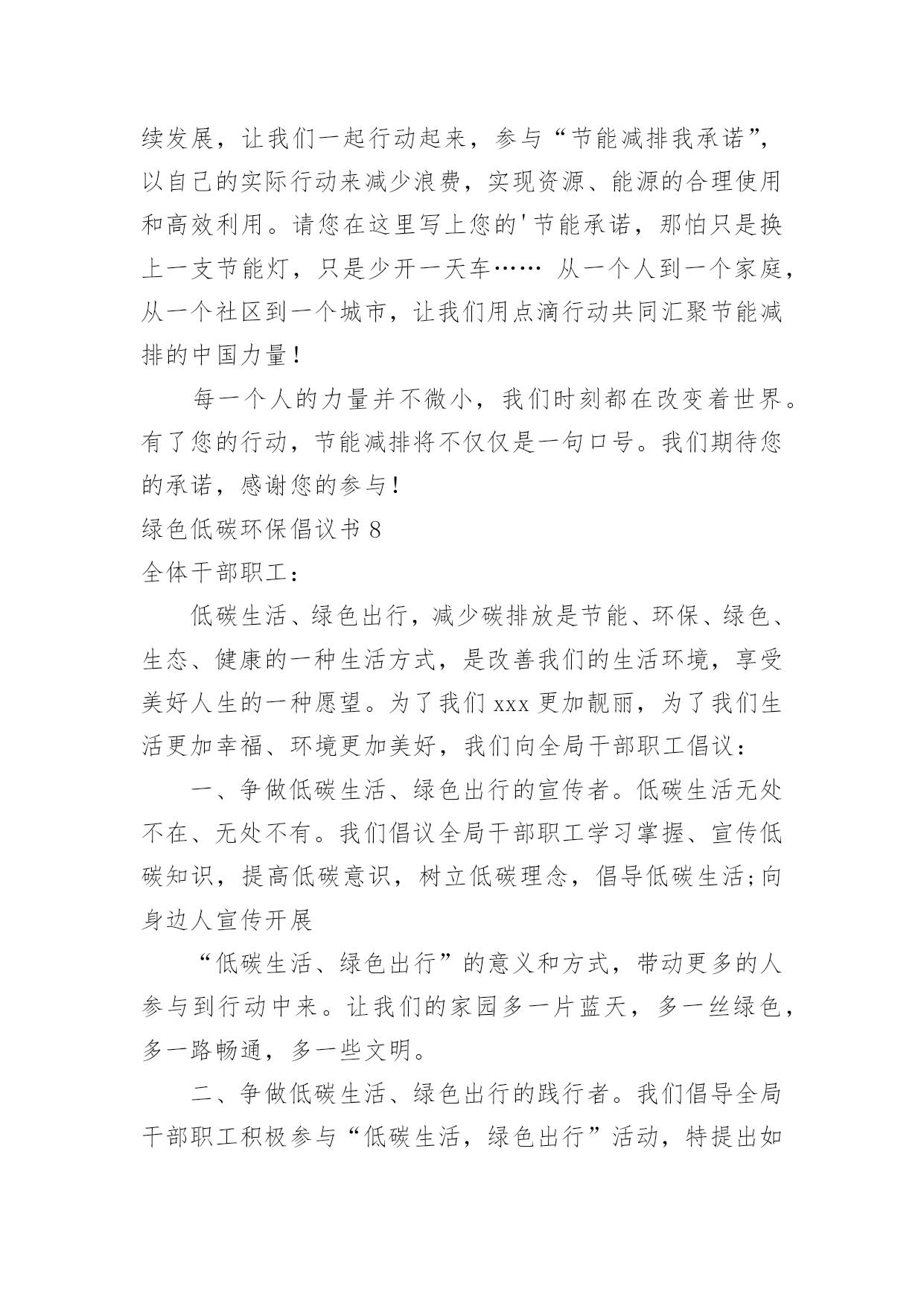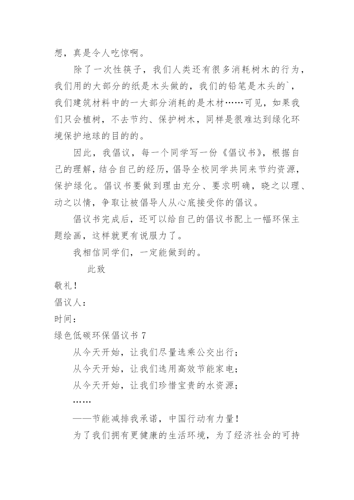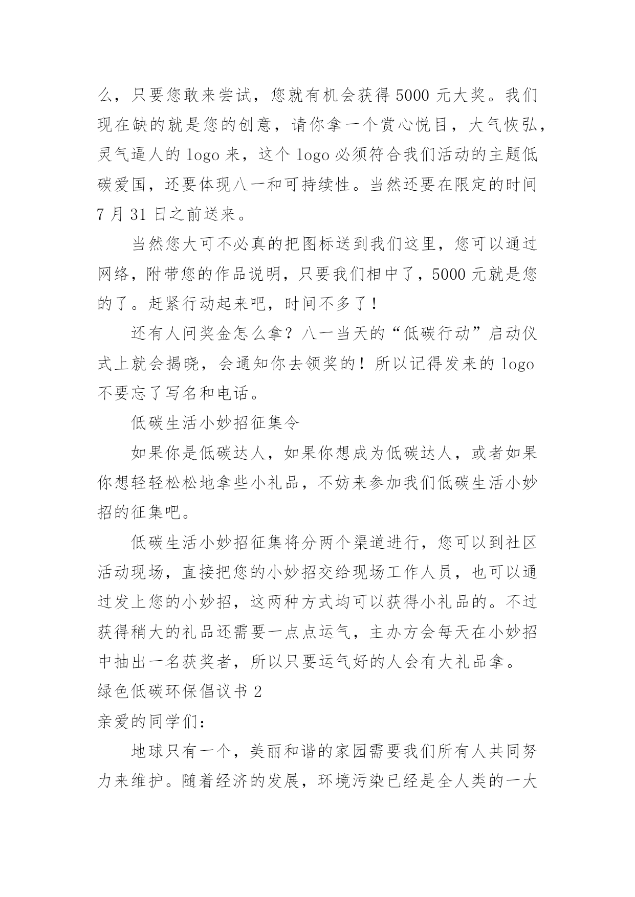绿色低碳环保倡议书绿色低碳环保倡议书在不断进步的社会中,倡议书的使用越来越广泛,倡议书是由某一组织或社团拟定、就某事向社会提出建议或提议社会成员共同去做某事的书面文章。那要怎么写好倡议书呢?下面是小编帮大家整理的绿色低碳环保倡议书,希望能够帮助到大家。绿色低碳环保倡议书1“今天你低碳了没?”随着这句口头禅的广泛流行,“低碳生活”正在成为一种追求时尚的负责任的生活态度。在全世界都倡导低碳的,我们到底能做些什么?除了关注低碳经济,除了关注新能源的利用,除了世博会上各种低碳科技给我们带来的新鲜刺激,你有没有问过自己,是否可以从身边的点滴做起,为保护环境出一份微薄之力?如果你想,那么就加入到“低碳行动”中来。近日,八一医院妇产科与南京市环保局联合南京各大媒体发出“我低碳,我健康”的倡议,并将于八一建军节开始,将此倡议带到各大社区。此次低碳行动主要是倡导大家将低碳的概念深入到日常生活中,比如说减少用电器的时间,出门少开车多步行等等。该行动通过播放露天电影,让大家适当参加户外活动,减少空调等电器的`使用时间,并邀请部队三甲医院八一医院妇产科军医现场指导健康生活方式。另外还会在现场及网络上有奖征集低碳生活小妙招等。以庆8·1迎国庆为契机,响应国家“2131工程”的号召,丰富城镇居民文化生活,普及爱国主义教育、增进邻里和睦、推广低碳环保以及体现军民鱼水情的军医义务奉献等一系列活动,可谓一举多得,意义深远。据了解,此次活动的创意其实是八一医院妇产科的一位老军医想到的。她说在八一建军节这个特别的日子,真的很想做一些有意义的事情。作为一个军人在和平年代怎么爱国?保护能源,保护国家的环境就是一种很好的爱国方式。所以这次活动所选择的露天电影也是有着军人气质的红色电影,希望参与活动的人在电影中能体会到另一种爱国情绪。红色电影任你挑您想看什么样的红色电影,这个可以由您的投票来决定。主办方会在网上公布下一站“低碳行动”地点,并附上可供选择的红色电影片名,每次5个,您可以从中选择您最喜欢的投票。主办方会根据群众的意见,选择所要放映的电影。投票也是有好处的哦,不仅可以选择您想看的电影,还能有机会获得运气礼品。和小妙招一样,主办方也会每天抽出一名幸运投票者,赠送生活中用得着的贴心礼品。这等好事,不容错过。低碳行动logo征集令您有设计的天赋?您擅长创意图标?不管您到底有什么,只要您敢来尝试,您就有机会获得5000元大奖。我们现在缺的就是您的创意,请你拿一个赏心悦目,大气恢弘,灵气逼人的logo来,这个logo必须符合我们活动的主题低碳爱国,还要体现八一和可持续性。当然还要在限定的时间7月31日之前送来。当然您大可不必真的把图标送到我们这里,您可以通过网络,附带您的作品说明,只要我们相中了,5000元就是您的了。赶紧行动起来吧,时间不多了!还有人问奖金怎么拿?八一当天的“低碳行动”启动仪式上就会揭晓,会通知你去领奖的!所以记得发来的logo不要忘了写名和电话。低碳生活小妙招征集令如果你是低碳达人,如果你想成为低碳达人,或者如果你想轻轻松松地拿些小礼品,不妨来参加我们低碳生活小妙招的征集吧。低碳生活小妙招征集将分两个渠道进行,您可以到社区活动现场,直接把您的小妙招交给现场工作人员,也可以通过发上您的小妙招,这两种方式均可以获得小礼品的。不过获得稍大的礼品还需要一点点运气,主办方会每天在小妙招中抽出一名获奖者,所以只要运气好的人会有大礼品拿。绿色低碳环保倡议书2亲爱的同学们:地球只有一个,美丽和谐的家园需要我们所有人共同努力来维护。随着经济的发展,环境污染已经是全人类的一大难题,节能环保是我们可持续发展的.必然方向,弘扬节约美德,倡导低碳生活,建设环保型、节约型社会是我们的当务之急。为增强当代大学生的资源节约意识、环境保护意识和能源危机意识,以积极的姿态迎接“五四”爱国运动纪念日的到来,更好地继承“五四”爱国精神,我院学生宿舍自管委员会借此契机向全体同学发出倡议:1、离开寝室、教室牢记随手关灯,做到“无人在,无灯开”。2、手机充电结束后及时拔除充电器,全国一年省电20亿度。3、每天上网时间减少一小时,减少不必要的待机状态。4、空调温度设置适当,夏季不低于26度,冬季不超20度。5、珍惜每一滴水,洗衣洗澡时杜绝长流水。6、节约用纸,双面使用,珍惜有限的森林资源。7、减少垃圾,不乱丢废弃物,推动垃圾分类回收。8、不用一次性木筷、纸杯,就餐时自备餐具;少用纸巾;不用塑料袋,自带环保袋。9.提倡步行,骑单车,坐公交,我锻炼,我健康。10、拒吃野生动物,不买野生动物制品,善待生命。11、认识“环境标志”、“绿色食品标志”,保障自身安全。12、爱护校园一草一木,争做环保卫士,莫待无花空嗟叹。13、不在公共场合吸烟,创建无烟宿舍、无烟教室、无烟校园。古语曰:不积跬步,无以至千里;