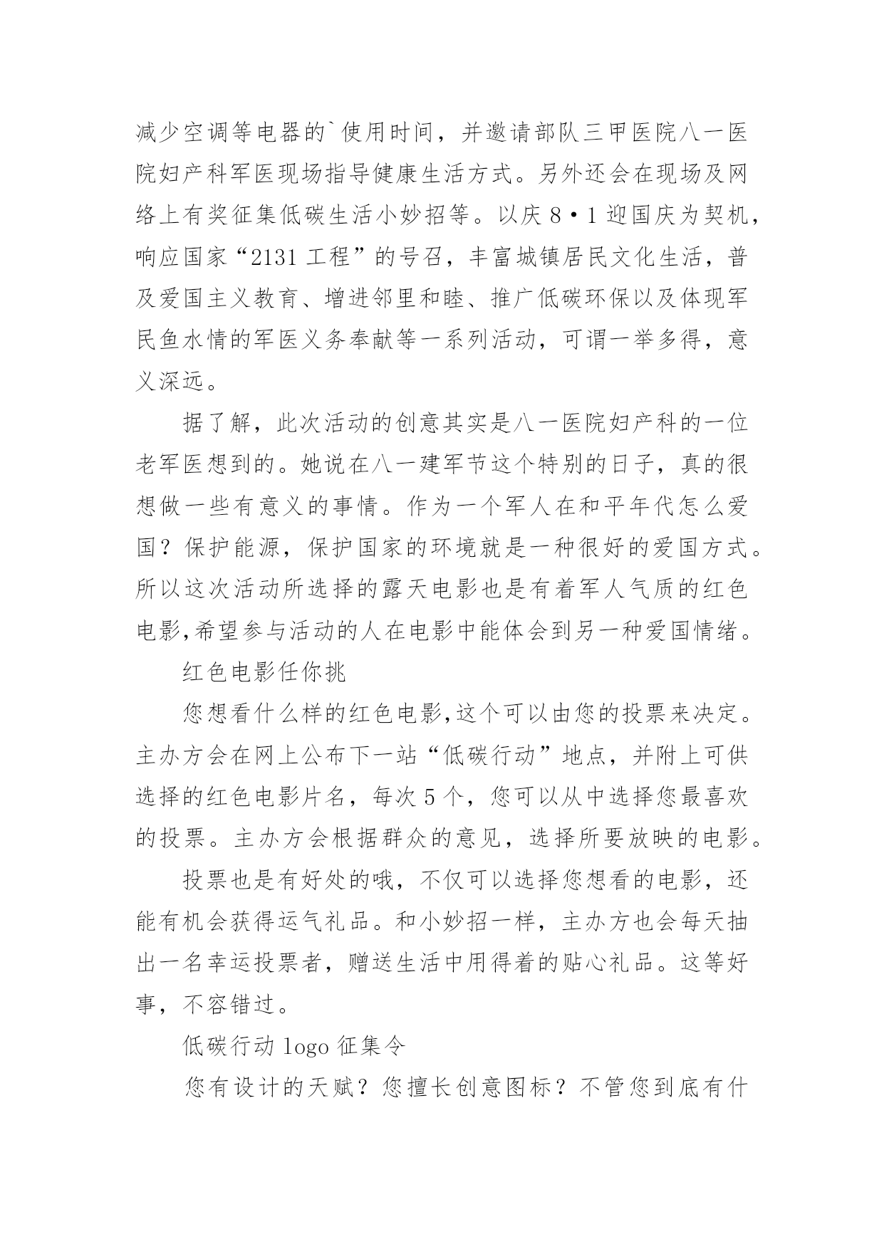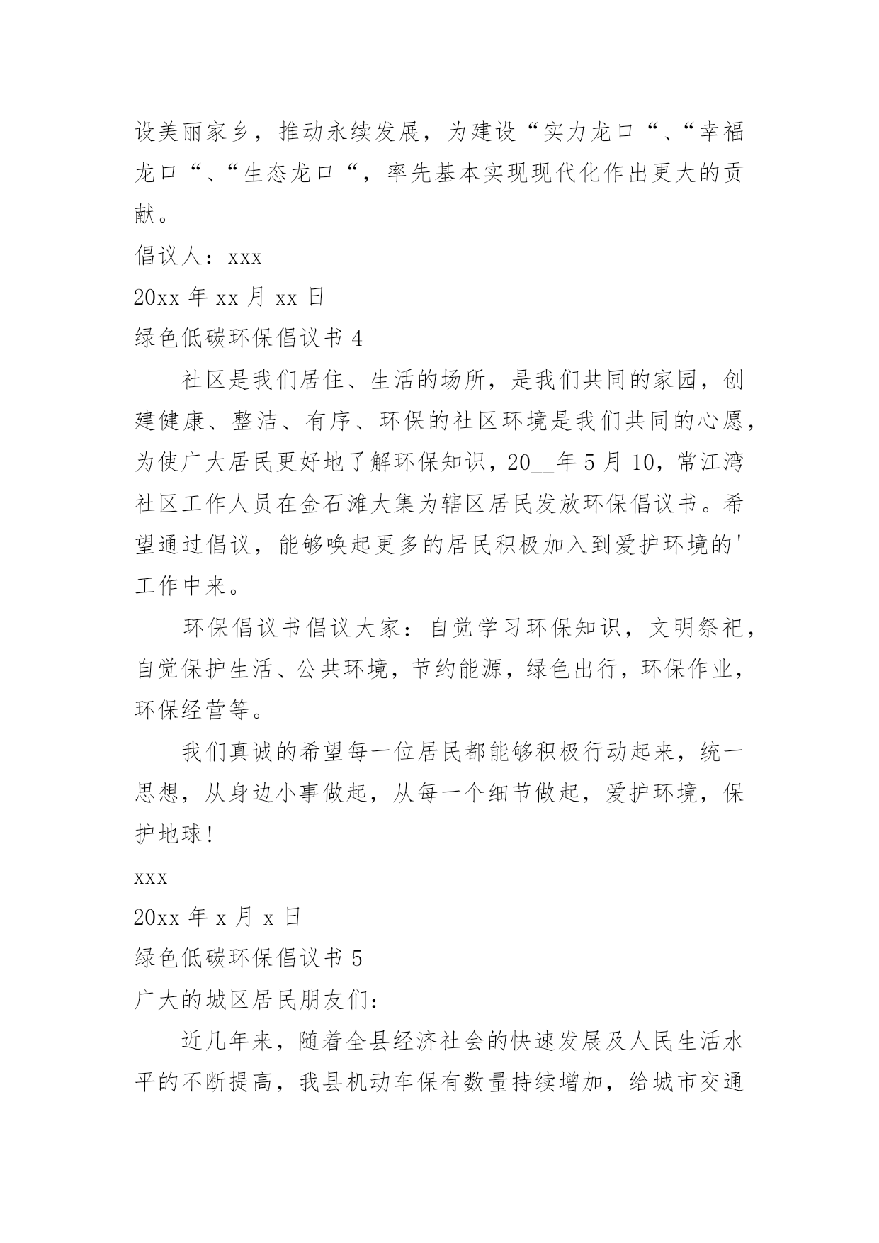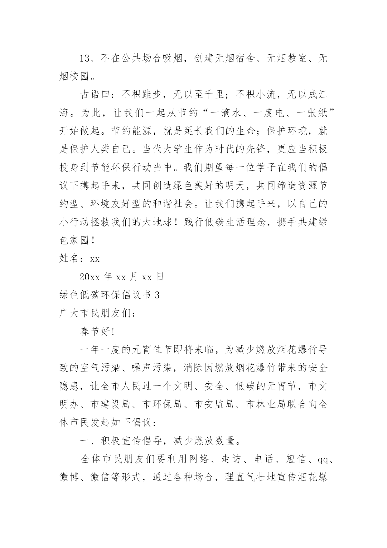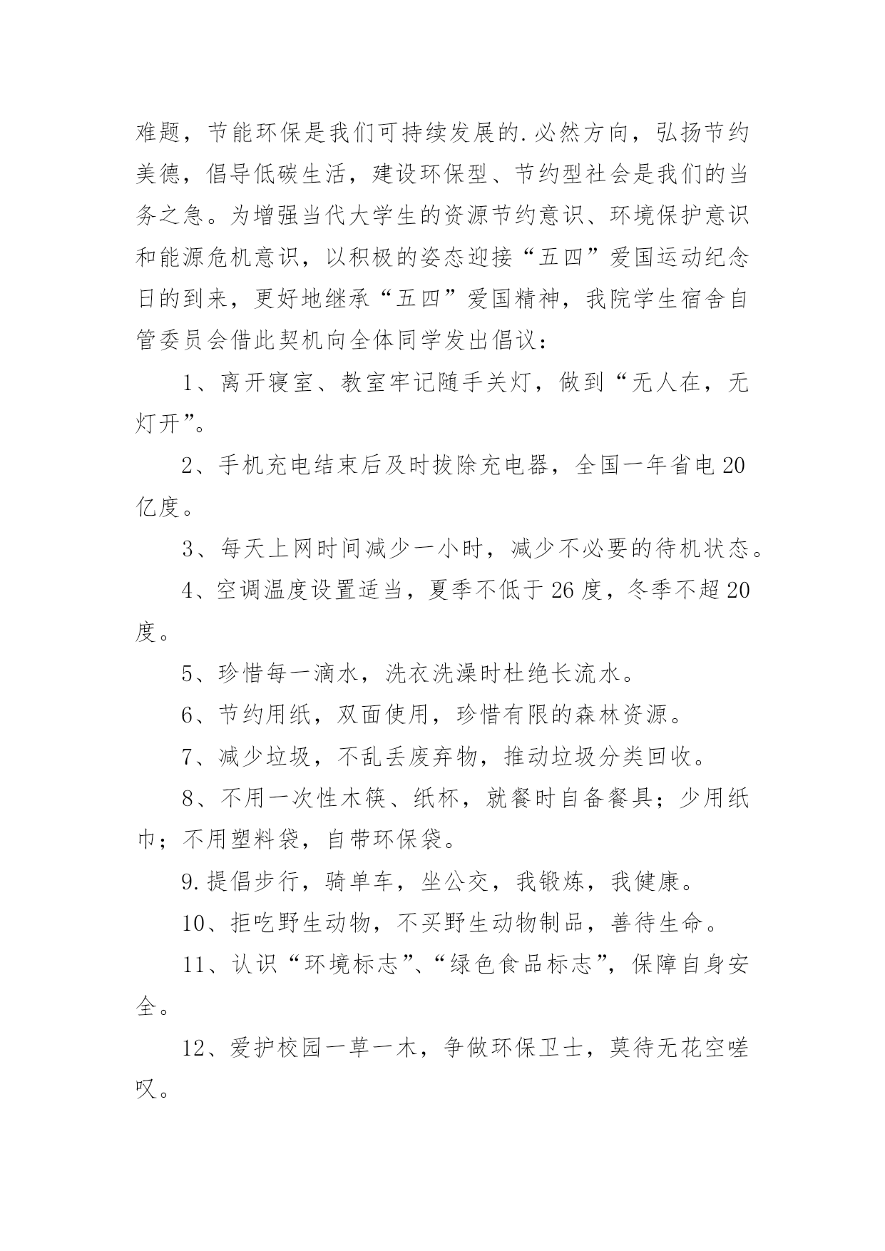 绿色低碳环保倡议书绿色低碳环保倡议书在不断进步的社会中,倡议书的使用越来越广泛,倡议书是由某一组织或社团拟定、就某事向社会提出建议或提议社会成员共同去做某事的书面文章。那要怎么写好倡议书呢?下面是小编帮大家整理的绿色低碳环保倡议书,希望能够帮助到大家。绿色低碳环保倡议书1“今天你低碳了没?”随着这句口头禅的广泛流行,“低碳生活”正在成为一种追求时尚的负责任的生活态度。在全世界都倡导低碳的,我们到底能做些什么?除了关注低碳经济,除了关注新能源的利用,除了世博会上各种低碳科技给我们带来的新鲜刺激,你有没有问过自己,是否可以从身边的点滴做起,为保护环境出一份微薄之力?如果你想,那么就加入到“低碳行动”中来。近日,八一医院妇产科与南京市环保局联合南京各大媒体发出“我低碳,我健康”的倡议,并将于八一建军节开始,将此倡议带到各大社区。此次低碳行动主要是倡导大家将低碳的概念深入到日常生活中,比如说减少用电器的时间,出门少开车多步行等等。该行动通过播放露天电影,让大家适当参加户外活动,减少空调等电器的`使用时间,并邀请部队三甲医院八一医院妇产科军医现场指导健康生活方式。另外还会在现场及网络上有奖征集低碳生活小妙招等。以庆8·1迎国庆为契机,响应国家“2131工程”的号召,丰富城镇居民文化生活,普及爱国主义教育、增进邻里和睦、推广低碳环保以及体现军民鱼水情的军医义务奉献等一系列活动,可谓一举多得,意义深远。据了解,此次活动的创意其实是八一医院妇产科的一位老军医想到的。她说在八一建军节这个特别的日子,真的很想做一些有意义的事情。作为一个军人在和平年代怎么爱国?保护能源,保护国家的环境就是一种很好的爱国方式。所以这次活动所选择的露天电影也是有着军人气质的红色电影,希望参与活动的人在电影中能体会到另一种爱国情绪。红色电影任你挑您想看什么样的红色电影,这个可以由您的投票来决定。主办方会在网上公布下一站“低碳行动”地点,并附上可供选择的红色电影片名,每次5个,您可以从中选择您最喜欢的投票。主办方会根据群众的意见,选择所要放映的电影。投票也是有好处的哦,不仅可以选择您想看的电影,还能有机会获得运气礼品。和小妙招一样,主办方也会每天抽出一名幸运投票者,赠送生活中用得着的贴心礼品。这等好事,不容错过。低碳行动logo征集令您有设计的天赋?您擅长创意图标?不管您到底有什么,只要您敢来尝试,您就有机会获得5000元大奖。我们现在缺的就是您的创意,请你拿一个赏心悦目,大气恢弘,灵气逼人的logo来,这个logo必须符合我们活动的主题低碳爱国,还要体现八一和可持续性。当然还要在限定的时间7月31日之前送来。当然您大可不必真的把图标送到我们这里,您可以通过网络,附带您的作品说明,只要我们相中了,5000元就是您的了。赶紧行动起来吧,时间不多了!还有人问奖金怎么拿?八一当天的“低碳行动”启动仪式上就会揭晓,会通知你去领奖的!所以记得发来的logo不要忘了写名和电话。低碳生活小妙招征集令如果你是低碳达人,如果你想成为低碳达人,或者如果你想轻轻松松地拿些小礼品,不妨来参加我们低碳生活小妙招的征集吧。低碳生活小妙招征集将分两个渠道进行,您可以到社区活动现场,直接把您的小妙招交给现场工作人员,也可以通过发上您的小妙招,这两种方式均可以获得小礼品的。不过获得稍大的礼品还需要一点点运气,主办方会每天在小妙招中抽出一名获奖者,所以只要运气好的人会有大礼品拿。绿色低碳环保倡议书2亲爱的同学们:地球只有一个,美丽和谐的家园需要我们所有人共同努力来维护。随着经济的发展,环境污染已经是全人类的一大难题,节能环保是我们可持续发展的.必然方向,弘扬节约美德,倡导低碳生活,建设环保型、节约型社会是我们的当务之急。为增强当代大学生的资源节约意识、环境保护意识和能源危机意识,以积极的姿态迎接“五四”爱国运动纪念日的到来,更好地继承“五四”爱国精神,我院学生宿舍自管委员会借此契机向全体同学发出倡议:1、离开寝室、教室牢记随手关灯,做到“无人在,无灯开”。2、手机充电结束后及时拔除充电器,全国一年省电20亿度。3、每天上网时间减少一小时,减少不必要的待机状态。4、空调温度设置适当,夏季不低于26度,冬季不超20度。5、珍惜每一滴水,洗衣洗澡时杜绝长流水。6、节约用纸,双面使用,珍惜有限的森林资源。7、减少垃圾,不乱丢废弃物,推动垃圾分类回收。8、不用一次性木筷、纸杯,就餐时自备餐具;少用纸巾;不用塑料袋,自带环保袋。9.提倡步行,骑单车,坐公交,我锻炼,我健康。10、拒吃野生动物,不买野生动物制品,善待生命。11、认识“环境标志”、“绿色食品标志”,保障自身安全。12、爱护校园一草一木,争做环保卫士,莫待无花空嗟叹。13、不在公共场合吸烟,创建无烟宿舍、无烟教室、无烟校园。古语曰:不积跬步,无以至千里;