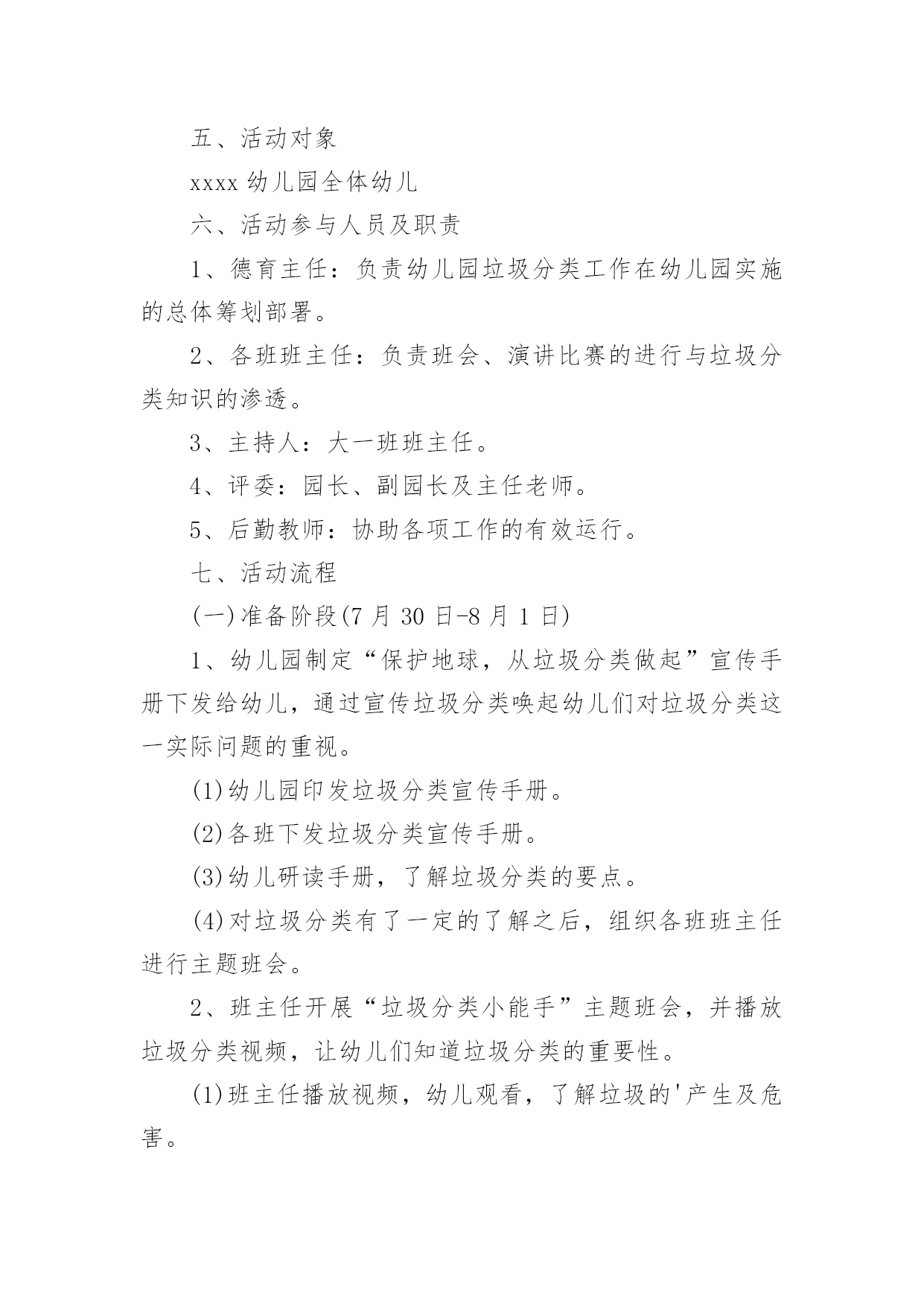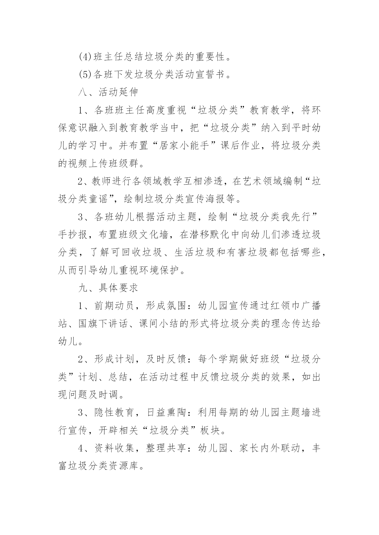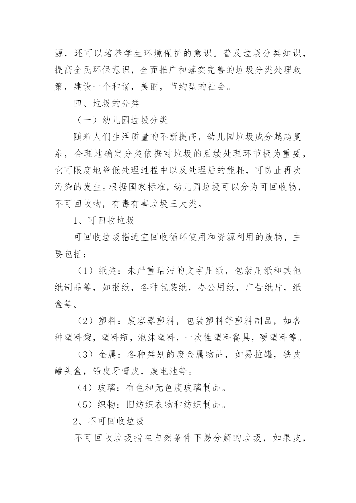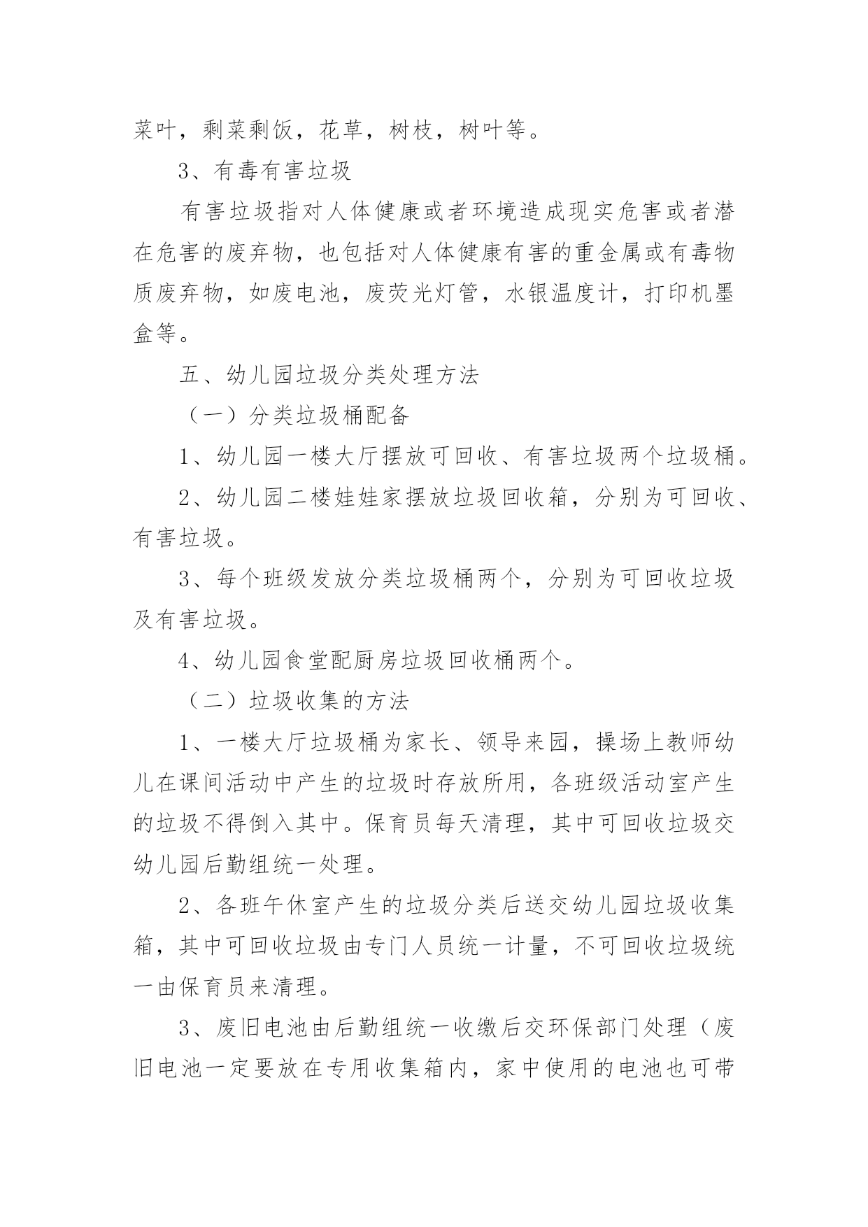 幼儿园垃圾分类环保方案幼儿园垃圾分类环保方案(精选5篇)为了确保事情或工作有序有力开展,时常需要预先制定方案,方案是有很强可操作性的书面计划。那么制定方案需要注意哪些问题呢?下面是小编为大家收集的幼儿园垃圾分类环保方案(精选5篇),仅供参考,希望能够帮助到大家。幼儿园垃圾分类环保方案1一、活动背景由于农村幼儿垃圾分类意识薄弱,乱扔垃圾现象频出,为树立幼儿的环保意识,以保护环境为目的,培养“垃圾分类,从我做起”的意识,根据本园实际情况,特制订垃圾分类实施方案。二、活动目的本实践活动通过幼儿亲身去参与到垃圾分类活动中,培养幼儿良好的生活习惯,通过宣传垃圾分类的意义提升幼儿们对垃圾分类这一实际问题的重视;宣传分类垃圾的具体做法,引导幼儿们正确地进行垃圾分类,保护环境;最后以标记垃圾桶等方式提醒幼儿们时刻注意垃圾分类回收问题。从而热爱周围环境,进而达到热爱大自然的目的。三、活动主题学会垃圾分类,争做环保卫士四、活动时间及地点20xx年7月30-8月3日;校园内五、活动对象xxxx幼儿园全体幼儿六、活动参与人员及职责1、德育主任:负责幼儿园垃圾分类工作在幼儿园实施的总体筹划部署。2、各班班主任:负责班会、演讲比赛的进行与垃圾分类知识的渗透。3、主持人:大一班班主任。4、评委:园长、副园长及主任老师。5、后勤教师:协助各项工作的有效运行。七、活动流程(一)准备阶段(7月30日-8月1日)1、幼儿园制定“保护地球,从垃圾分类做起”宣传手册下发给幼儿,通过宣传垃圾分类唤起幼儿们对垃圾分类这一实际问题的重视。(1)幼儿园印发垃圾分类宣传手册。(2)各班下发垃圾分类宣传手册。(3)幼儿研读手册,了解垃圾分类的要点。(4)对垃圾分类有了一定的了解之后,组织各班班主任进行主题班会。2、班主任开展“垃圾分类小能手”主题班会,并播放垃圾分类视频,让幼儿们知道垃圾分类的重要性。(1)班主任播放视频,幼儿观看,了解垃圾的'产生及危害。(2)幼儿讨论:常见的垃圾有哪些?垃圾的种类有哪些?如何进行分类?(3)幼儿对垃圾分类有了进一步的了解之后,进行知识储备,为演讲比赛做准备。(二)实施阶段(8月2日-8月3日)1、全园范围内进行“垃圾分类我最棒”演讲,使幼儿们了解生活中有哪些垃圾,知道垃圾分类的意义和标准。(1)各班在本班内抽签决定演讲顺序。(2)各班在班级内角逐出演讲比赛前5名,进入全园演讲比赛。(3)德育主任讲话阐述进行垃圾分类的意义。(4)比赛选手赛前抽签。(5)主持人讲话进行选手介绍。(6)后勤老师负责播放音乐。(7)评委打分,比赛结束。(8)主持人进行活动总结。2、幼儿园发动全体幼儿进行“清洁小行家”实践活动,检验准备活动阶段的效果,通过对校园内的垃圾回收和分类,并在日常生活中让垃圾分类逐渐成为一种习惯。(1)班主任带领本班幼儿进行本班担当区的垃圾回收。(2)各班幼儿将自己捡到的垃圾进行分类。(3)班主任带领全班幼儿进行“分类小专家”经验分享会,请各小组派代表轮流上讲台汇报各自小组的垃圾分类方法,在讨论中巩固垃圾分类的知识。(4)班主任总结垃圾分类的重要性。(5)各班下发垃圾分类活动宣誓书。八、活动延伸1、各班班主任高度重视“垃圾分类”教育教学,将环保意识融入到教育教学当中,把“垃圾分类”纳入到平时幼儿的学习中。并布置“居家小能手”课后作业,将垃圾分类的视频上传班级群。2、教师进行各领域教学互相渗透,在艺术领域编制“垃圾分类童谣”,绘制垃圾分类宣传海报等。3、各班幼儿根据活动主题,绘制“垃圾分类我先行”手抄报,布置班级文化墙,在潜移默化中向幼儿们渗透垃圾分类,了解可回收垃圾、生活垃圾和有害垃圾都包括哪些,从而引导幼儿重视环境保护。九、具体要求1、前期动员,形成氛围:幼儿园宣传通过红领巾广播站、国旗下讲话、课间小结的形式将垃圾分类的理念传达给幼儿。2、形成计划,及时反馈:每个学期做好班级“垃圾分类”计划、总结,在活动过程中反馈垃圾分类的效果,如出现问题及时调。3、隐性教育,日益熏陶:利用每期的幼儿园主题墙进行宣传,开辟相关“垃圾分类”板块。4、资料收集,整理共享:幼儿园、家长内外联动,丰富垃圾分类资源库。5、增加实践,展示成果:鼓励幼儿在校内外进行垃圾分类,以图片、视频的形式展现出来。十、注意事项1、活动过程中注意要解释说明清楚每一个活动环节的要求、规则等等。2、活动中注意加强互动,多让幼儿参与,关于环保问题几乎没有特别固定的标准答案,所以要注意听幼儿们的回答,对其中的闪光点要及时发现,给予肯定和鼓励。3、活动结束时,注意指导幼儿们把垃圾分类的环保意识贯彻到生活小事当中。4、将垃圾分类作为幼儿园常态化工作,在各个方面渗透给幼儿,将环保观念与行为相结合。此次主题活动的开展,不仅强化了幼儿们的垃圾分类理念,让每位幼儿意识到了垃圾分类的重要性,更通过家园合