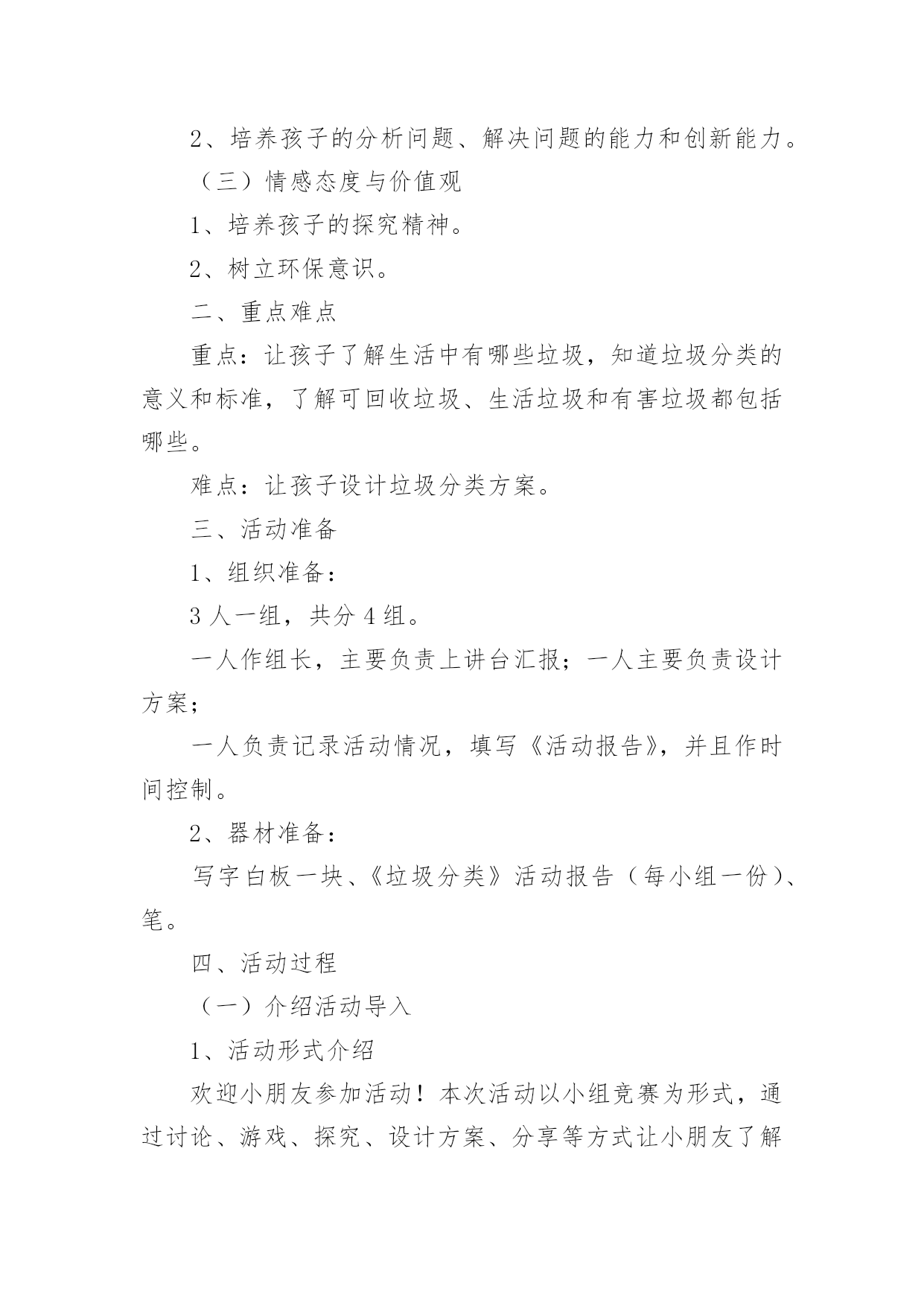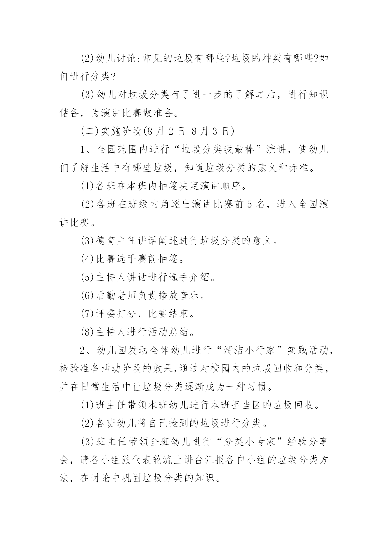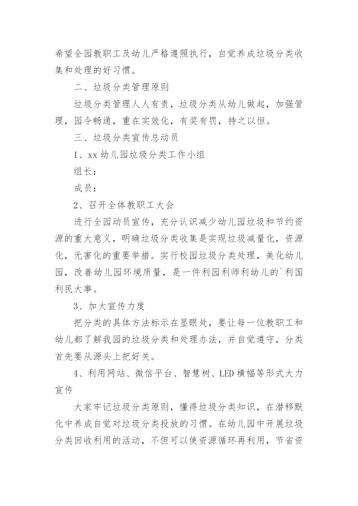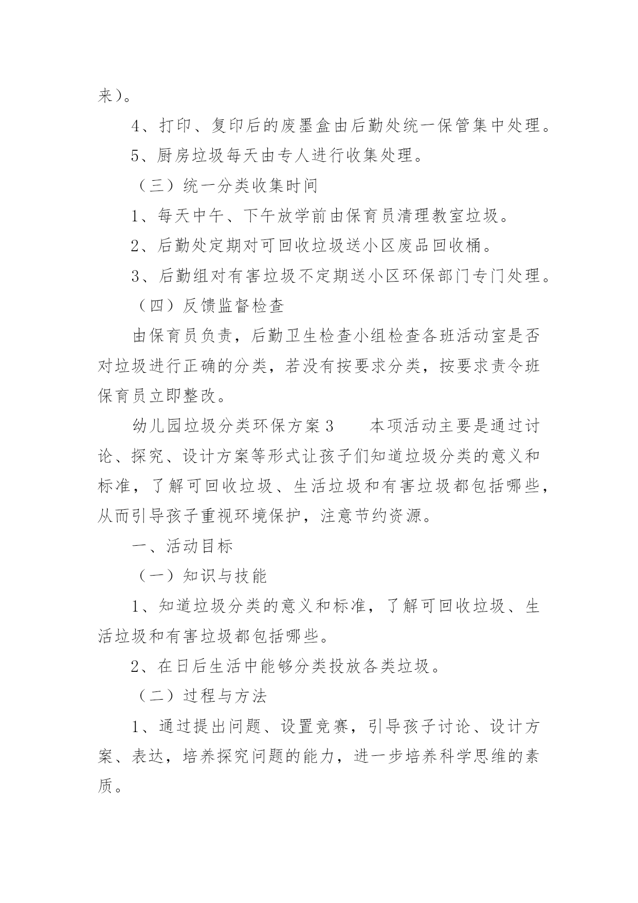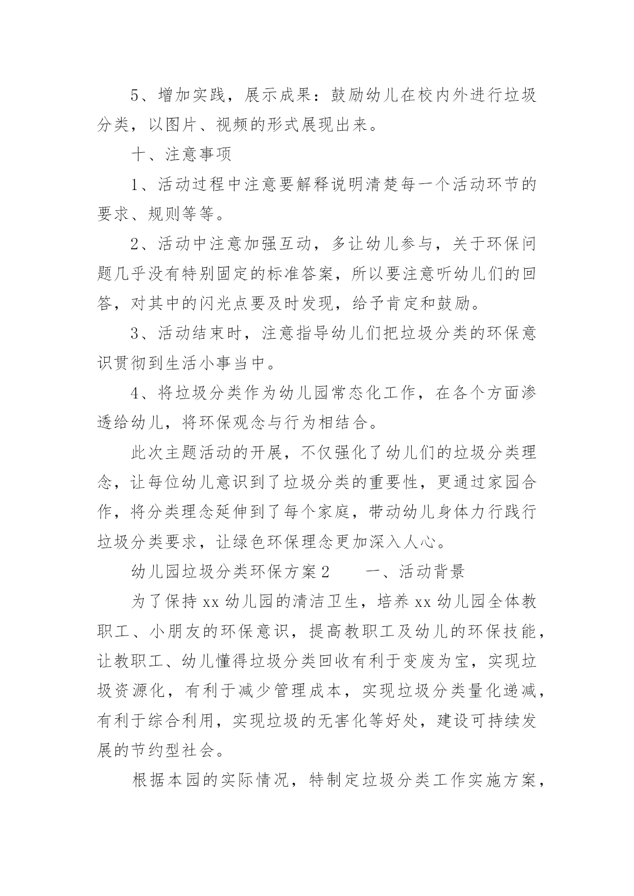 幼儿园垃圾分类环保方案幼儿园垃圾分类环保方案(精选5篇)为了确保事情或工作有序有力开展,时常需要预先制定方案,方案是有很强可操作性的书面计划。那么制定方案需要注意哪些问题呢?下面是小编为大家收集的幼儿园垃圾分类环保方案(精选5篇),仅供参考,希望能够帮助到大家。幼儿园垃圾分类环保方案1一、活动背景由于农村幼儿垃圾分类意识薄弱,乱扔垃圾现象频出,为树立幼儿的环保意识,以保护环境为目的,培养“垃圾分类,从我做起”的意识,根据本园实际情况,特制订垃圾分类实施方案。二、活动目的本实践活动通过幼儿亲身去参与到垃圾分类活动中,培养幼儿良好的生活习惯,通过宣传垃圾分类的意义提升幼儿们对垃圾分类这一实际问题的重视;宣传分类垃圾的具体做法,引导幼儿们正确地进行垃圾分类,保护环境;最后以标记垃圾桶等方式提醒幼儿们时刻注意垃圾分类回收问题。从而热爱周围环境,进而达到热爱大自然的目的。三、活动主题学会垃圾分类,争做环保卫士四、活动时间及地点20xx年7月30-8月3日;校园内五、活动对象xxxx幼儿园全体幼儿六、活动参与人员及职责1、德育主任:负责幼儿园垃圾分类工作在幼儿园实施的总体筹划部署。2、各班班主任:负责班会、演讲比赛的进行与垃圾分类知识的渗透。3、主持人:大一班班主任。4、评委:园长、副园长及主任老师。5、后勤教师:协助各项工作的有效运行。七、活动流程(一)准备阶段(7月30日-8月1日)1、幼儿园制定“保护地球,从垃圾分类做起”宣传手册下发给幼儿,通过宣传垃圾分类唤起幼儿们对垃圾分类这一实际问题的重视。(1)幼儿园印发垃圾分类宣传手册。(2)各班下发垃圾分类宣传手册。(3)幼儿研读手册,了解垃圾分类的要点。(4)对垃圾分类有了一定的了解之后,组织各班班主任进行主题班会。2、班主任开展“垃圾分类小能手”主题班会,并播放垃圾分类视频,让幼儿们知道垃圾分类的重要性。(1)班主任播放视频,幼儿观看,了解垃圾的'产生及危害。(2)幼儿讨论:常见的垃圾有哪些?垃圾的种类有哪些?如何进行分类?(3)幼儿对垃圾分类有了进一步的了解之后,进行知识储备,为演讲比赛做准备。(二)实施阶段(8月2日-8月3日)1、全园范围内进行“垃圾分类我最棒”演讲,使幼儿们了解生活中有哪些垃圾,知道垃圾分类的意义和标准。(1)各班在本班内抽签决定演讲顺序。(2)各班在班级内角逐出演讲比赛前5名,进入全园演讲比赛。(3)德育主任讲话阐述进行垃圾分类的意义。(4)比赛选手赛前抽签。(5)主持人讲话进行选手介绍。(6)后勤老师负责播放音乐。(7)评委打分,比赛结束。(8)主持人进行活动总结。2、幼儿园发动全体幼儿进行“清洁小行家”实践活动,检验准备活动阶段的效果,通过对校园内的垃圾回收和分类,并在日常生活中让垃圾分类逐渐成为一种习惯。(1)班主任带领本班幼儿进行本班担当区的垃圾回收。(2)各班幼儿将自己捡到的垃圾进行分类。(3)班主任带领全班幼儿进行“分类小专家”经验分享会,请各小组派代表轮流上讲台汇报各自小组的垃圾分类方法,在讨论中巩固垃圾分类的知识。(4)班主任总结垃圾分类的重要性。(5)各班下发垃圾分类活动宣誓书。八、活动延伸1、各班班主任高度重视“垃圾分类”教育教学,将环保意识融入到教育教学当中,把“垃圾分类”纳入到平时幼儿的学习中。并布置“居家小能手”课后作业,将垃圾分类的视频上传班级群。2、教师进行各领域教学互相渗透,在艺术领域编制“垃圾分类童谣”,绘制垃圾分类宣传海报等。3、各班幼儿根据活动主题,绘制“垃圾分类我先行”手抄报,布置班级文化墙,在潜移默化中向幼儿们渗透垃圾分类,了解可回收垃圾、生活垃圾和有害垃圾都包括哪些,从而引导幼儿重视环境保护。九、具体要求1、前期动员,形成氛围:幼儿园宣传通过红领巾广播站、国旗下讲话、课间小结的形式将垃圾分类的理念传达给幼儿。2、形成计划,及时反馈:每个学期做好班级“垃圾分类”计划、总结,在活动过程中反馈垃圾分类的效果,如出现问题及时调。3、隐性教育,日益熏陶:利用每期的幼儿园主题墙进行宣传,开辟相关“垃圾分类”板块。4、资料收集,整理共享:幼儿园、家长内外联动,丰富垃圾分类资源库。5、增加实践,展示成果:鼓励幼儿在校内外进行垃圾分类,以图片、视频的形式展现出来。十、注意事项1、活动过程中注意要解释说明清楚每一个活动环节的要求、规则等等。2、活动中注意加强互动,多让幼儿参与,关于环保问题几乎没有特别固定的标准答案,所以要注意听幼儿们的回答,对其中的闪光点要及时发现,给予肯定和鼓励。3、活动结束时,注意指导幼儿们把垃圾分类的环保意识贯彻到生活小事当中。4、将垃圾分类作为幼儿园常态化工作,在各个方面渗透给幼儿,将环保观念与行为相结合。此次主题活动的开展,不仅强化了幼儿们的垃圾分类理念,让每位幼儿意识到了垃圾分类的重要性,更通过家园合