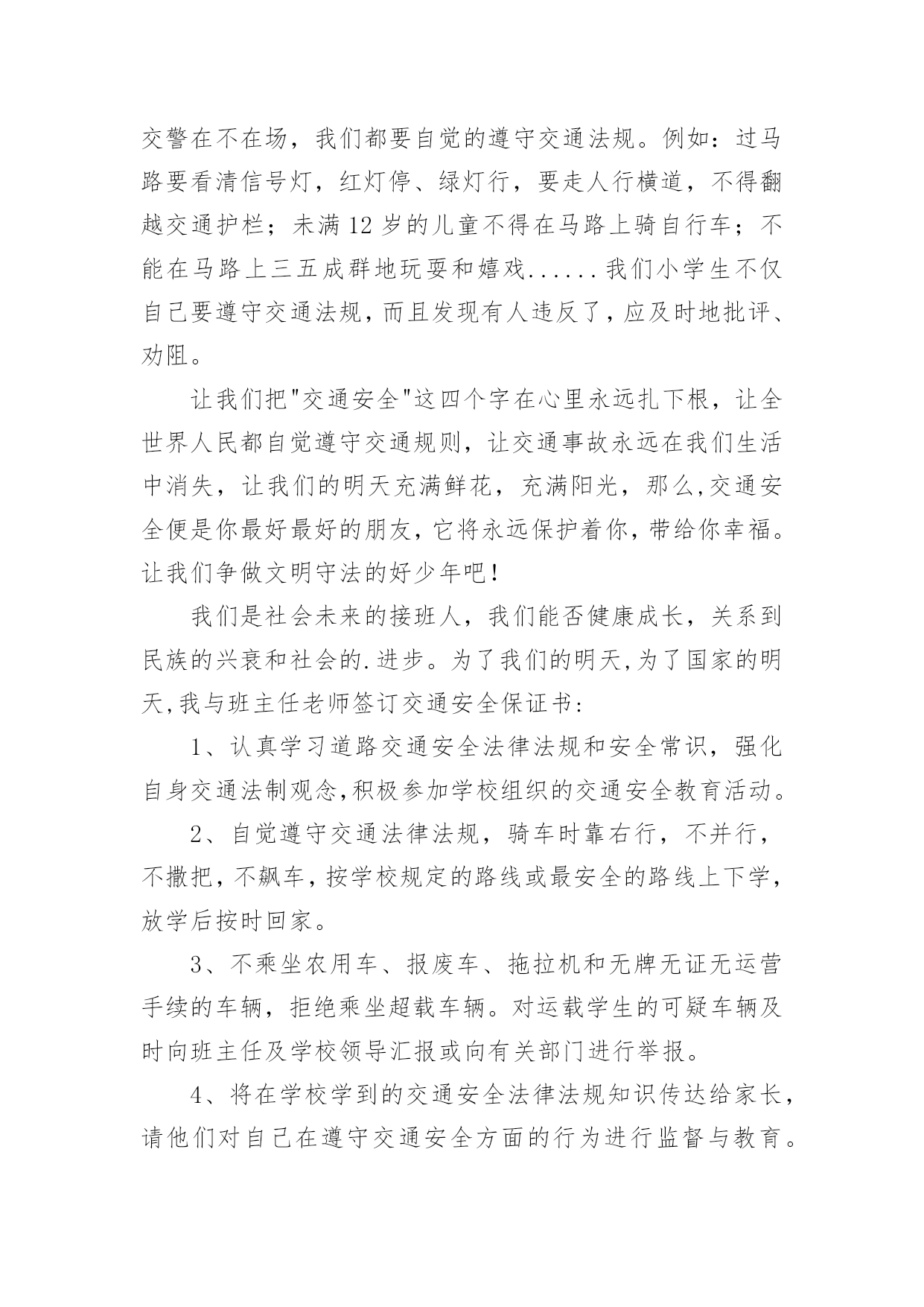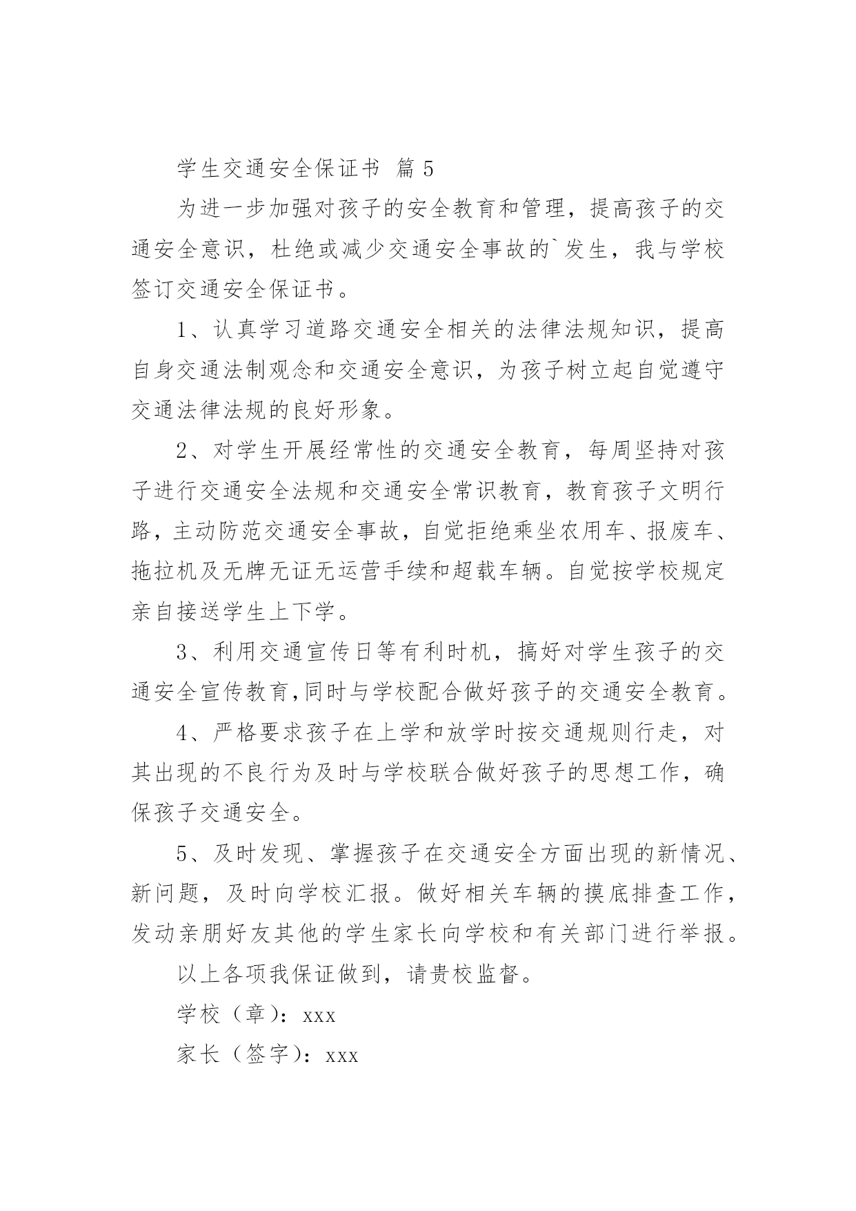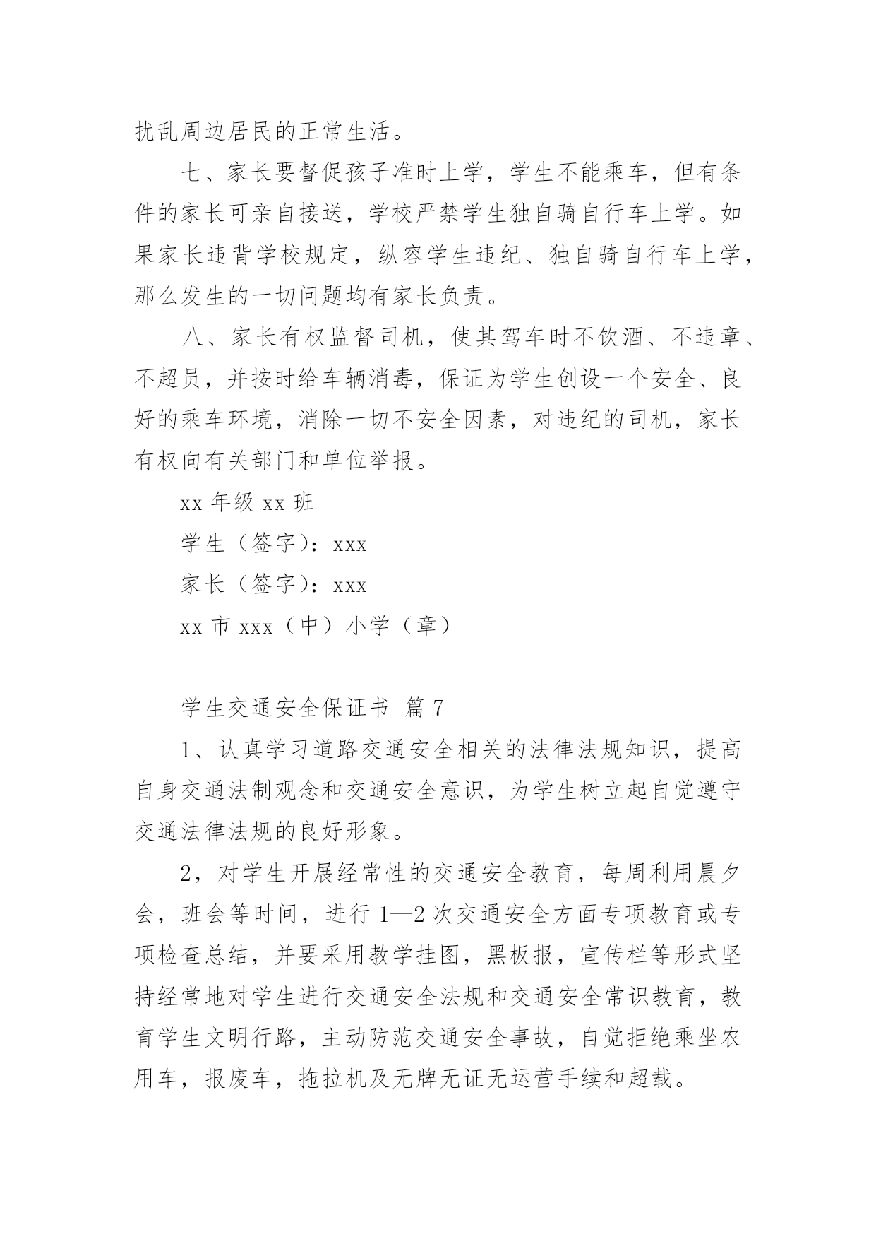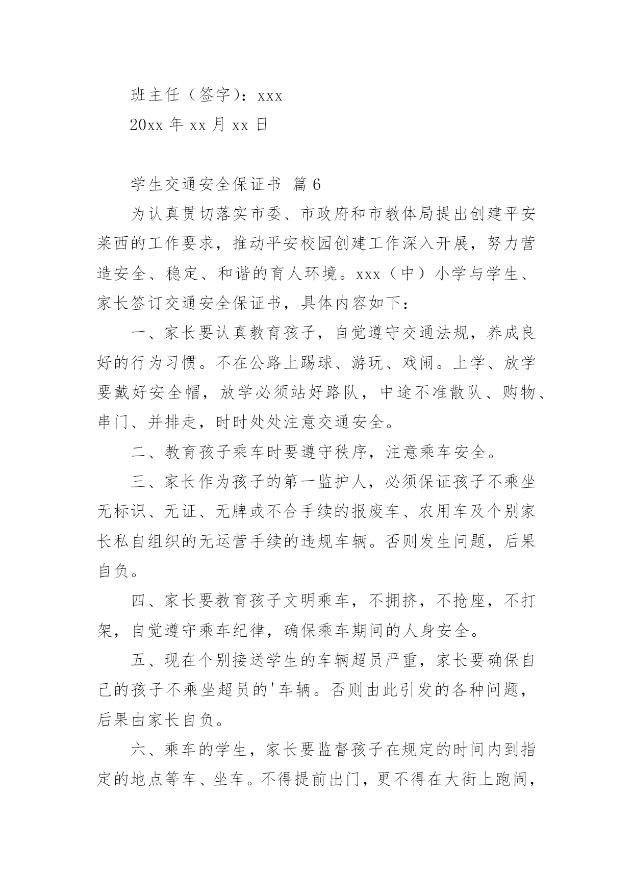 学生交通安全保证书学生交通安全保证书14篇随着社会一步步向前发展,我们使用保证书的情况越来越多,保证书一般是个人或单位在有所保证时向上级组织或集体发出的一种文书。你还在对写保证书感到一筹莫展吗?下面是小编为大家收集的学生交通安全保证书,仅供参考,大家一起来看看吧。学生交通安全保证书篇1为保证学生的交通安全,我保证做到:一、认真教育孩子,自觉遵守交通法规,养成良好的行为习惯、不在公路上踢球、游玩、戏闹。上学、放学时时处处注意交通安全。二、教育孩子乘车时要遵守秩序,注意乘车安全。三、作为孩子的第一监护人,我保证孩子不乘坐无标识、无证、无牌或不合手续的'报废车、农用车及个别私自组织的无运营手续的违规_____。否则发生问题,后果自负。四、教育孩子文明乘车,不拥挤,不抢座,不打架,自觉遵守乘车纪律,确保乘车期间的人身安全。五、现在个别接送学生的_____超员严重,保证自己的孩子不乘坐超员的_____。否则由此引发的各种问题,后果由自负。六、监督孩子在规定的时间内到指定的地点等车、坐车。不得提前出门,更不得在大街上跑闹。七、监督司机,使其驾车时不饮酒、不违章、不超员,并按时给_____消毒,保证为学生创设一个安全、良好的乘车环境,消除一切不安全因素,对_____的司机,有权向有关部门和单位举报。年级班学生(签字):______家长(签字):__________________中学______年______月______日学生交通安全保证书篇2为进一步加强对学生的安全教育和管理,提高学生的交通安全意识,杜绝或减少交通安全事故的'发生,我特与学校签订交通安全保证书。1、认真学习道路交通安全相关的法律法规知识,提高自身交通法制观念和交通安全意识,为学生树立起自觉遵守交通法律法规的良好形象。2、对学生开展经常性的交通安全教育,每周利用晨夕会,班会等时间,进行1—2次交通安全方面专项教育或专项检查总结,并要采用教学挂图,黑板报等形式坚持经常地对学生进行交通安全法规和交通安全常识教育,教育学生文明行路,主动防范交通安全事故,自觉拒绝乘坐农用车,报废车,拖拉机及无牌、无证、无运营手续的和超载的车辆。3、利用家长会等有利时机,搞好对学生家长的交通安全宣传教育,同时请家长配合做好学生的交通安全教育。4、严格执行路队值班制度,在学生放学时坚持值勤,疏导交通,监督引导学生按交通规则行走,确保学生交通安全。5、做好学生与班级的交通安全保证书签定工作,配合学校做好家长与学校的交通安全保证书签定工作。6、及时发现,掌握学生在交通安全方面出现的新情况,新问题,及时向学校汇报,努力进行整改。做好车辆的摸底排查工作,发动学生及学生家长向学校和有关部门进行举报。以上各项我保证做到,请领导进行监督。XX市___________小学(章)年级班学生(签字):家长(签字):责任班主任:年班学生:学生家长:年月日学生交通安全保证书篇3为认真贯切落实诸城市教育局和中心校对学校交通安全工作的要求,推动平安校园创建工作深入开展,努力营造安全、稳定、和谐的育人环境。枳沟初中学生、家长签订交通安全保证书,具体内容如下:1、家长要认真教育孩子,自觉遵守交通法规,养成良好的行为习惯.不在公路上踢球、游玩、戏闹。放学途中不准购物、串门、并排走,时时处处注意交通安全。2、教育孩子乘车时要遵守秩序,注意乘车安全。认真学习道路交通安全法律法规和安全常识,强化自身交通法制观念,积极参加学校组织的交通安全教育活动。3、家长作为孩子的第一监护人,必须保证孩子不乘坐农用车、报废车、拖拉机和无牌、无证或不合手续的.报废车及个别家长私自组织的无运营手续的违规车辆。4、家长要教育孩子文明乘车,不拥挤,不抢座,不打架,自觉遵守乘车纪律,确保乘车期间的人身安全。拒绝乘坐超载车辆。对运载学生的可疑车辆及时向班主任及学校领导汇报或向有关部门进行举报。5、家长要督促孩子准时上学,学生不能乘车,但有条件的家长可亲自接送,学校严禁学生独自骑自行车上学。如果家长违背学校规定,纵容学生违纪、独自骑自行车上学,那么发生的一切问题均有家长负责。6、自觉遵守交通法律法规,骑车时靠右行,不并行,不撒把,不飙车,按学校规定的路线或最安全的路线上下学,放学后按时回家。7、家长有权监督司机,使其驾车时不饮酒、不违章、不超员,保证为学生创设一个安全、良好的乘车环境,消除一切不安全因素,对违纪的司机,家长有权向有关部门和单位举报。让我们把“交通安全”这四个字在心里永远扎下根,让我们每个人都自觉遵守交通规则,让交通事故永远在我们生活中消失,让我们的明天充满阳光。那么,交通安全便是你的朋友,它将永远保护着你,带给你幸福。让我们争做文明守法的好学生吧!保证人:xxx20xx年xx月xx日学生交通安全保证书篇4为进一步提高自身的交通安全意识,减少道路交通